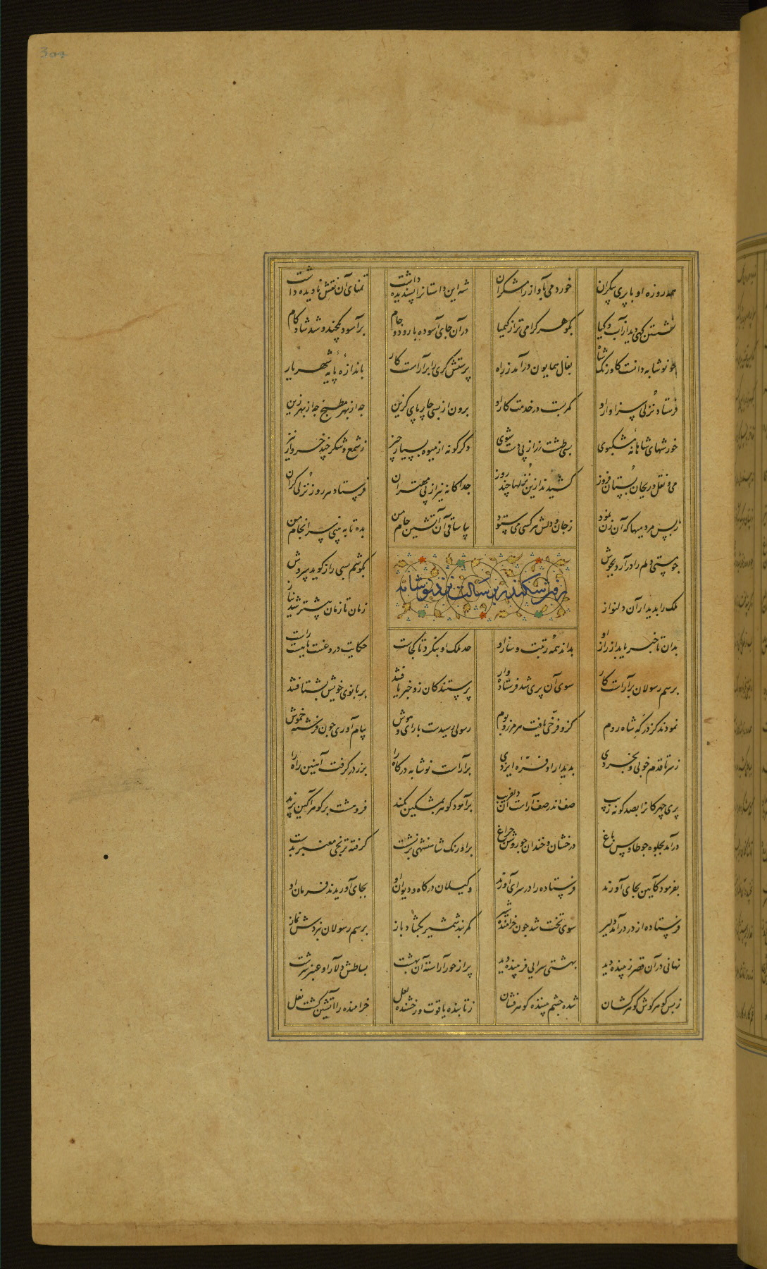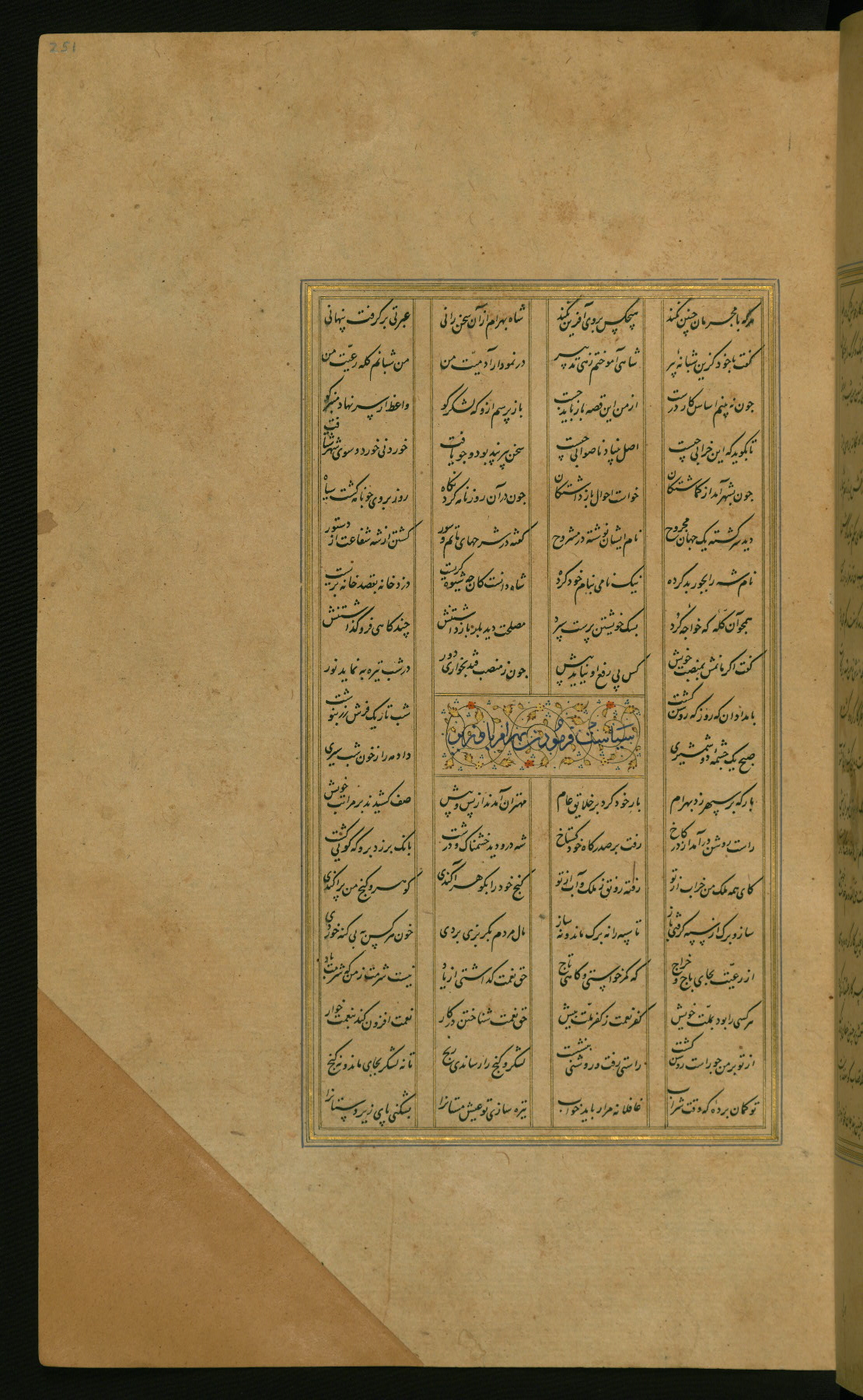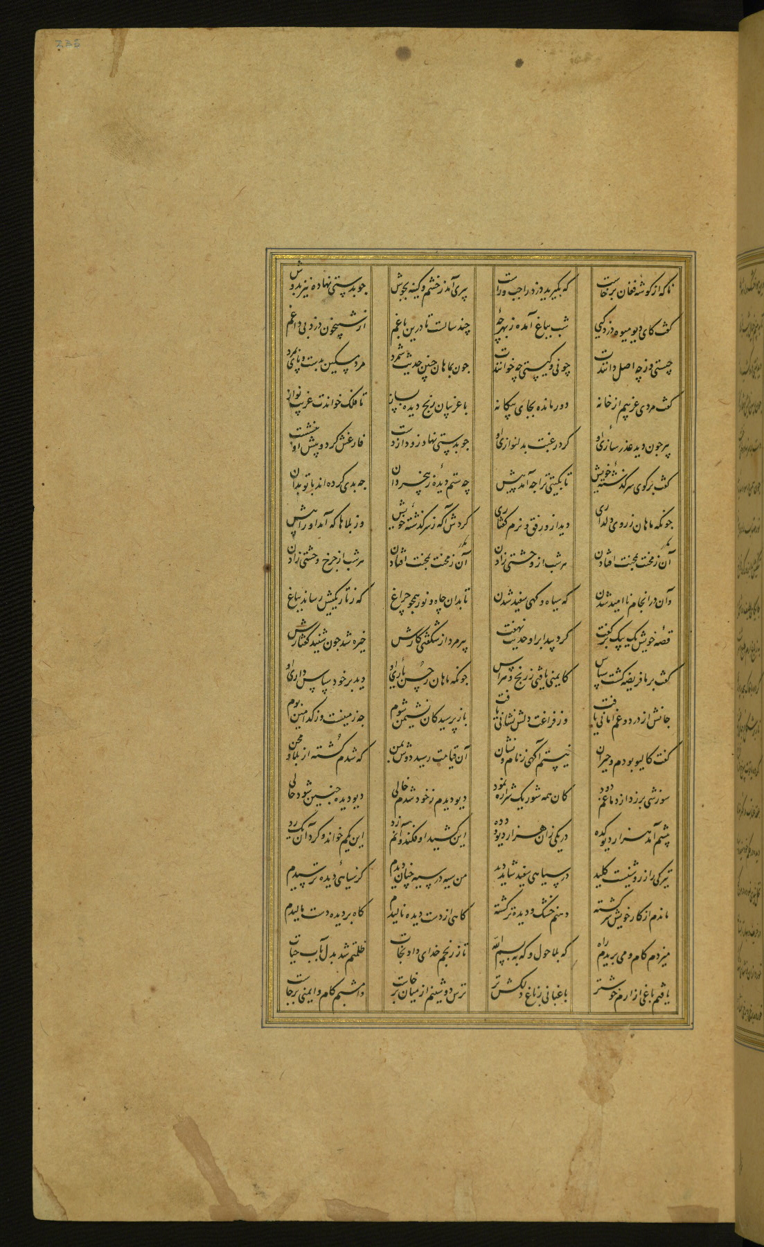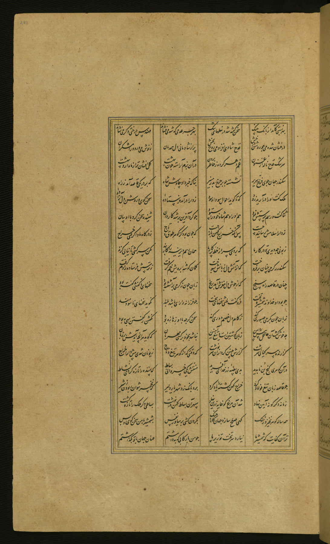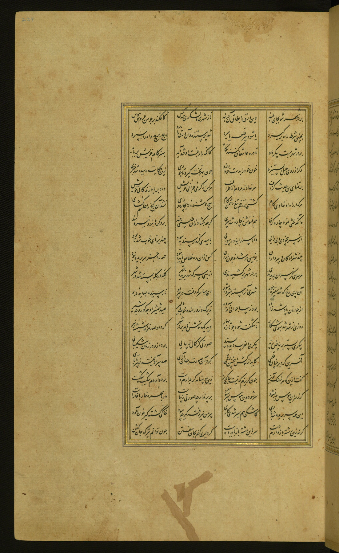 This illuminated and illustrated copy of the Khamsah (quintet) of Niẓāmī Ganjavī (d. 605 AH / 1209 CE) was written by Yār Muḥammad al-Haravī in 922 AH / 1516 CE. Written in four columns in black nastaʿlīq script, this manuscript opens with a double-page illuminated frontispiece signed by ʿAbd al-Wahhāb ibn ʿAbd al-Fattāḥ ibn ʿAlī. It contains thirty-five illustrations that were repainted in India during the twelfth century AH / eighteenth CE. The seal of Muḥammad Asharf ibn Muḥammad Khātam al-Ḥusaynī, dated 1173 AH / 1759-60 CE appears on fols. 1a and 401a. It is possible that the brown leather binding with center and side panels brushed with gold is original to the manuscript but was repaired at a later stage in the codex's history.