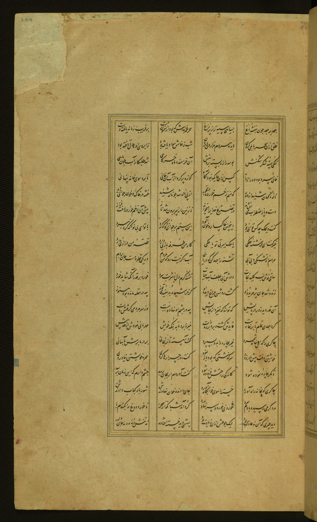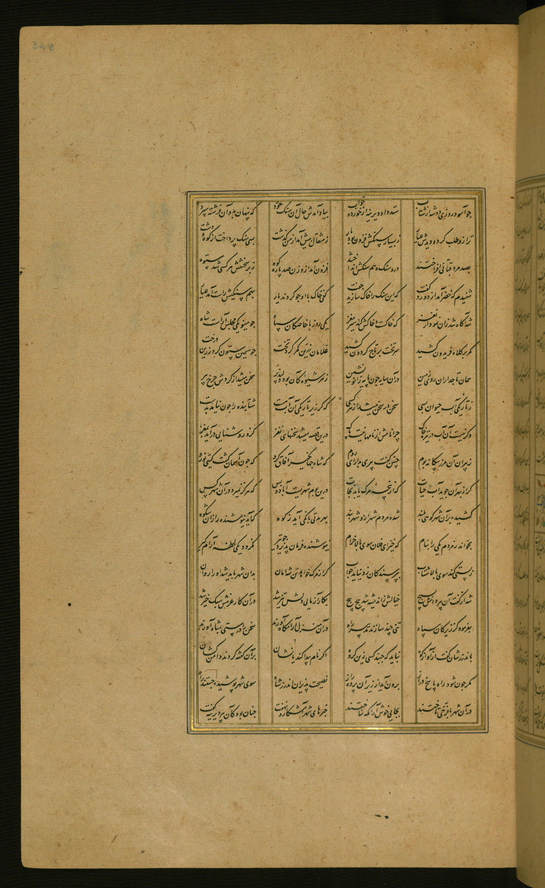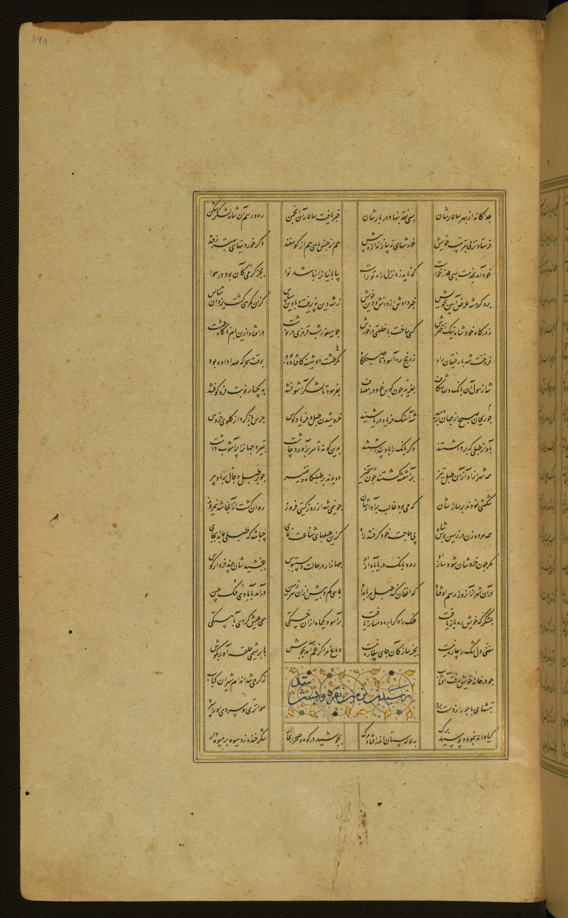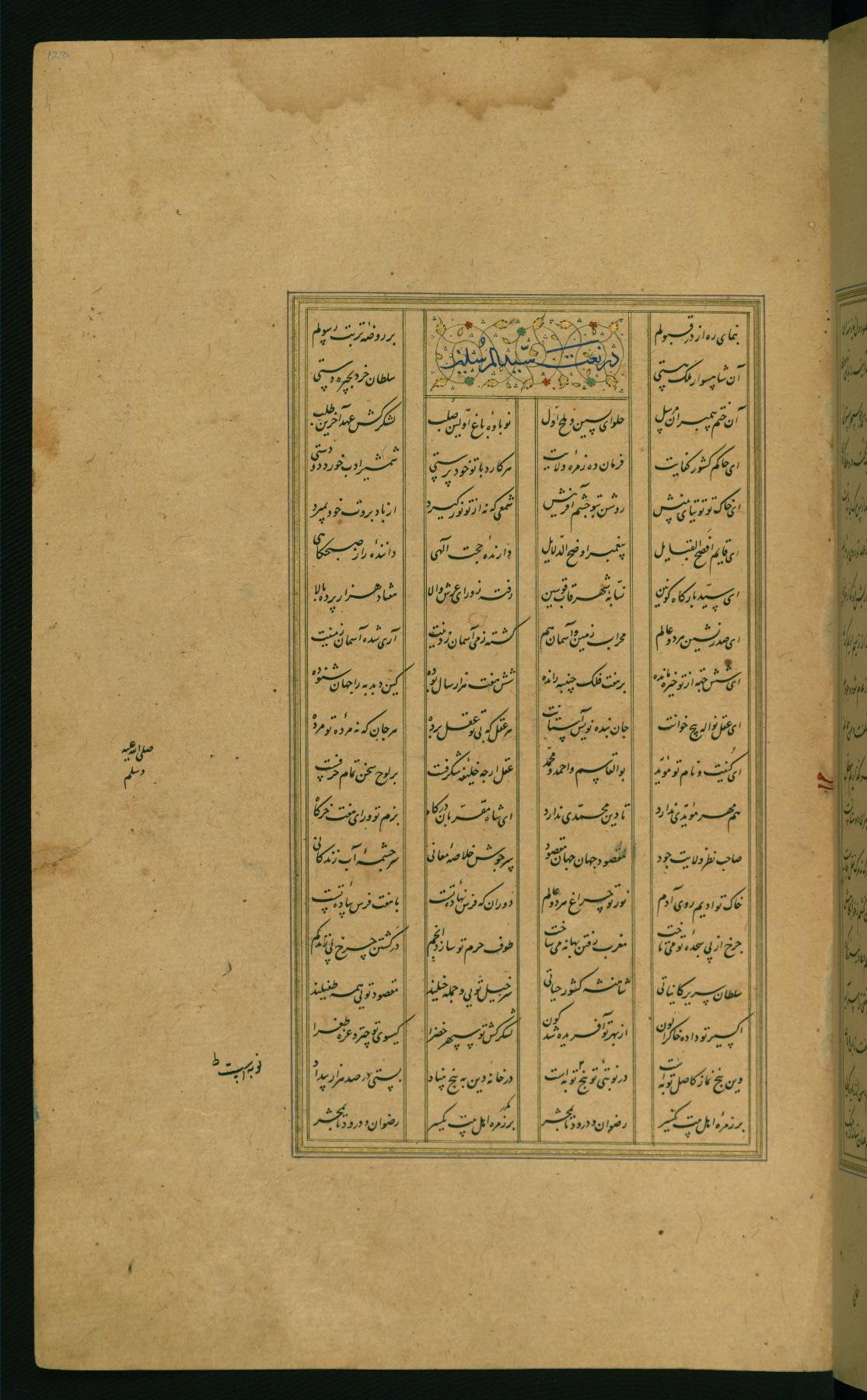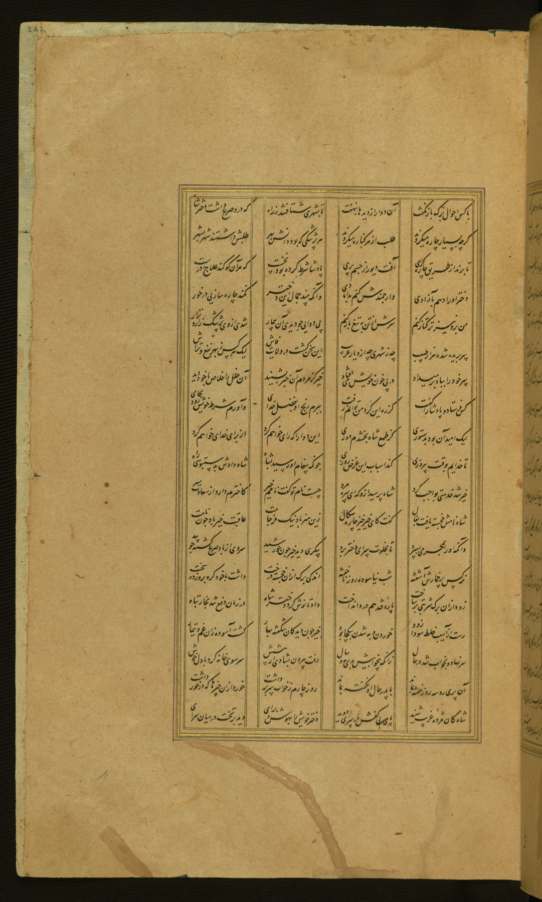 This illuminated and illustrated copy of the Khamsah (quintet) of Niẓāmī Ganjavī (d. 605 AH / 1209 CE) was written by Yār Muḥammad al-Haravī in 922 AH / 1516 CE. Written in four columns in black nastaʿlīq script, this manuscript opens with a double-page illuminated frontispiece signed by ʿAbd al-Wahhāb ibn ʿAbd al-Fattāḥ ibn ʿAlī. It contains thirty-five illustrations that were repainted in India during the twelfth century AH / eighteenth CE. The seal of Muḥammad Asharf ibn Muḥammad Khātam al-Ḥusaynī, dated 1173 AH / 1759-60 CE appears on fols. 1a and 401a. It is possible that the brown leather binding with center and side panels brushed with gold is original to the manuscript but was repaired at a later stage in the codex's history.