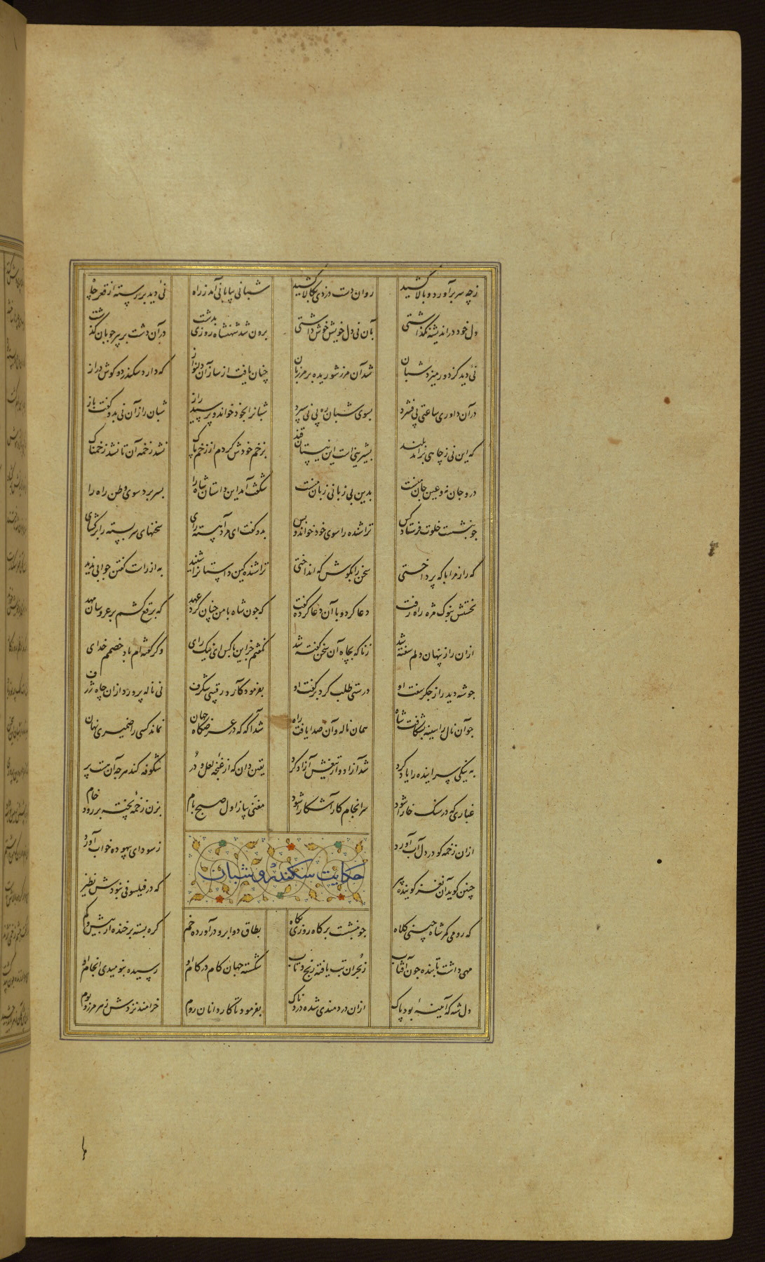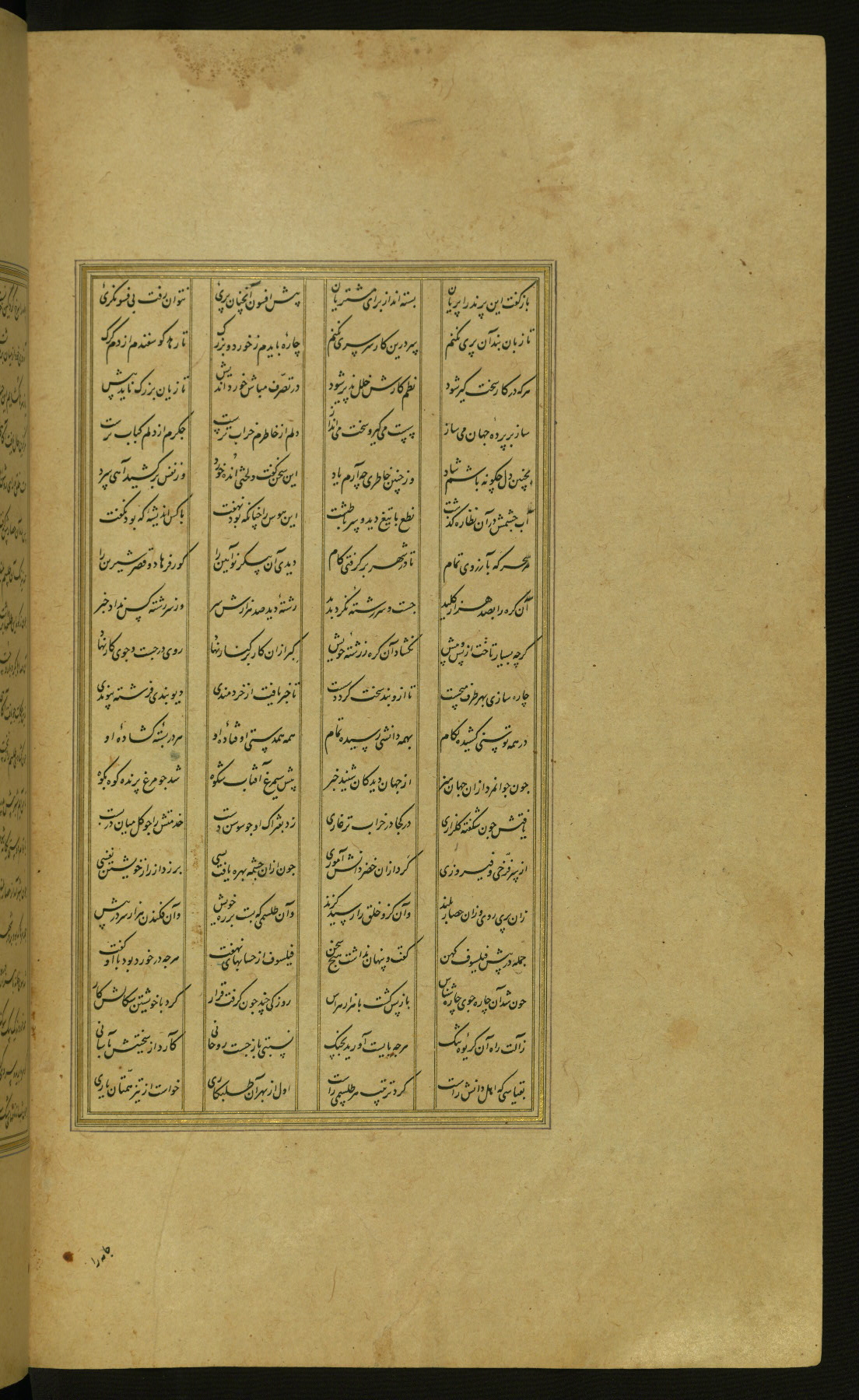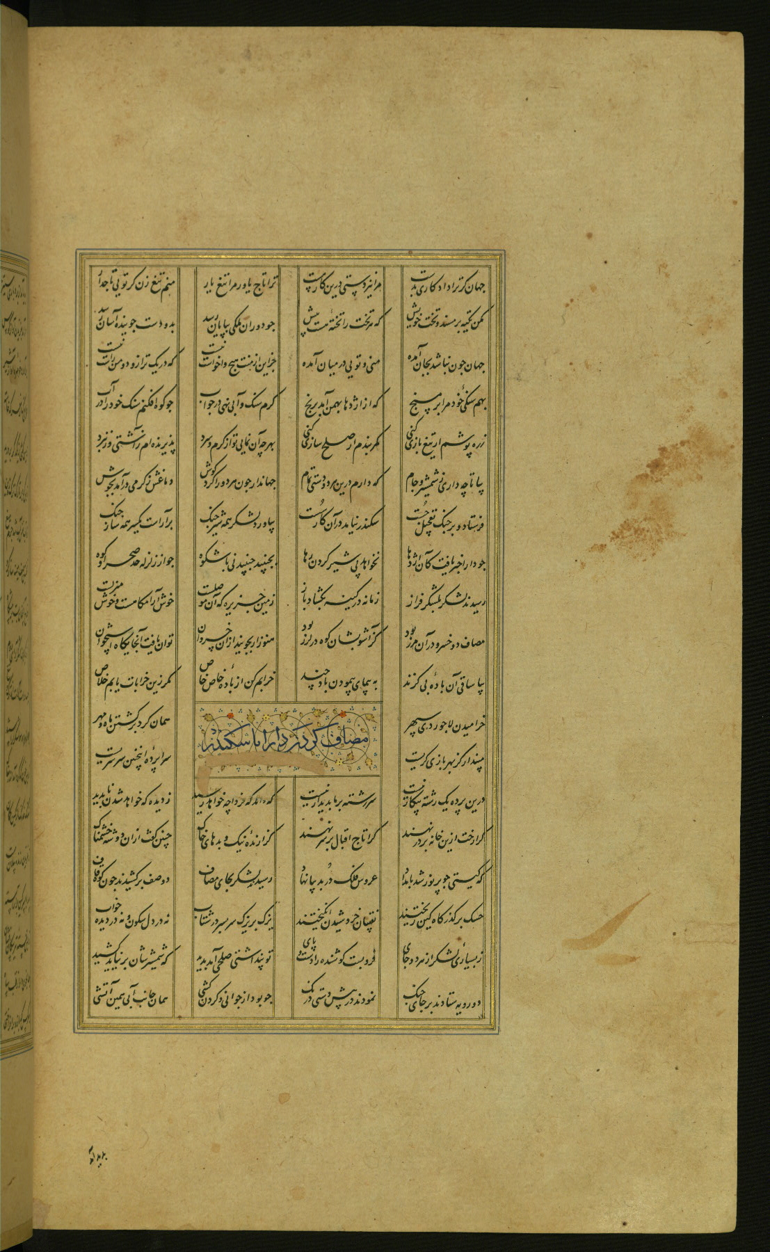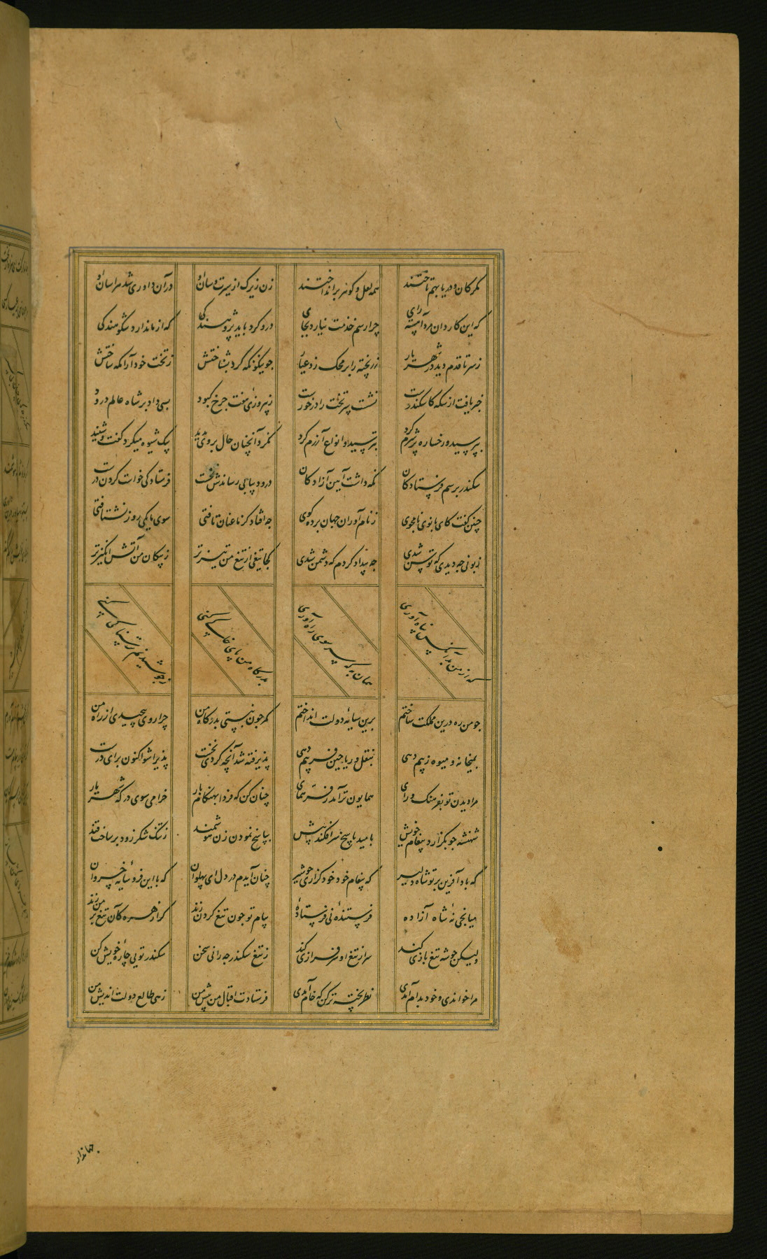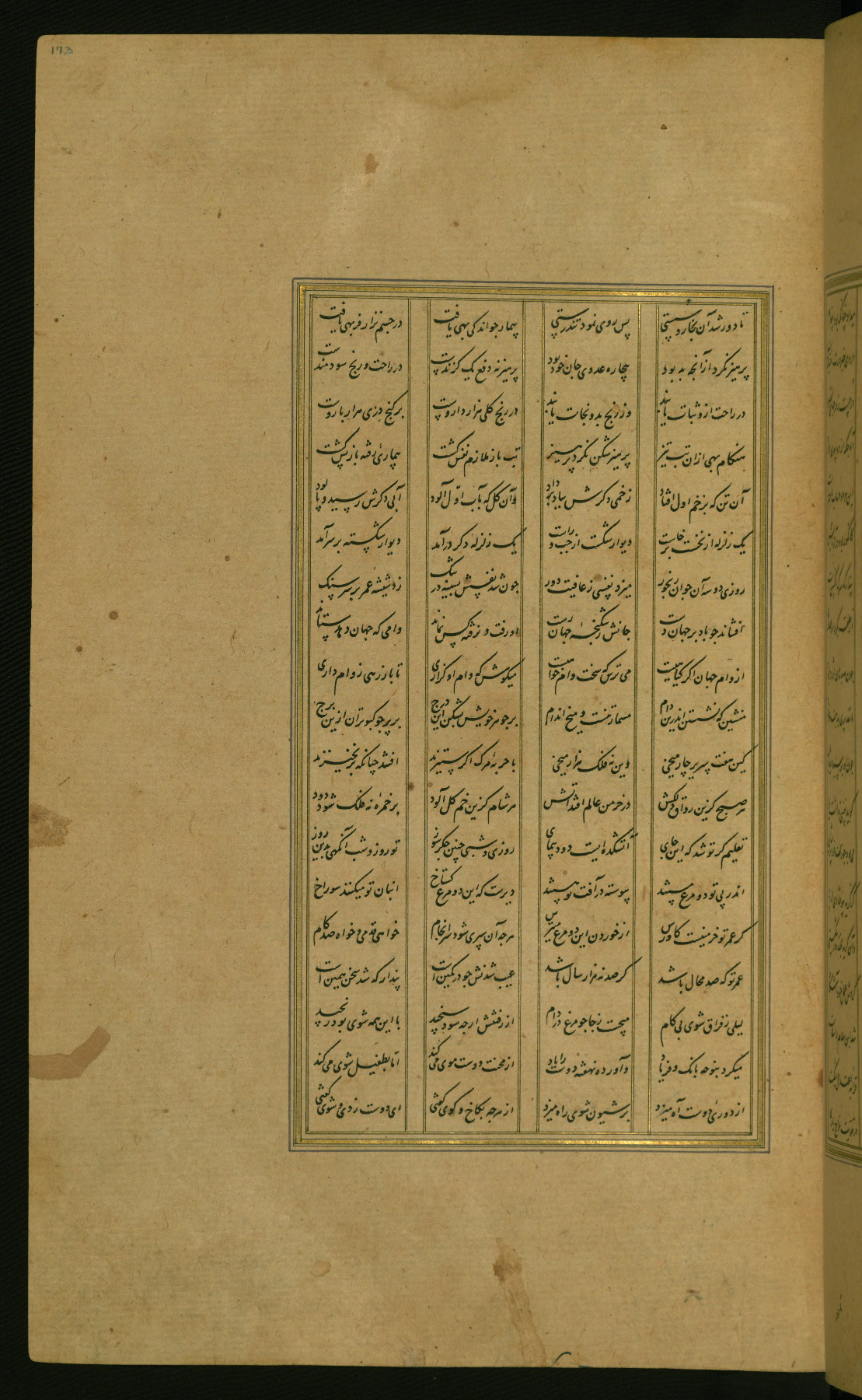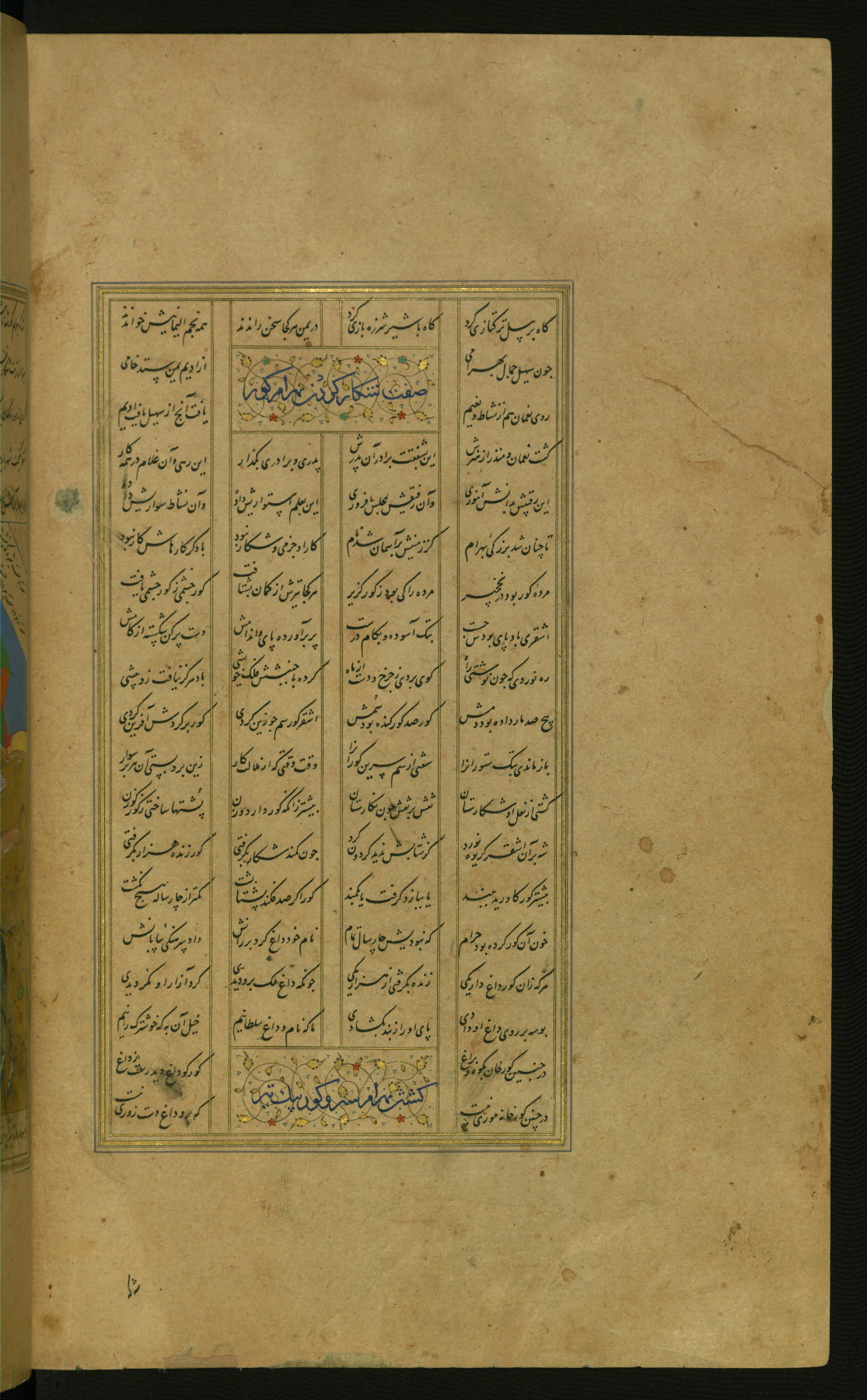 This illuminated and illustrated copy of the Khamsah (quintet) of Niẓāmī Ganjavī (d. 605 AH / 1209 CE) was written by Yār Muḥammad al-Haravī in 922 AH / 1516 CE. Written in four columns in black nastaʿlīq script, this manuscript opens with a double-page illuminated frontispiece signed by ʿAbd al-Wahhāb ibn ʿAbd al-Fattāḥ ibn ʿAlī. It contains thirty-five illustrations that were repainted in India during the twelfth century AH / eighteenth CE. The seal of Muḥammad Asharf ibn Muḥammad Khātam al-Ḥusaynī, dated 1173 AH / 1759-60 CE appears on fols. 1a and 401a. It is possible that the brown leather binding with center and side panels brushed with gold is original to the manuscript but was repaired at a later stage in the codex's history.