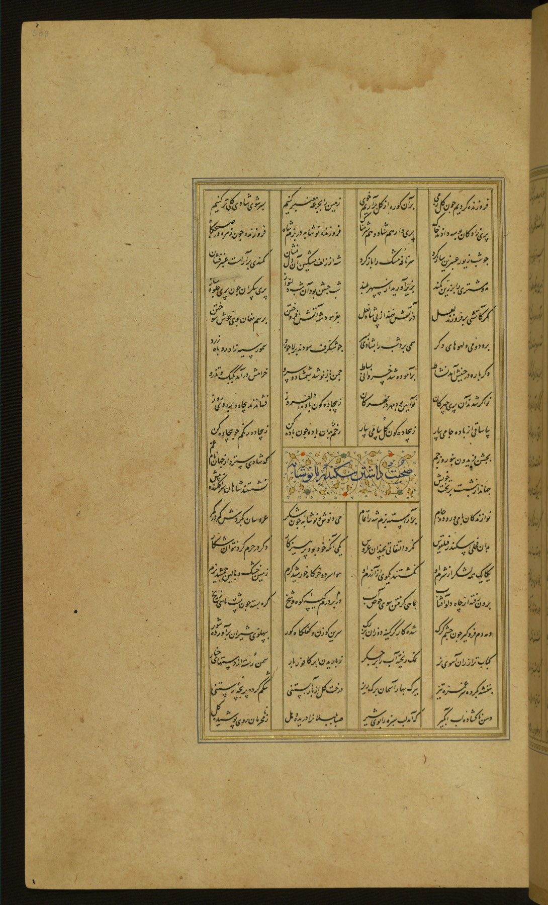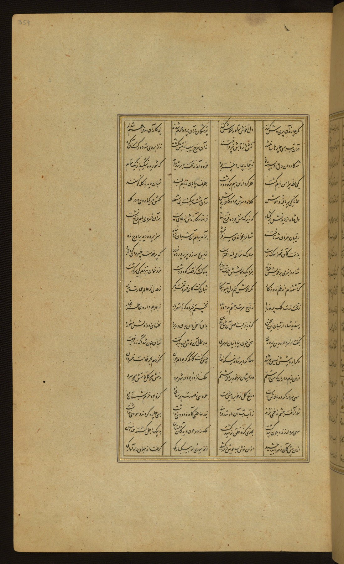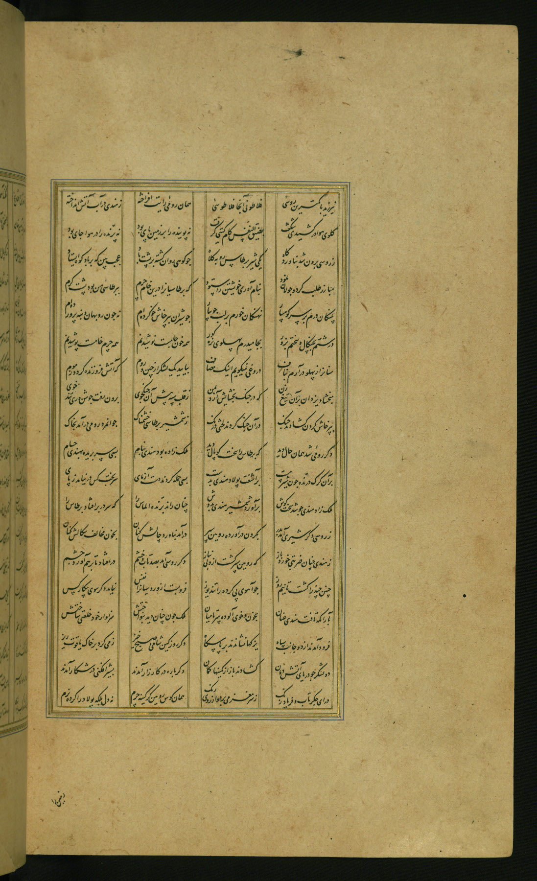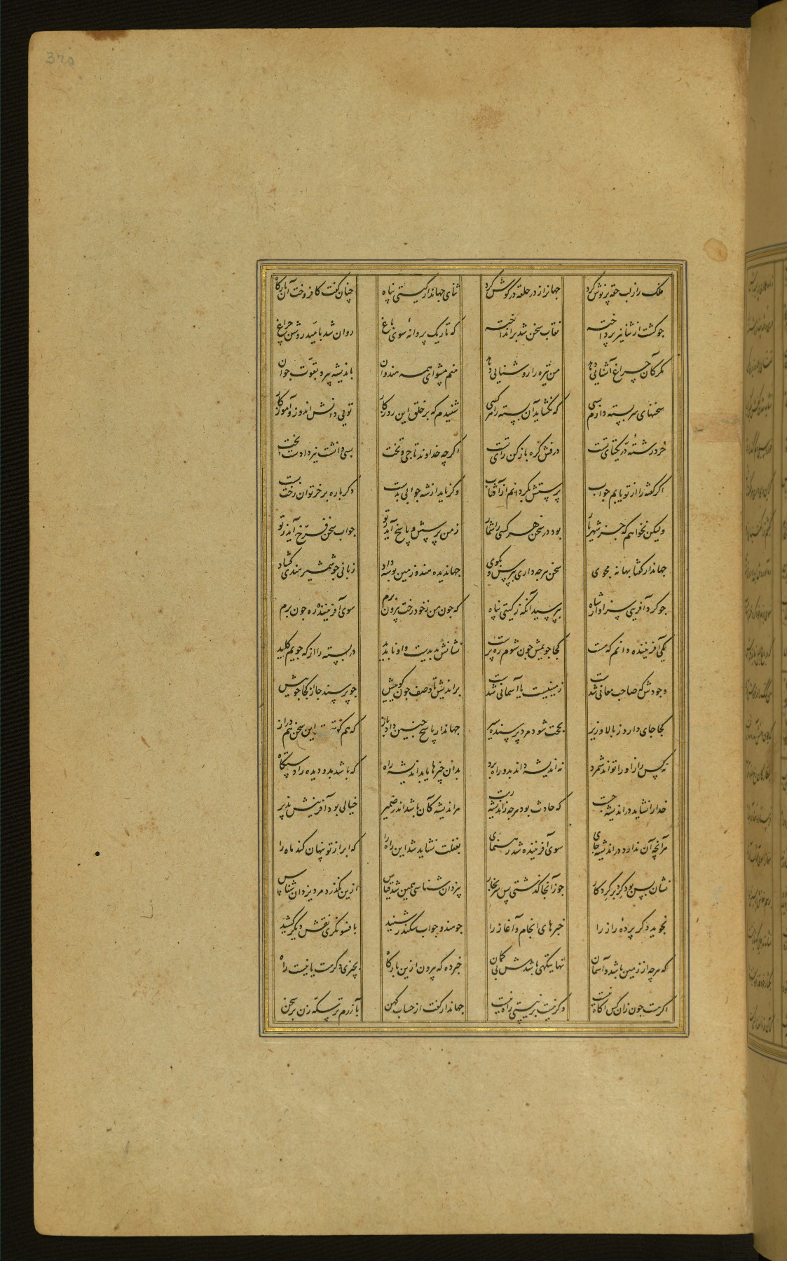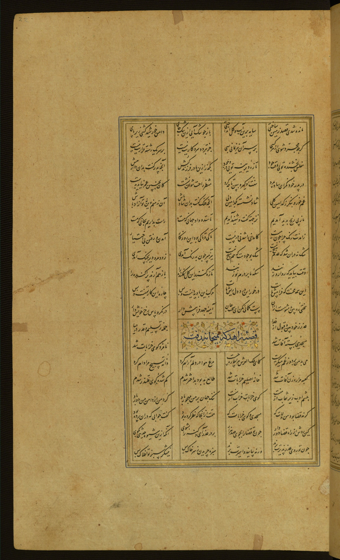 This illuminated and illustrated copy of the Khamsah (quintet) of Niẓāmī Ganjavī (d. 605 AH / 1209 CE) was written by Yār Muḥammad al-Haravī in 922 AH / 1516 CE. Written in four columns in black nastaʿlīq script, this manuscript opens with a double-page illuminated frontispiece signed by ʿAbd al-Wahhāb ibn ʿAbd al-Fattāḥ ibn ʿAlī. It contains thirty-five illustrations that were repainted in India during the twelfth century AH / eighteenth CE. The seal of Muḥammad Asharf ibn Muḥammad Khātam al-Ḥusaynī, dated 1173 AH / 1759-60 CE appears on fols. 1a and 401a. It is possible that the brown leather binding with center and side panels brushed with gold is original to the manuscript but was repaired at a later stage in the codex's history.