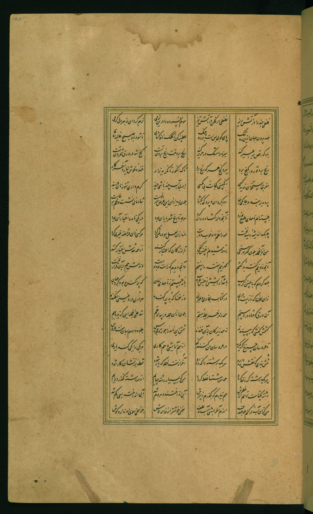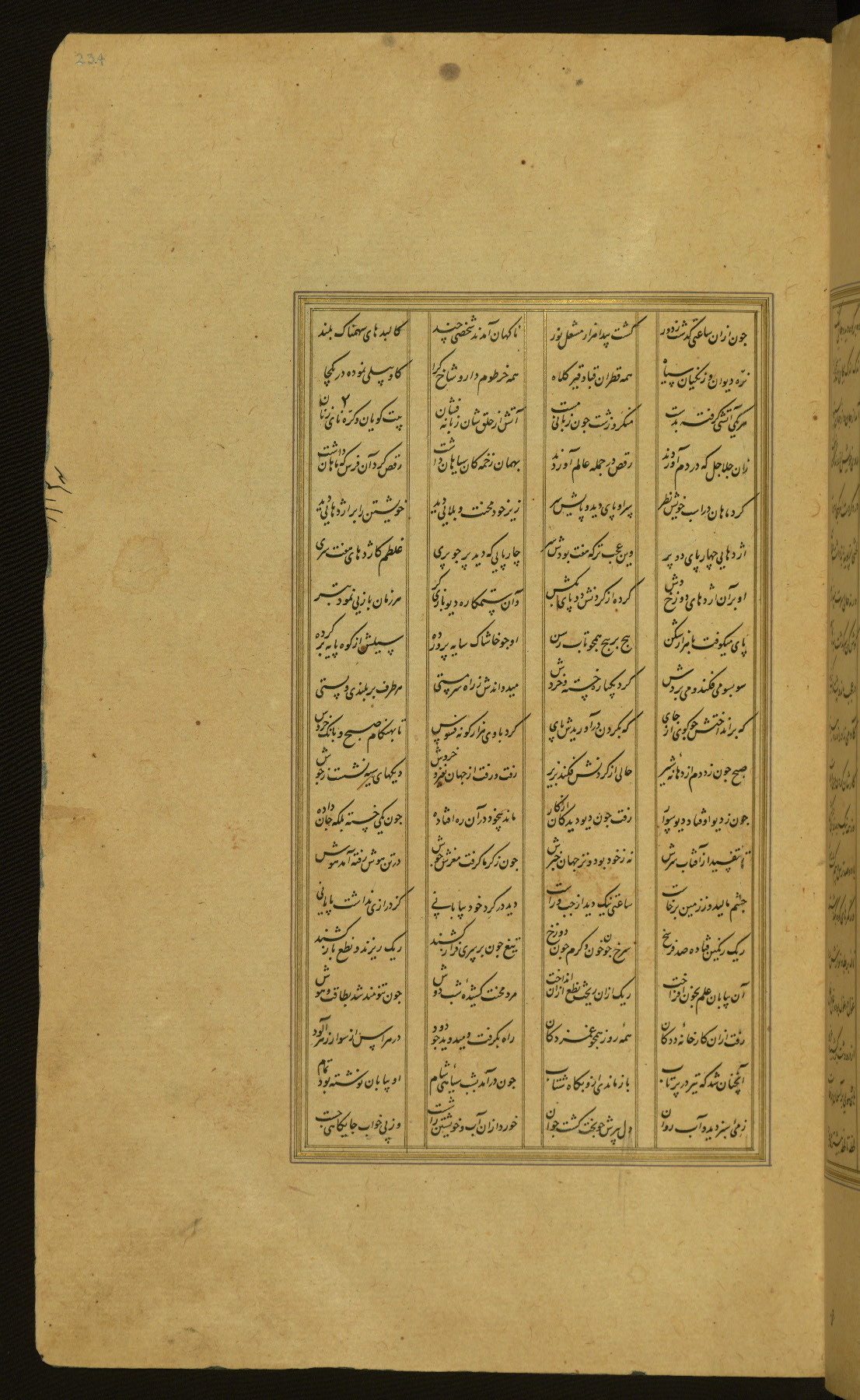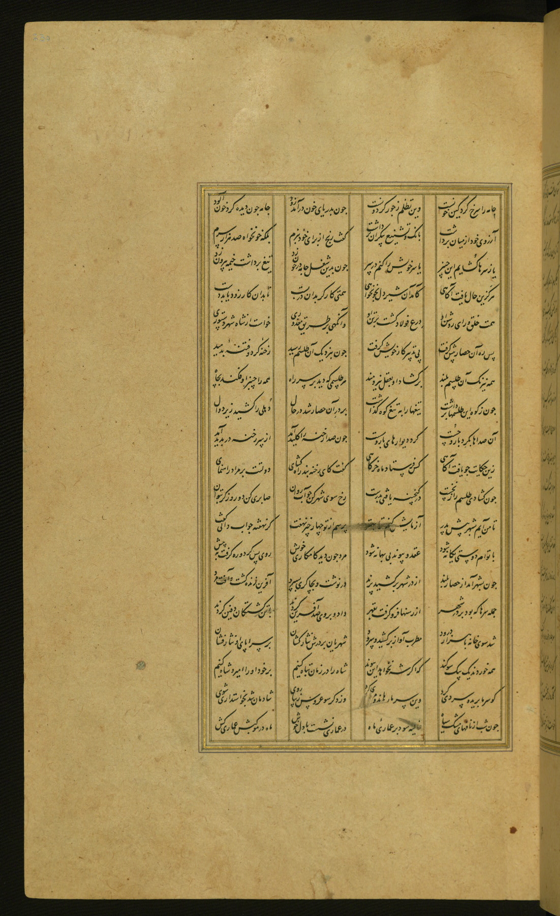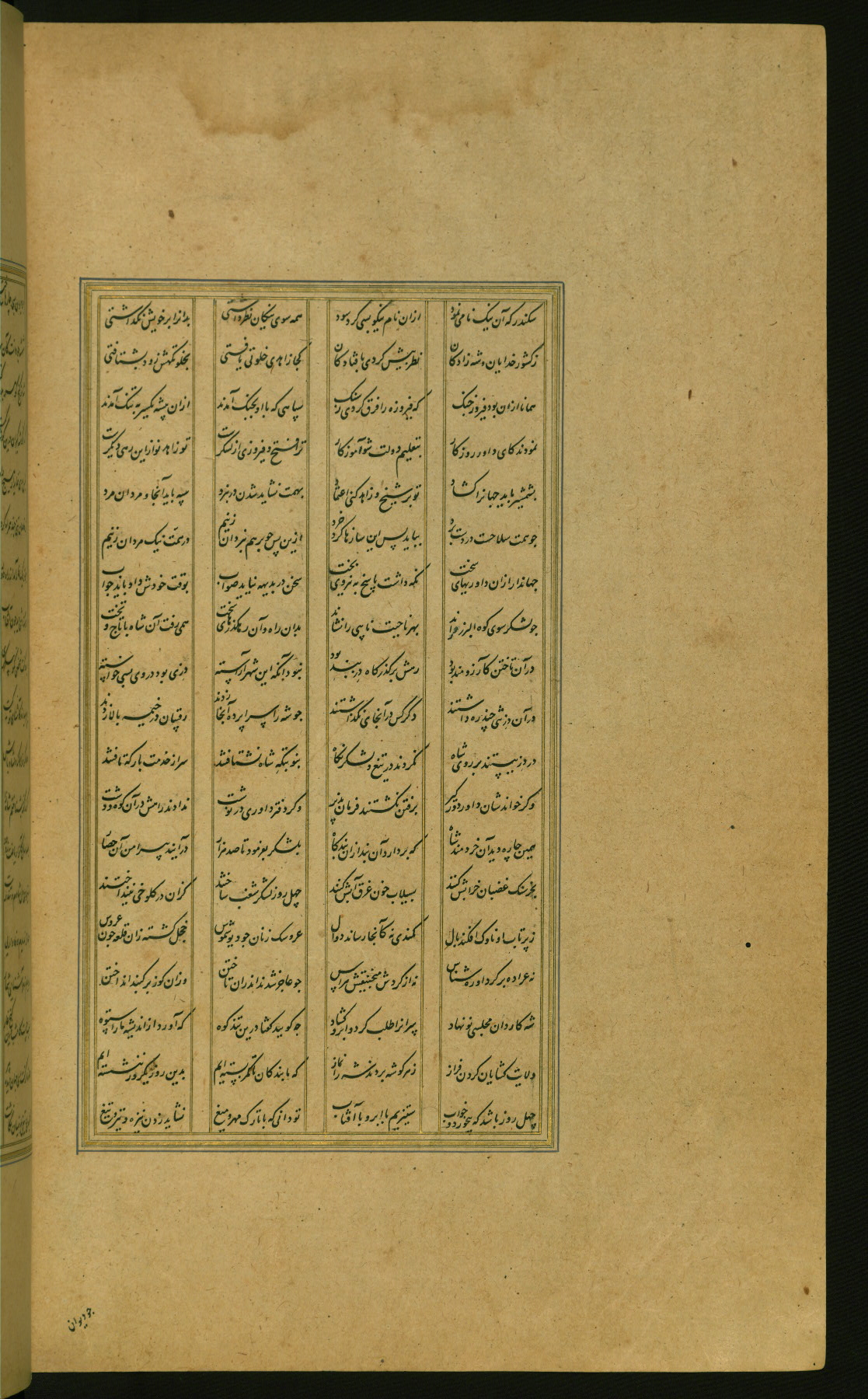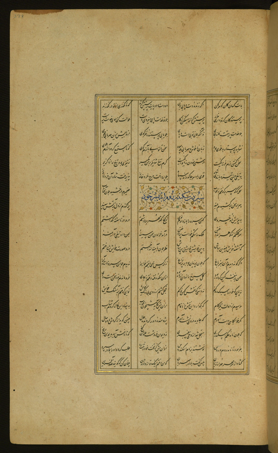 This illuminated and illustrated copy of the Khamsah (quintet) of Niẓāmī Ganjavī (d. 605 AH / 1209 CE) was written by Yār Muḥammad al-Haravī in 922 AH / 1516 CE. Written in four columns in black nastaʿlīq script, this manuscript opens with a double-page illuminated frontispiece signed by ʿAbd al-Wahhāb ibn ʿAbd al-Fattāḥ ibn ʿAlī. It contains thirty-five illustrations that were repainted in India during the twelfth century AH / eighteenth CE. The seal of Muḥammad Asharf ibn Muḥammad Khātam al-Ḥusaynī, dated 1173 AH / 1759-60 CE appears on fols. 1a and 401a. It is possible that the brown leather binding with center and side panels brushed with gold is original to the manuscript but was repaired at a later stage in the codex's history.