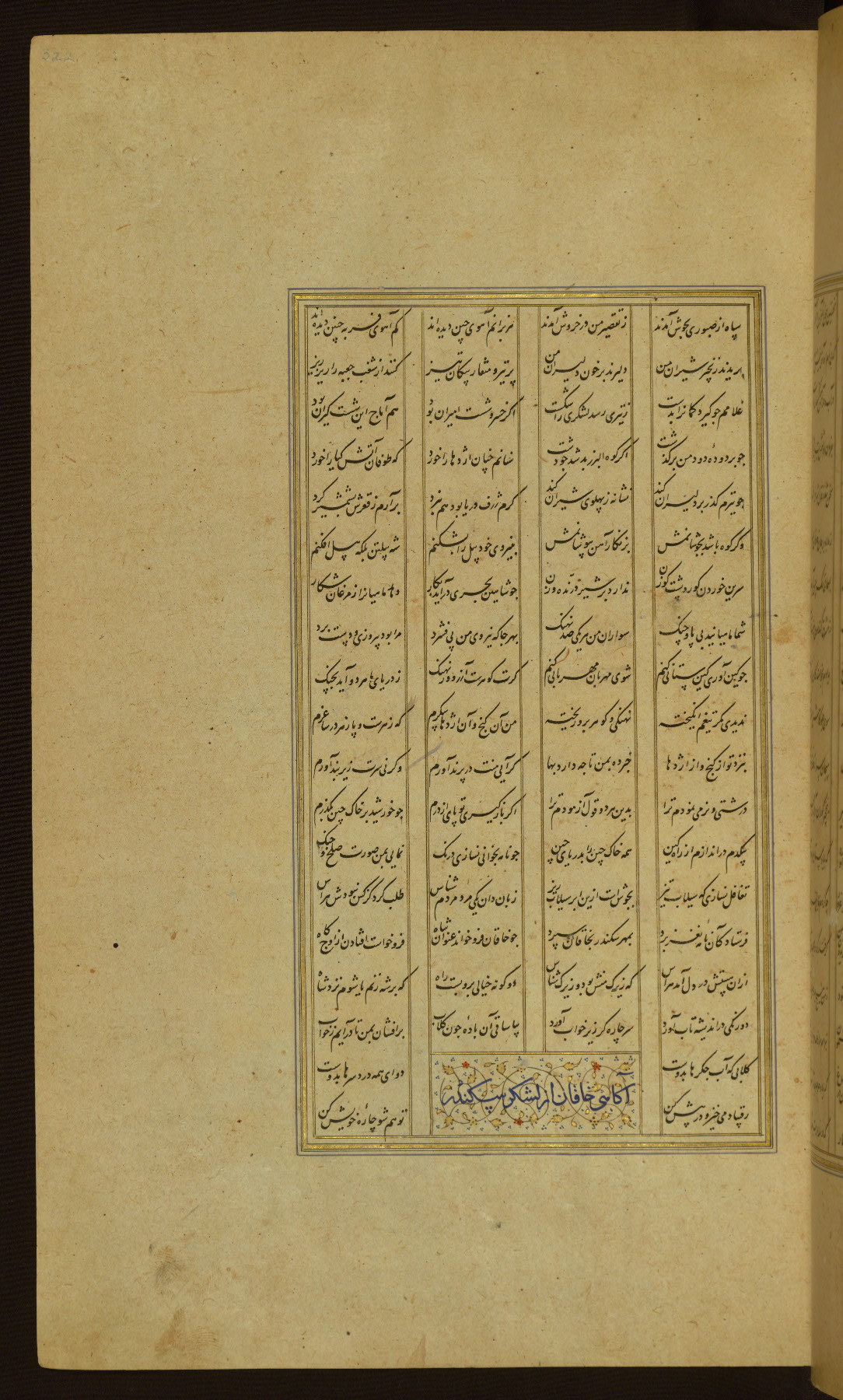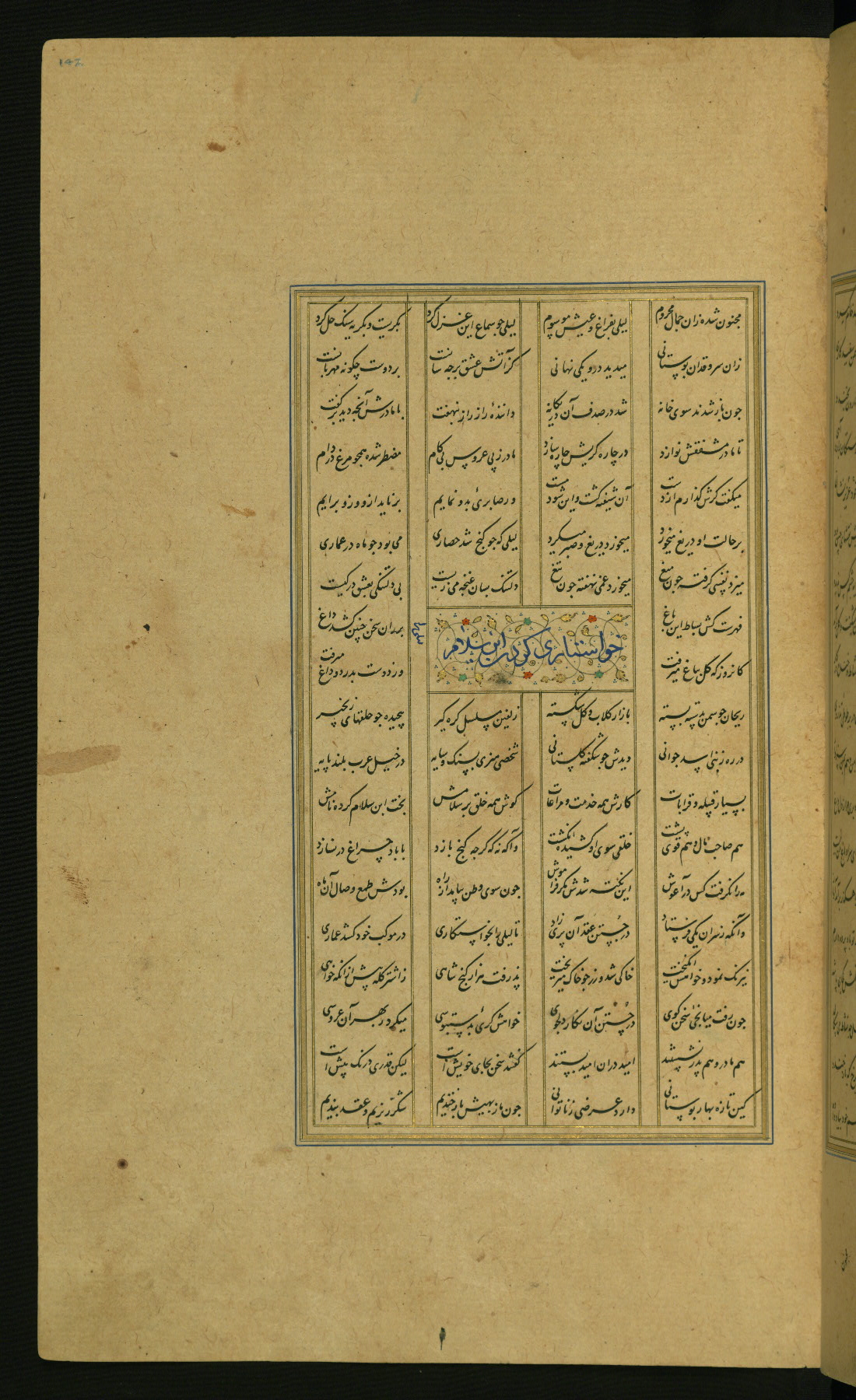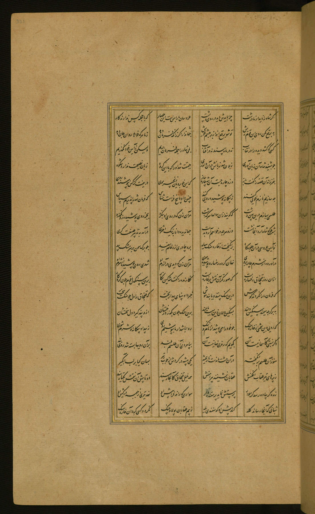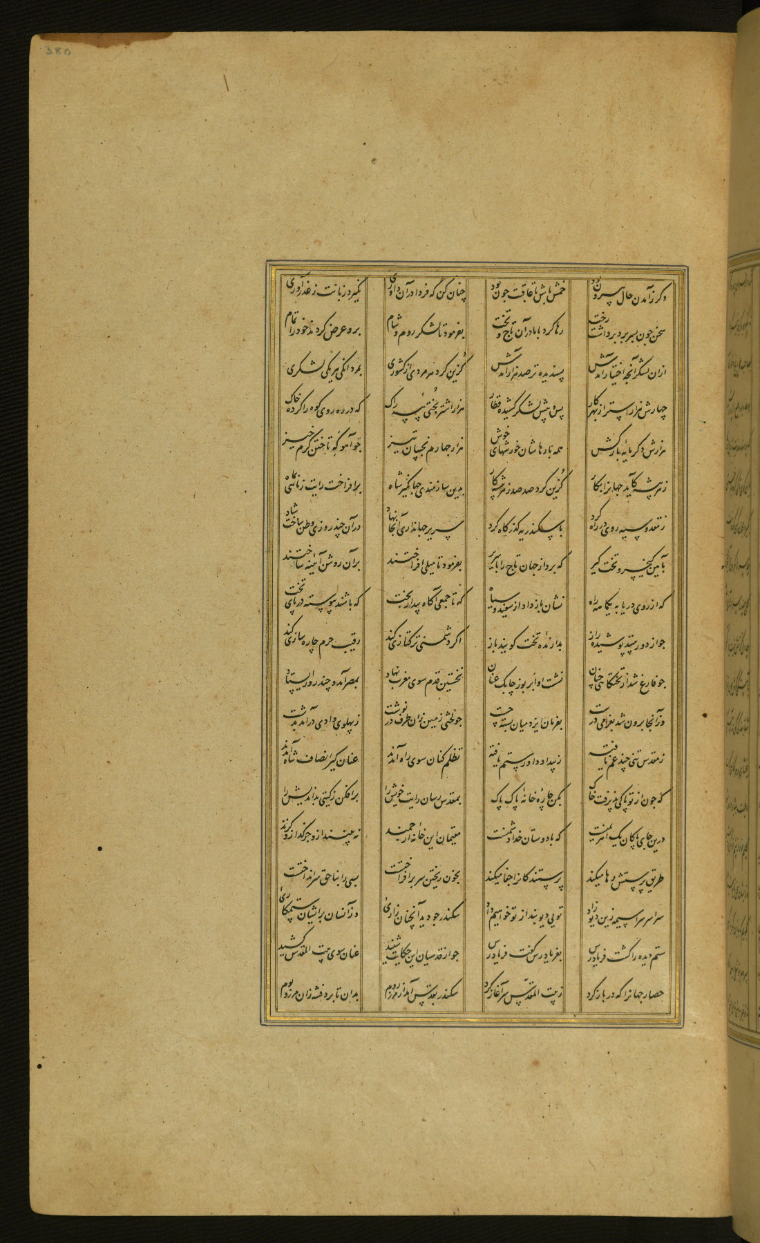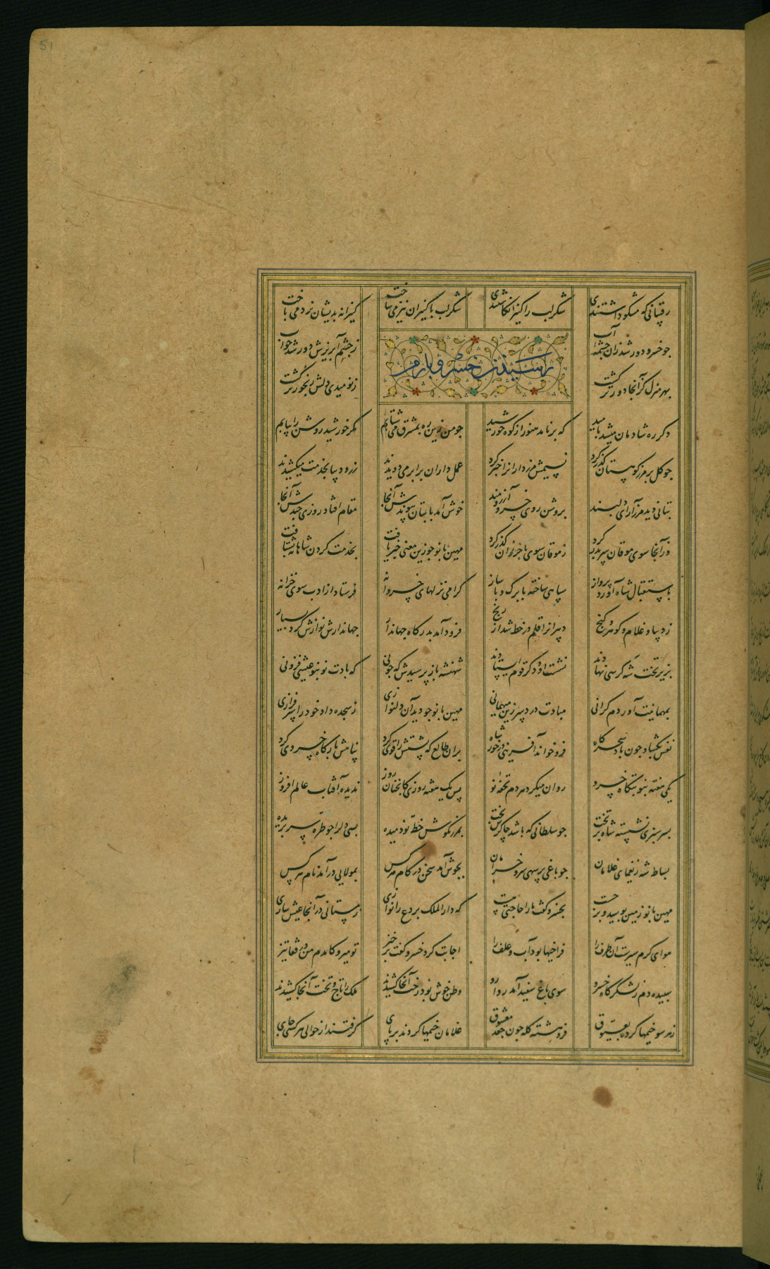 This illuminated and illustrated copy of the Khamsah (quintet) of Niẓāmī Ganjavī (d. 605 AH / 1209 CE) was written by Yār Muḥammad al-Haravī in 922 AH / 1516 CE. Written in four columns in black nastaʿlīq script, this manuscript opens with a double-page illuminated frontispiece signed by ʿAbd al-Wahhāb ibn ʿAbd al-Fattāḥ ibn ʿAlī. It contains thirty-five illustrations that were repainted in India during the twelfth century AH / eighteenth CE. The seal of Muḥammad Asharf ibn Muḥammad Khātam al-Ḥusaynī, dated 1173 AH / 1759-60 CE appears on fols. 1a and 401a. It is possible that the brown leather binding with center and side panels brushed with gold is original to the manuscript but was repaired at a later stage in the codex's history.