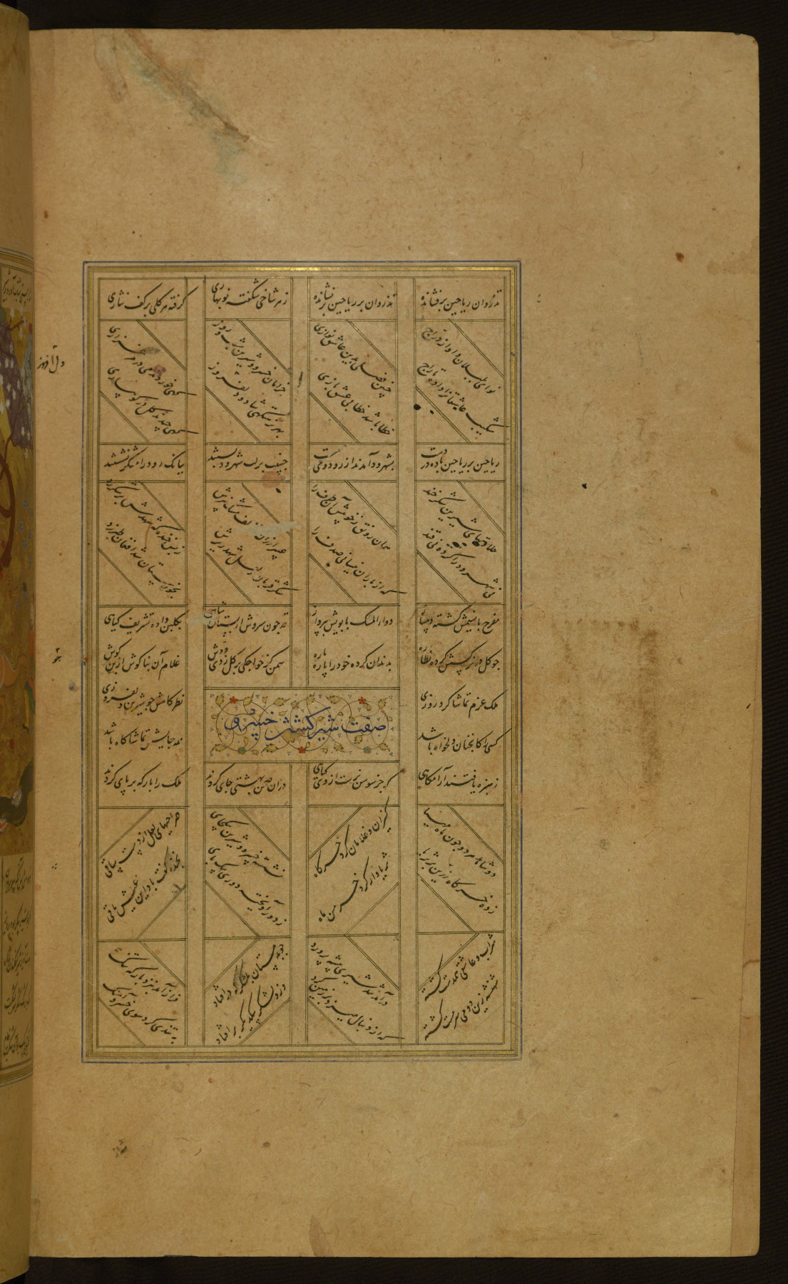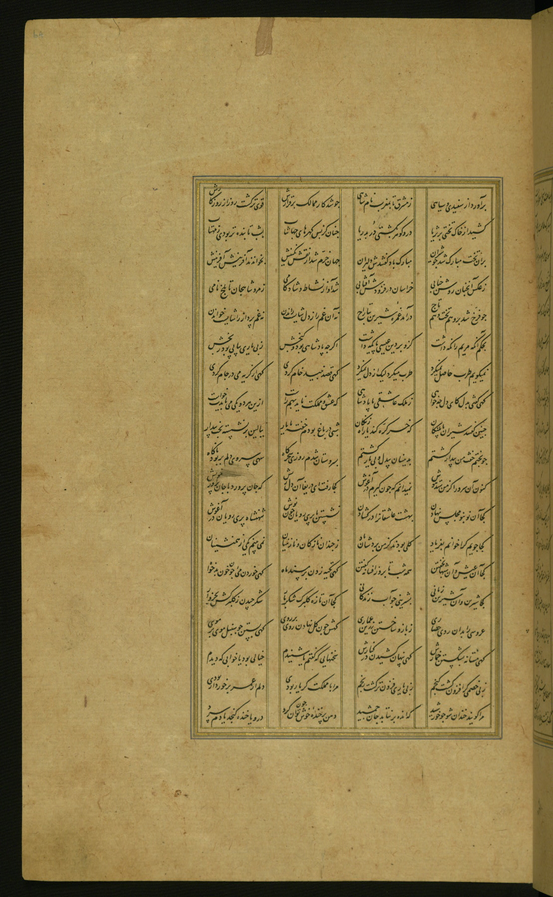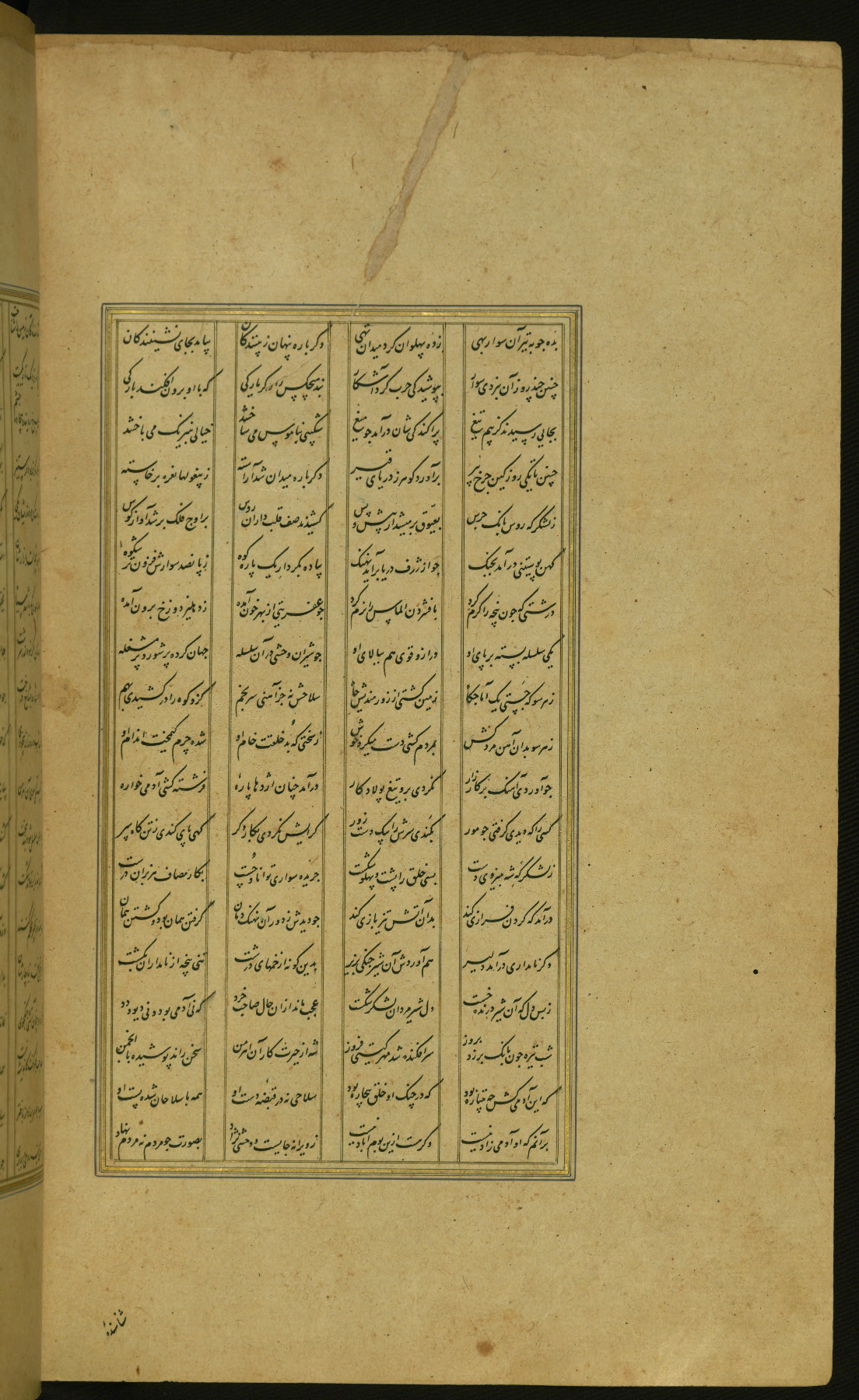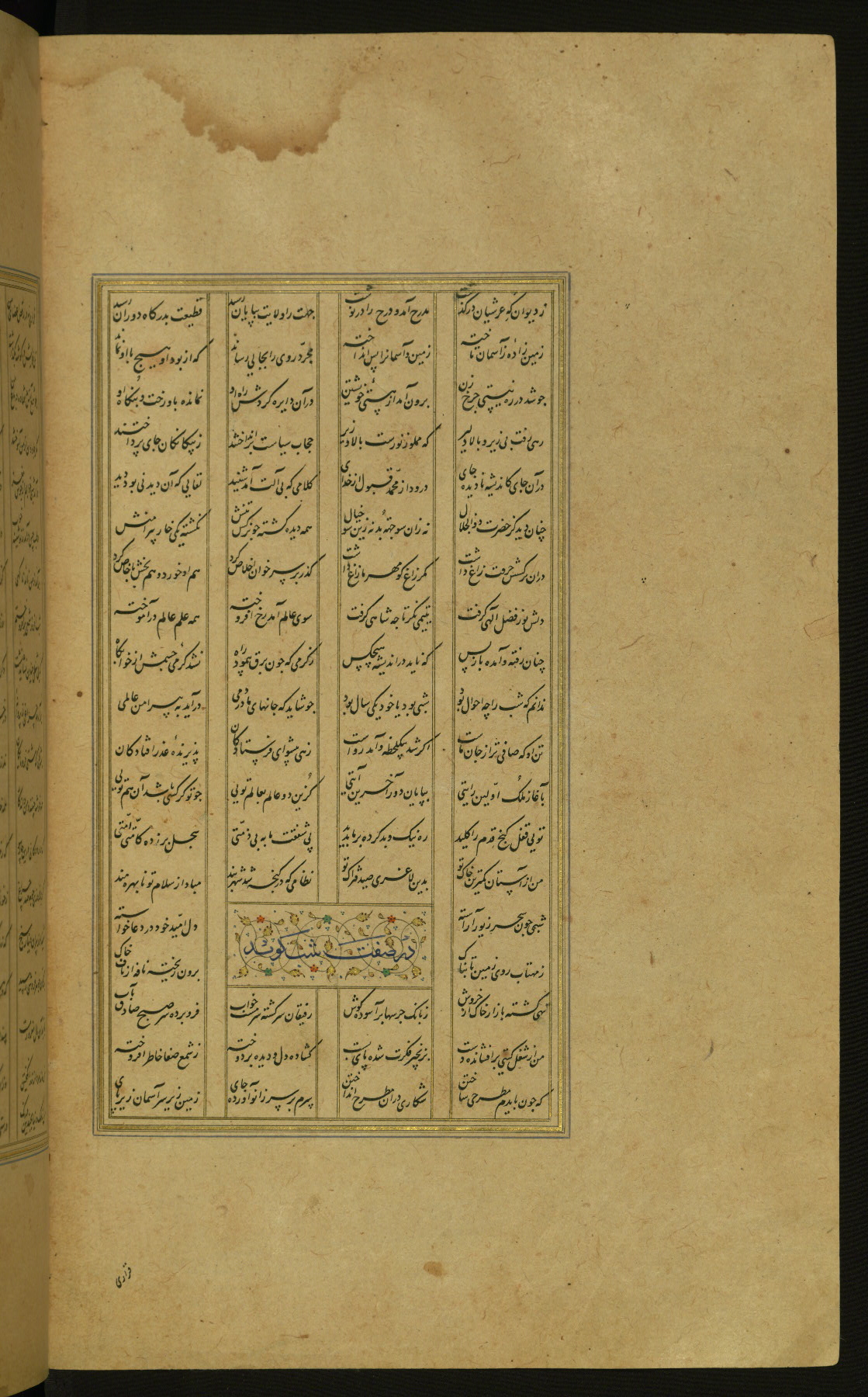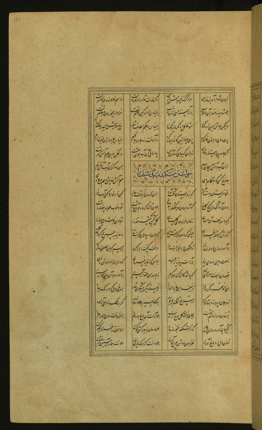 This illuminated and illustrated copy of the Khamsah (quintet) of Niẓāmī Ganjavī (d. 605 AH / 1209 CE) was written by Yār Muḥammad al-Haravī in 922 AH / 1516 CE. Written in four columns in black nastaʿlīq script, this manuscript opens with a double-page illuminated frontispiece signed by ʿAbd al-Wahhāb ibn ʿAbd al-Fattāḥ ibn ʿAlī. It contains thirty-five illustrations that were repainted in India during the twelfth century AH / eighteenth CE. The seal of Muḥammad Asharf ibn Muḥammad Khātam al-Ḥusaynī, dated 1173 AH / 1759-60 CE appears on fols. 1a and 401a. It is possible that the brown leather binding with center and side panels brushed with gold is original to the manuscript but was repaired at a later stage in the codex's history.