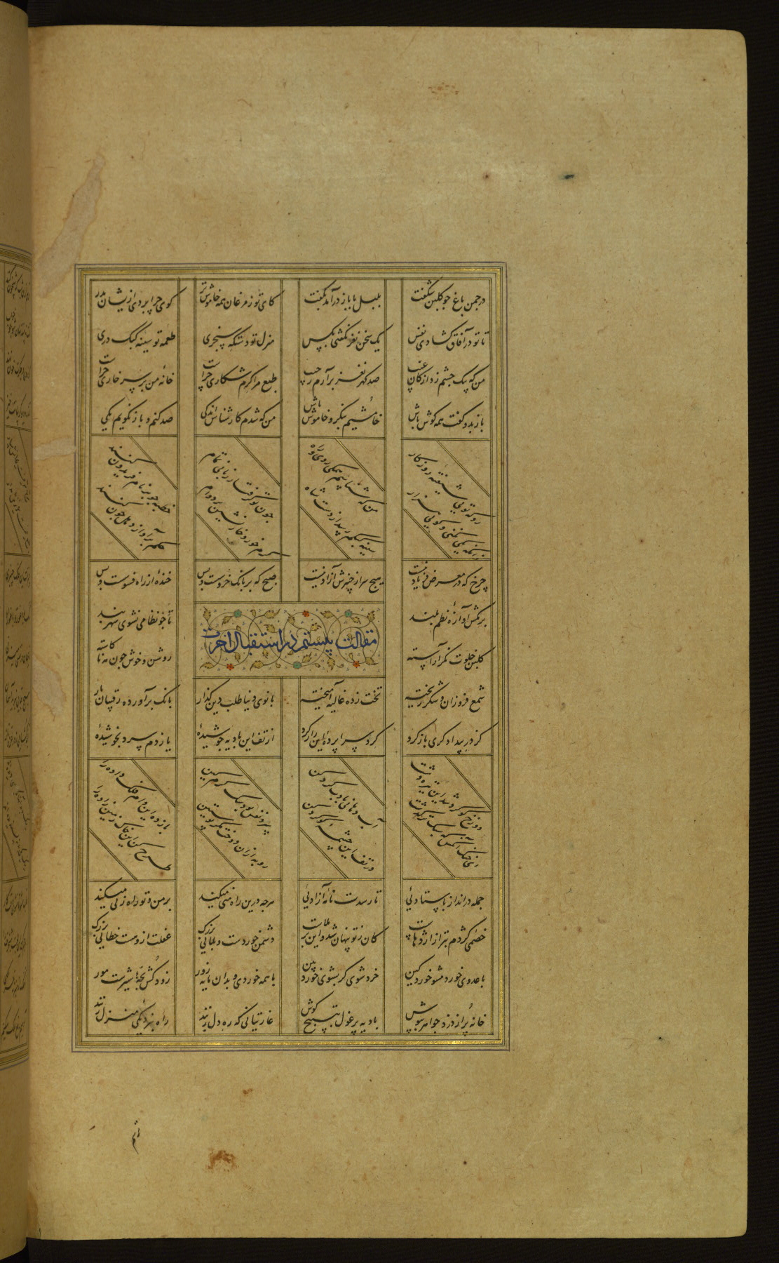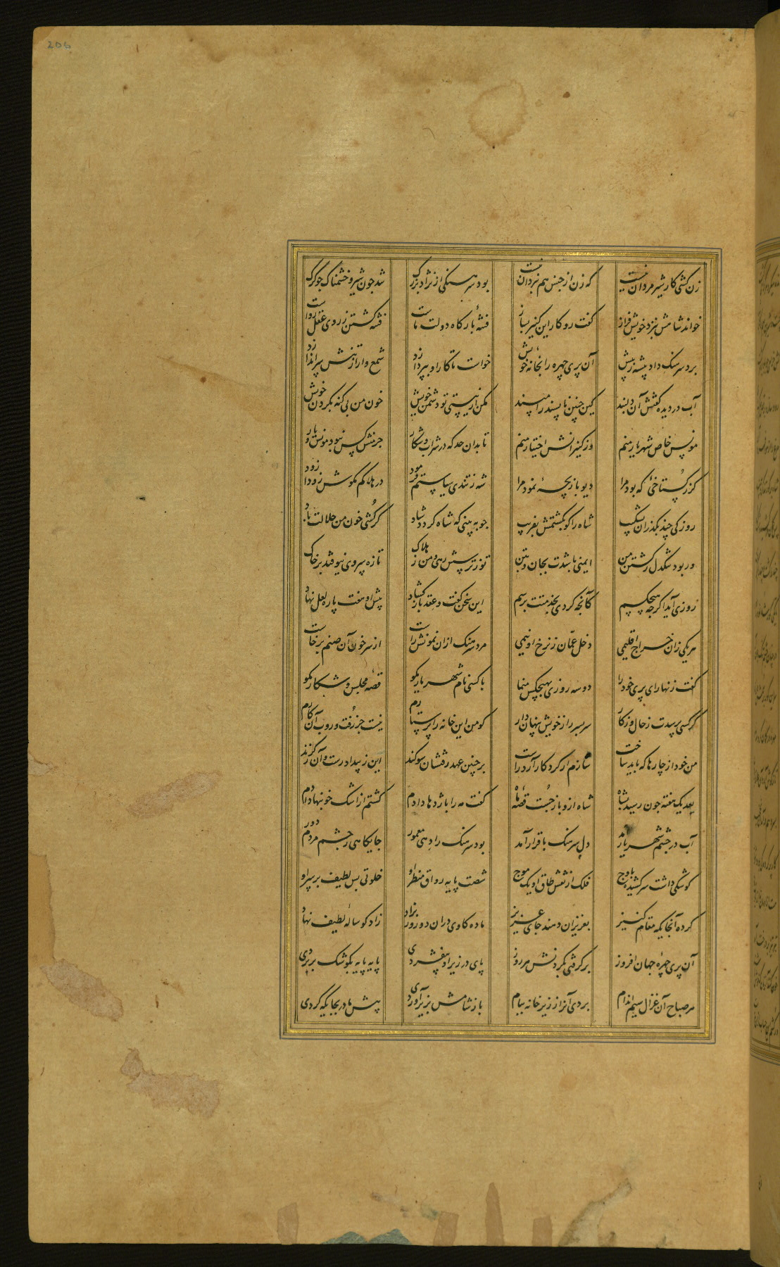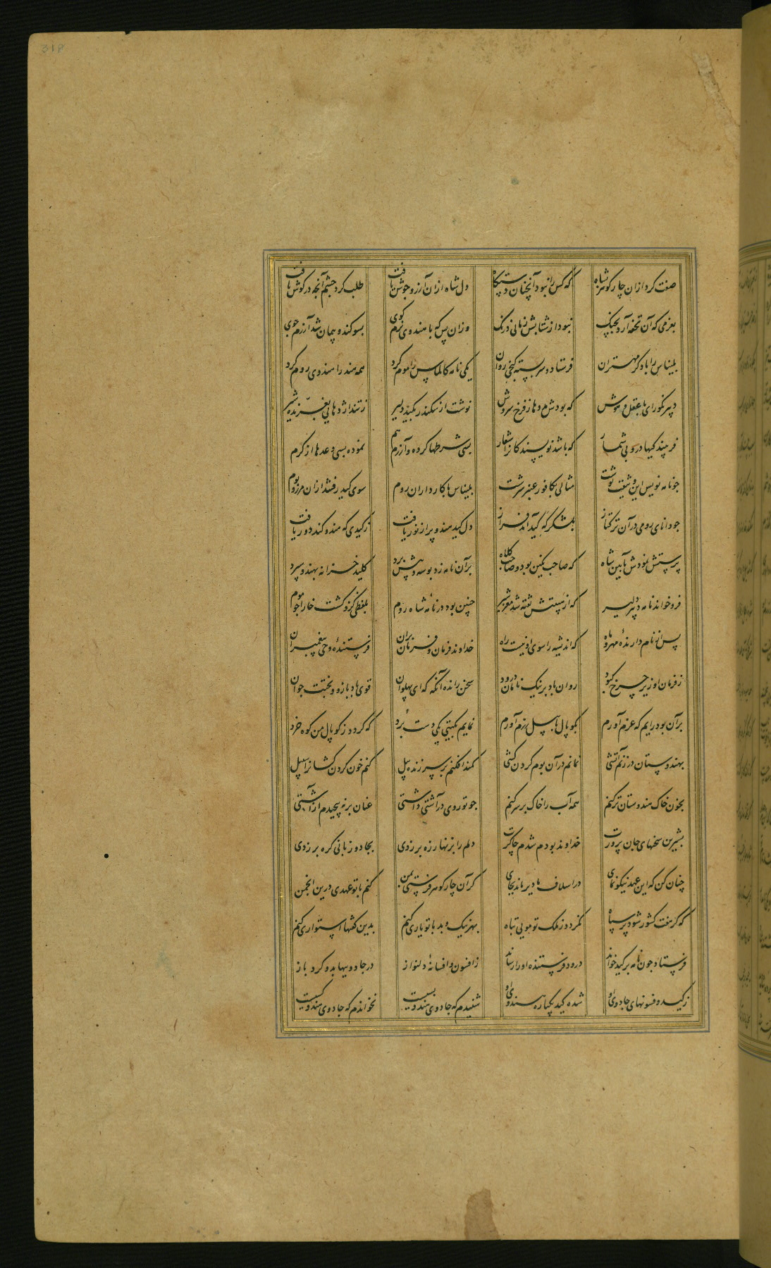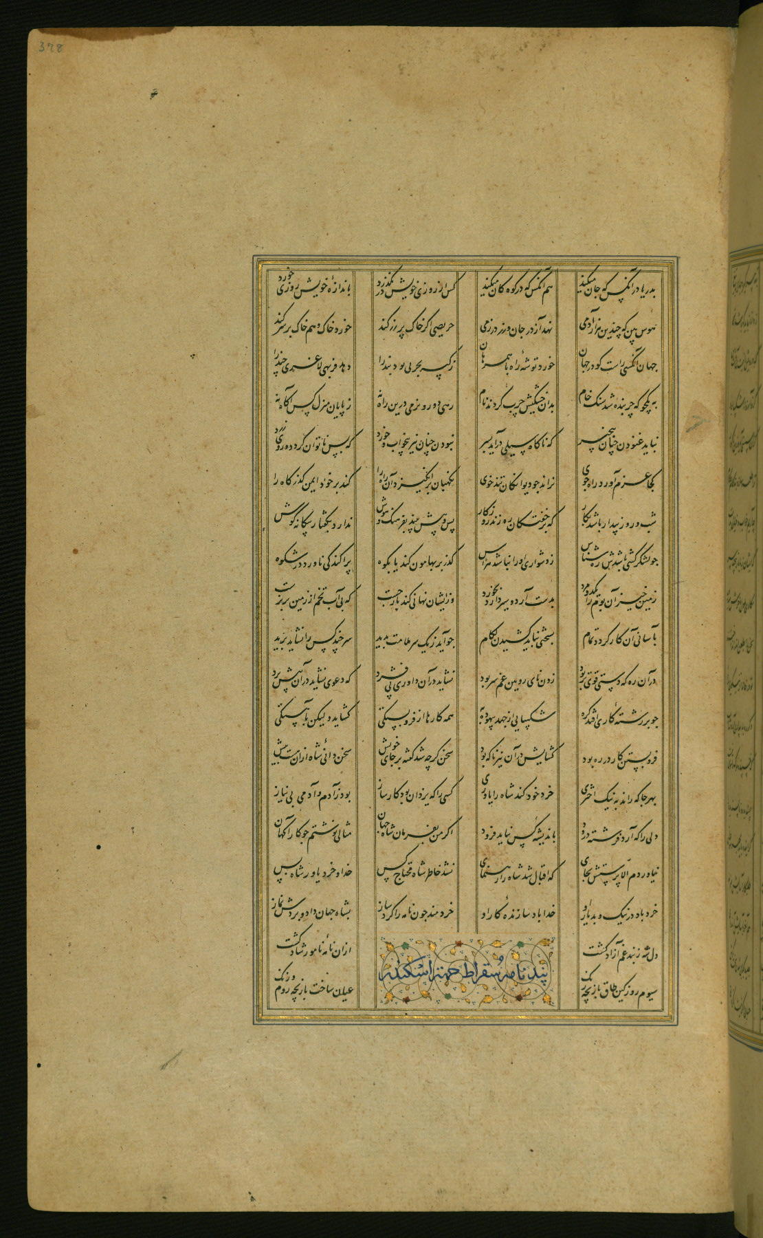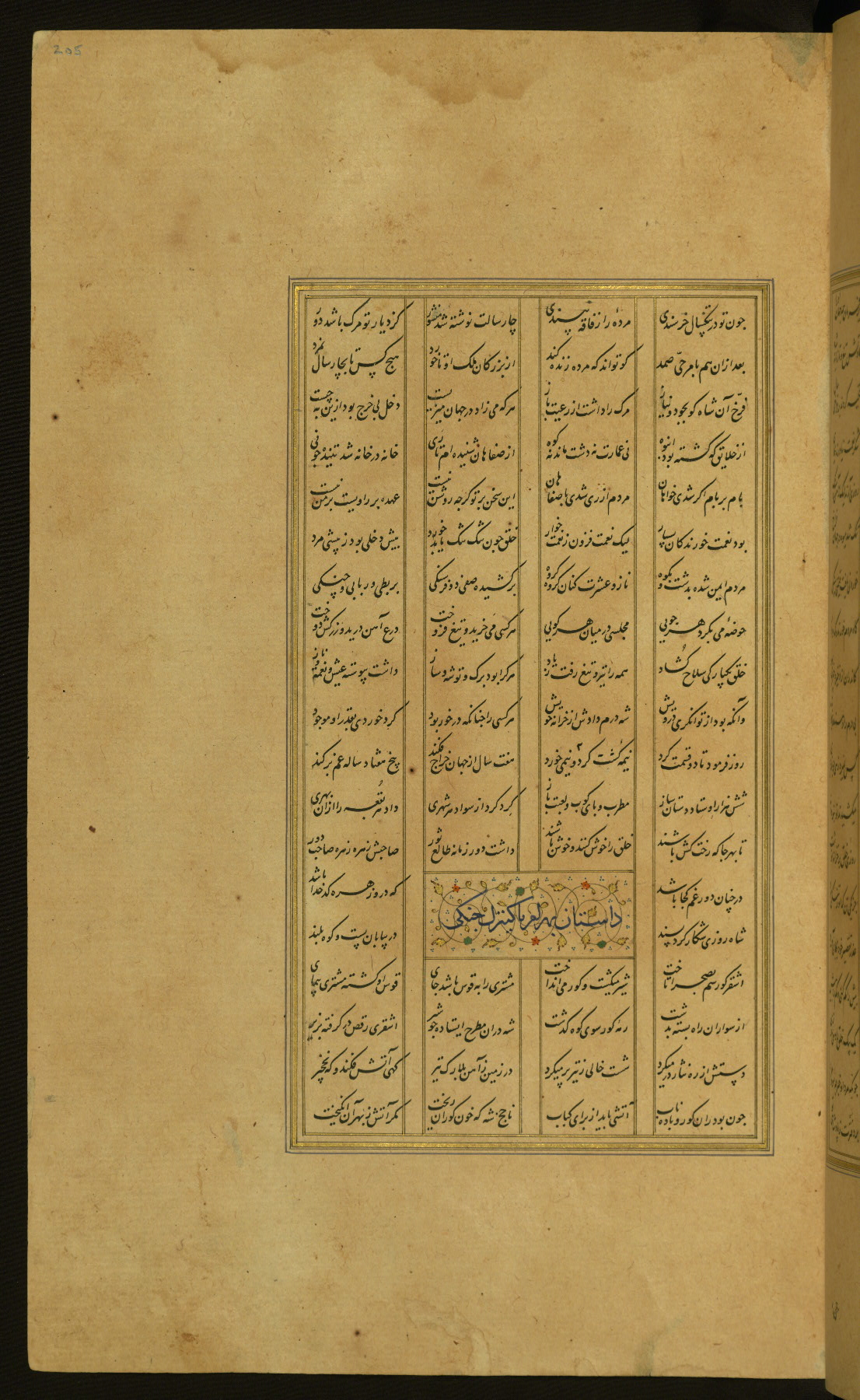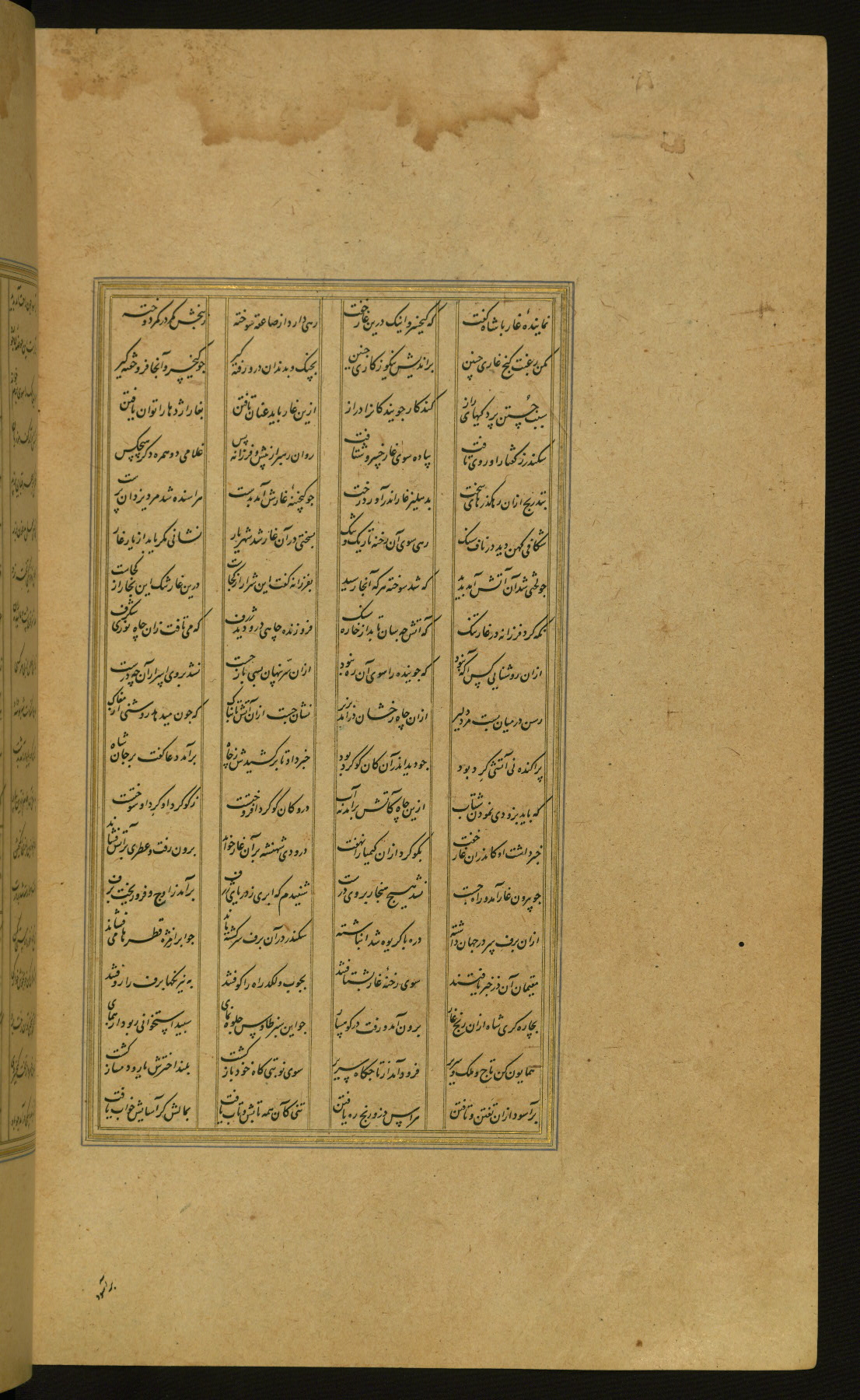 This illuminated and illustrated copy of the Khamsah (quintet) of Niẓāmī Ganjavī (d. 605 AH / 1209 CE) was written by Yār Muḥammad al-Haravī in 922 AH / 1516 CE. Written in four columns in black nastaʿlīq script, this manuscript opens with a double-page illuminated frontispiece signed by ʿAbd al-Wahhāb ibn ʿAbd al-Fattāḥ ibn ʿAlī. It contains thirty-five illustrations that were repainted in India during the twelfth century AH / eighteenth CE. The seal of Muḥammad Asharf ibn Muḥammad Khātam al-Ḥusaynī, dated 1173 AH / 1759-60 CE appears on fols. 1a and 401a. It is possible that the brown leather binding with center and side panels brushed with gold is original to the manuscript but was repaired at a later stage in the codex's history.