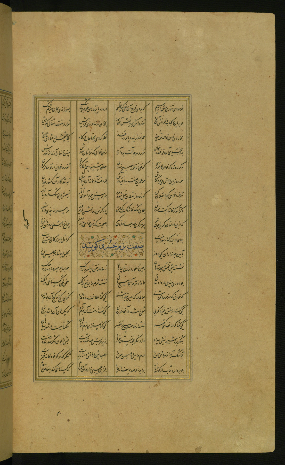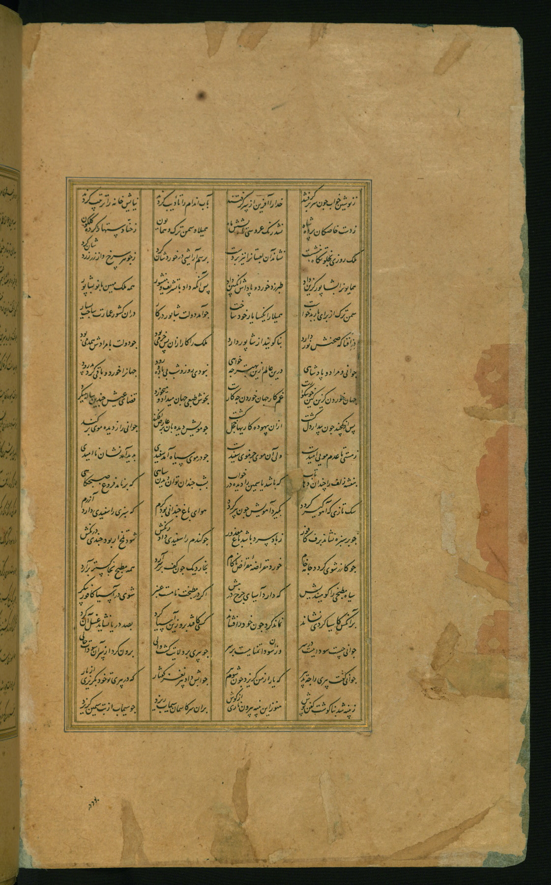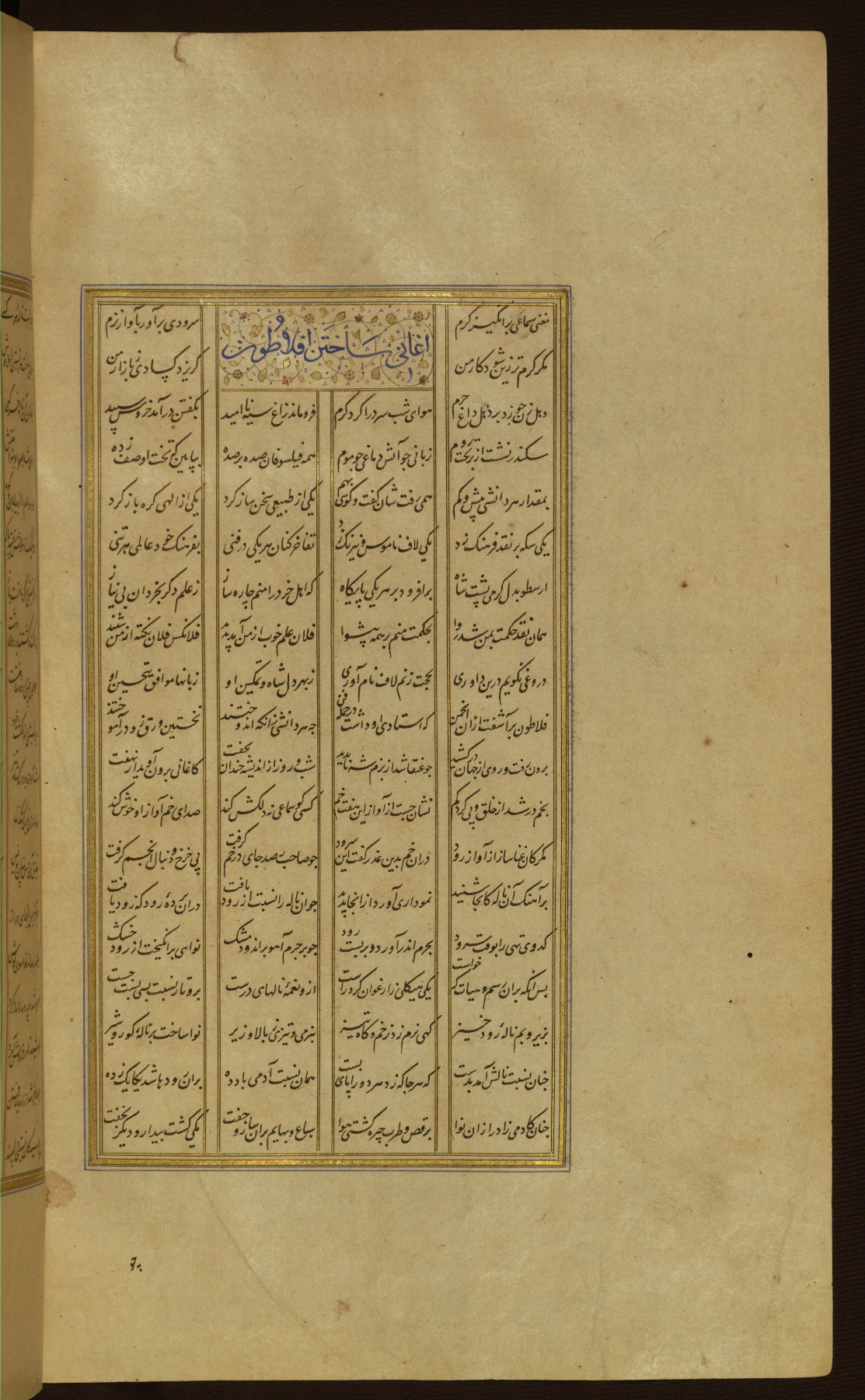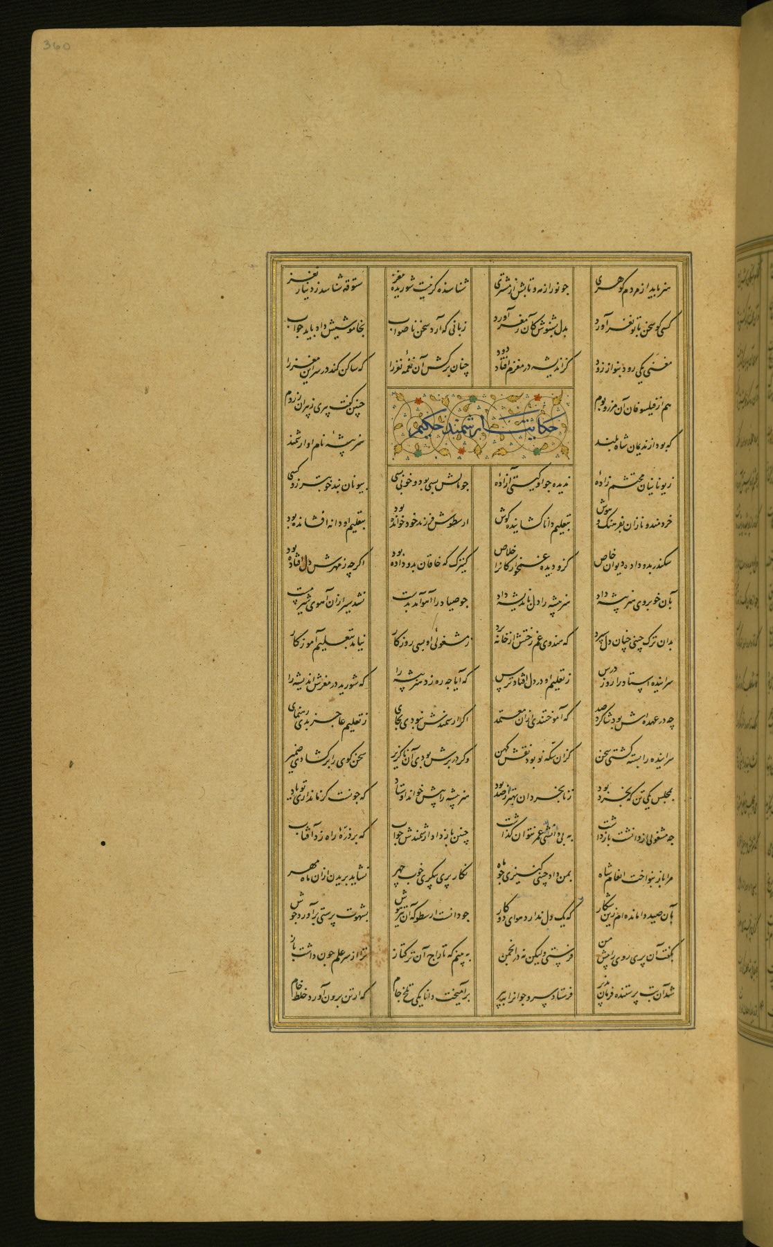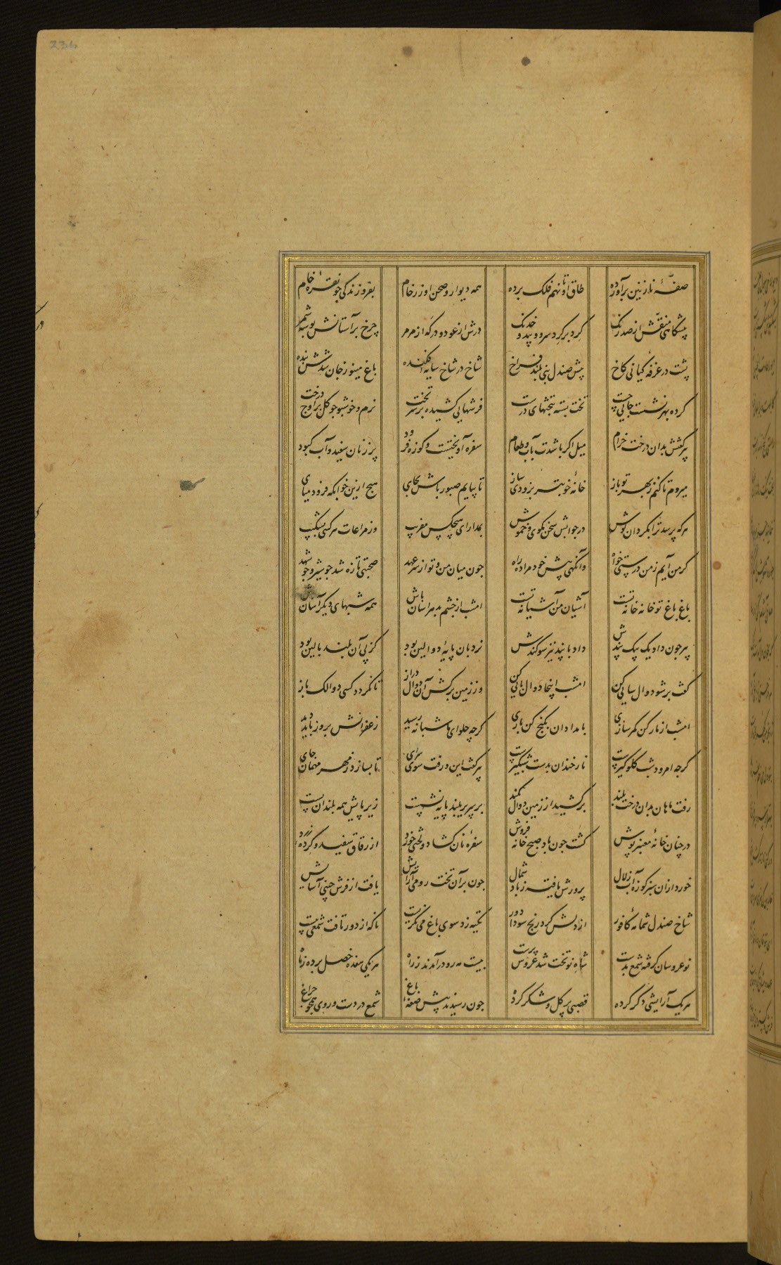 This illuminated and illustrated copy of the Khamsah (quintet) of Niẓāmī Ganjavī (d. 605 AH / 1209 CE) was written by Yār Muḥammad al-Haravī in 922 AH / 1516 CE. Written in four columns in black nastaʿlīq script, this manuscript opens with a double-page illuminated frontispiece signed by ʿAbd al-Wahhāb ibn ʿAbd al-Fattāḥ ibn ʿAlī. It contains thirty-five illustrations that were repainted in India during the twelfth century AH / eighteenth CE. The seal of Muḥammad Asharf ibn Muḥammad Khātam al-Ḥusaynī, dated 1173 AH / 1759-60 CE appears on fols. 1a and 401a. It is possible that the brown leather binding with center and side panels brushed with gold is original to the manuscript but was repaired at a later stage in the codex's history.