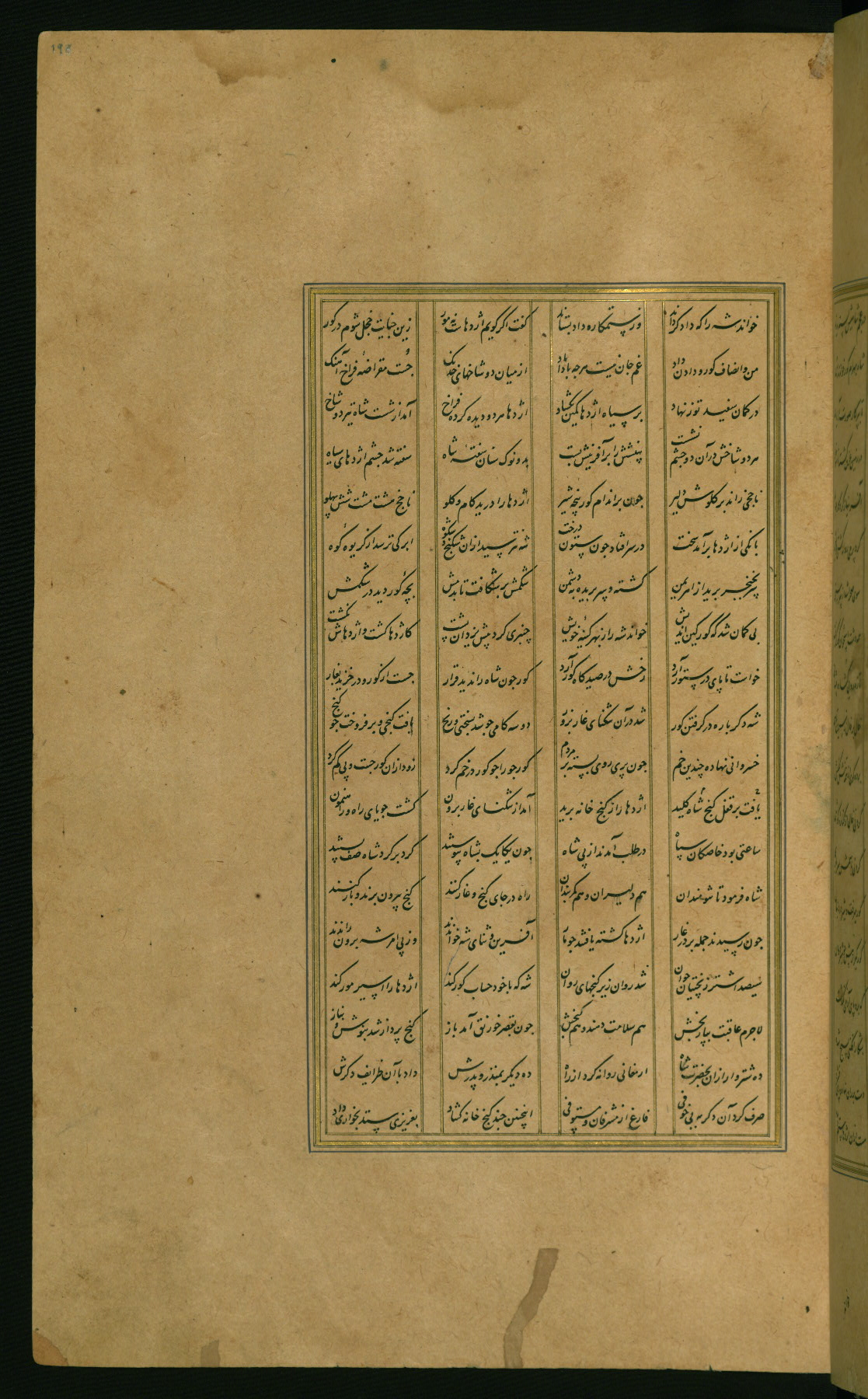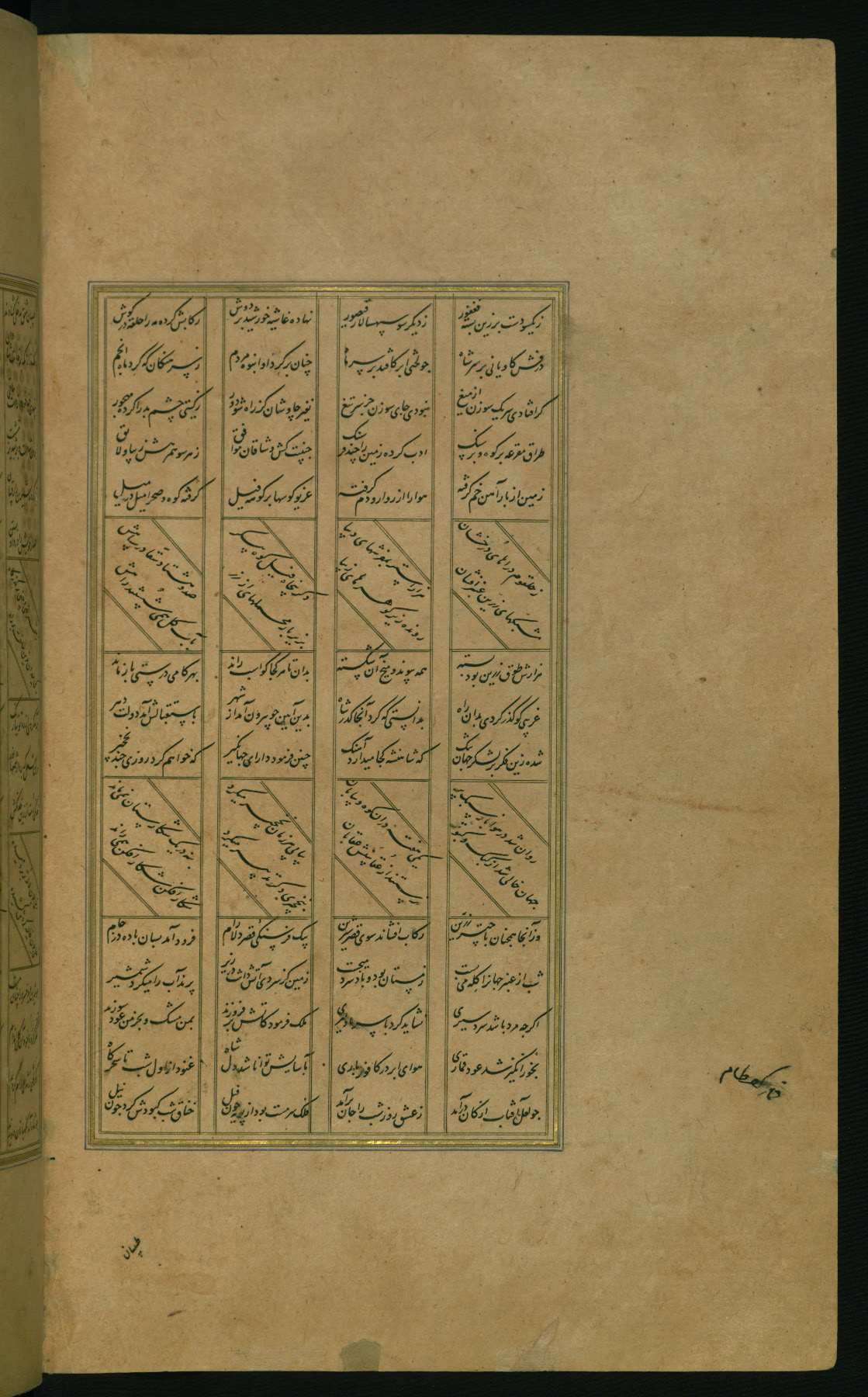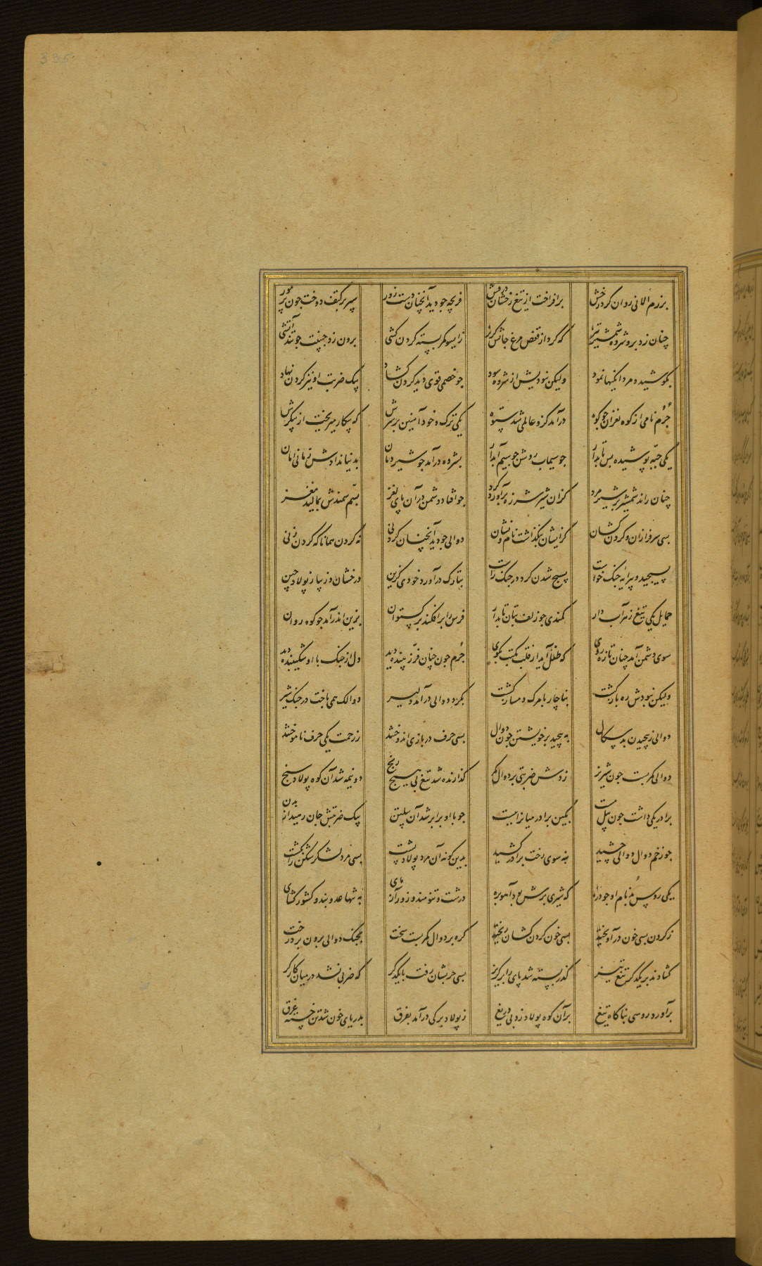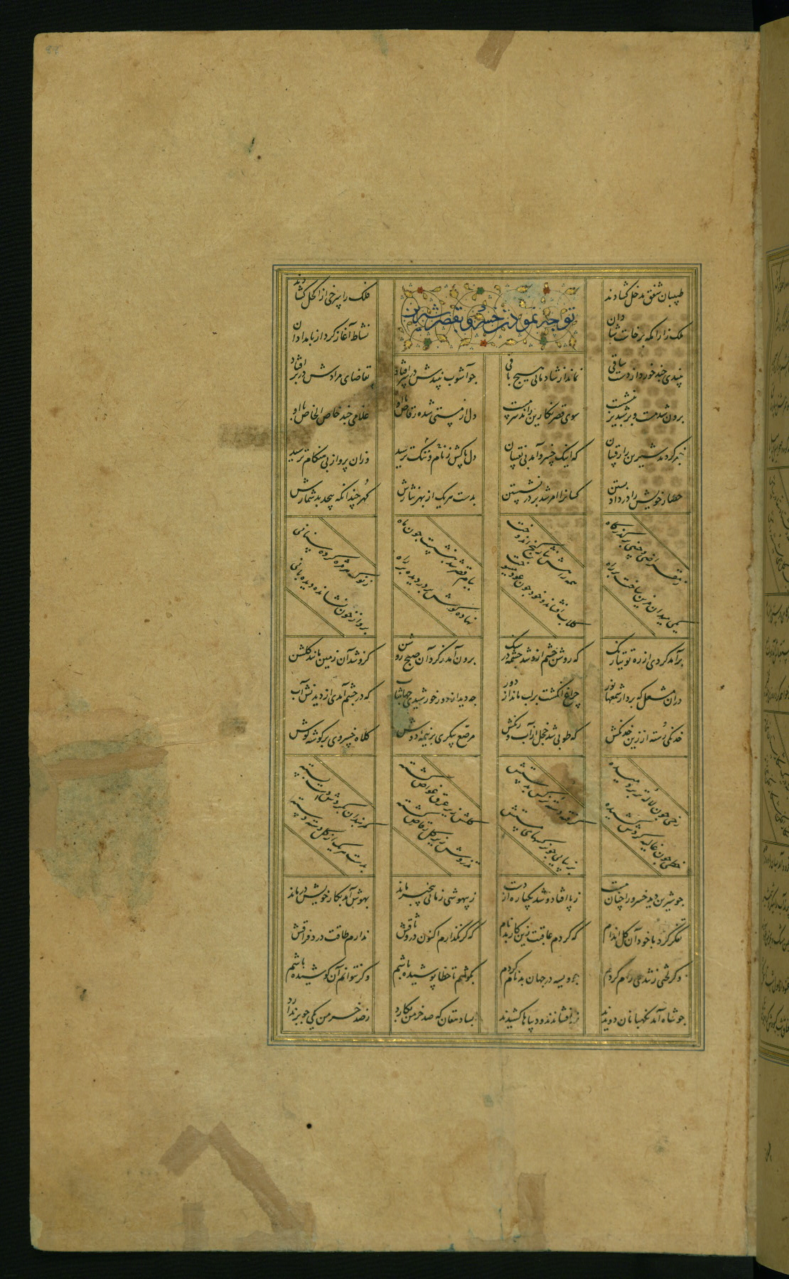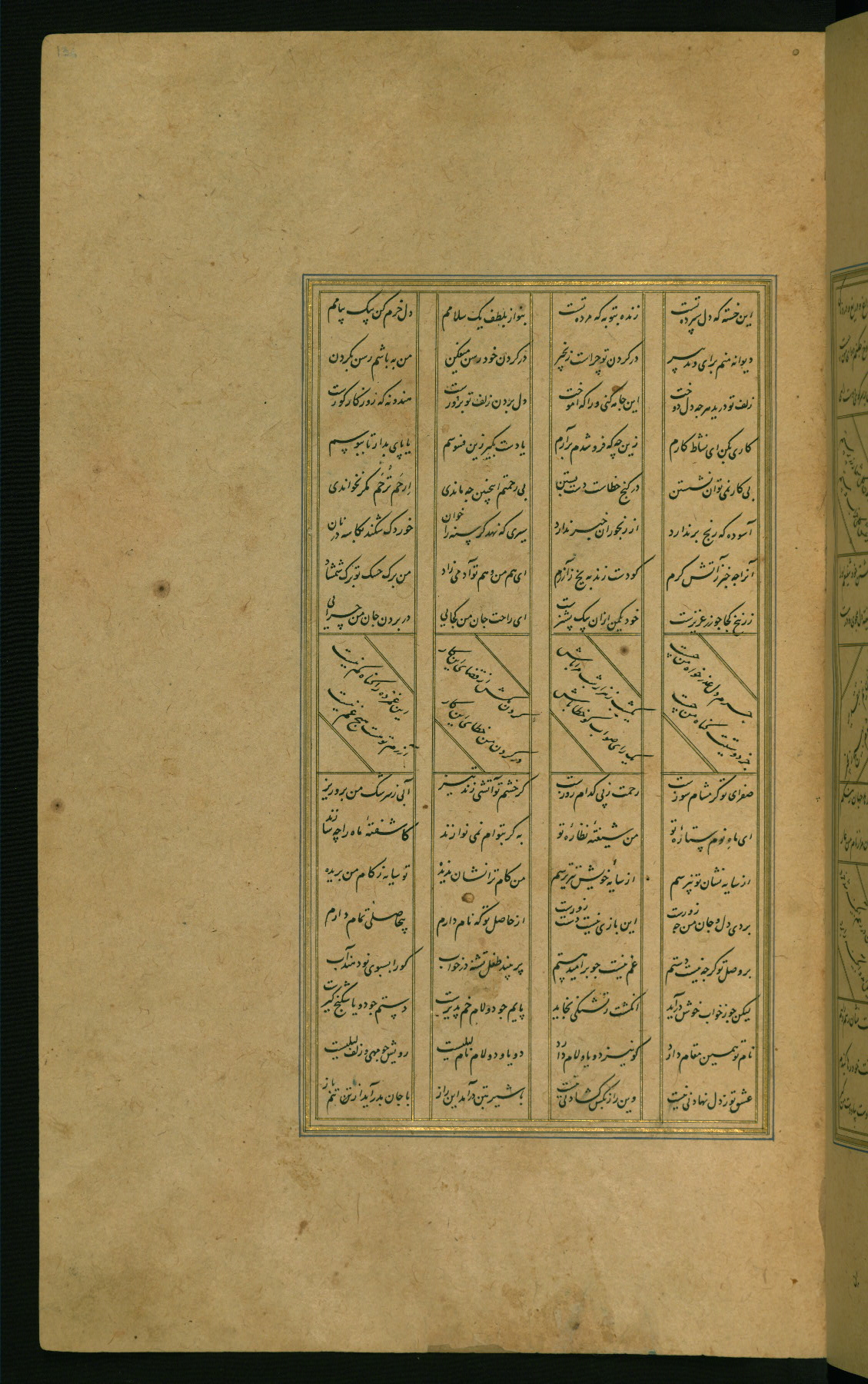 This illuminated and illustrated copy of the Khamsah (quintet) of Niẓāmī Ganjavī (d. 605 AH / 1209 CE) was written by Yār Muḥammad al-Haravī in 922 AH / 1516 CE. Written in four columns in black nastaʿlīq script, this manuscript opens with a double-page illuminated frontispiece signed by ʿAbd al-Wahhāb ibn ʿAbd al-Fattāḥ ibn ʿAlī. It contains thirty-five illustrations that were repainted in India during the twelfth century AH / eighteenth CE. The seal of Muḥammad Asharf ibn Muḥammad Khātam al-Ḥusaynī, dated 1173 AH / 1759-60 CE appears on fols. 1a and 401a. It is possible that the brown leather binding with center and side panels brushed with gold is original to the manuscript but was repaired at a later stage in the codex's history.