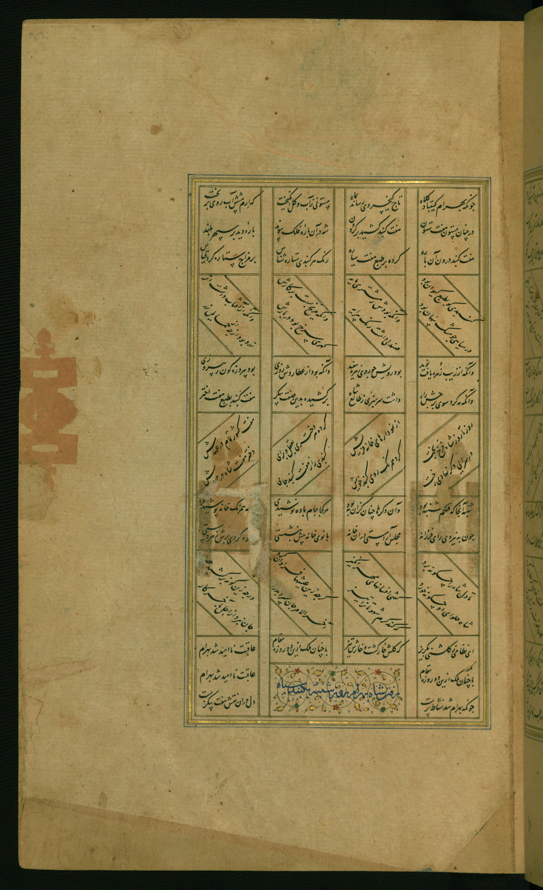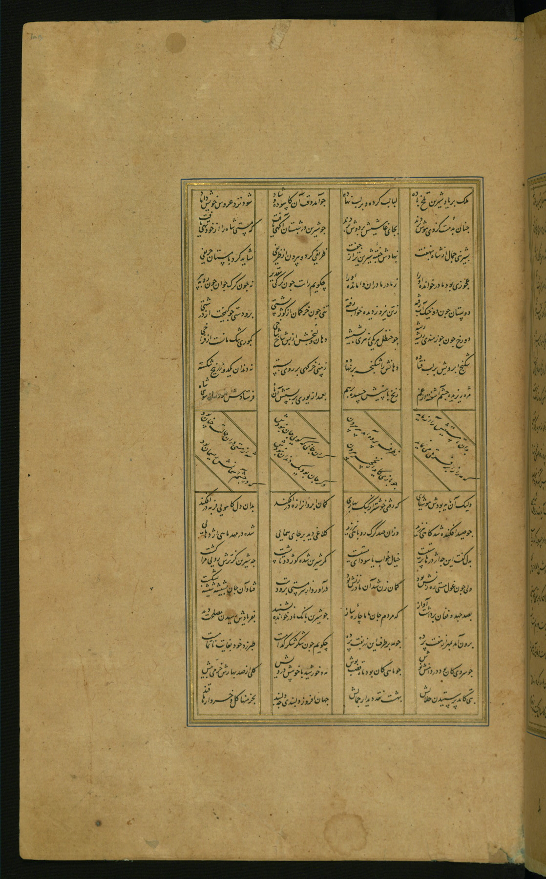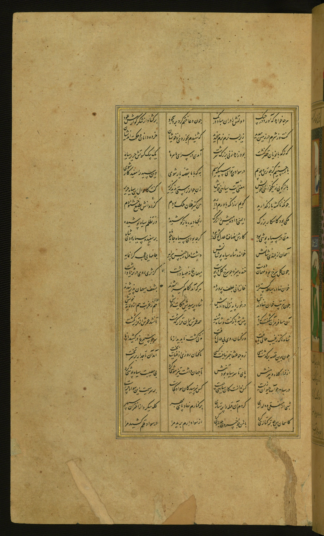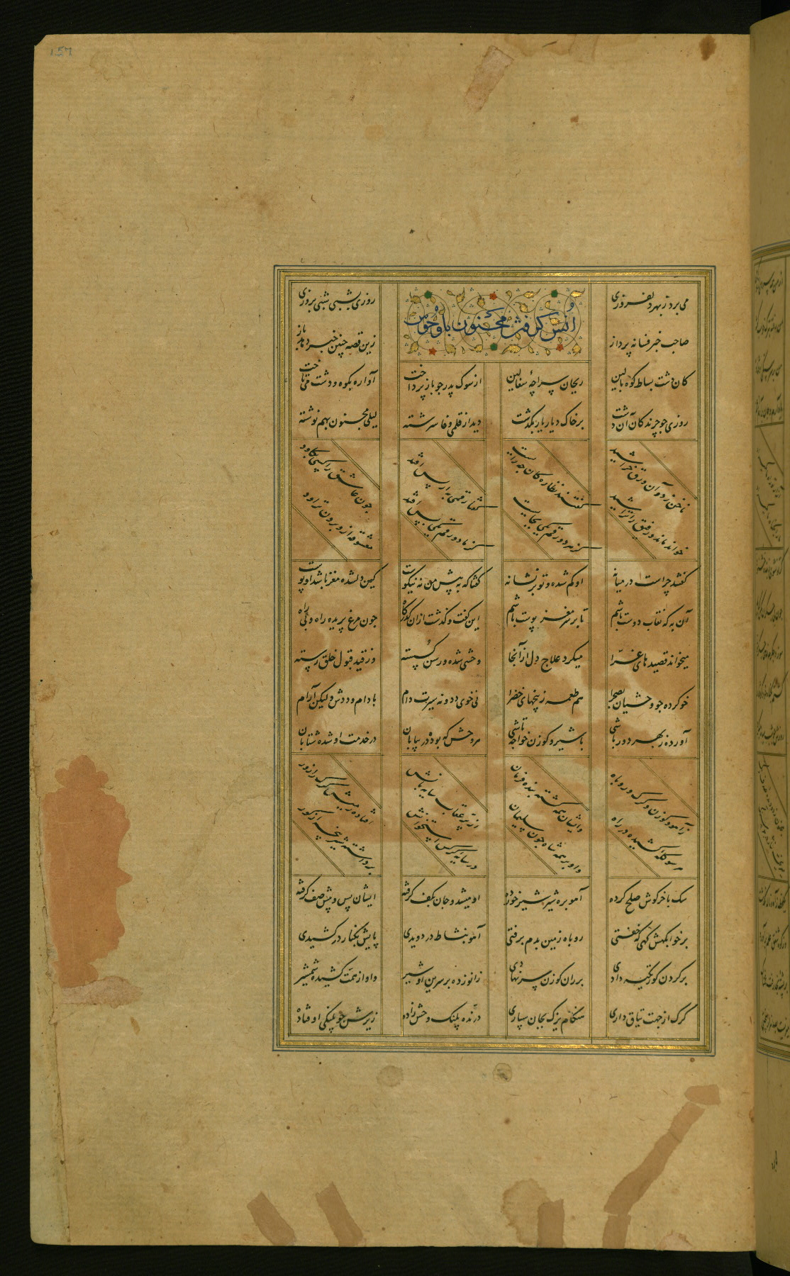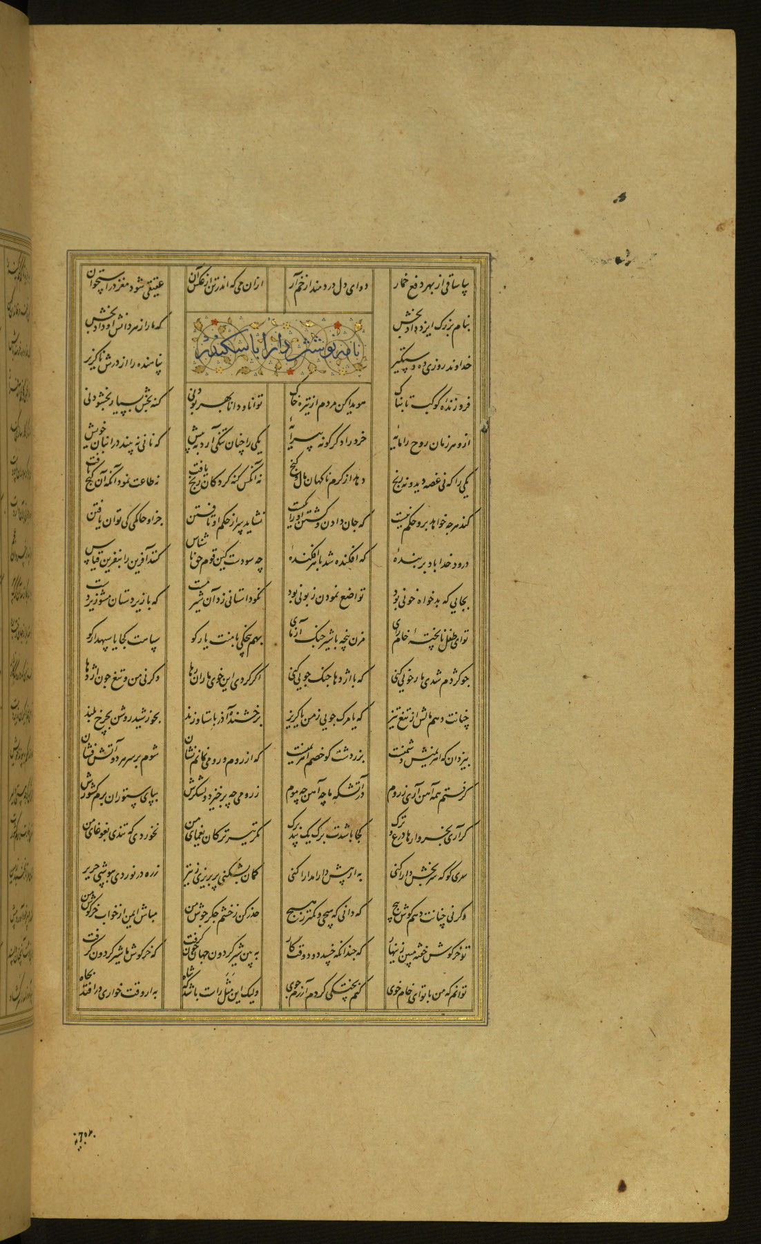 This illuminated and illustrated copy of the Khamsah (quintet) of Niẓāmī Ganjavī (d. 605 AH / 1209 CE) was written by Yār Muḥammad al-Haravī in 922 AH / 1516 CE. Written in four columns in black nastaʿlīq script, this manuscript opens with a double-page illuminated frontispiece signed by ʿAbd al-Wahhāb ibn ʿAbd al-Fattāḥ ibn ʿAlī. It contains thirty-five illustrations that were repainted in India during the twelfth century AH / eighteenth CE. The seal of Muḥammad Asharf ibn Muḥammad Khātam al-Ḥusaynī, dated 1173 AH / 1759-60 CE appears on fols. 1a and 401a. It is possible that the brown leather binding with center and side panels brushed with gold is original to the manuscript but was repaired at a later stage in the codex's history.