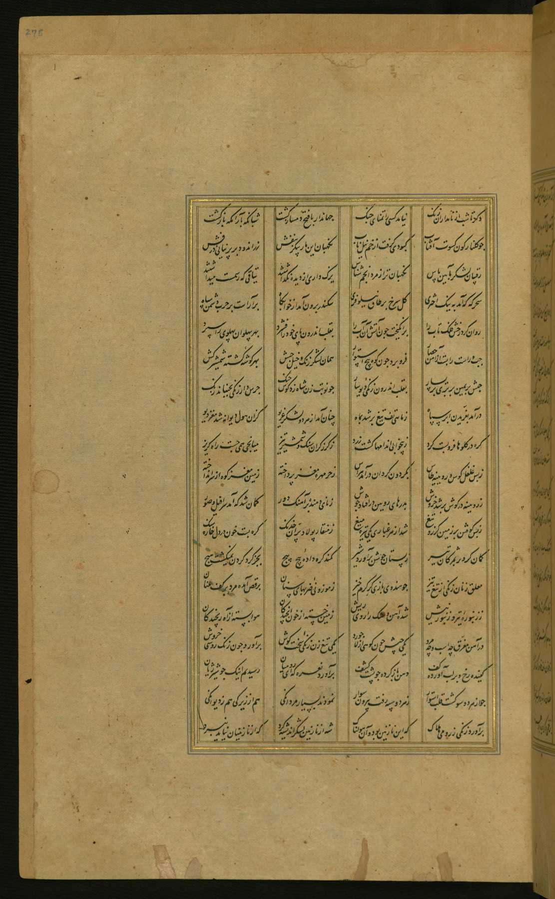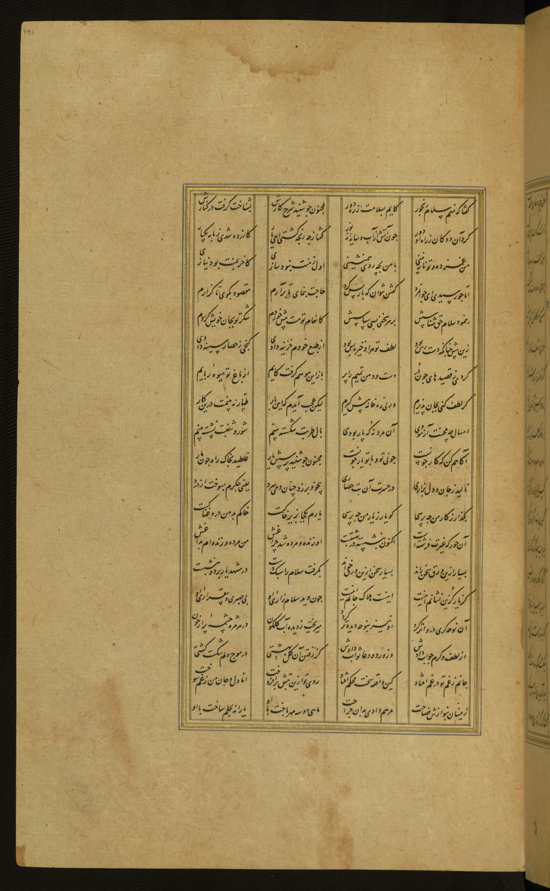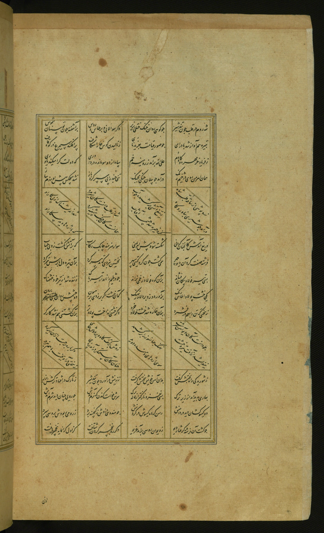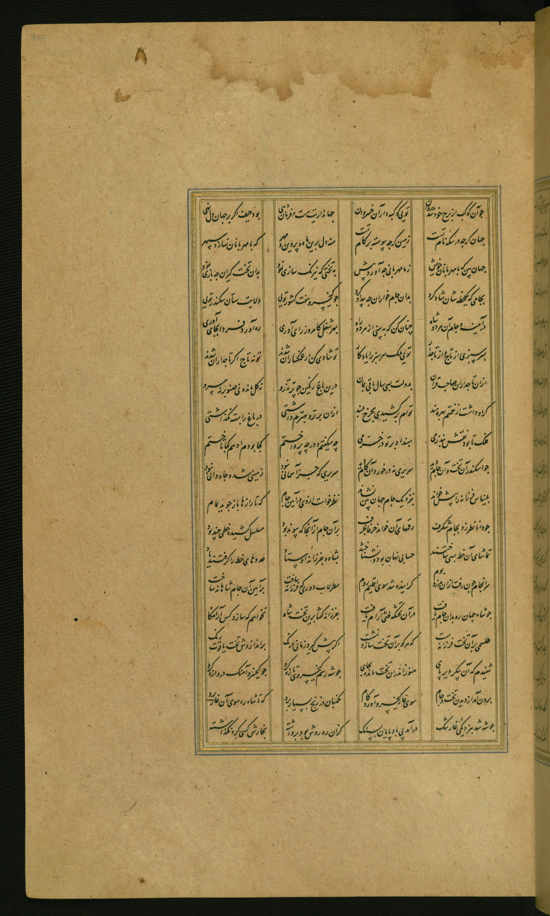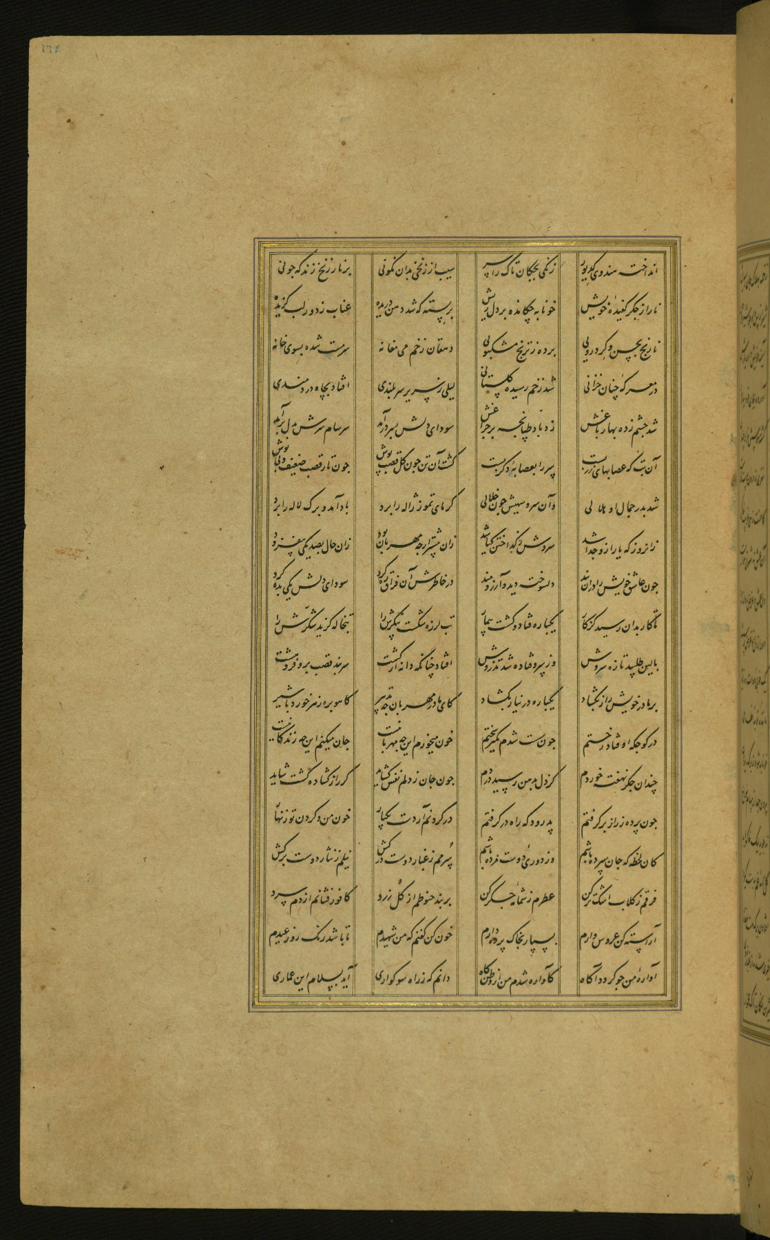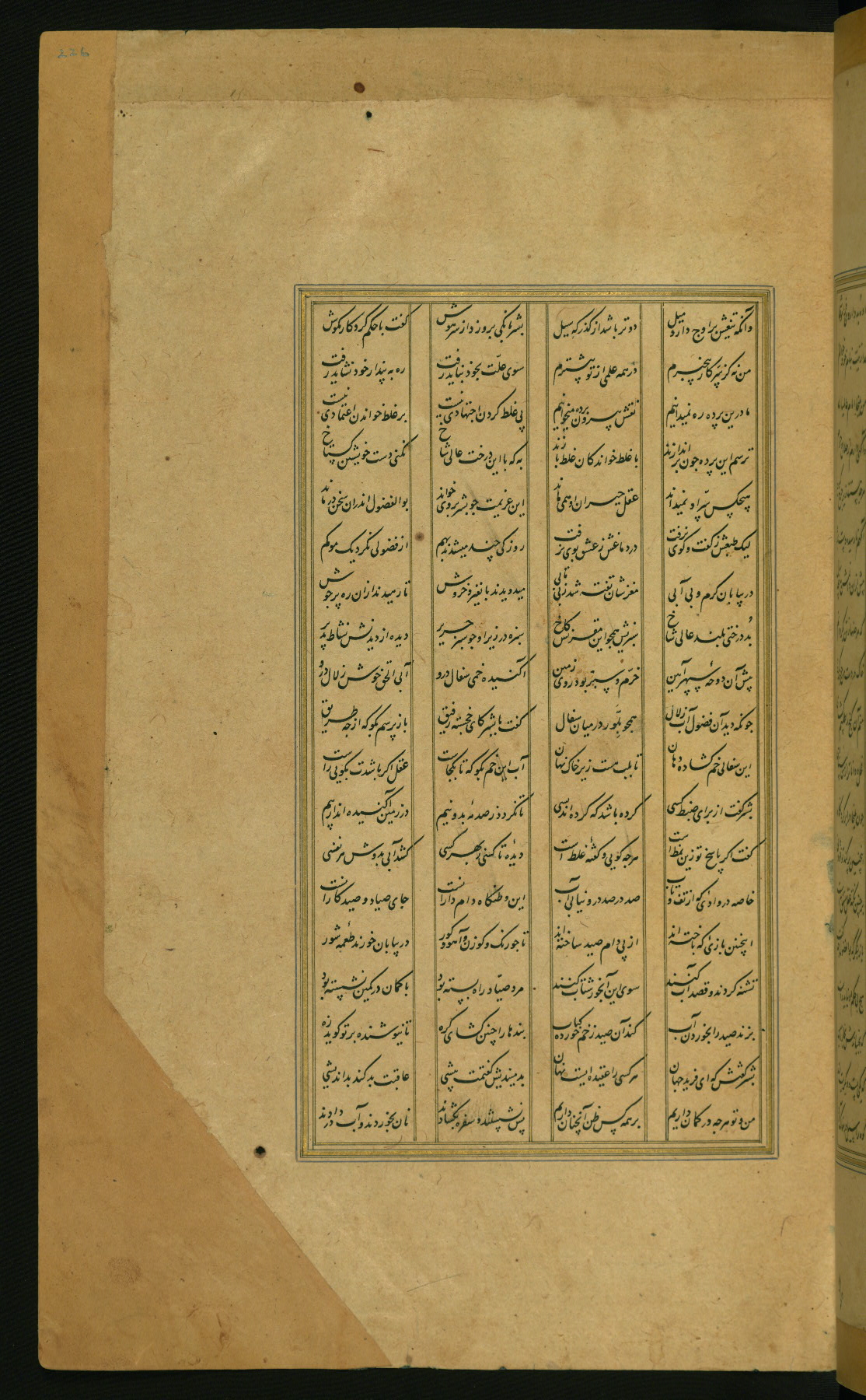 This illuminated and illustrated copy of the Khamsah (quintet) of Niẓāmī Ganjavī (d. 605 AH / 1209 CE) was written by Yār Muḥammad al-Haravī in 922 AH / 1516 CE. Written in four columns in black nastaʿlīq script, this manuscript opens with a double-page illuminated frontispiece signed by ʿAbd al-Wahhāb ibn ʿAbd al-Fattāḥ ibn ʿAlī. It contains thirty-five illustrations that were repainted in India during the twelfth century AH / eighteenth CE. The seal of Muḥammad Asharf ibn Muḥammad Khātam al-Ḥusaynī, dated 1173 AH / 1759-60 CE appears on fols. 1a and 401a. It is possible that the brown leather binding with center and side panels brushed with gold is original to the manuscript but was repaired at a later stage in the codex's history.