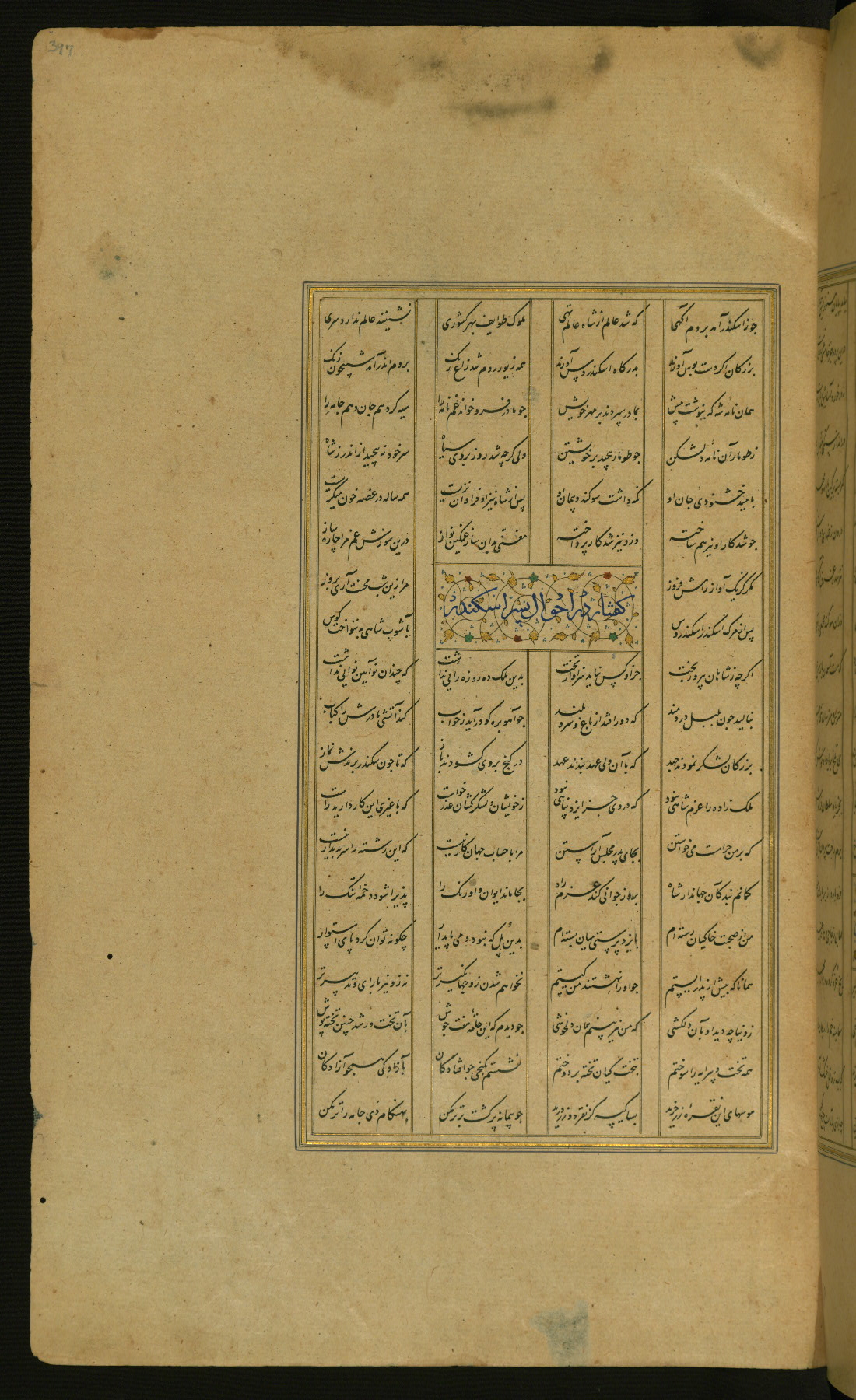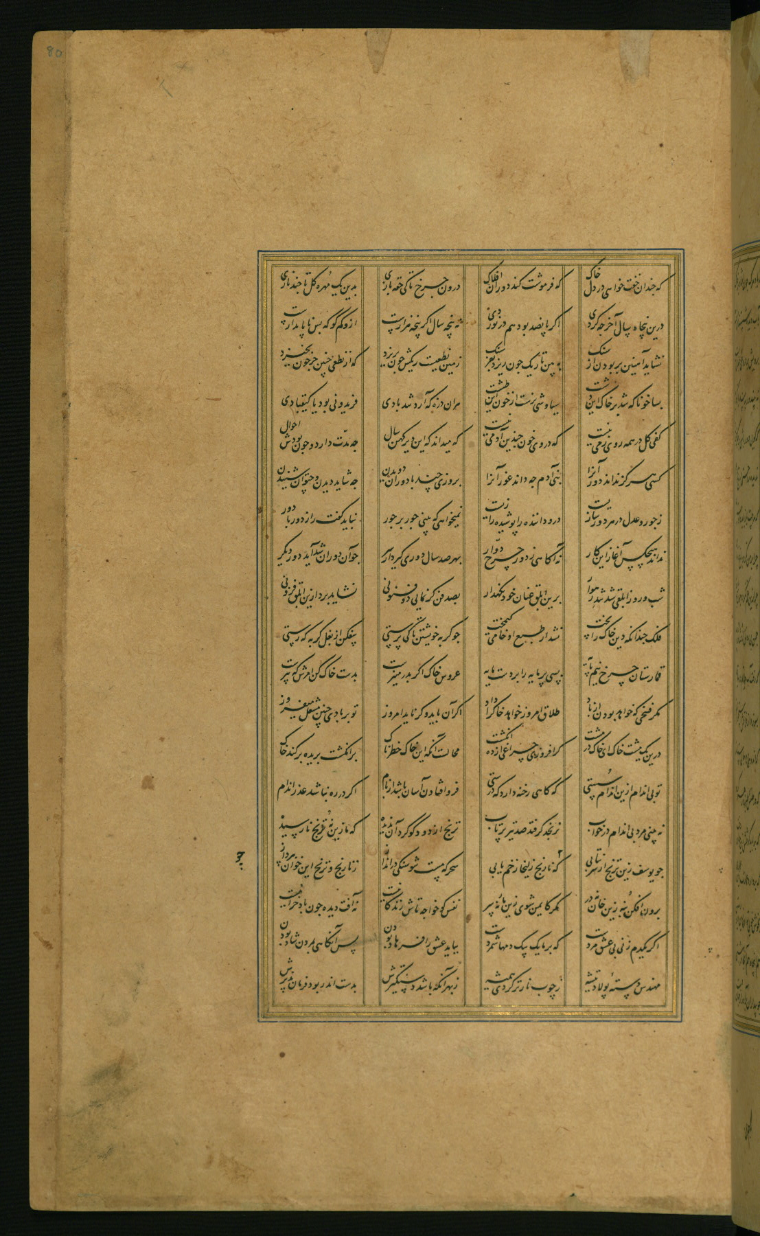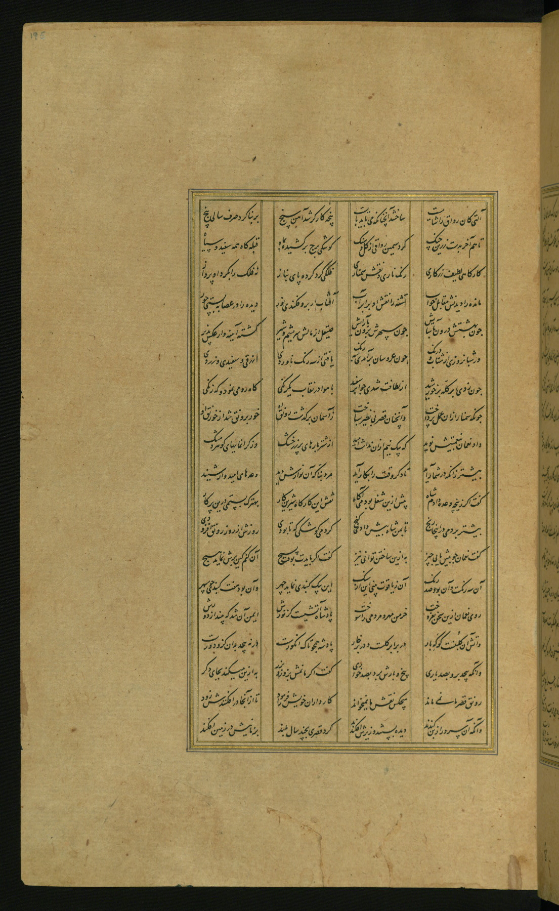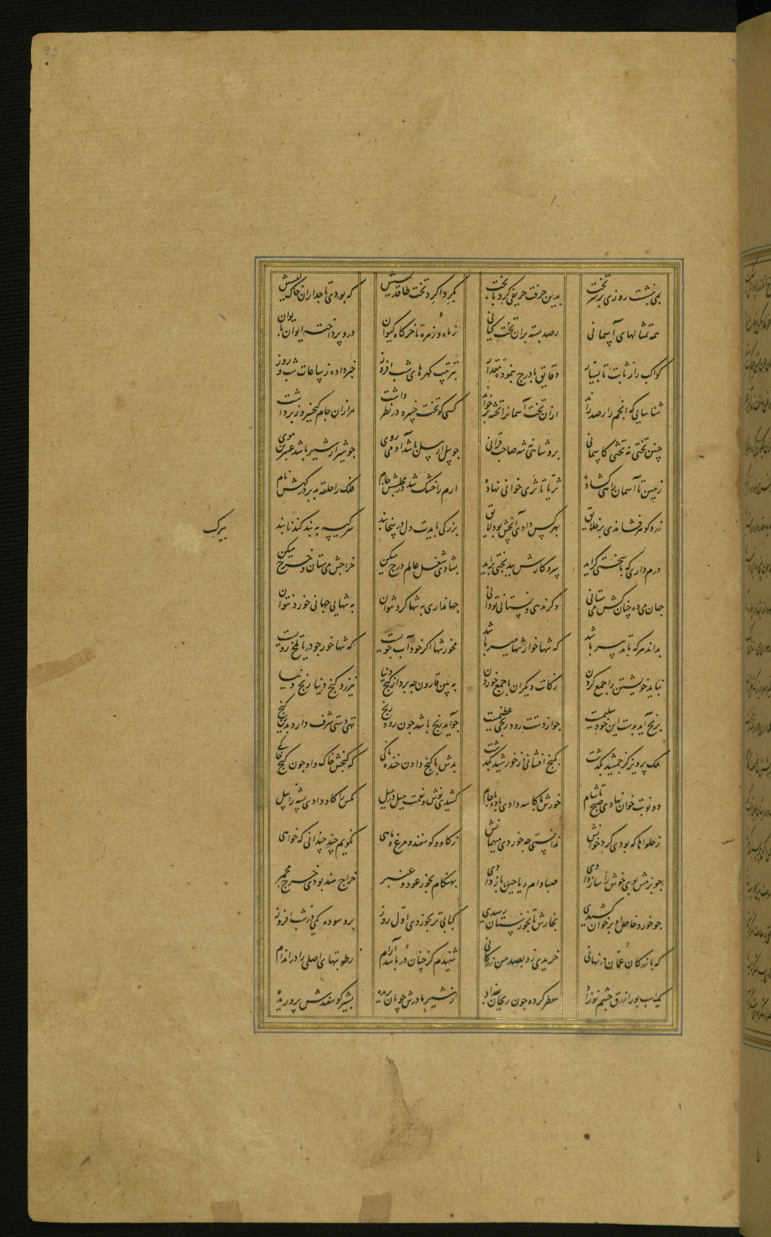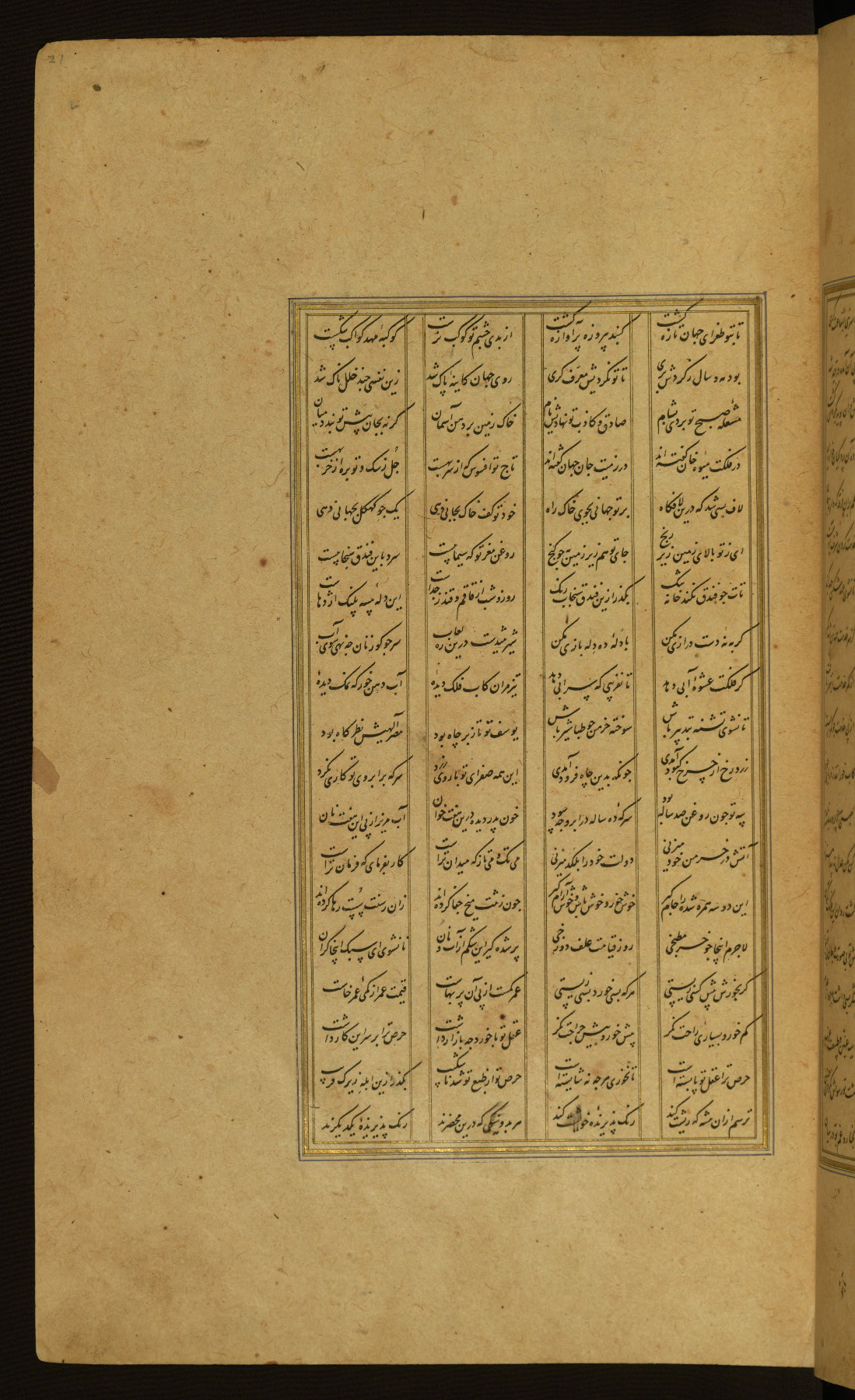 This illuminated and illustrated copy of the Khamsah (quintet) of Niẓāmī Ganjavī (d. 605 AH / 1209 CE) was written by Yār Muḥammad al-Haravī in 922 AH / 1516 CE. Written in four columns in black nastaʿlīq script, this manuscript opens with a double-page illuminated frontispiece signed by ʿAbd al-Wahhāb ibn ʿAbd al-Fattāḥ ibn ʿAlī. It contains thirty-five illustrations that were repainted in India during the twelfth century AH / eighteenth CE. The seal of Muḥammad Asharf ibn Muḥammad Khātam al-Ḥusaynī, dated 1173 AH / 1759-60 CE appears on fols. 1a and 401a. It is possible that the brown leather binding with center and side panels brushed with gold is original to the manuscript but was repaired at a later stage in the codex's history.