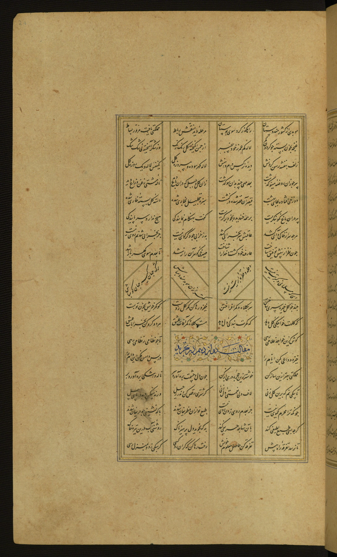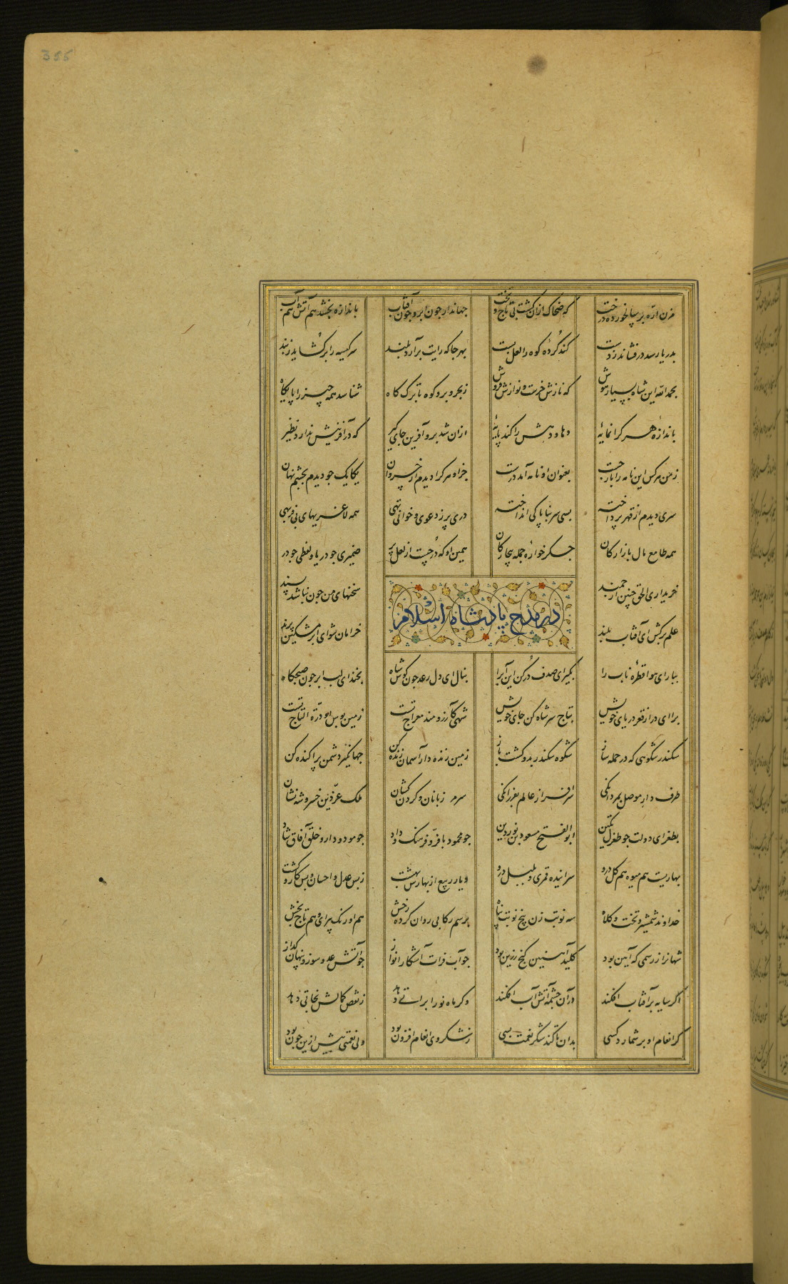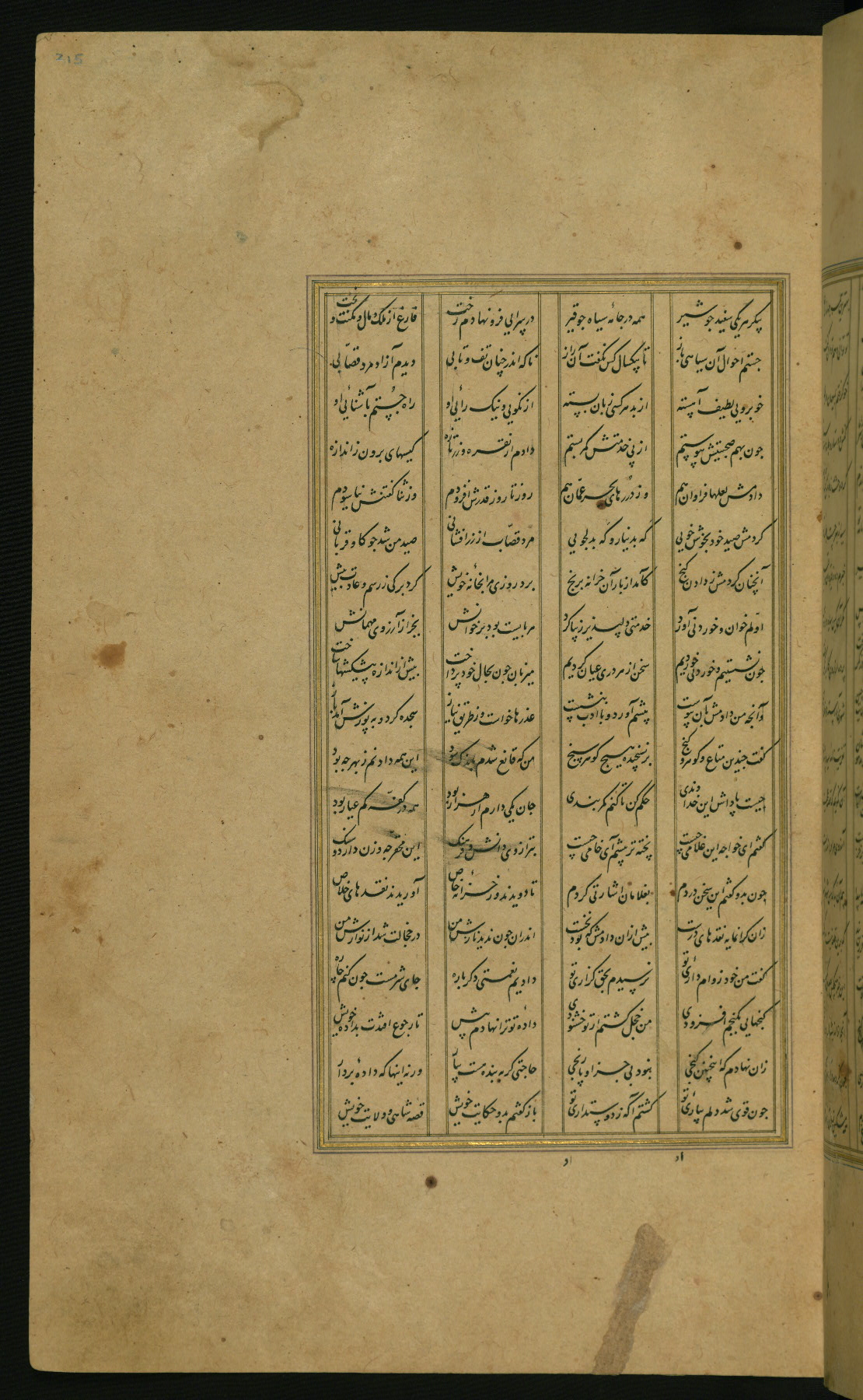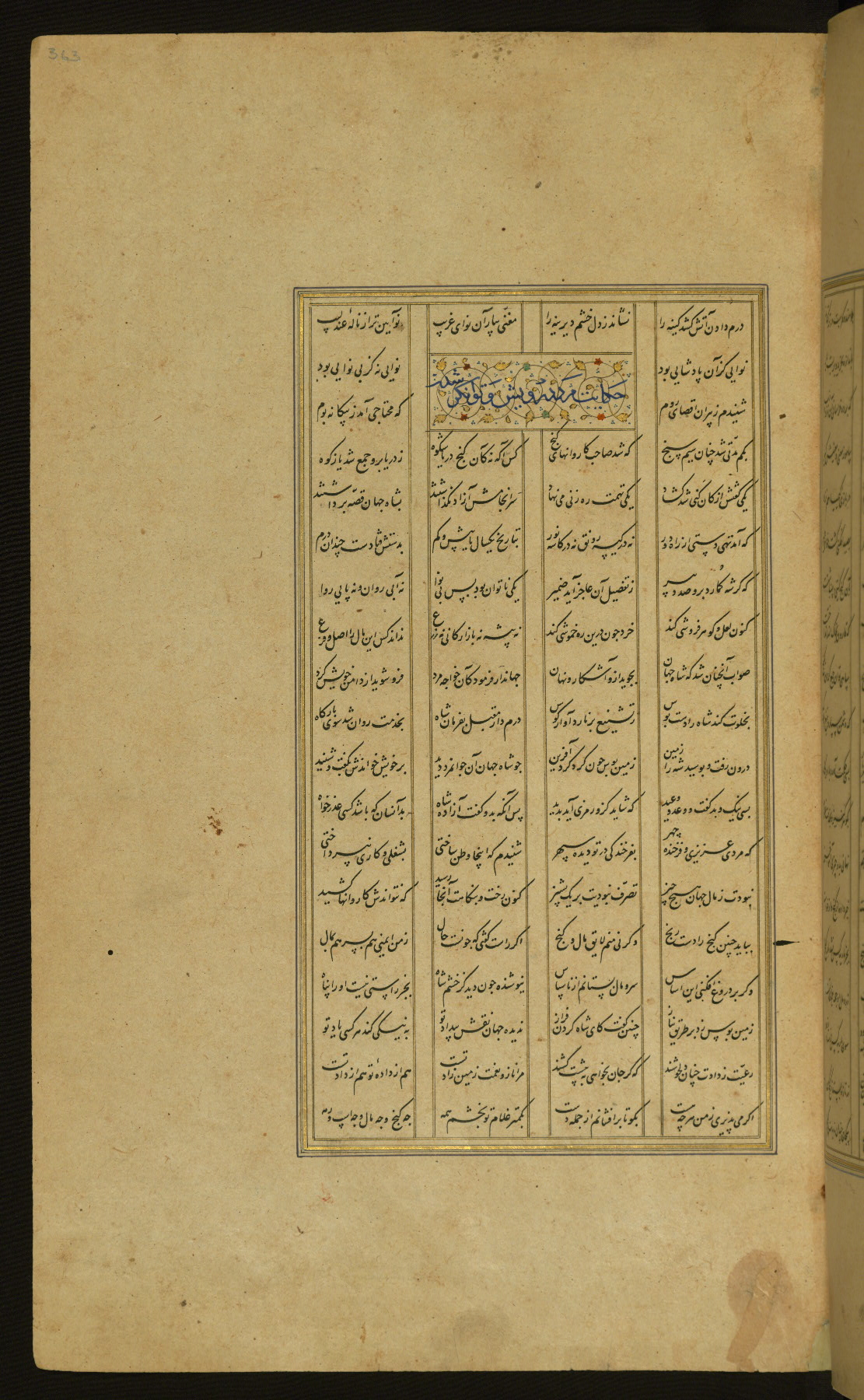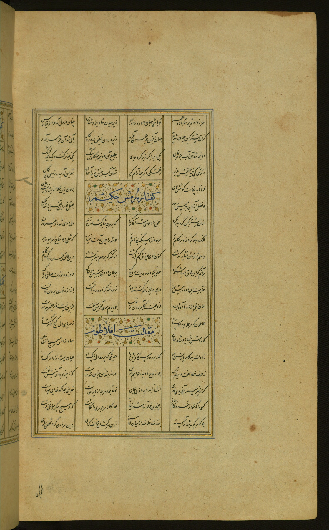 This illuminated and illustrated copy of the Khamsah (quintet) of Niẓāmī Ganjavī (d. 605 AH / 1209 CE) was written by Yār Muḥammad al-Haravī in 922 AH / 1516 CE. Written in four columns in black nastaʿlīq script, this manuscript opens with a double-page illuminated frontispiece signed by ʿAbd al-Wahhāb ibn ʿAbd al-Fattāḥ ibn ʿAlī. It contains thirty-five illustrations that were repainted in India during the twelfth century AH / eighteenth CE. The seal of Muḥammad Asharf ibn Muḥammad Khātam al-Ḥusaynī, dated 1173 AH / 1759-60 CE appears on fols. 1a and 401a. It is possible that the brown leather binding with center and side panels brushed with gold is original to the manuscript but was repaired at a later stage in the codex's history.