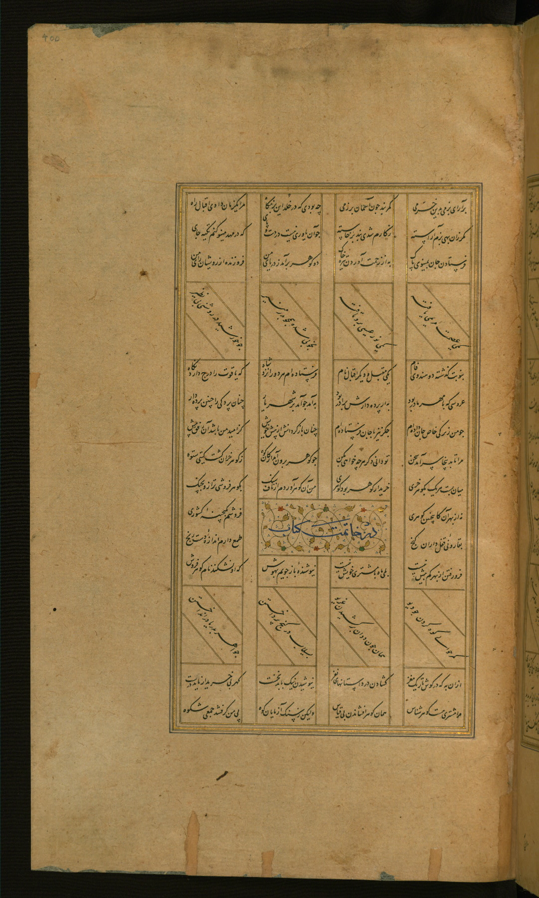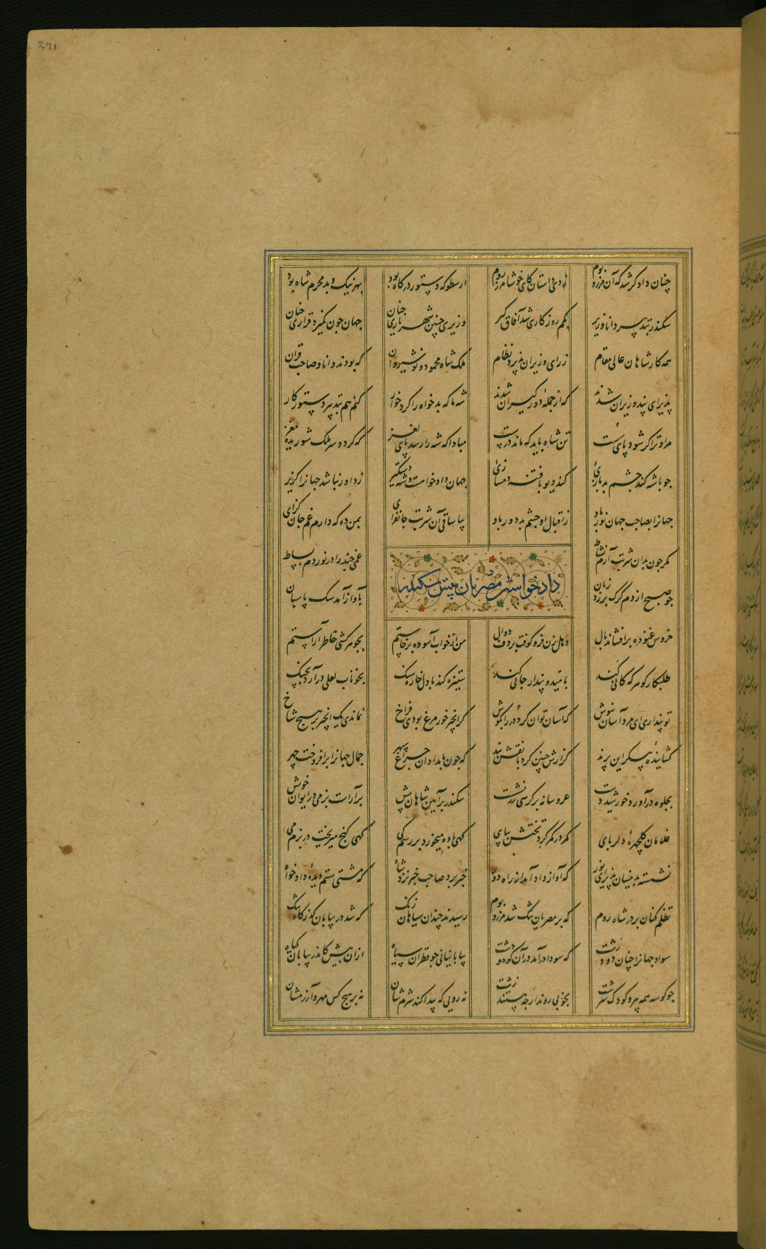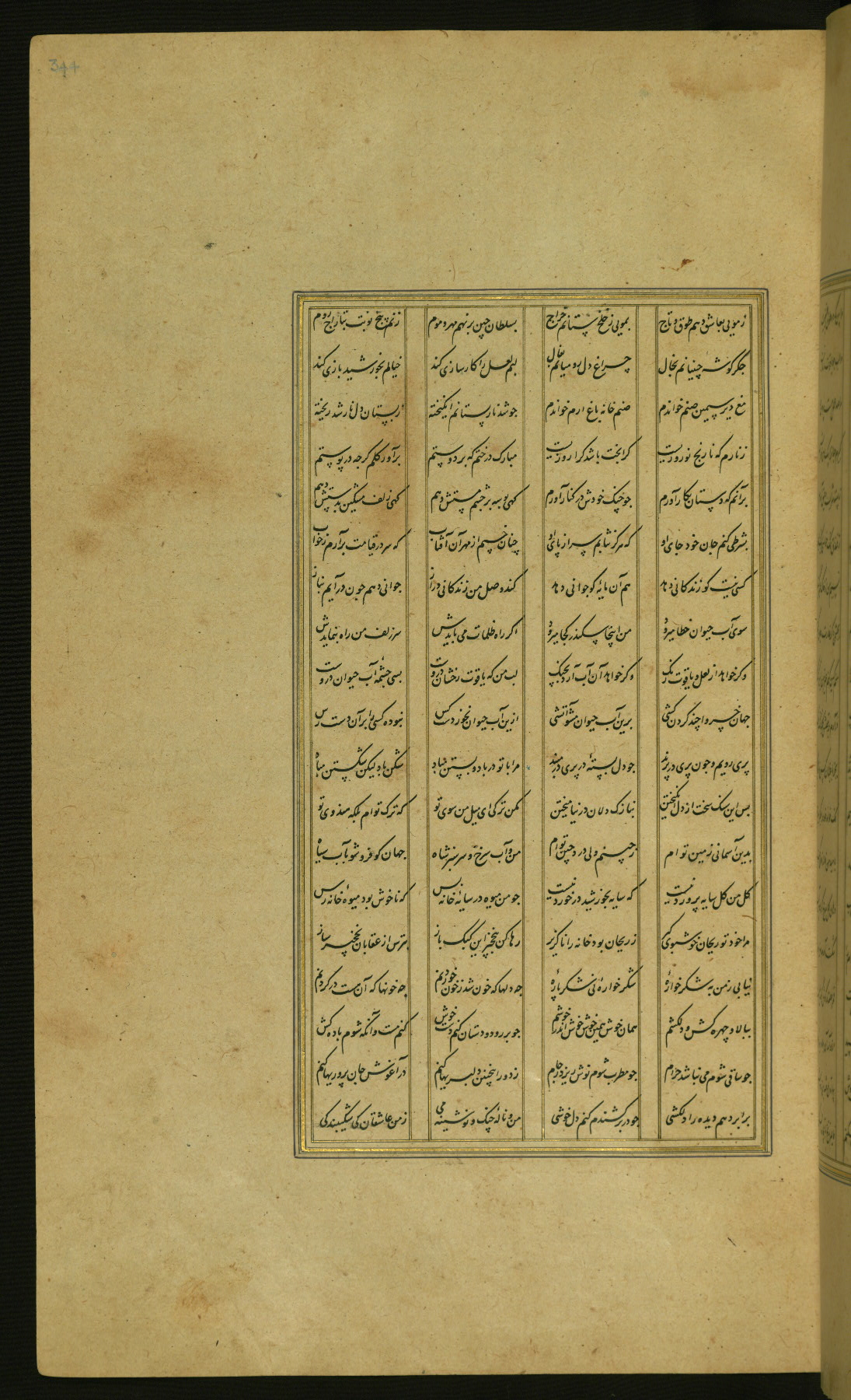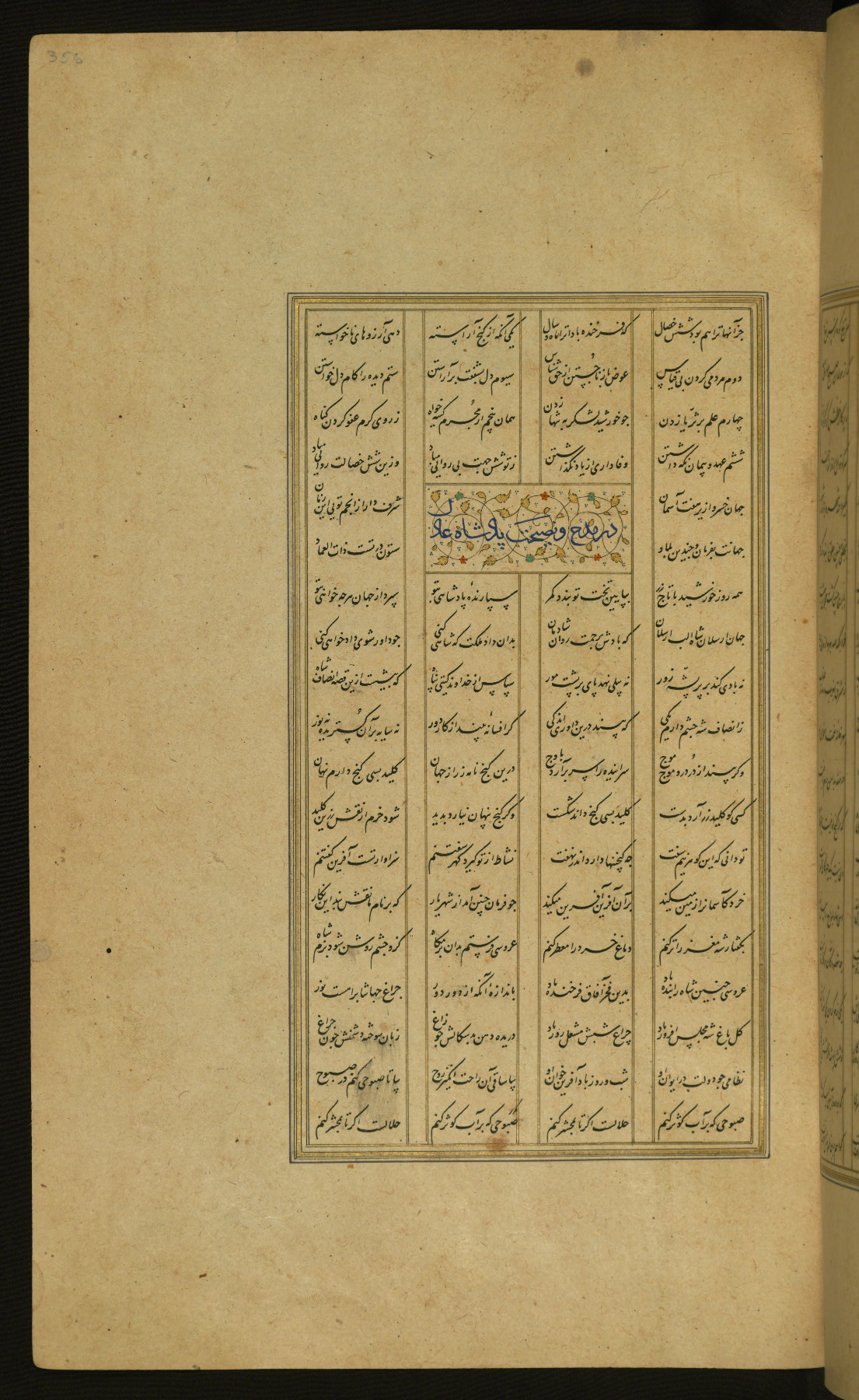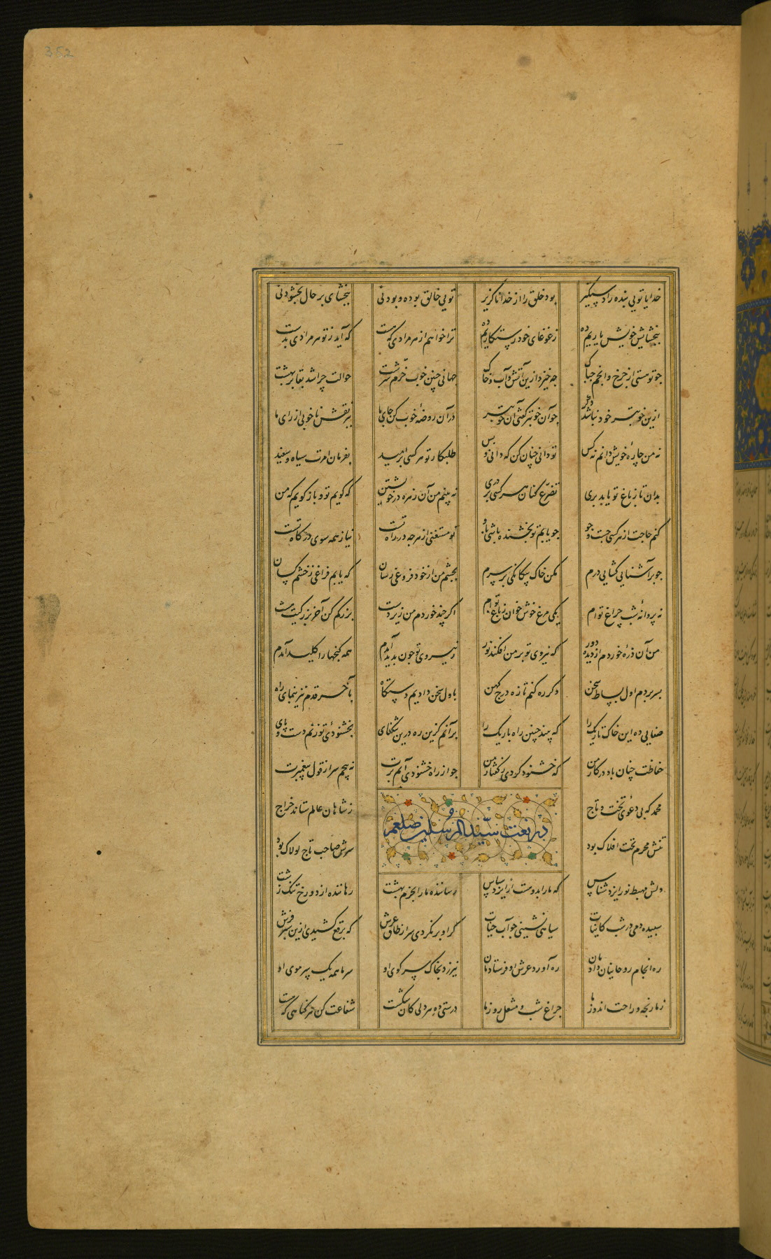 This illuminated and illustrated copy of the Khamsah (quintet) of Niẓāmī Ganjavī (d. 605 AH / 1209 CE) was written by Yār Muḥammad al-Haravī in 922 AH / 1516 CE. Written in four columns in black nastaʿlīq script, this manuscript opens with a double-page illuminated frontispiece signed by ʿAbd al-Wahhāb ibn ʿAbd al-Fattāḥ ibn ʿAlī. It contains thirty-five illustrations that were repainted in India during the twelfth century AH / eighteenth CE. The seal of Muḥammad Asharf ibn Muḥammad Khātam al-Ḥusaynī, dated 1173 AH / 1759-60 CE appears on fols. 1a and 401a. It is possible that the brown leather binding with center and side panels brushed with gold is original to the manuscript but was repaired at a later stage in the codex's history.