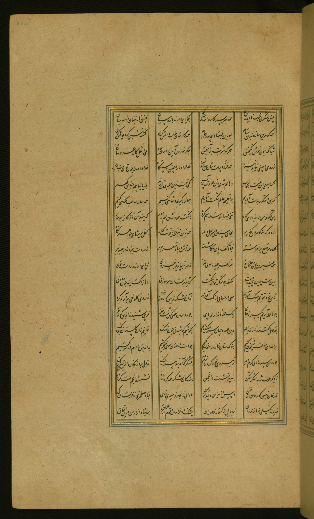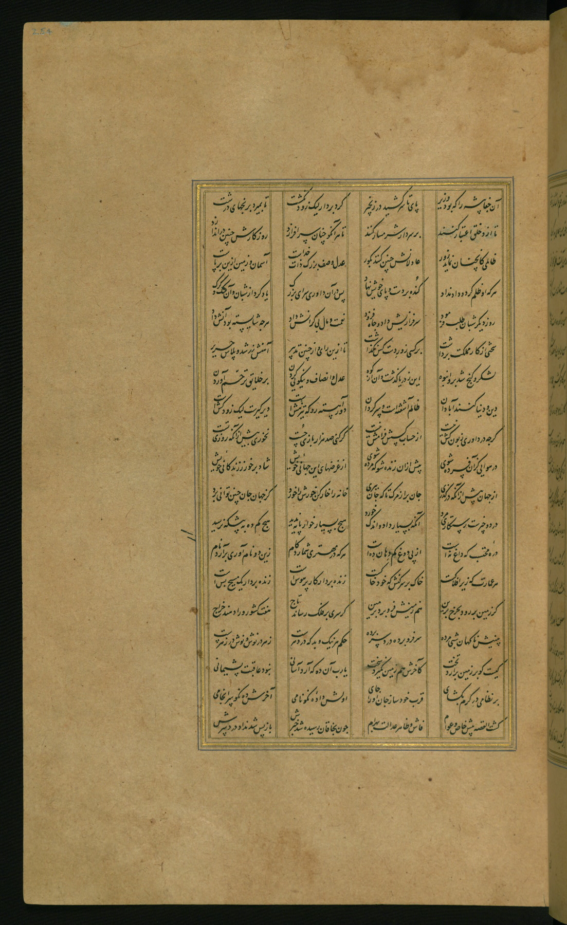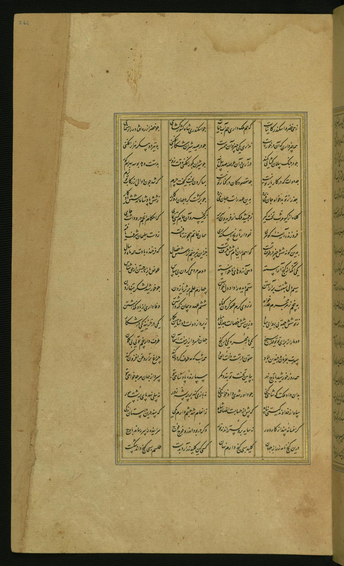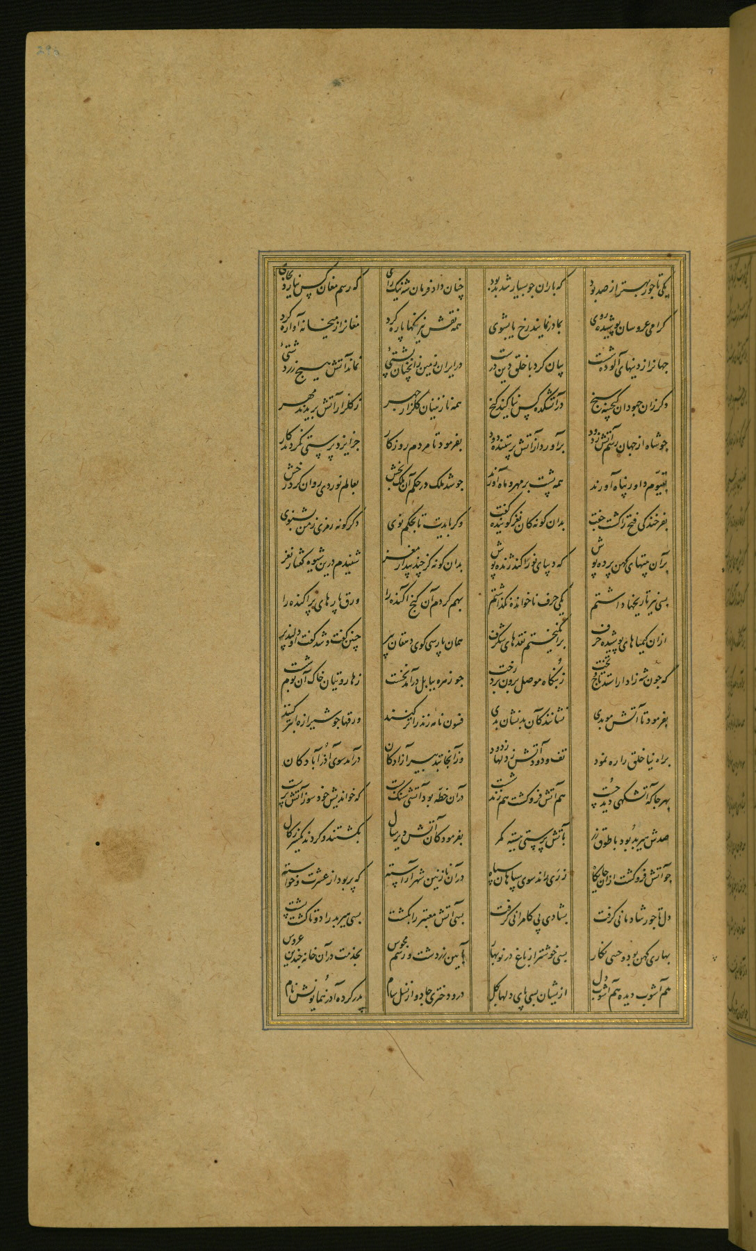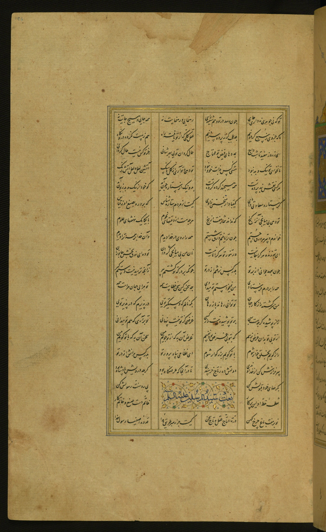 This illuminated and illustrated copy of the Khamsah (quintet) of Niẓāmī Ganjavī (d. 605 AH / 1209 CE) was written by Yār Muḥammad al-Haravī in 922 AH / 1516 CE. Written in four columns in black nastaʿlīq script, this manuscript opens with a double-page illuminated frontispiece signed by ʿAbd al-Wahhāb ibn ʿAbd al-Fattāḥ ibn ʿAlī. It contains thirty-five illustrations that were repainted in India during the twelfth century AH / eighteenth CE. The seal of Muḥammad Asharf ibn Muḥammad Khātam al-Ḥusaynī, dated 1173 AH / 1759-60 CE appears on fols. 1a and 401a. It is possible that the brown leather binding with center and side panels brushed with gold is original to the manuscript but was repaired at a later stage in the codex's history.