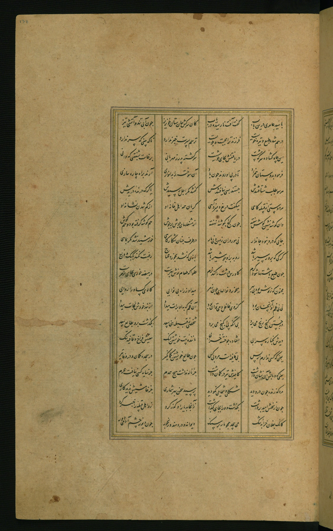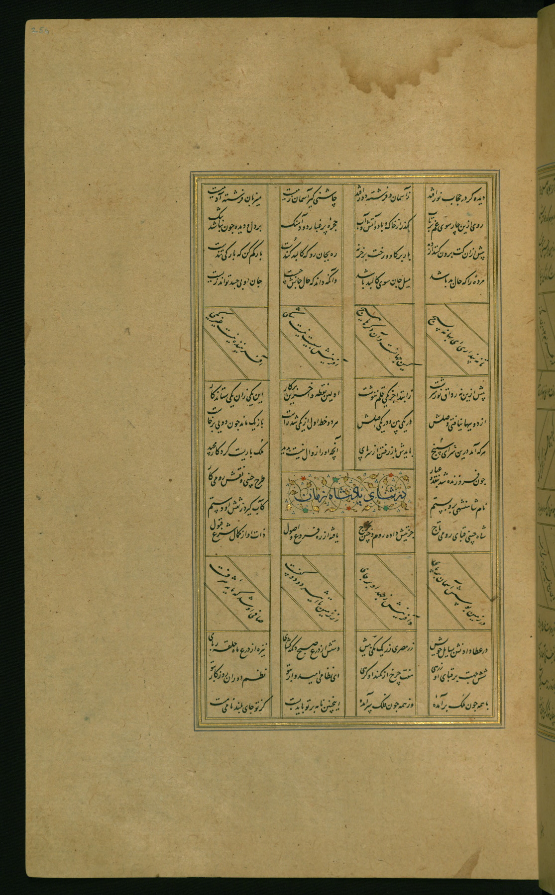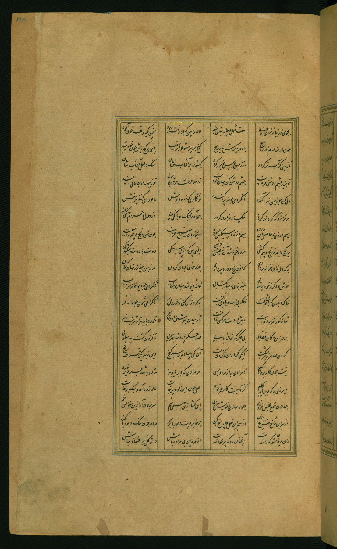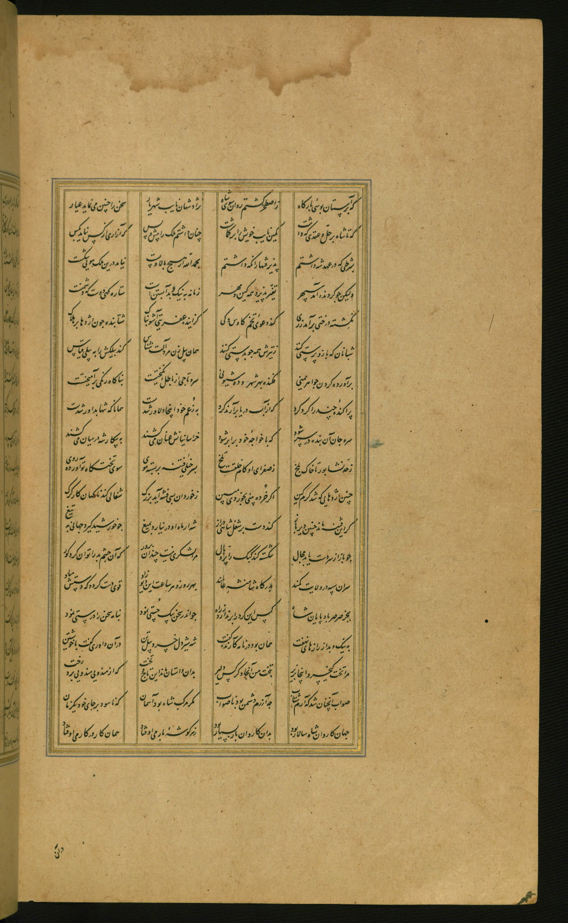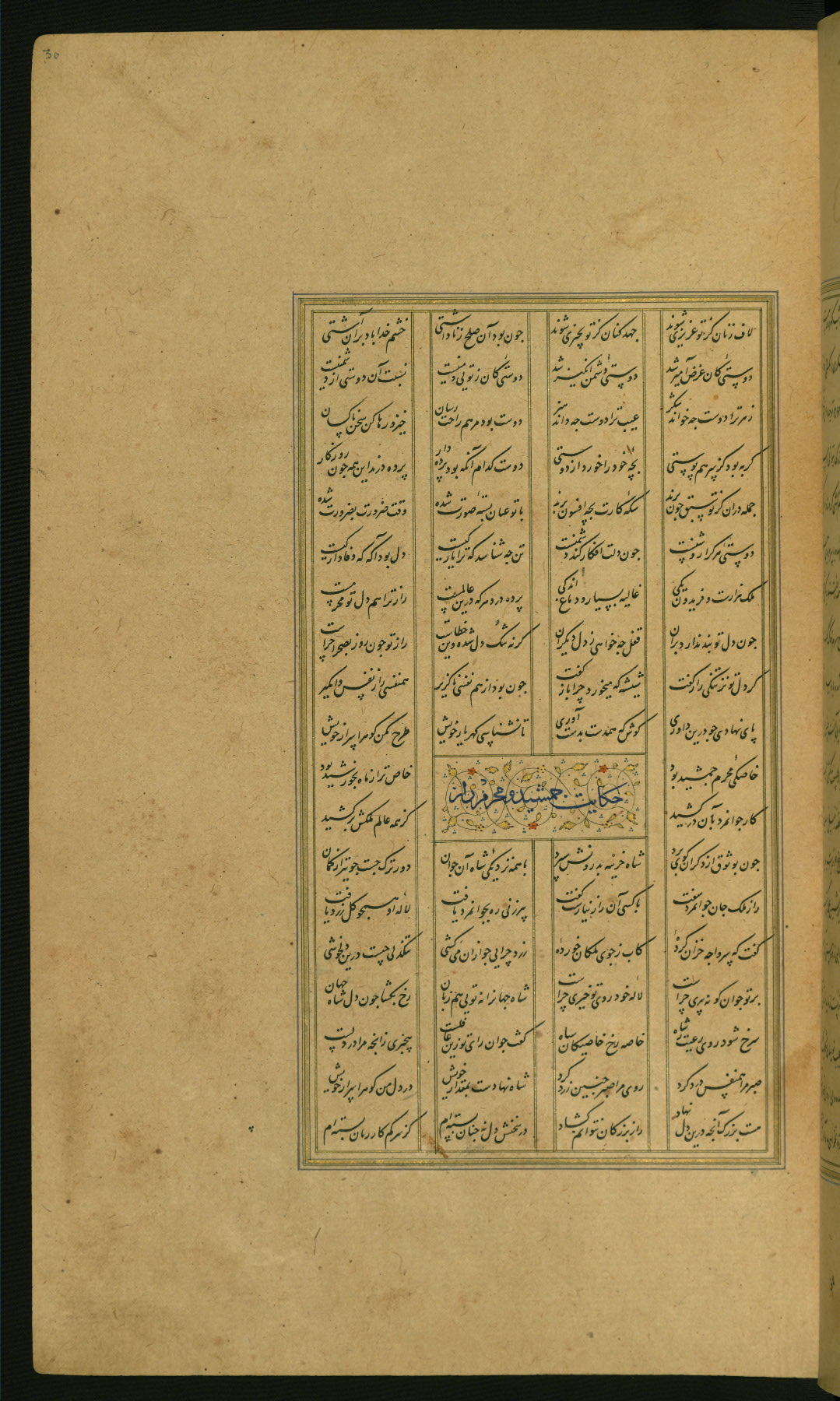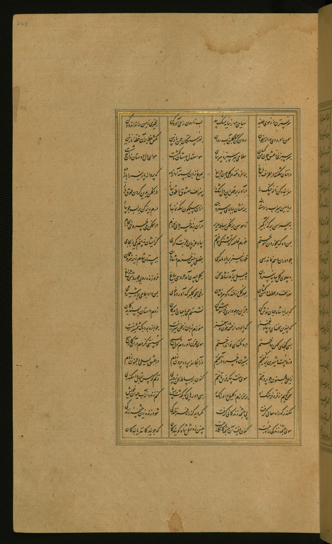 This illuminated and illustrated copy of the Khamsah (quintet) of Niẓāmī Ganjavī (d. 605 AH / 1209 CE) was written by Yār Muḥammad al-Haravī in 922 AH / 1516 CE. Written in four columns in black nastaʿlīq script, this manuscript opens with a double-page illuminated frontispiece signed by ʿAbd al-Wahhāb ibn ʿAbd al-Fattāḥ ibn ʿAlī. It contains thirty-five illustrations that were repainted in India during the twelfth century AH / eighteenth CE. The seal of Muḥammad Asharf ibn Muḥammad Khātam al-Ḥusaynī, dated 1173 AH / 1759-60 CE appears on fols. 1a and 401a. It is possible that the brown leather binding with center and side panels brushed with gold is original to the manuscript but was repaired at a later stage in the codex's history.