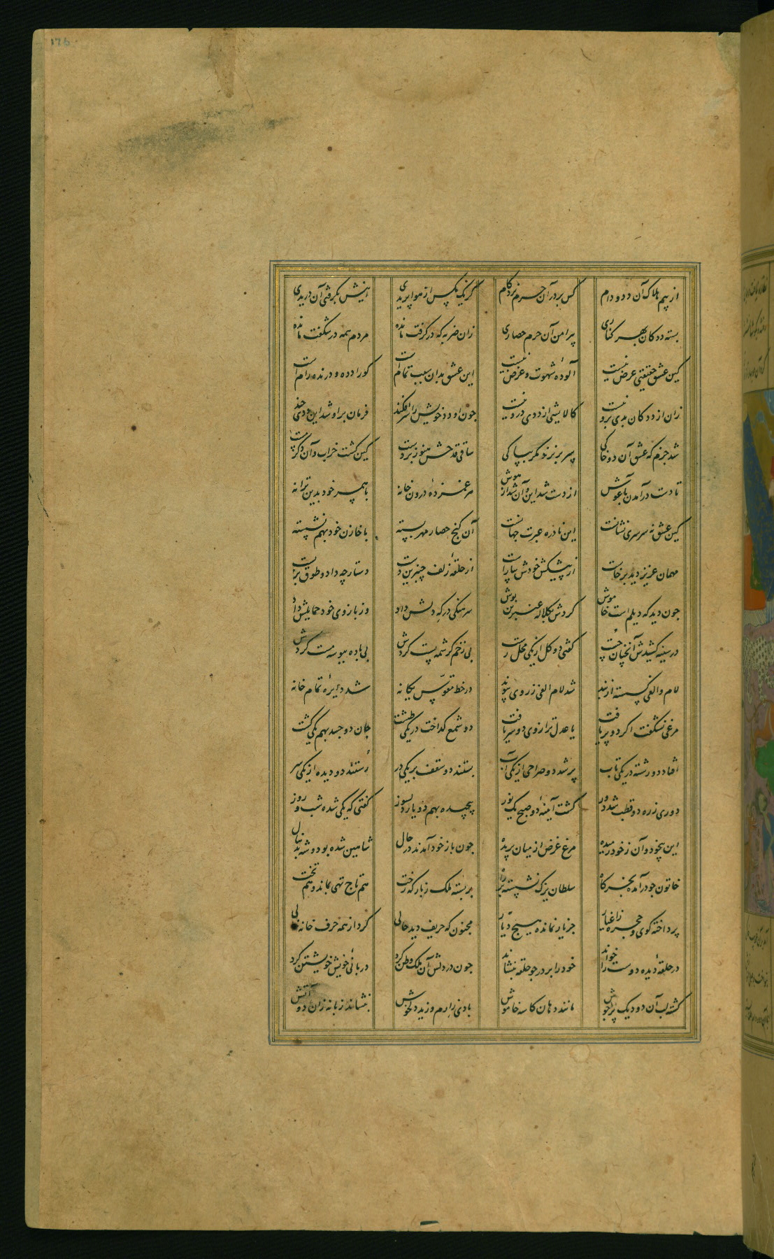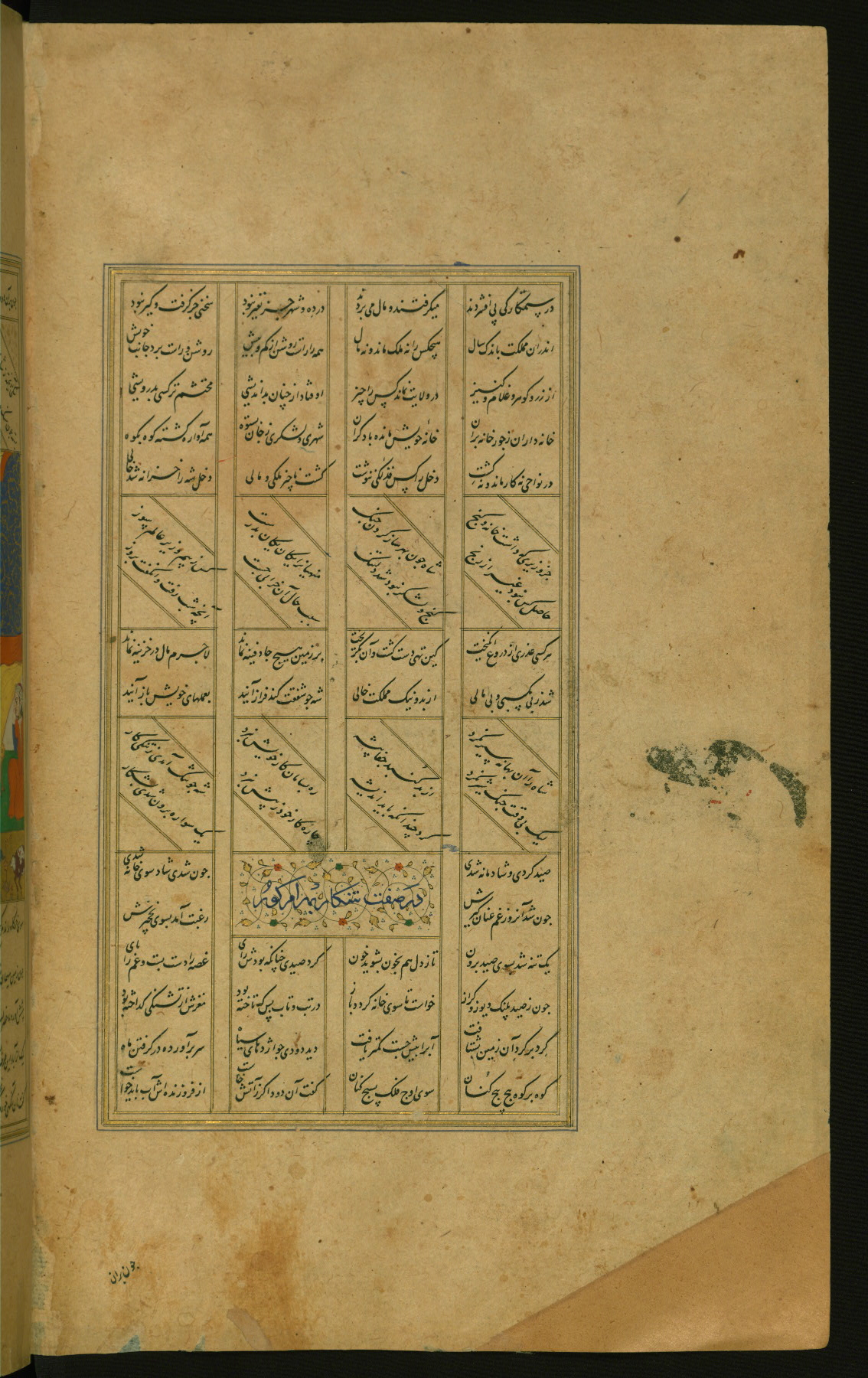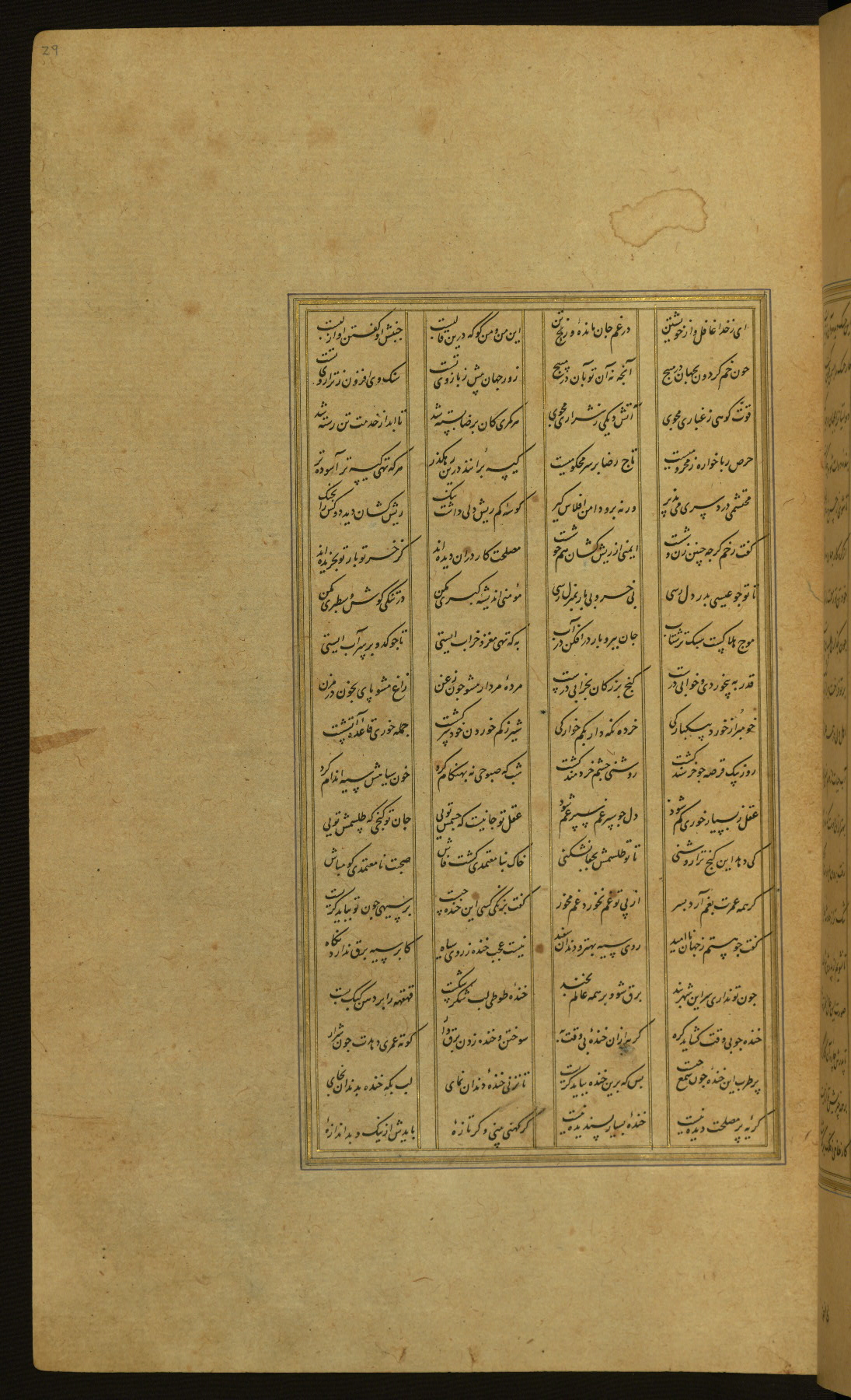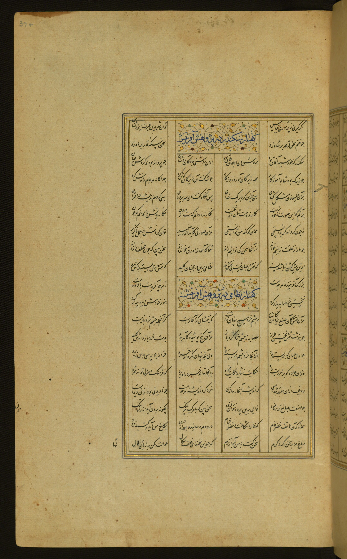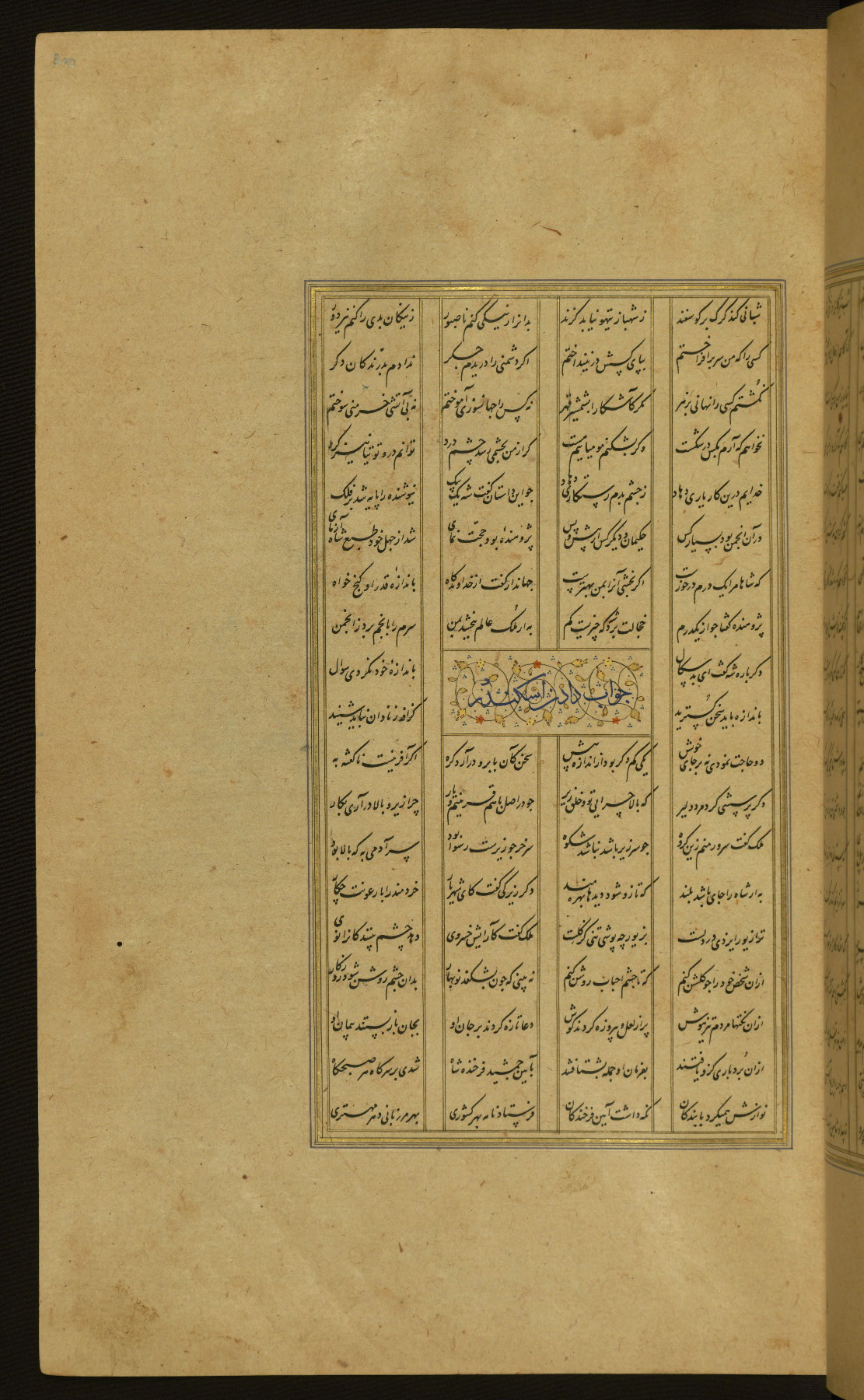 This illuminated and illustrated copy of the Khamsah (quintet) of Niẓāmī Ganjavī (d. 605 AH / 1209 CE) was written by Yār Muḥammad al-Haravī in 922 AH / 1516 CE. Written in four columns in black nastaʿlīq script, this manuscript opens with a double-page illuminated frontispiece signed by ʿAbd al-Wahhāb ibn ʿAbd al-Fattāḥ ibn ʿAlī. It contains thirty-five illustrations that were repainted in India during the twelfth century AH / eighteenth CE. The seal of Muḥammad Asharf ibn Muḥammad Khātam al-Ḥusaynī, dated 1173 AH / 1759-60 CE appears on fols. 1a and 401a. It is possible that the brown leather binding with center and side panels brushed with gold is original to the manuscript but was repaired at a later stage in the codex's history.