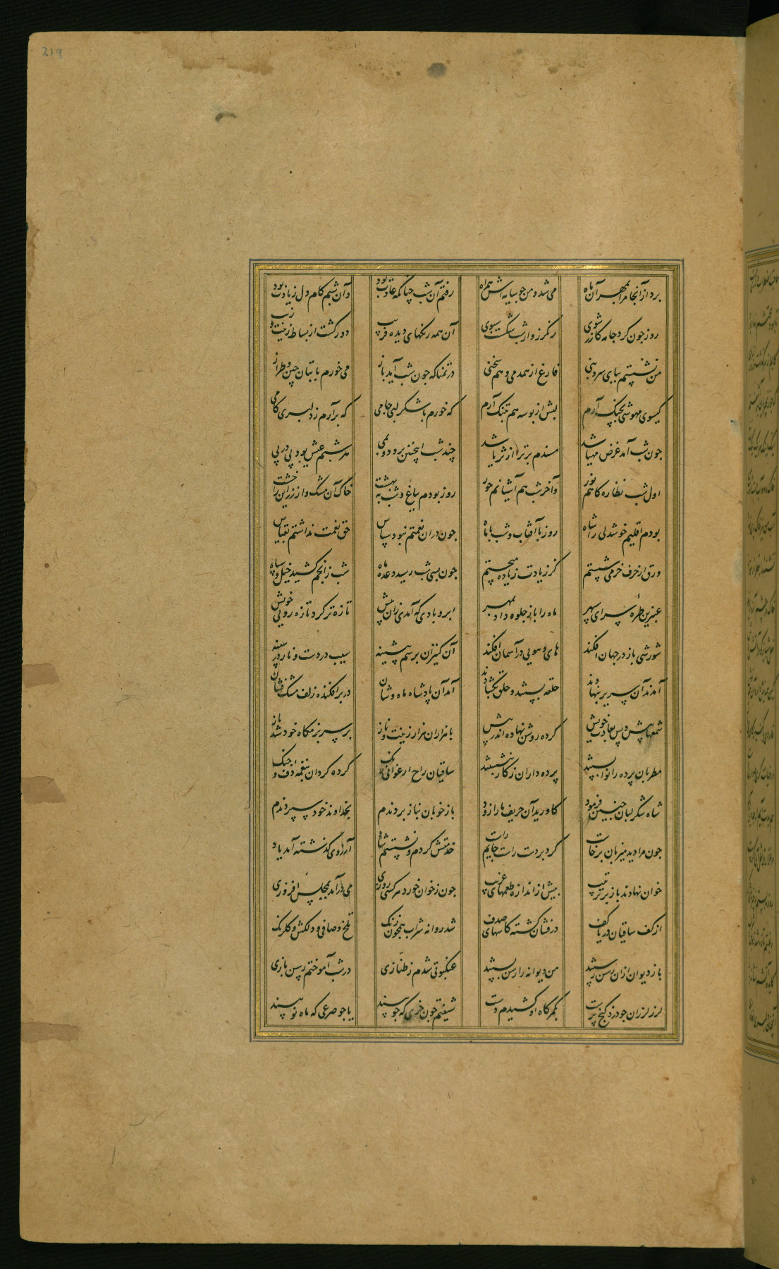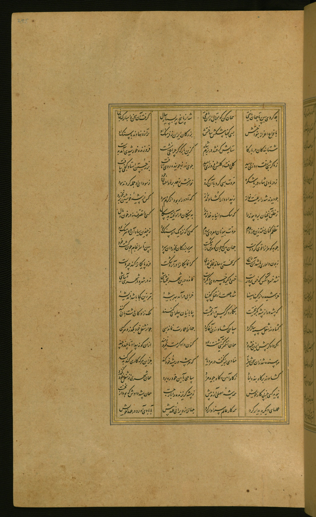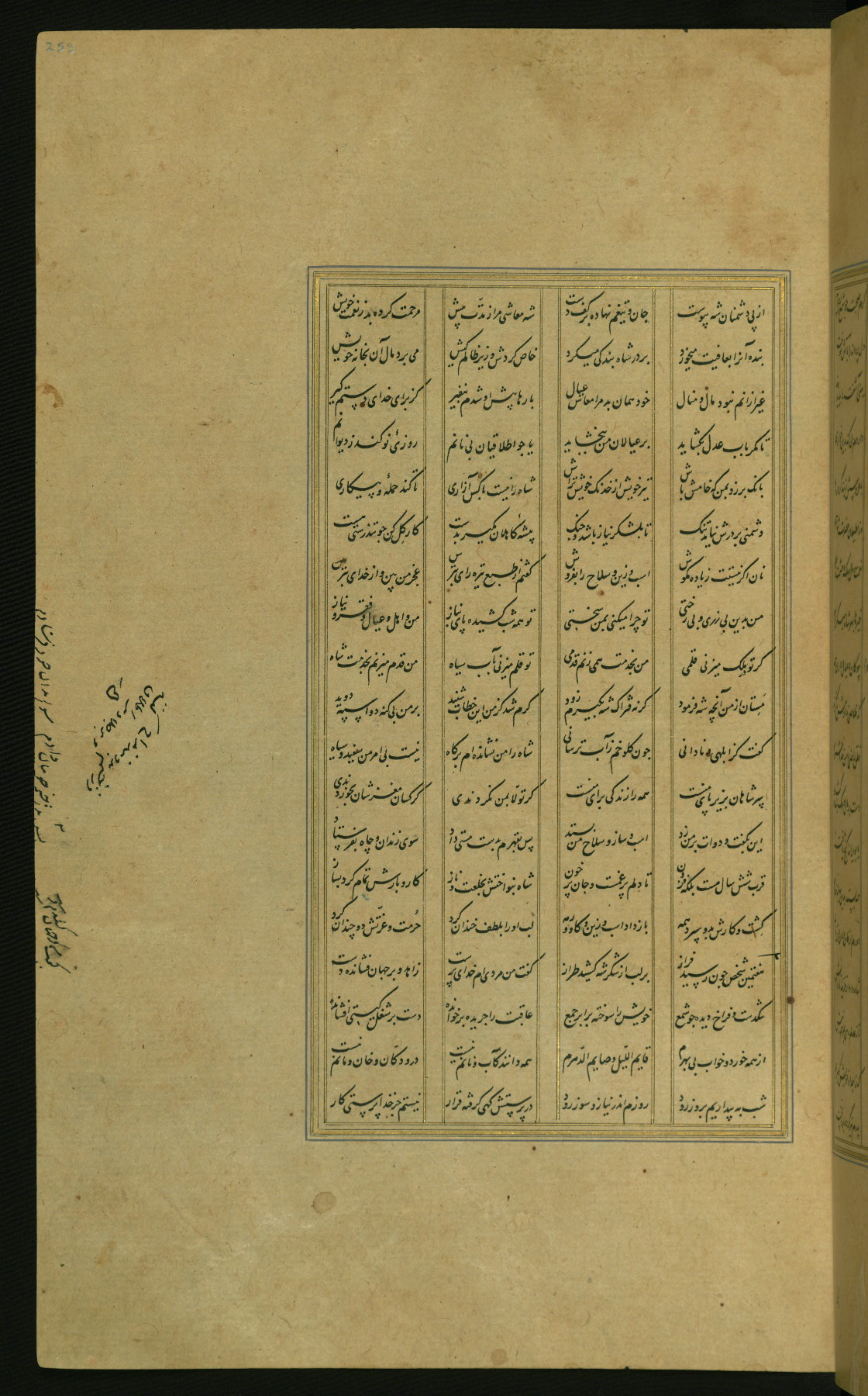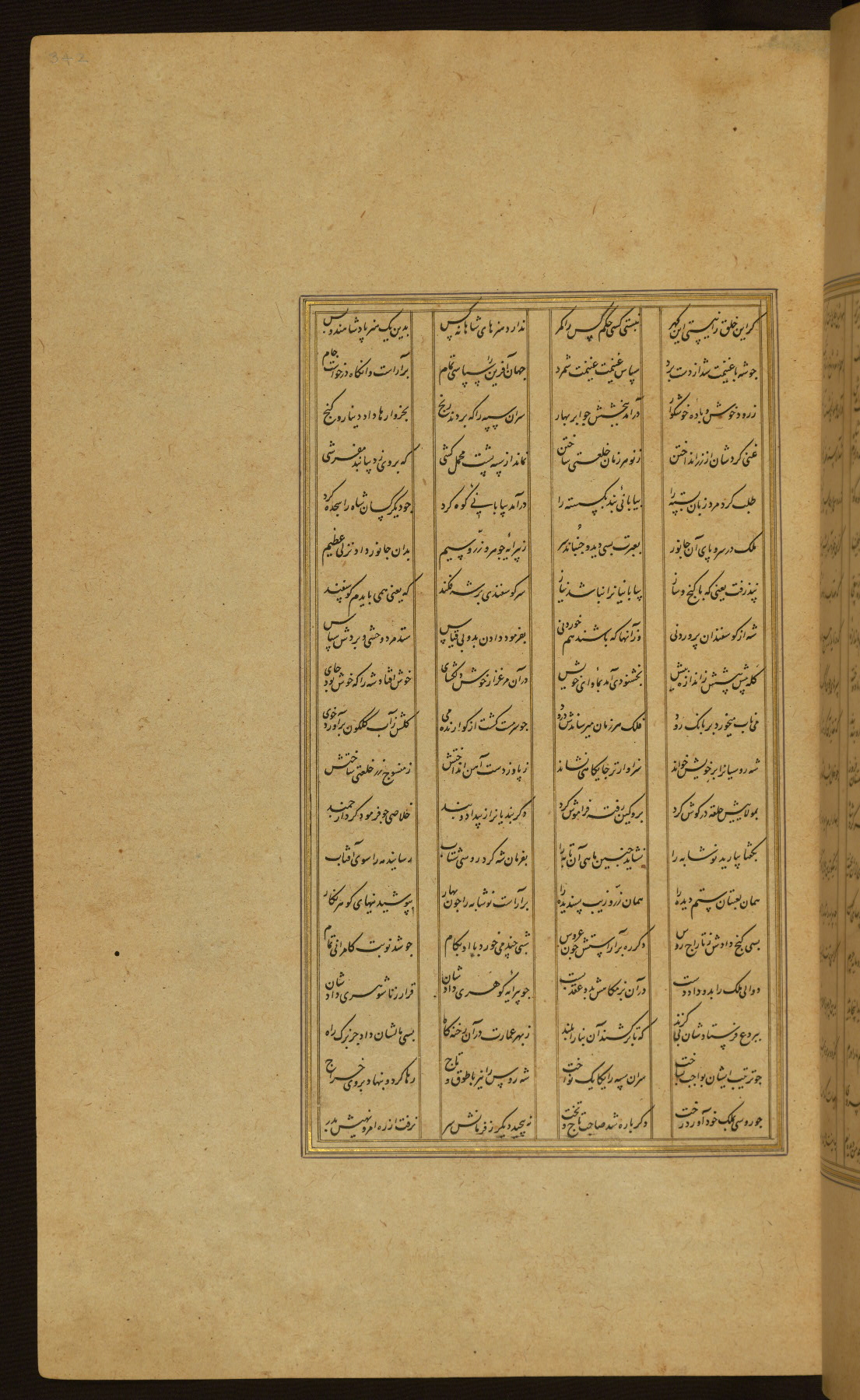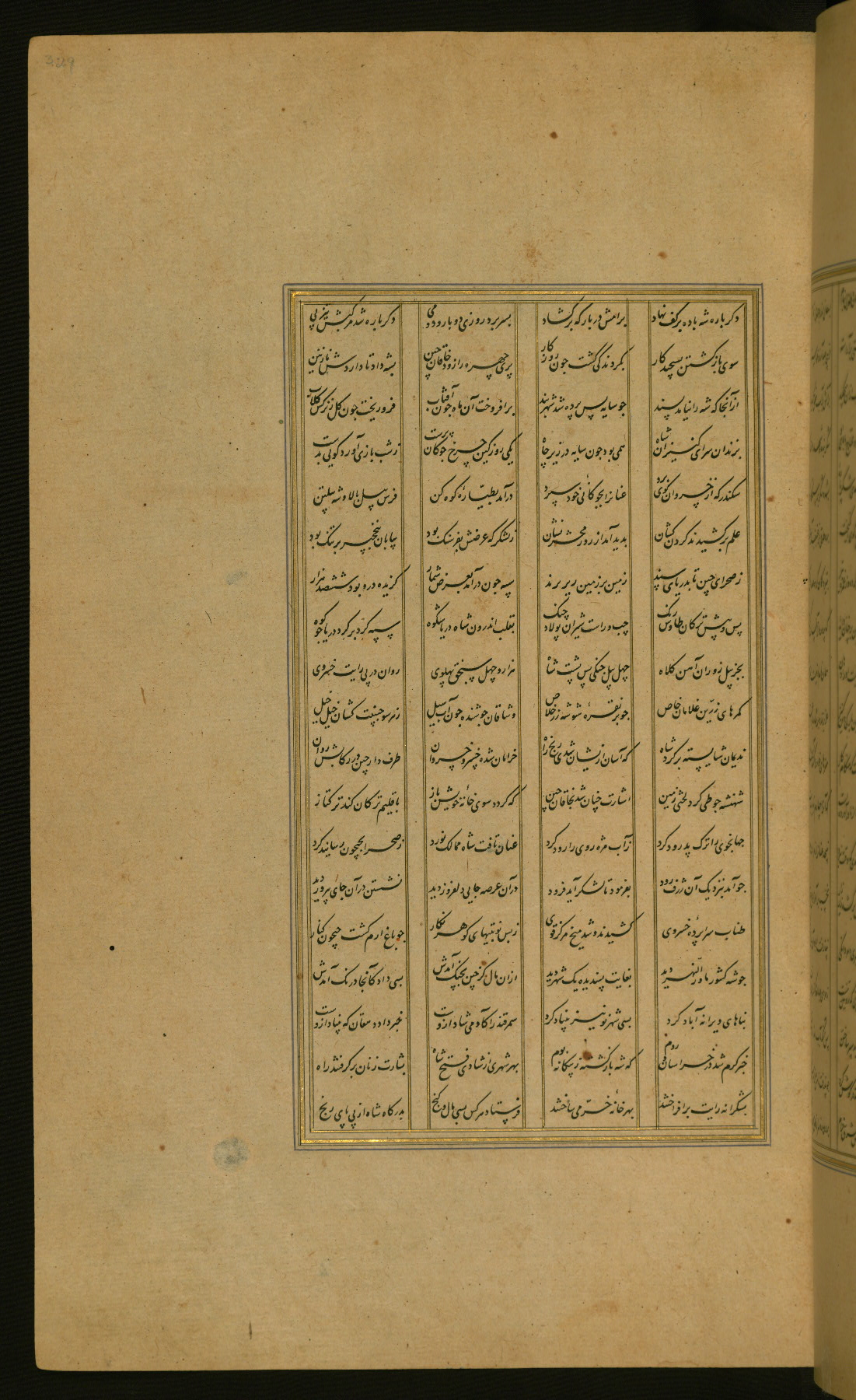 This illuminated and illustrated copy of the Khamsah (quintet) of Niẓāmī Ganjavī (d. 605 AH / 1209 CE) was written by Yār Muḥammad al-Haravī in 922 AH / 1516 CE. Written in four columns in black nastaʿlīq script, this manuscript opens with a double-page illuminated frontispiece signed by ʿAbd al-Wahhāb ibn ʿAbd al-Fattāḥ ibn ʿAlī. It contains thirty-five illustrations that were repainted in India during the twelfth century AH / eighteenth CE. The seal of Muḥammad Asharf ibn Muḥammad Khātam al-Ḥusaynī, dated 1173 AH / 1759-60 CE appears on fols. 1a and 401a. It is possible that the brown leather binding with center and side panels brushed with gold is original to the manuscript but was repaired at a later stage in the codex's history.