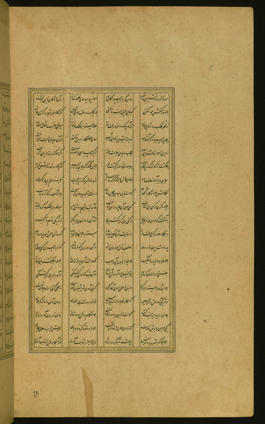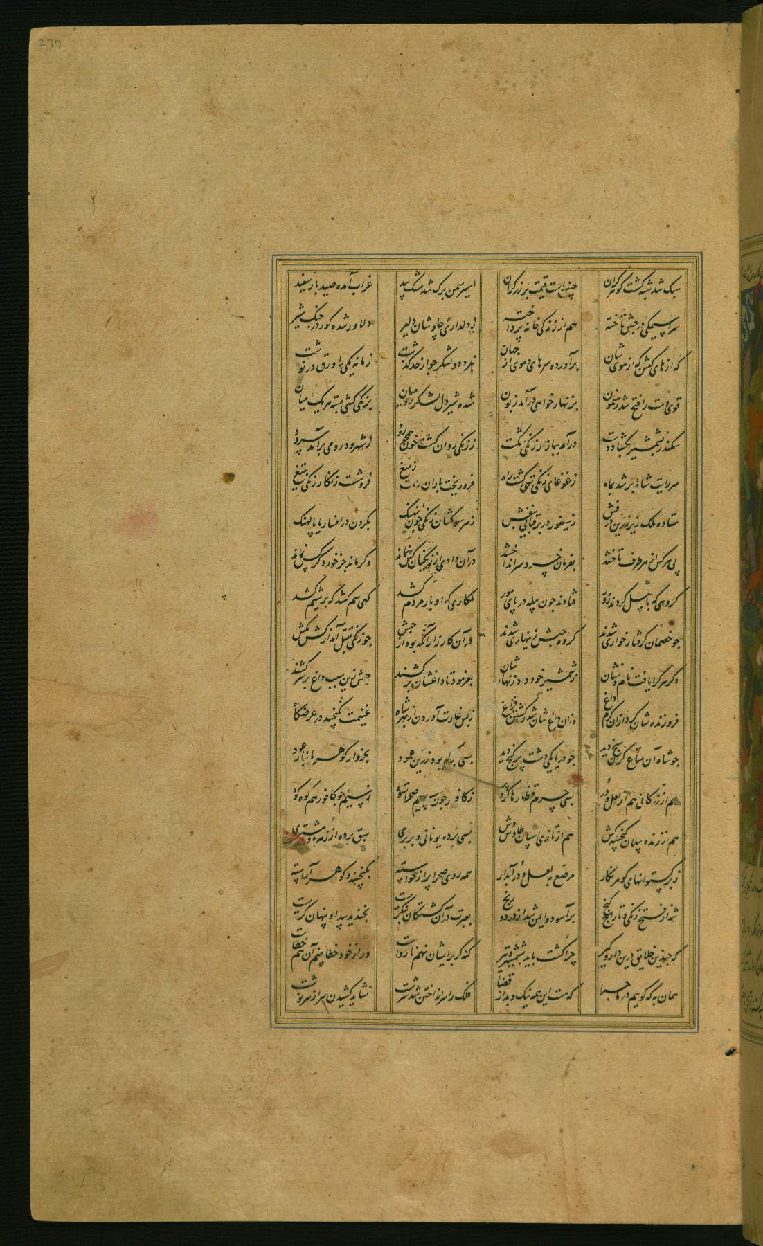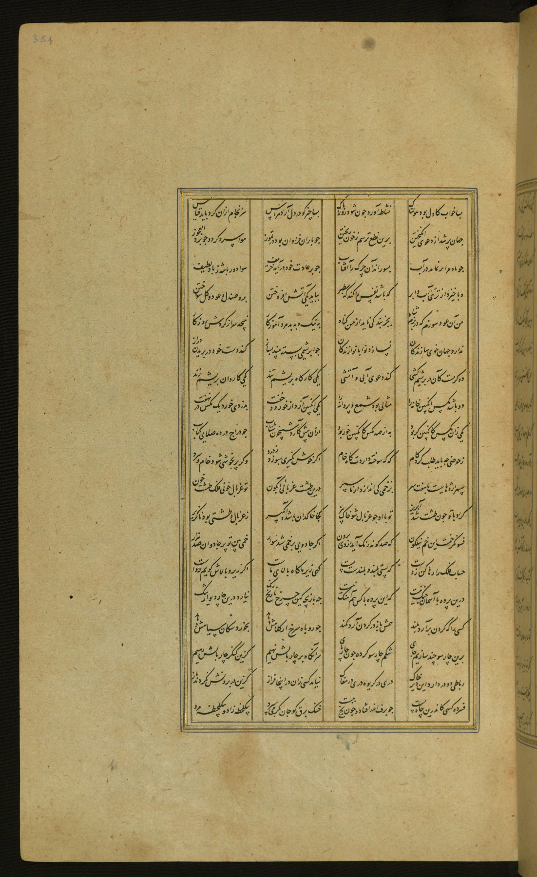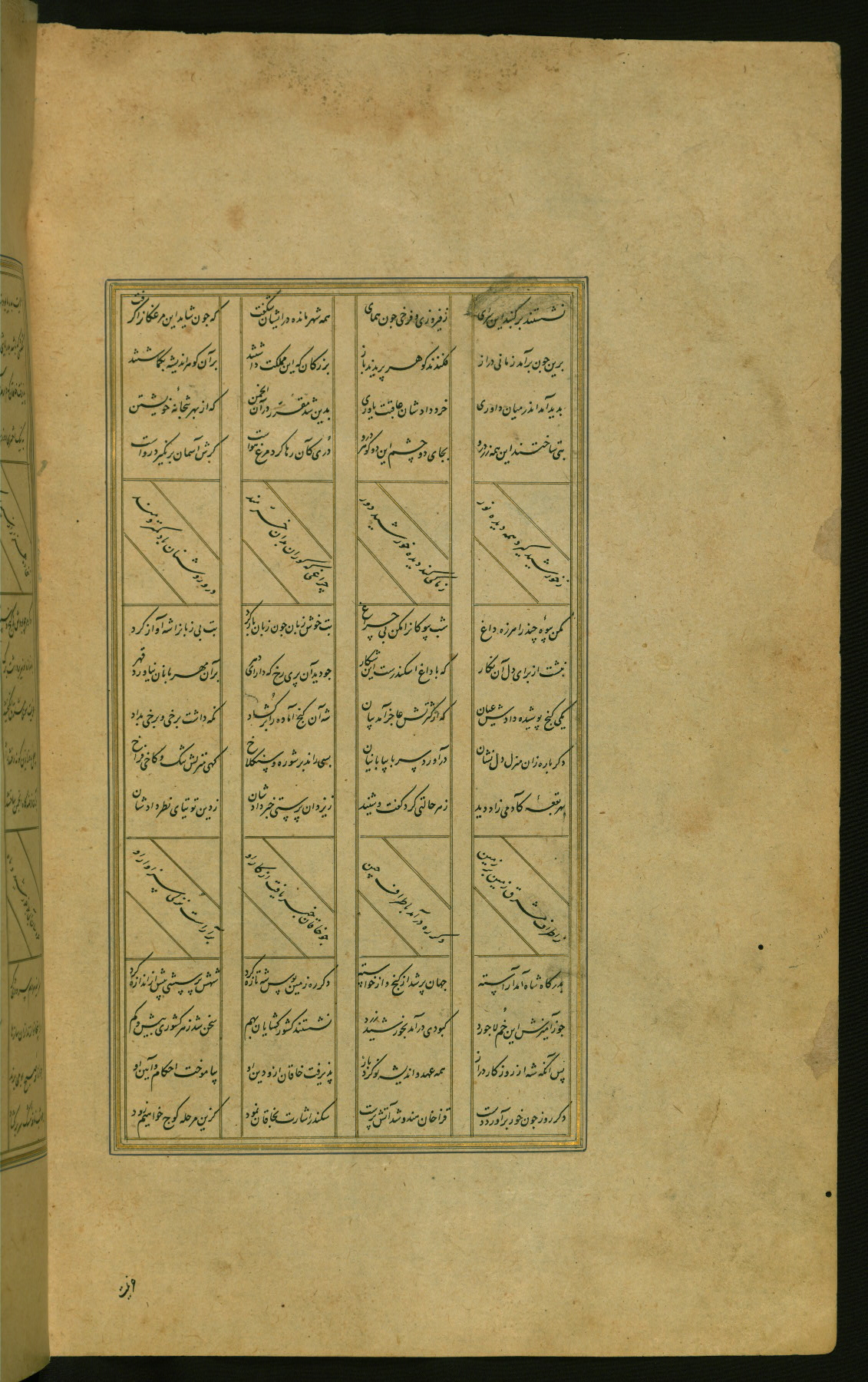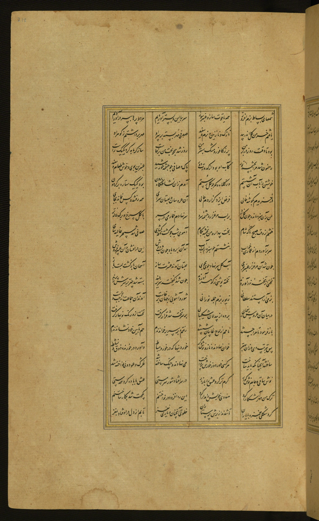 This illuminated and illustrated copy of the Khamsah (quintet) of Niẓāmī Ganjavī (d. 605 AH / 1209 CE) was written by Yār Muḥammad al-Haravī in 922 AH / 1516 CE. Written in four columns in black nastaʿlīq script, this manuscript opens with a double-page illuminated frontispiece signed by ʿAbd al-Wahhāb ibn ʿAbd al-Fattāḥ ibn ʿAlī. It contains thirty-five illustrations that were repainted in India during the twelfth century AH / eighteenth CE. The seal of Muḥammad Asharf ibn Muḥammad Khātam al-Ḥusaynī, dated 1173 AH / 1759-60 CE appears on fols. 1a and 401a. It is possible that the brown leather binding with center and side panels brushed with gold is original to the manuscript but was repaired at a later stage in the codex's history.
