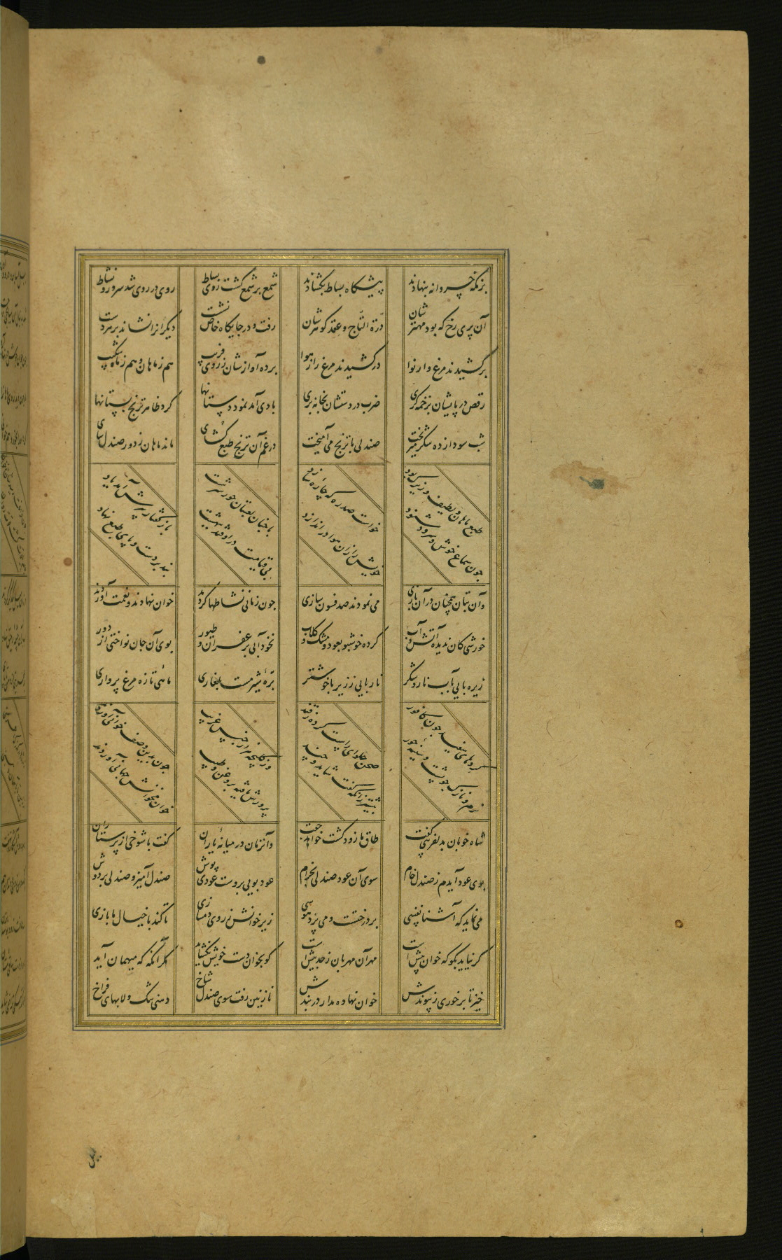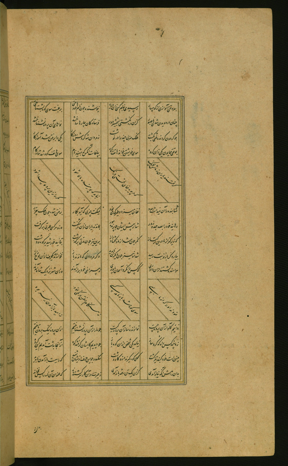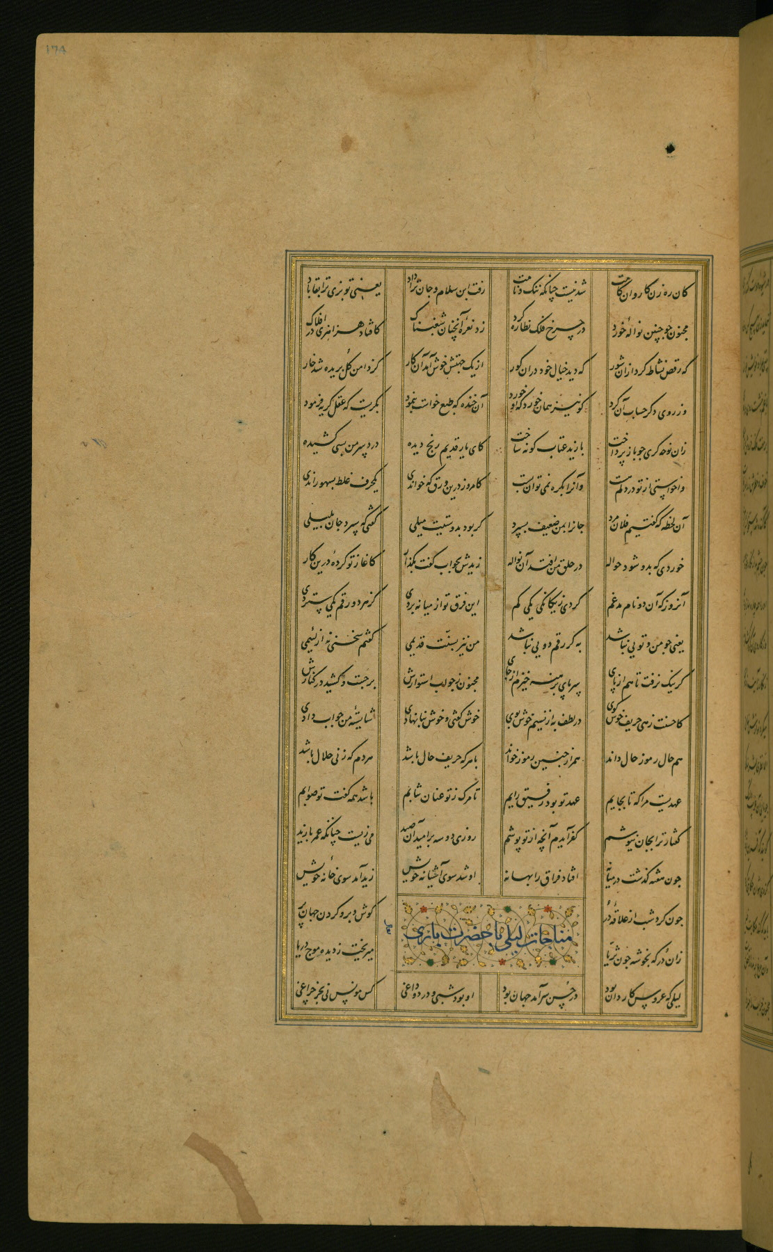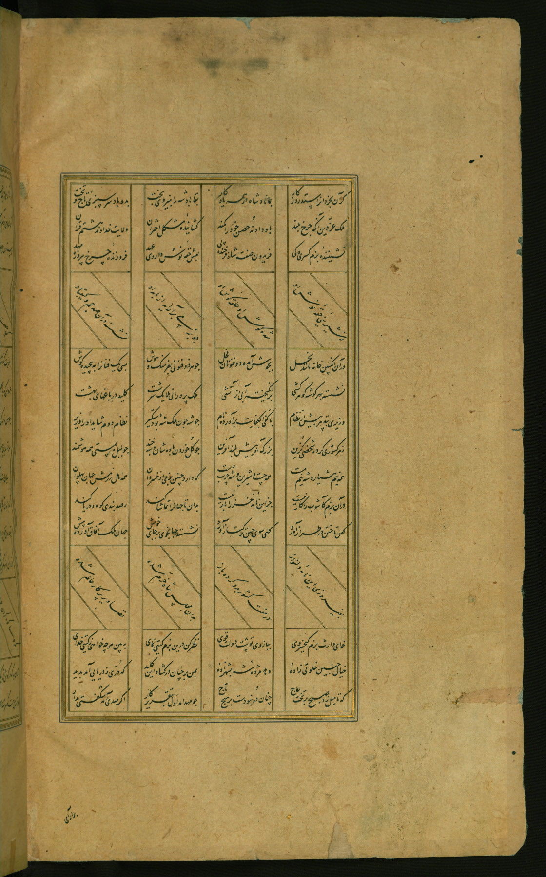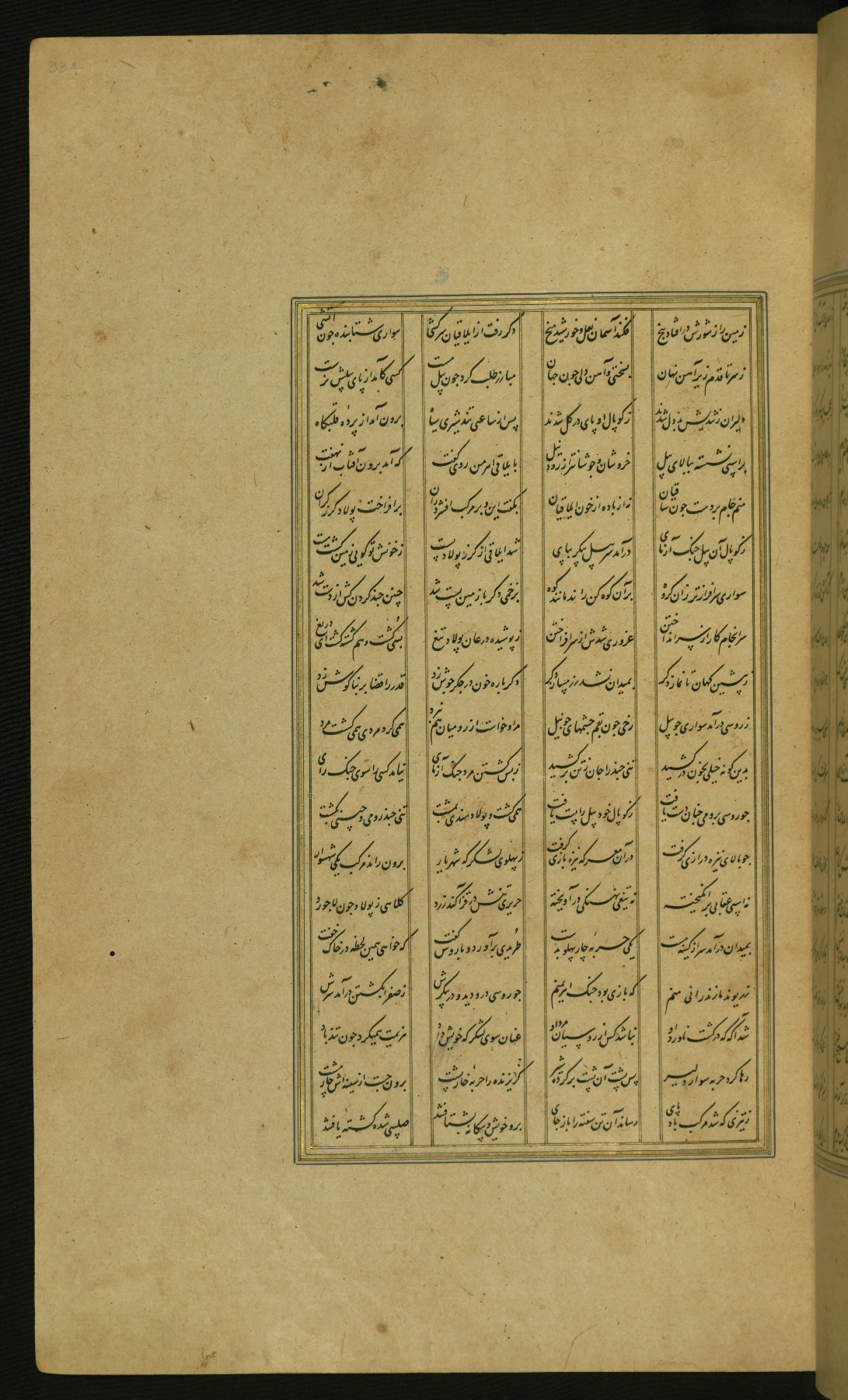 This illuminated and illustrated copy of the Khamsah (quintet) of Niẓāmī Ganjavī (d. 605 AH / 1209 CE) was written by Yār Muḥammad al-Haravī in 922 AH / 1516 CE. Written in four columns in black nastaʿlīq script, this manuscript opens with a double-page illuminated frontispiece signed by ʿAbd al-Wahhāb ibn ʿAbd al-Fattāḥ ibn ʿAlī. It contains thirty-five illustrations that were repainted in India during the twelfth century AH / eighteenth CE. The seal of Muḥammad Asharf ibn Muḥammad Khātam al-Ḥusaynī, dated 1173 AH / 1759-60 CE appears on fols. 1a and 401a. It is possible that the brown leather binding with center and side panels brushed with gold is original to the manuscript but was repaired at a later stage in the codex's history.