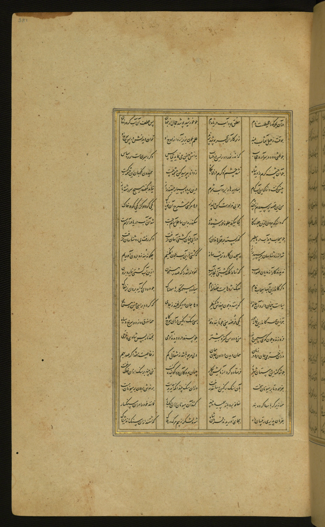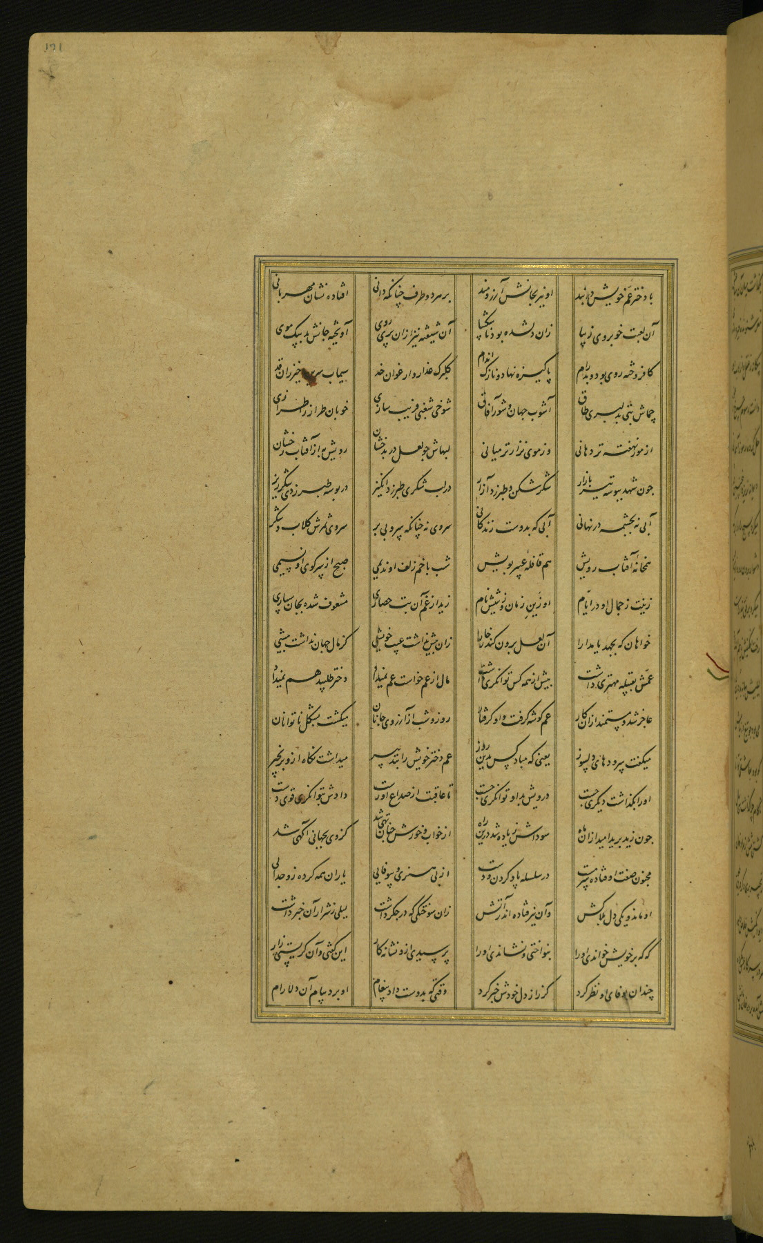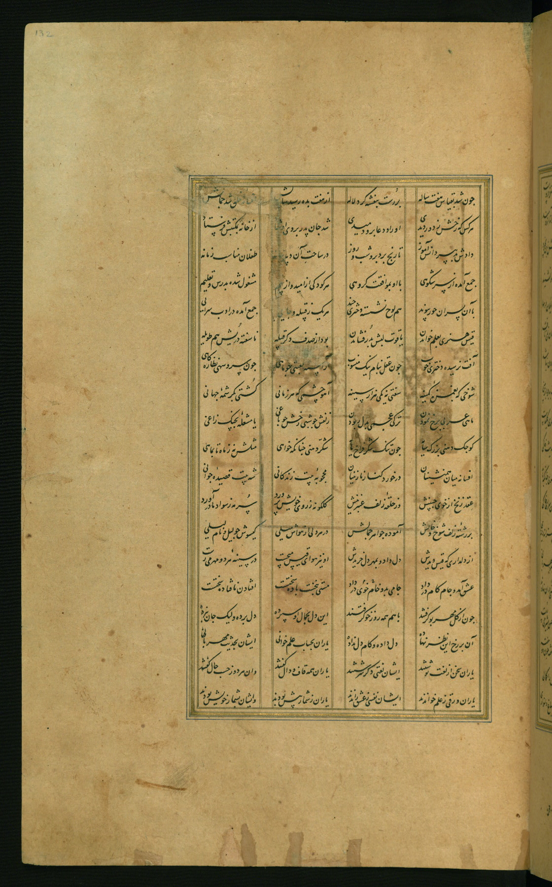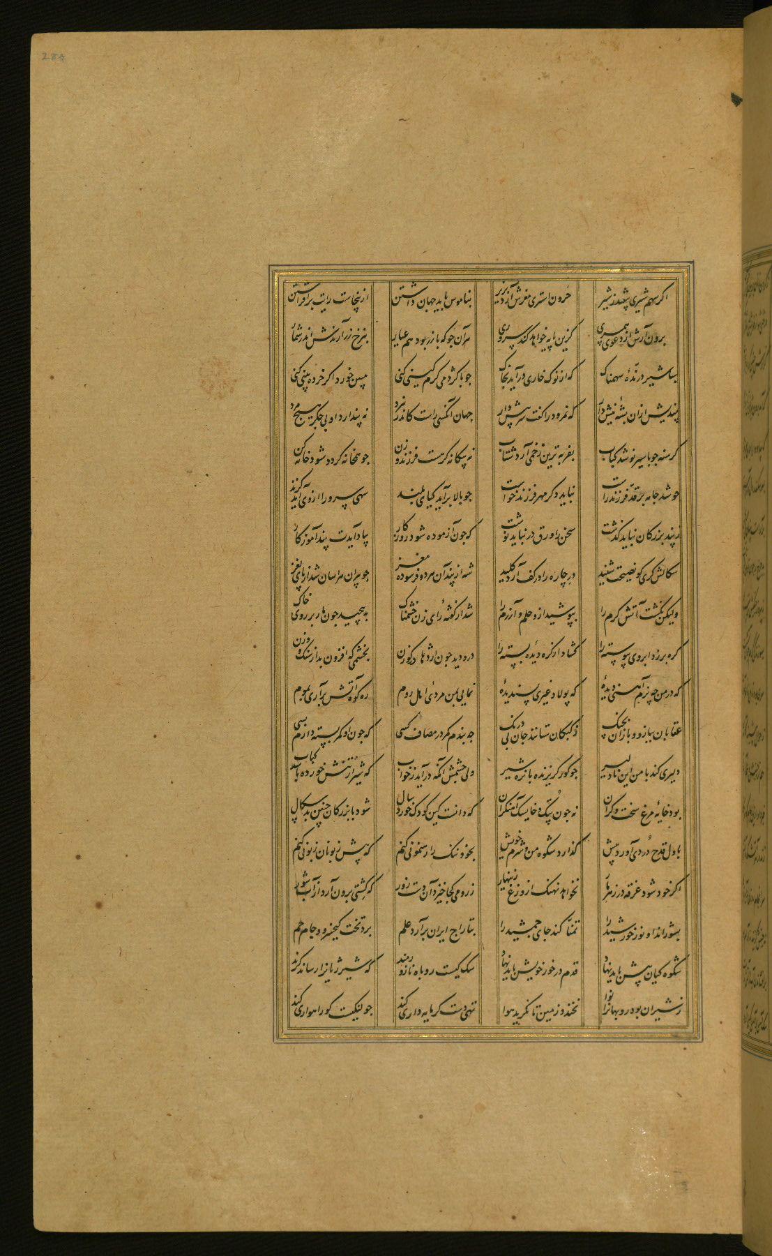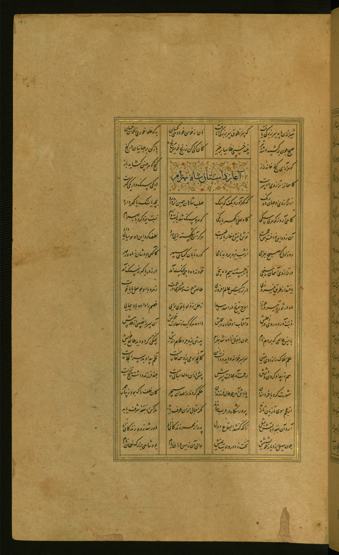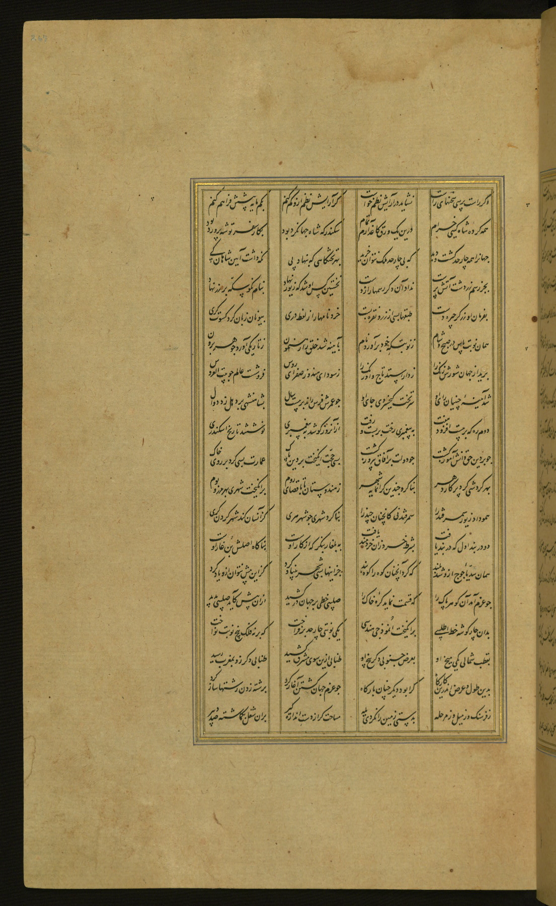 This illuminated and illustrated copy of the Khamsah (quintet) of Niẓāmī Ganjavī (d. 605 AH / 1209 CE) was written by Yār Muḥammad al-Haravī in 922 AH / 1516 CE. Written in four columns in black nastaʿlīq script, this manuscript opens with a double-page illuminated frontispiece signed by ʿAbd al-Wahhāb ibn ʿAbd al-Fattāḥ ibn ʿAlī. It contains thirty-five illustrations that were repainted in India during the twelfth century AH / eighteenth CE. The seal of Muḥammad Asharf ibn Muḥammad Khātam al-Ḥusaynī, dated 1173 AH / 1759-60 CE appears on fols. 1a and 401a. It is possible that the brown leather binding with center and side panels brushed with gold is original to the manuscript but was repaired at a later stage in the codex's history.