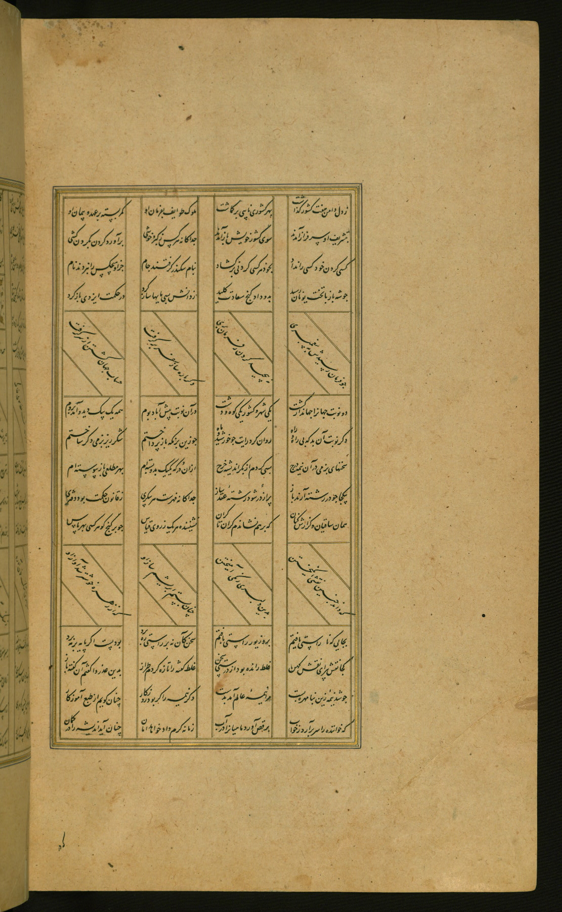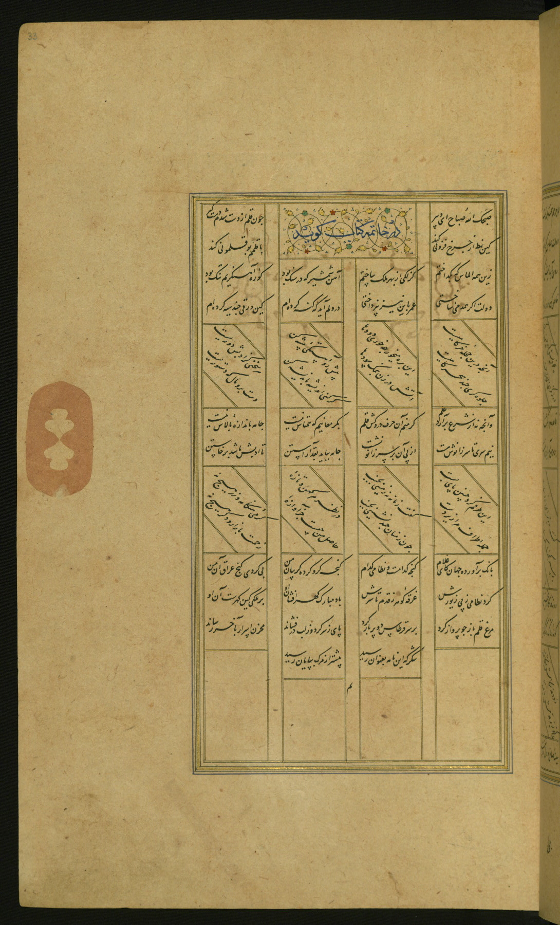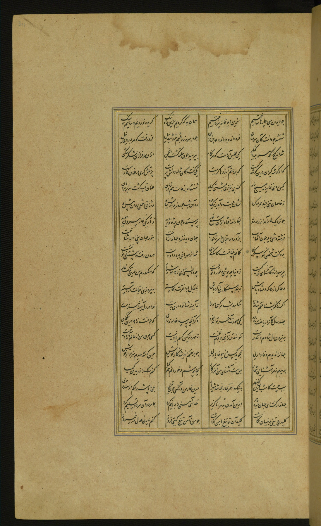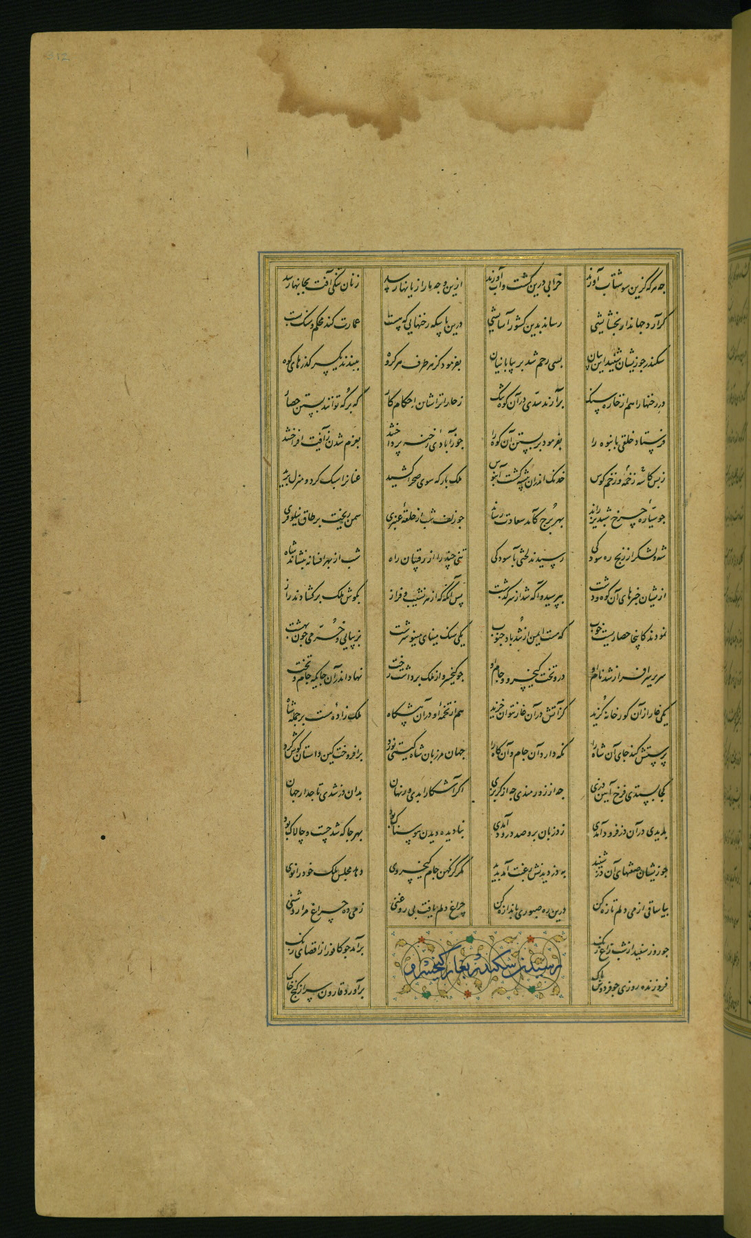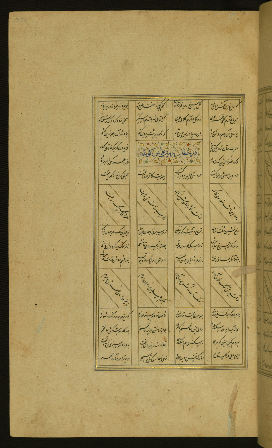 This illuminated and illustrated copy of the Khamsah (quintet) of Niẓāmī Ganjavī (d. 605 AH / 1209 CE) was written by Yār Muḥammad al-Haravī in 922 AH / 1516 CE. Written in four columns in black nastaʿlīq script, this manuscript opens with a double-page illuminated frontispiece signed by ʿAbd al-Wahhāb ibn ʿAbd al-Fattāḥ ibn ʿAlī. It contains thirty-five illustrations that were repainted in India during the twelfth century AH / eighteenth CE. The seal of Muḥammad Asharf ibn Muḥammad Khātam al-Ḥusaynī, dated 1173 AH / 1759-60 CE appears on fols. 1a and 401a. It is possible that the brown leather binding with center and side panels brushed with gold is original to the manuscript but was repaired at a later stage in the codex's history.