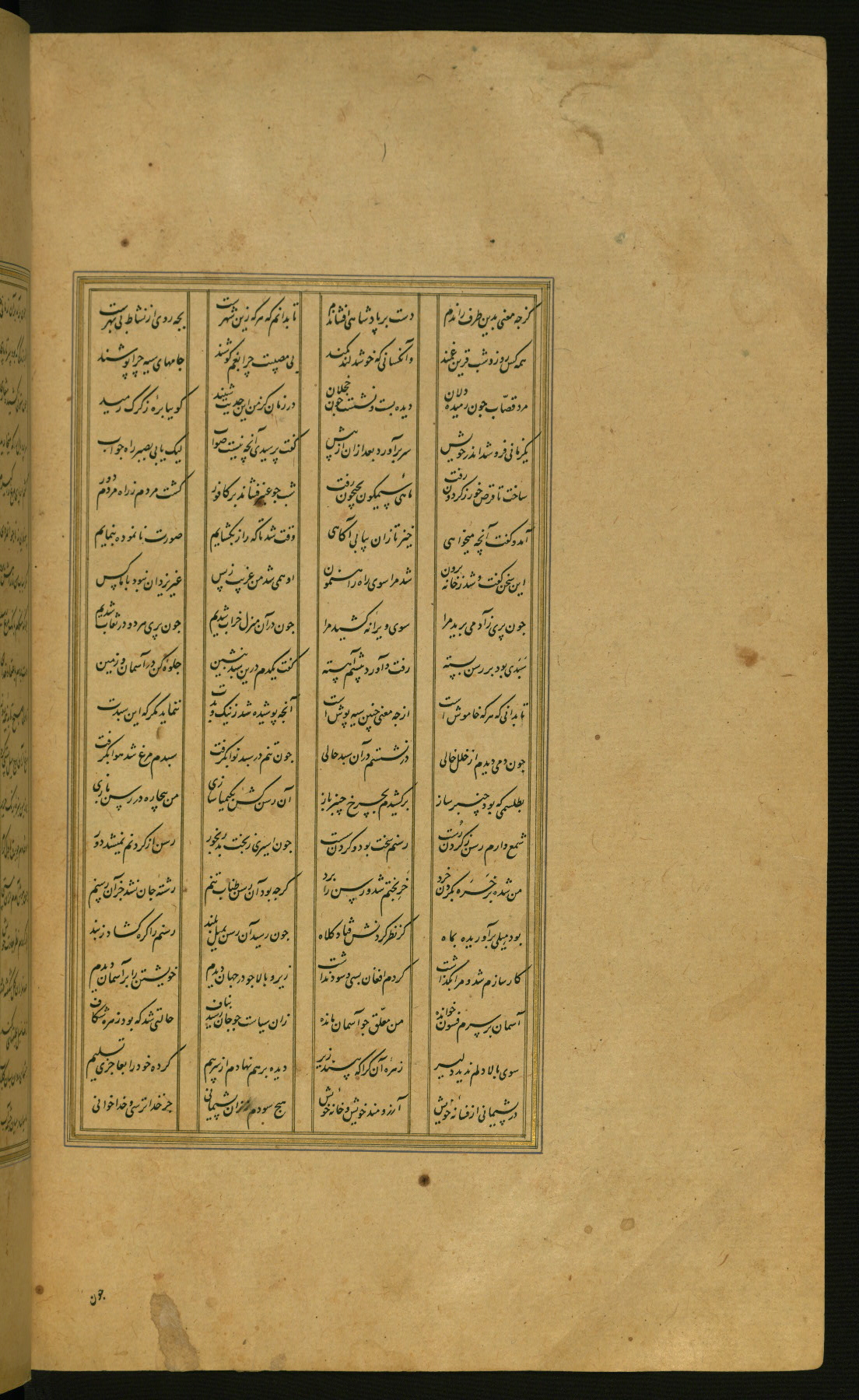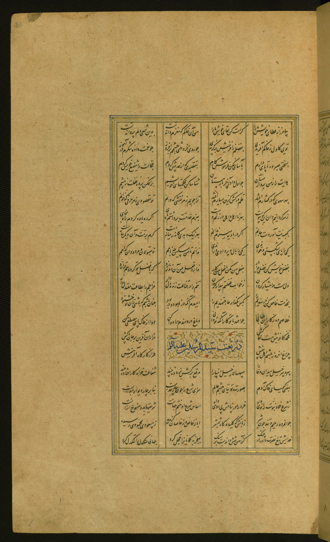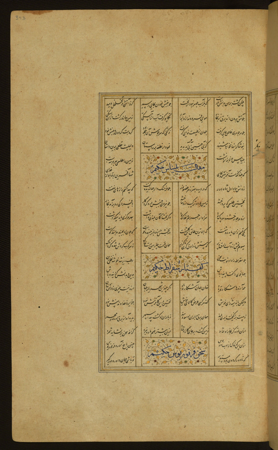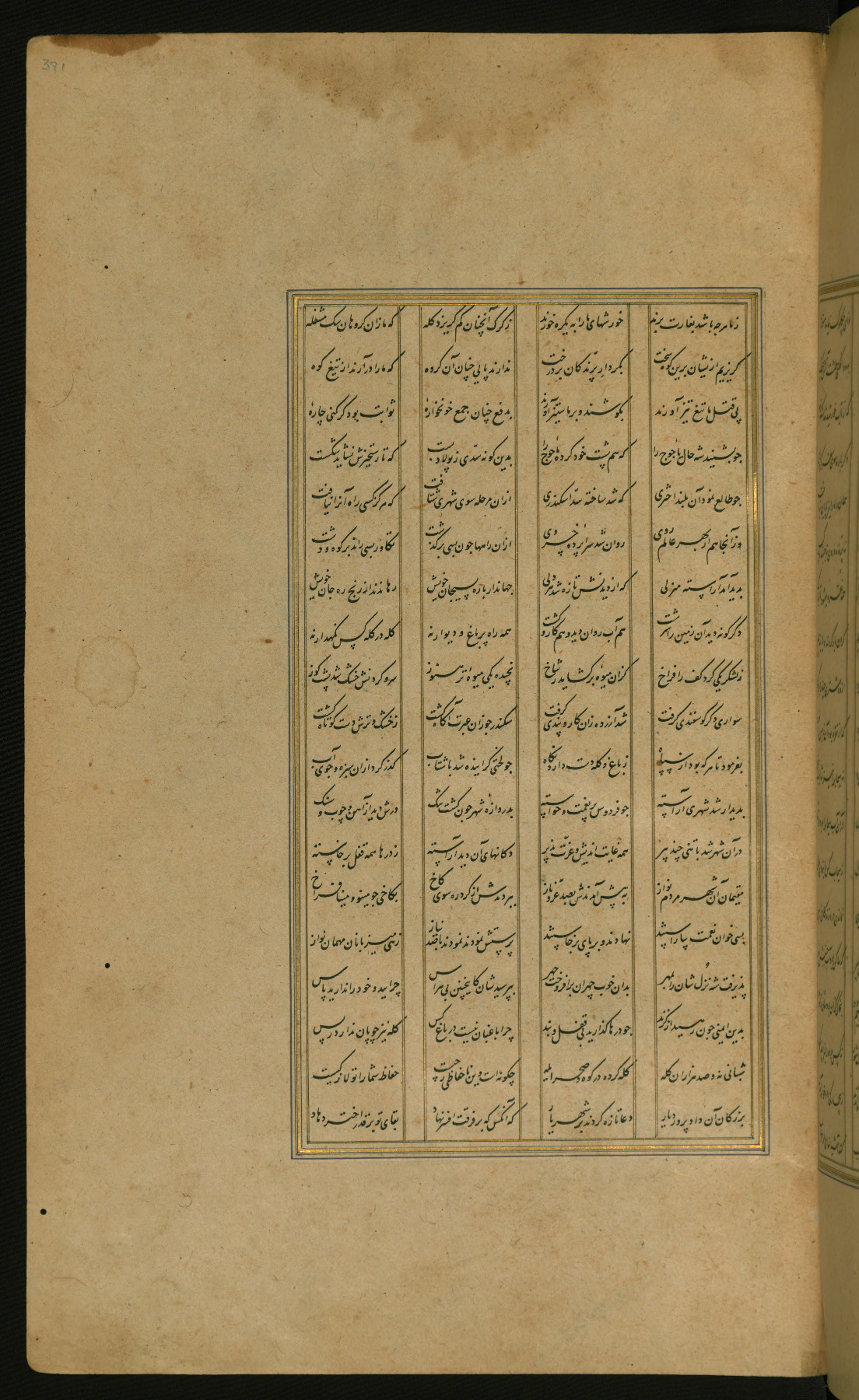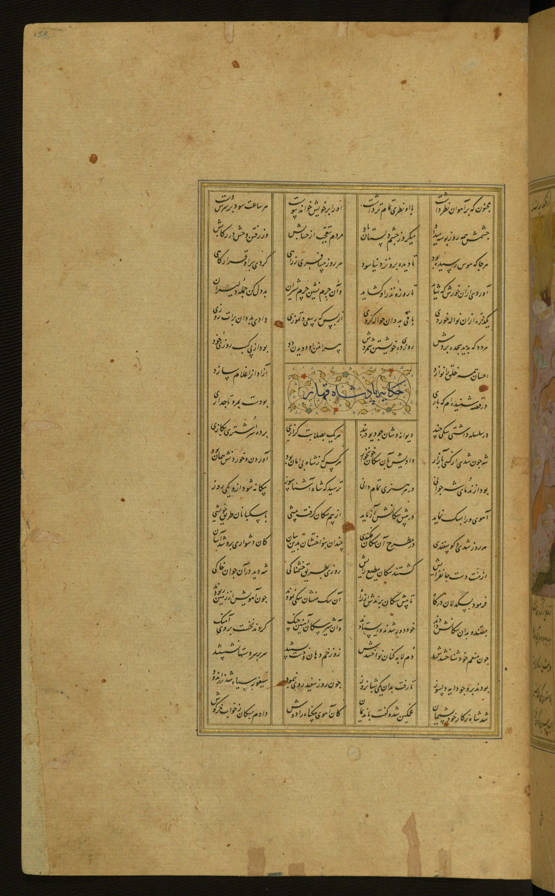 This illuminated and illustrated copy of the Khamsah (quintet) of Niẓāmī Ganjavī (d. 605 AH / 1209 CE) was written by Yār Muḥammad al-Haravī in 922 AH / 1516 CE. Written in four columns in black nastaʿlīq script, this manuscript opens with a double-page illuminated frontispiece signed by ʿAbd al-Wahhāb ibn ʿAbd al-Fattāḥ ibn ʿAlī. It contains thirty-five illustrations that were repainted in India during the twelfth century AH / eighteenth CE. The seal of Muḥammad Asharf ibn Muḥammad Khātam al-Ḥusaynī, dated 1173 AH / 1759-60 CE appears on fols. 1a and 401a. It is possible that the brown leather binding with center and side panels brushed with gold is original to the manuscript but was repaired at a later stage in the codex's history.