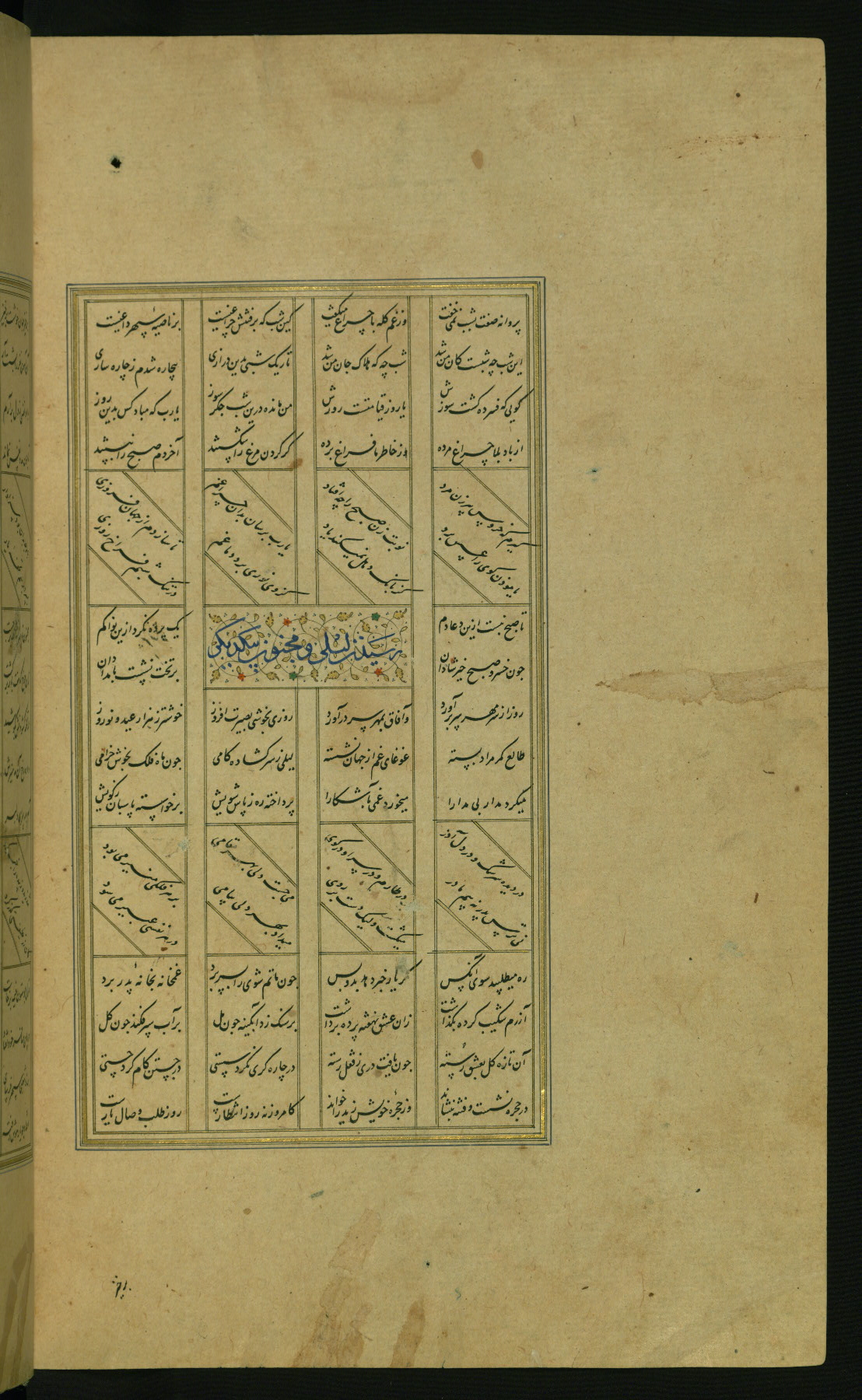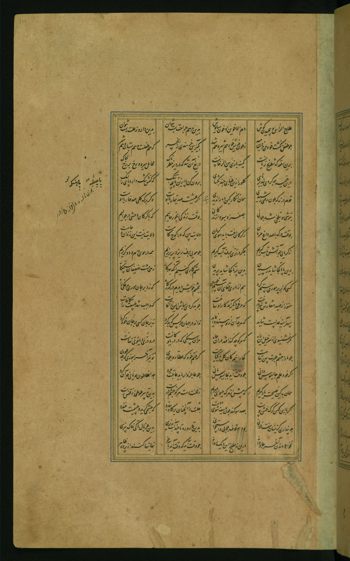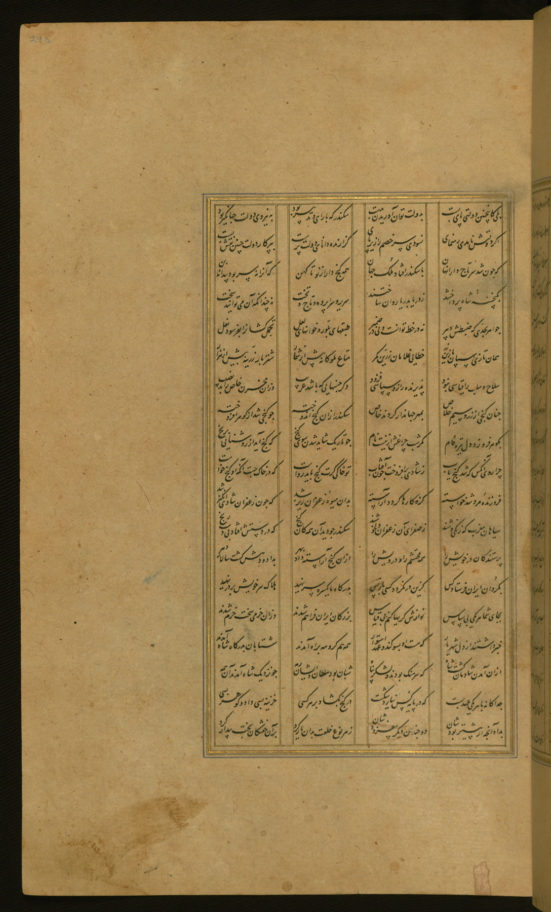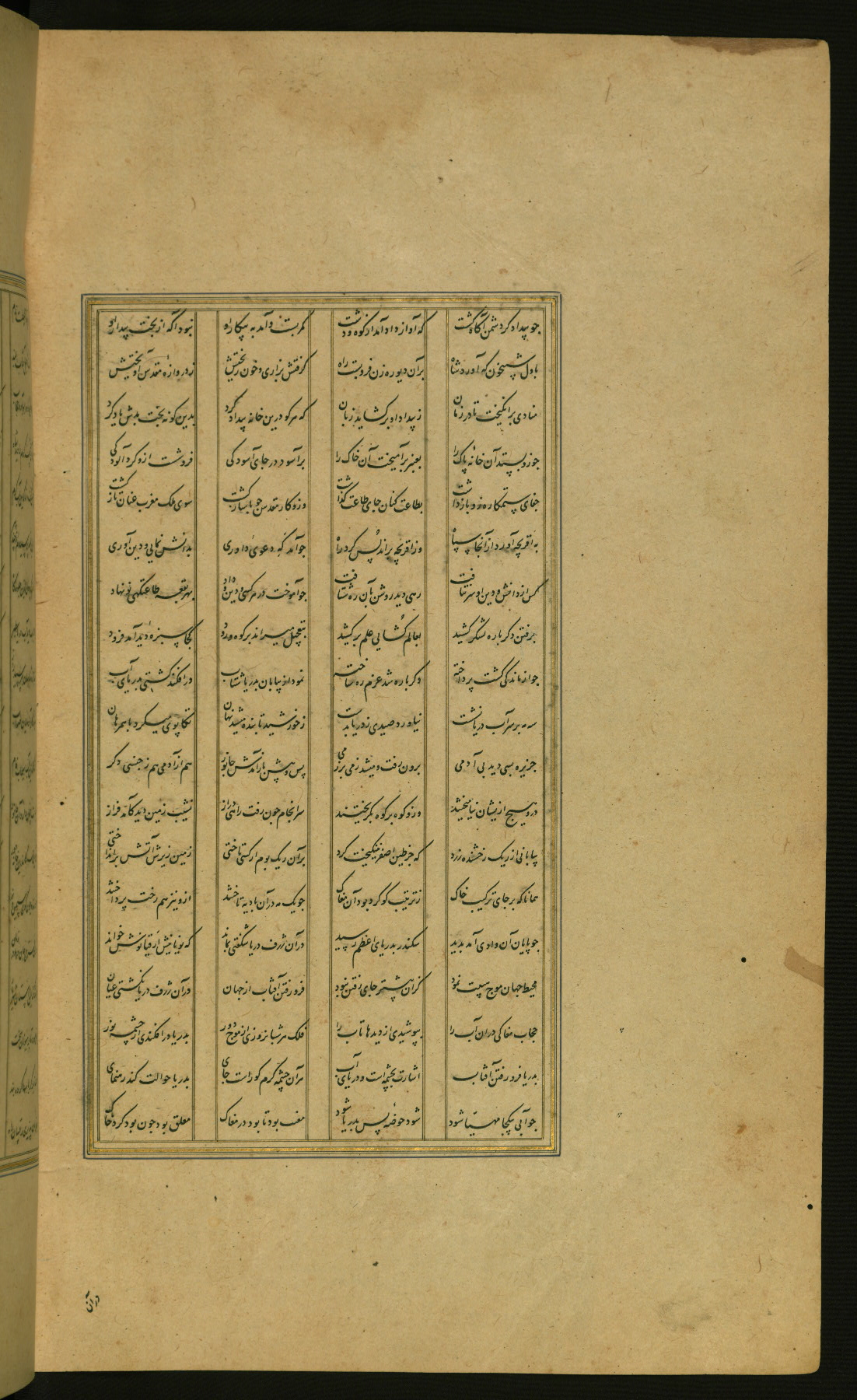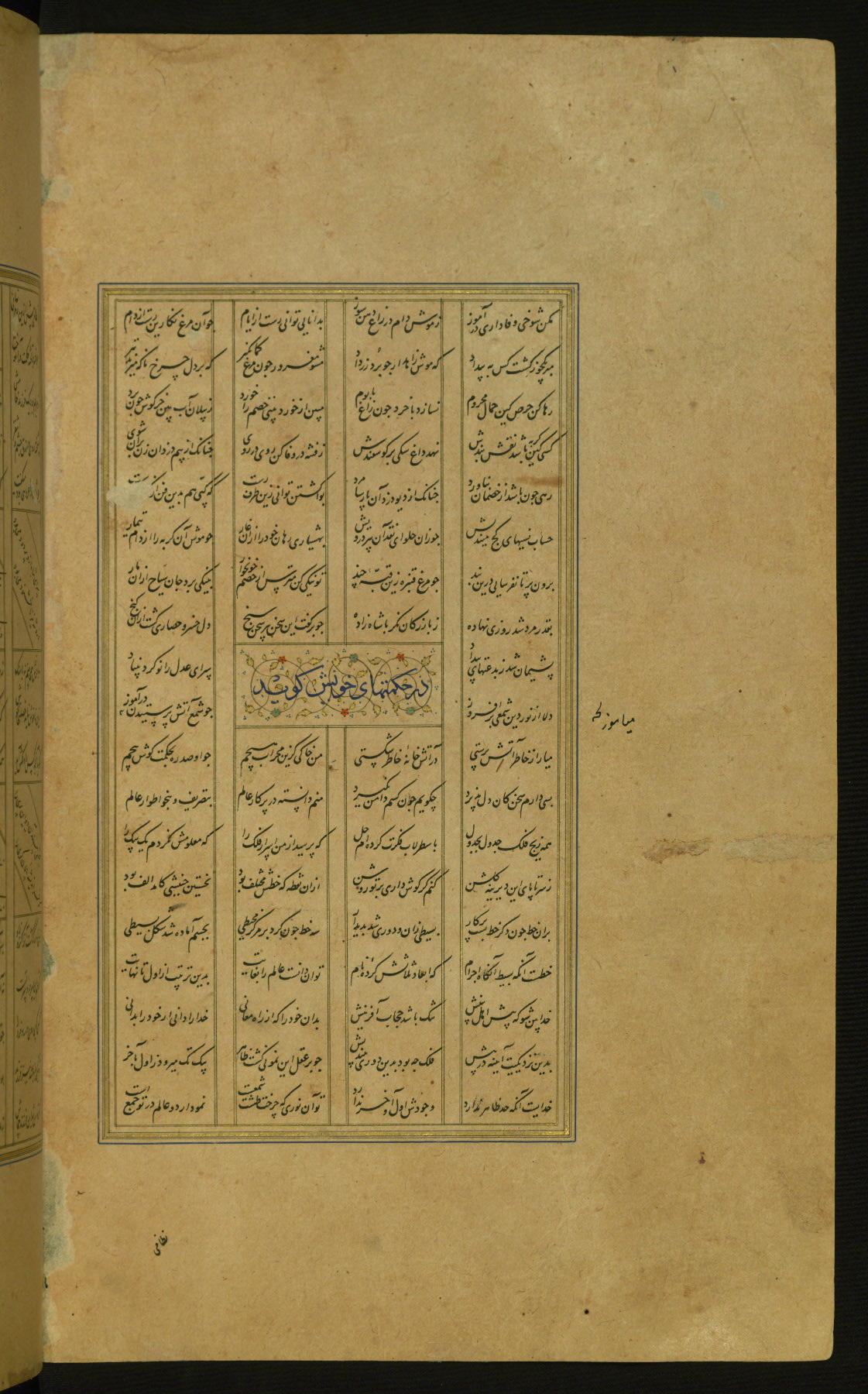 This illuminated and illustrated copy of the Khamsah (quintet) of Niẓāmī Ganjavī (d. 605 AH / 1209 CE) was written by Yār Muḥammad al-Haravī in 922 AH / 1516 CE. Written in four columns in black nastaʿlīq script, this manuscript opens with a double-page illuminated frontispiece signed by ʿAbd al-Wahhāb ibn ʿAbd al-Fattāḥ ibn ʿAlī. It contains thirty-five illustrations that were repainted in India during the twelfth century AH / eighteenth CE. The seal of Muḥammad Asharf ibn Muḥammad Khātam al-Ḥusaynī, dated 1173 AH / 1759-60 CE appears on fols. 1a and 401a. It is possible that the brown leather binding with center and side panels brushed with gold is original to the manuscript but was repaired at a later stage in the codex's history.