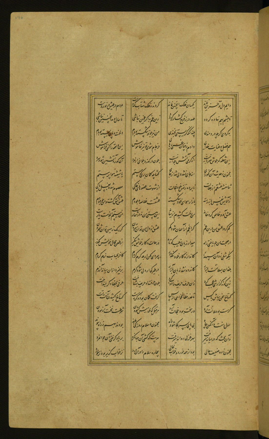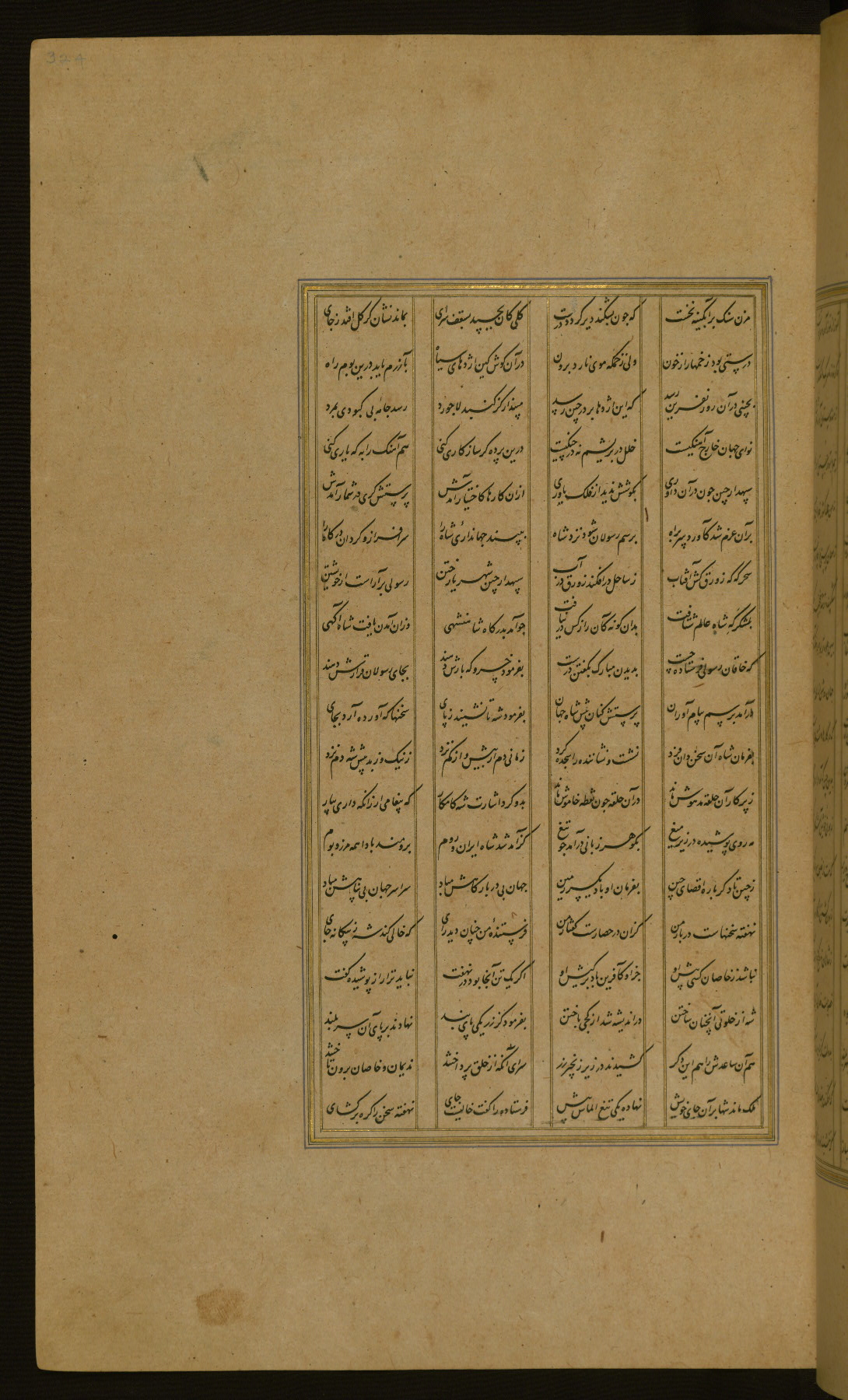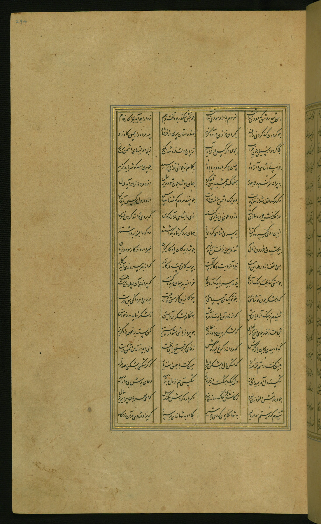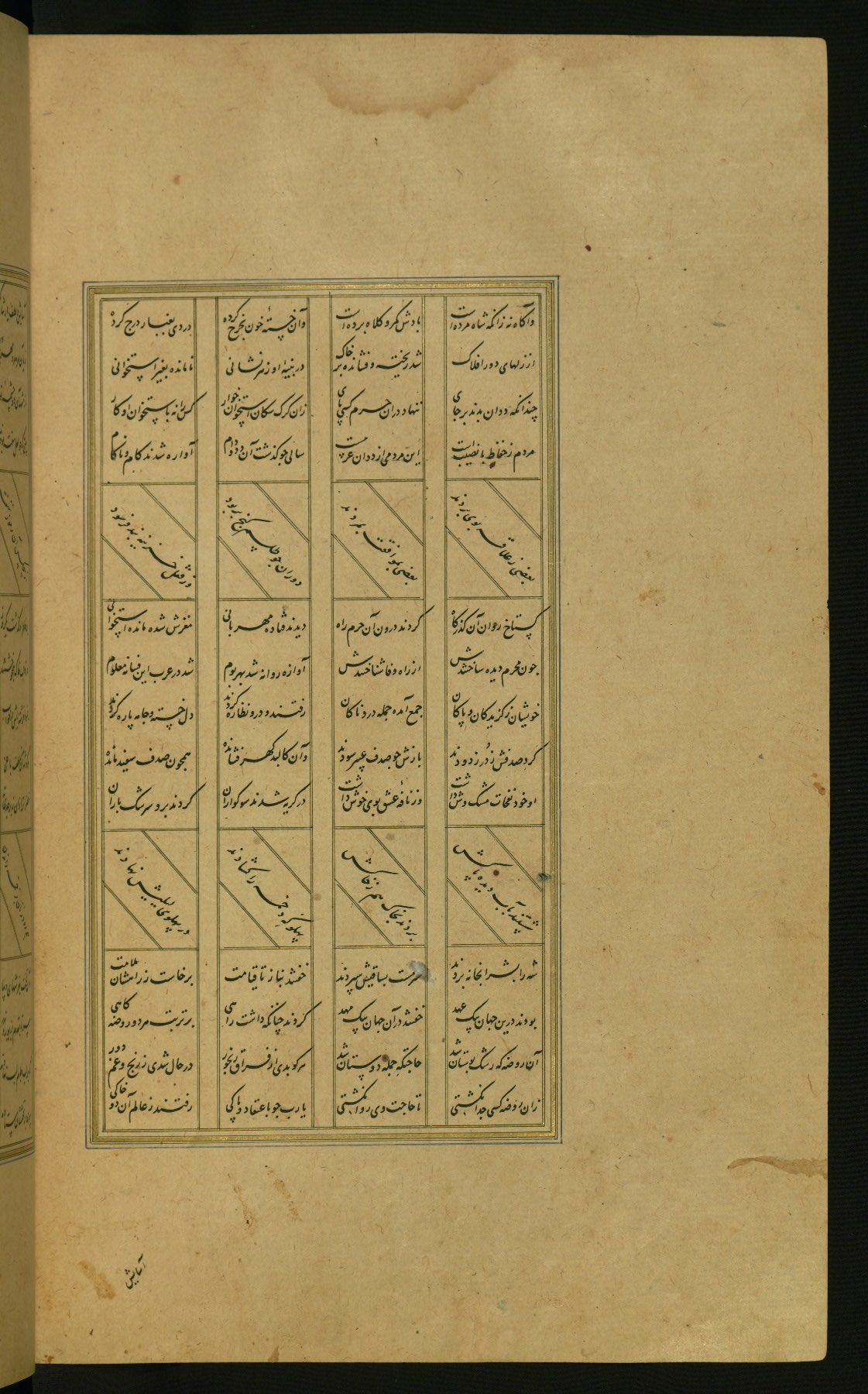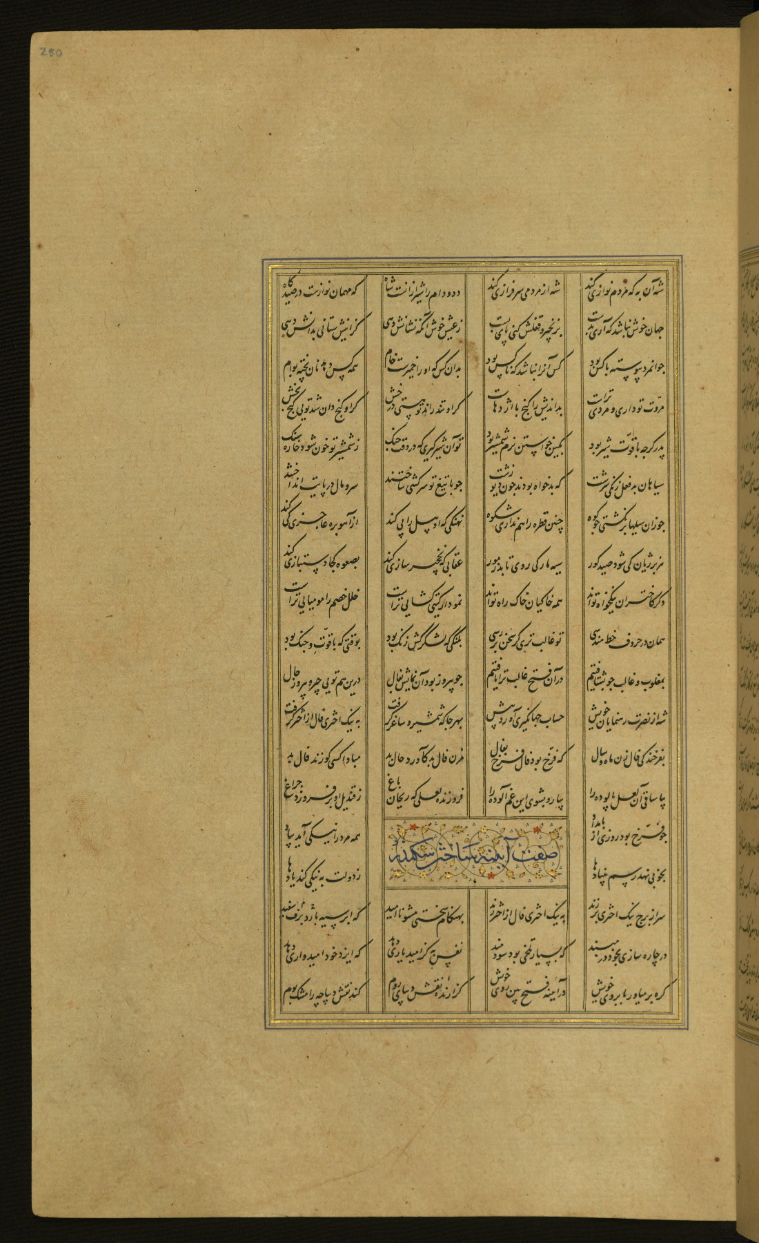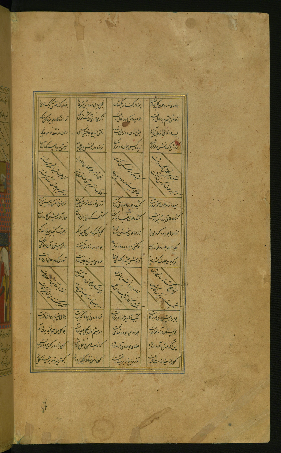 This illuminated and illustrated copy of the Khamsah (quintet) of Niẓāmī Ganjavī (d. 605 AH / 1209 CE) was written by Yār Muḥammad al-Haravī in 922 AH / 1516 CE. Written in four columns in black nastaʿlīq script, this manuscript opens with a double-page illuminated frontispiece signed by ʿAbd al-Wahhāb ibn ʿAbd al-Fattāḥ ibn ʿAlī. It contains thirty-five illustrations that were repainted in India during the twelfth century AH / eighteenth CE. The seal of Muḥammad Asharf ibn Muḥammad Khātam al-Ḥusaynī, dated 1173 AH / 1759-60 CE appears on fols. 1a and 401a. It is possible that the brown leather binding with center and side panels brushed with gold is original to the manuscript but was repaired at a later stage in the codex's history.
