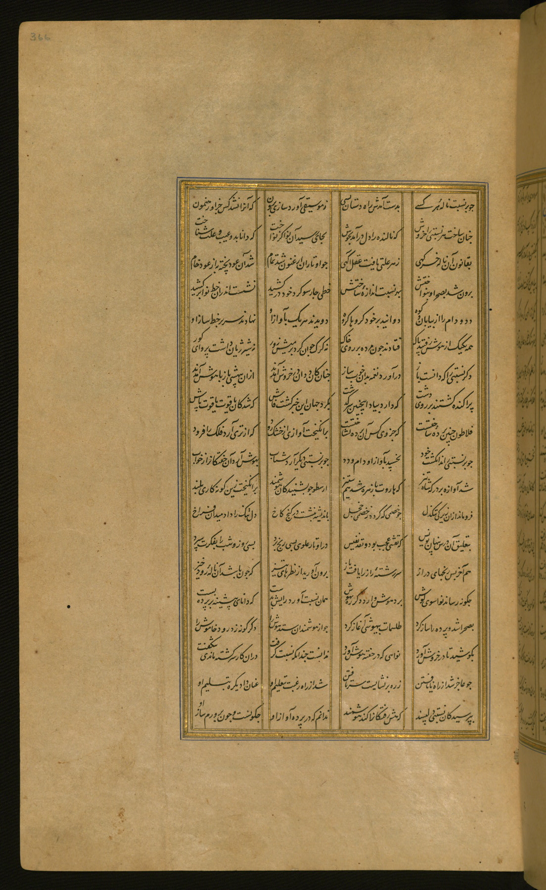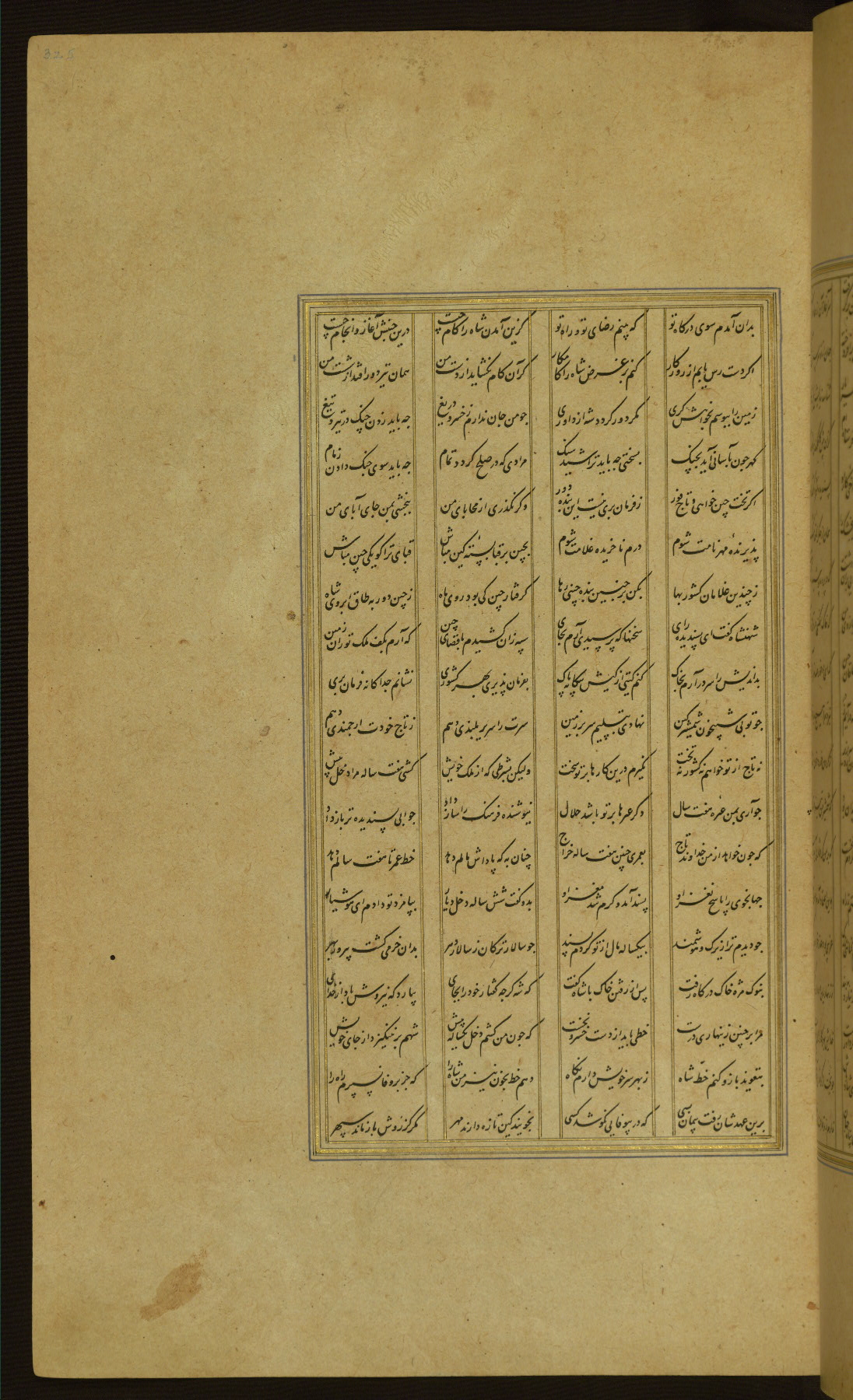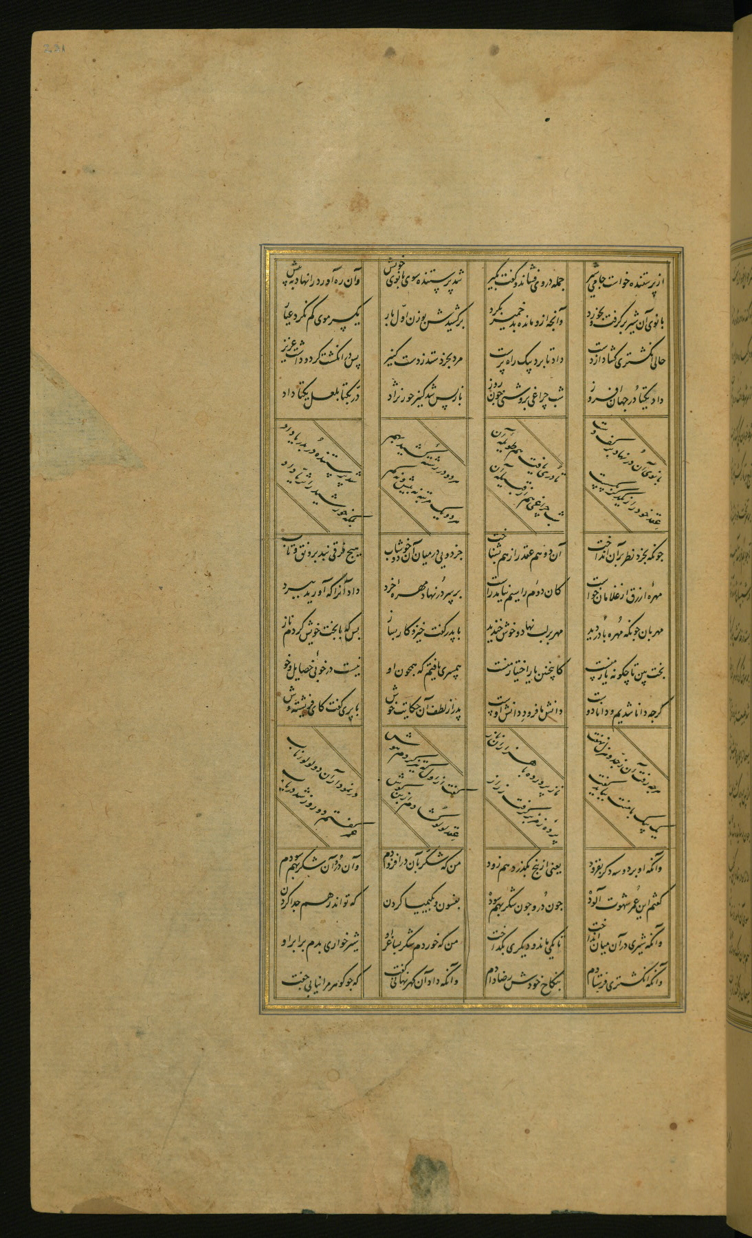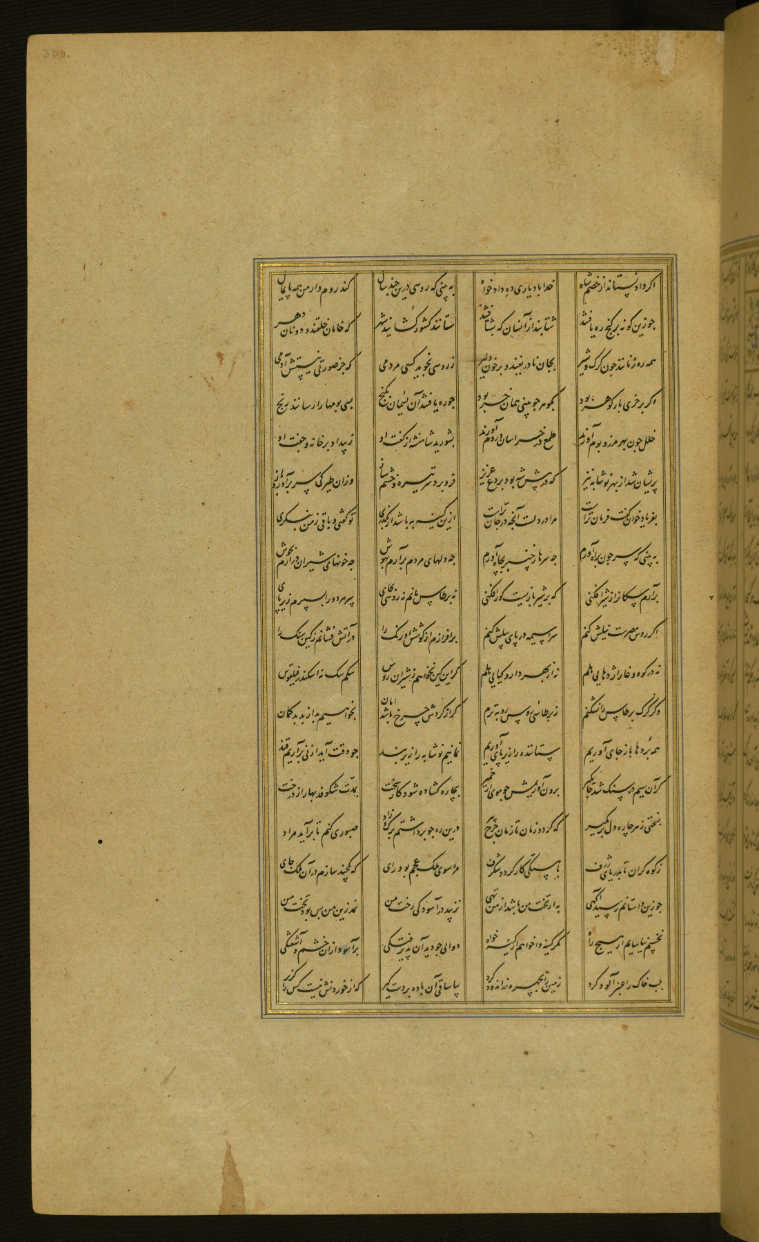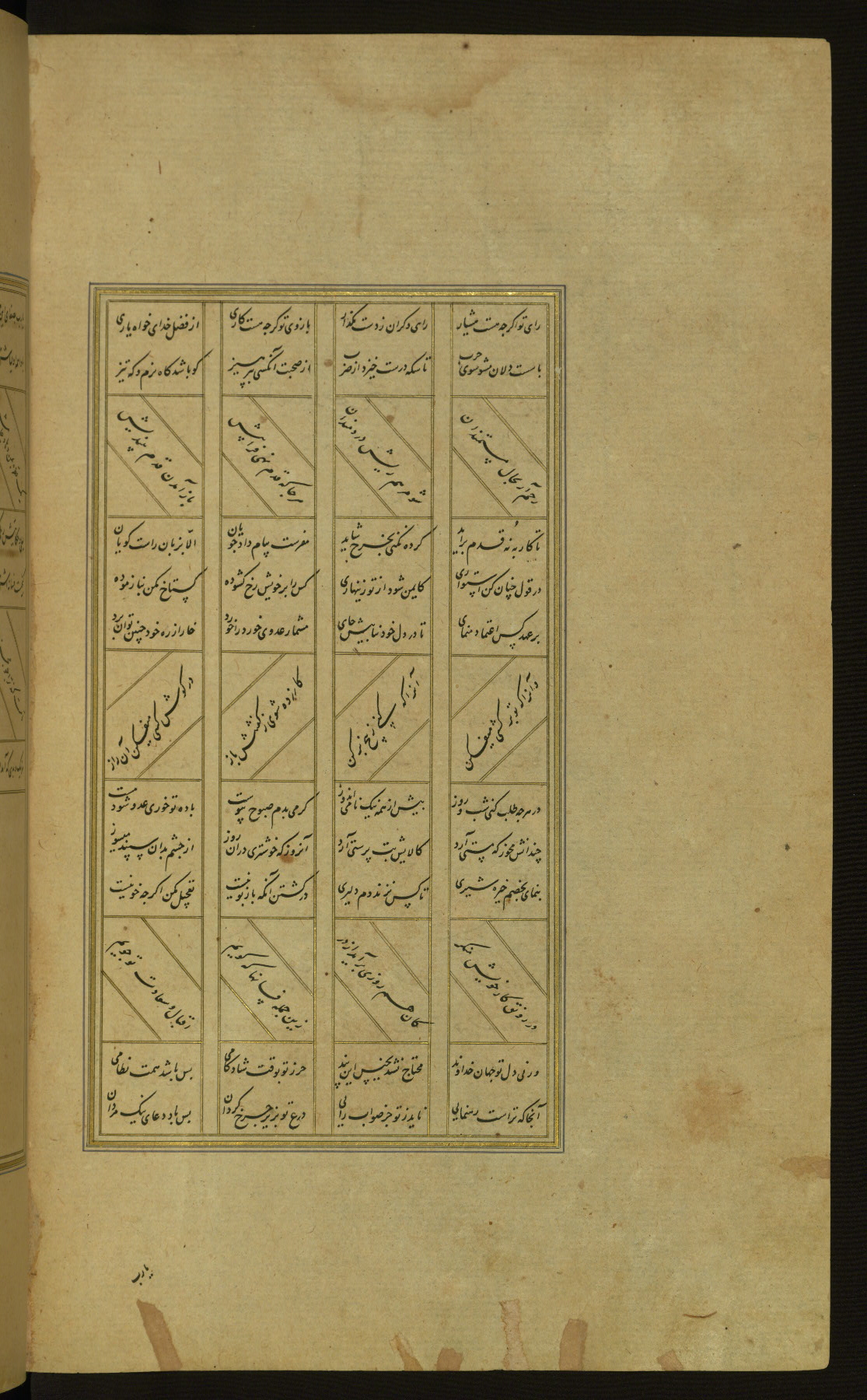 This illuminated and illustrated copy of the Khamsah (quintet) of Niẓāmī Ganjavī (d. 605 AH / 1209 CE) was written by Yār Muḥammad al-Haravī in 922 AH / 1516 CE. Written in four columns in black nastaʿlīq script, this manuscript opens with a double-page illuminated frontispiece signed by ʿAbd al-Wahhāb ibn ʿAbd al-Fattāḥ ibn ʿAlī. It contains thirty-five illustrations that were repainted in India during the twelfth century AH / eighteenth CE. The seal of Muḥammad Asharf ibn Muḥammad Khātam al-Ḥusaynī, dated 1173 AH / 1759-60 CE appears on fols. 1a and 401a. It is possible that the brown leather binding with center and side panels brushed with gold is original to the manuscript but was repaired at a later stage in the codex's history.