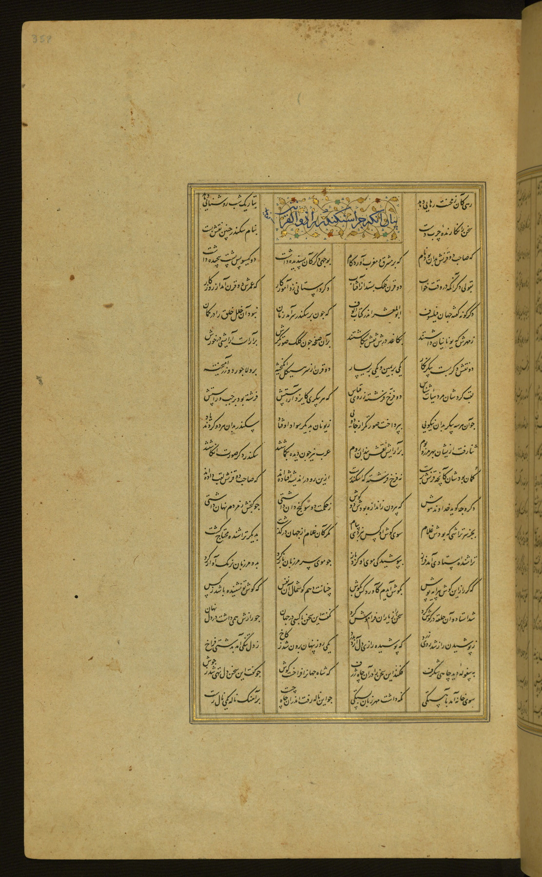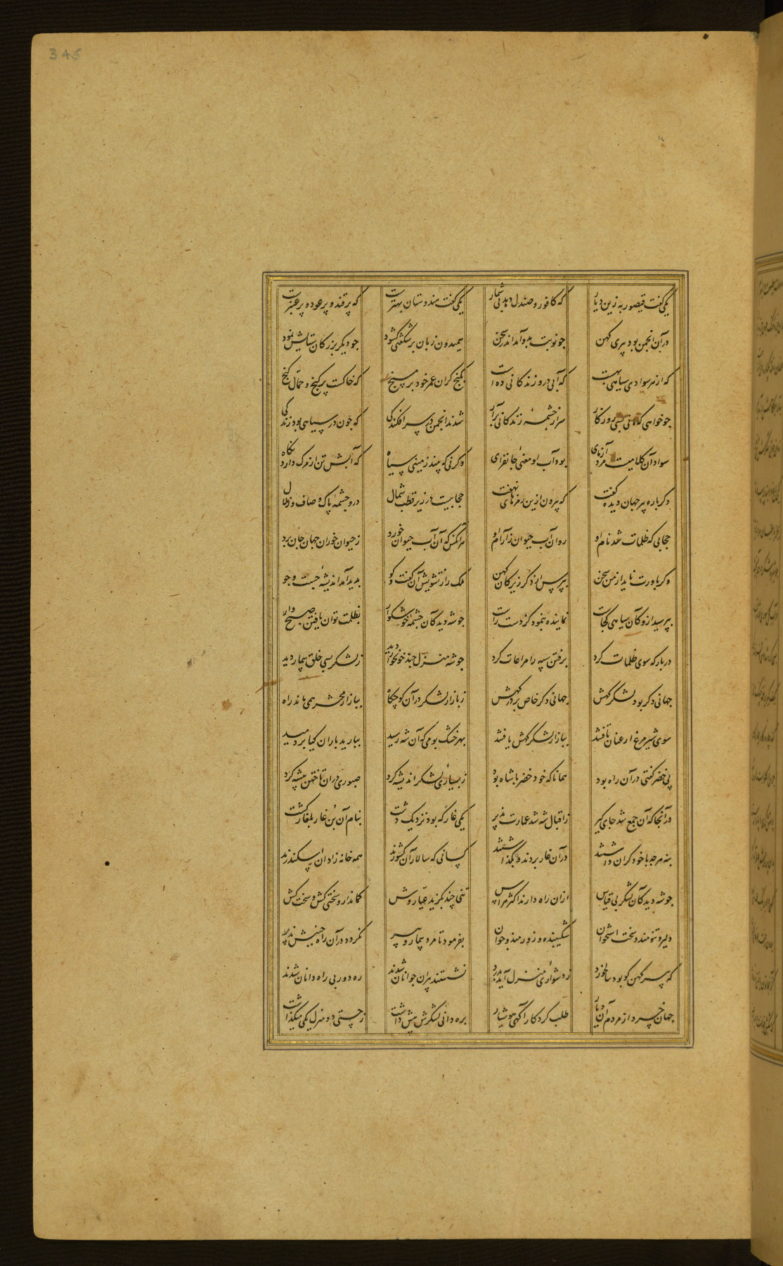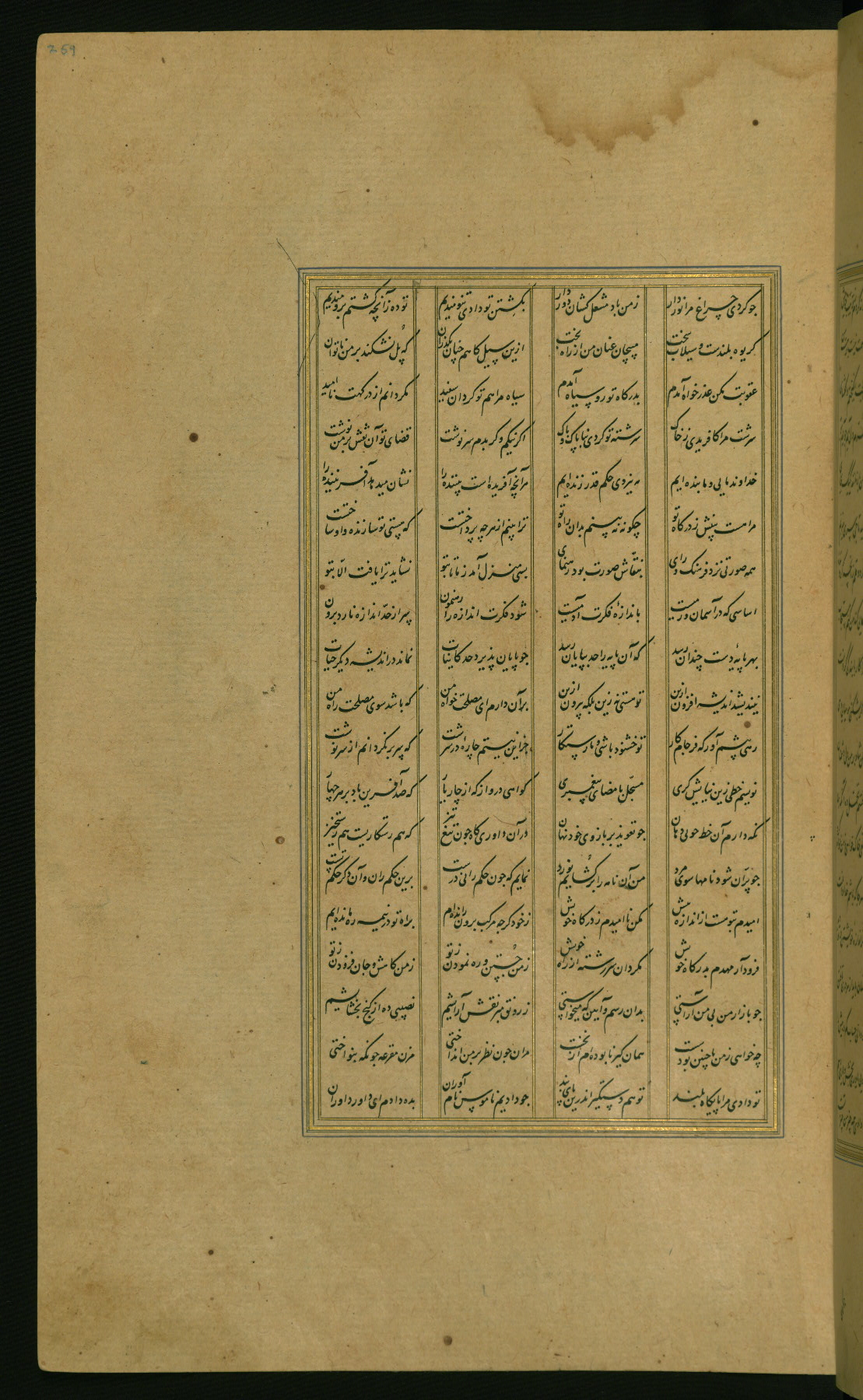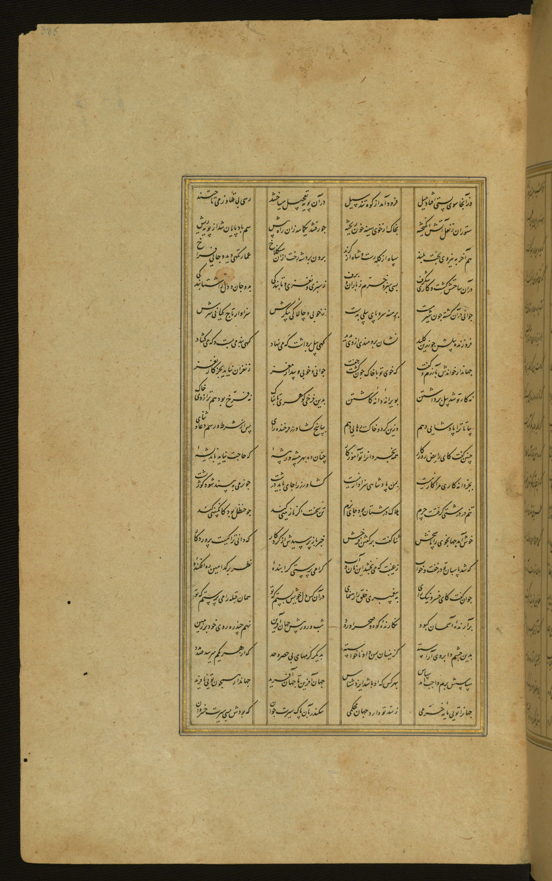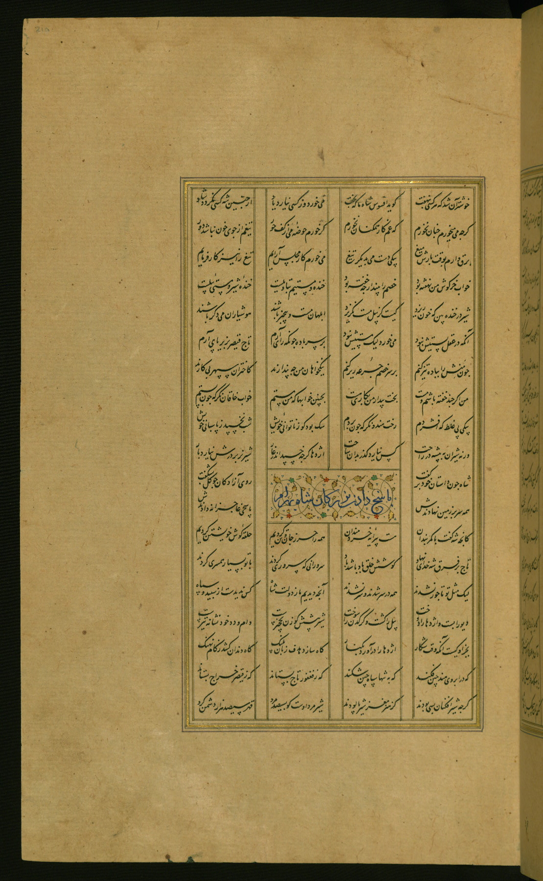This illuminated and illustrated copy of the Khamsah (quintet) of Niẓāmī Ganjavī (d. 605 AH / 1209 CE) was written by Yār Muḥammad al-Haravī in 922 AH / 1516 CE. Written in four columns in black nastaʿlīq script, this manuscript opens with a double-page illuminated frontispiece signed by ʿAbd al-Wahhāb ibn ʿAbd al-Fattāḥ ibn ʿAlī. It contains thirty-five illustrations that were repainted in India during the twelfth century AH / eighteenth CE. The seal of Muḥammad Asharf ibn Muḥammad Khātam al-Ḥusaynī, dated 1173 AH / 1759-60 CE appears on fols. 1a and 401a. It is possible that the brown leather binding with center and side panels brushed with gold is original to the manuscript but was repaired at a later stage in the codex's history.