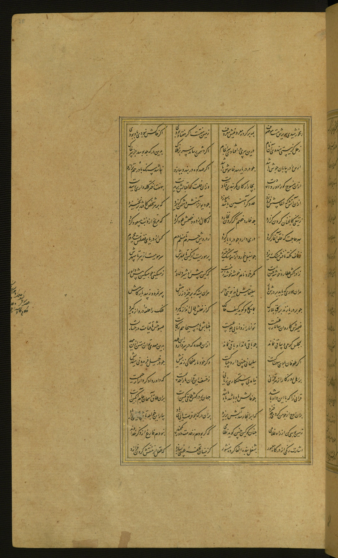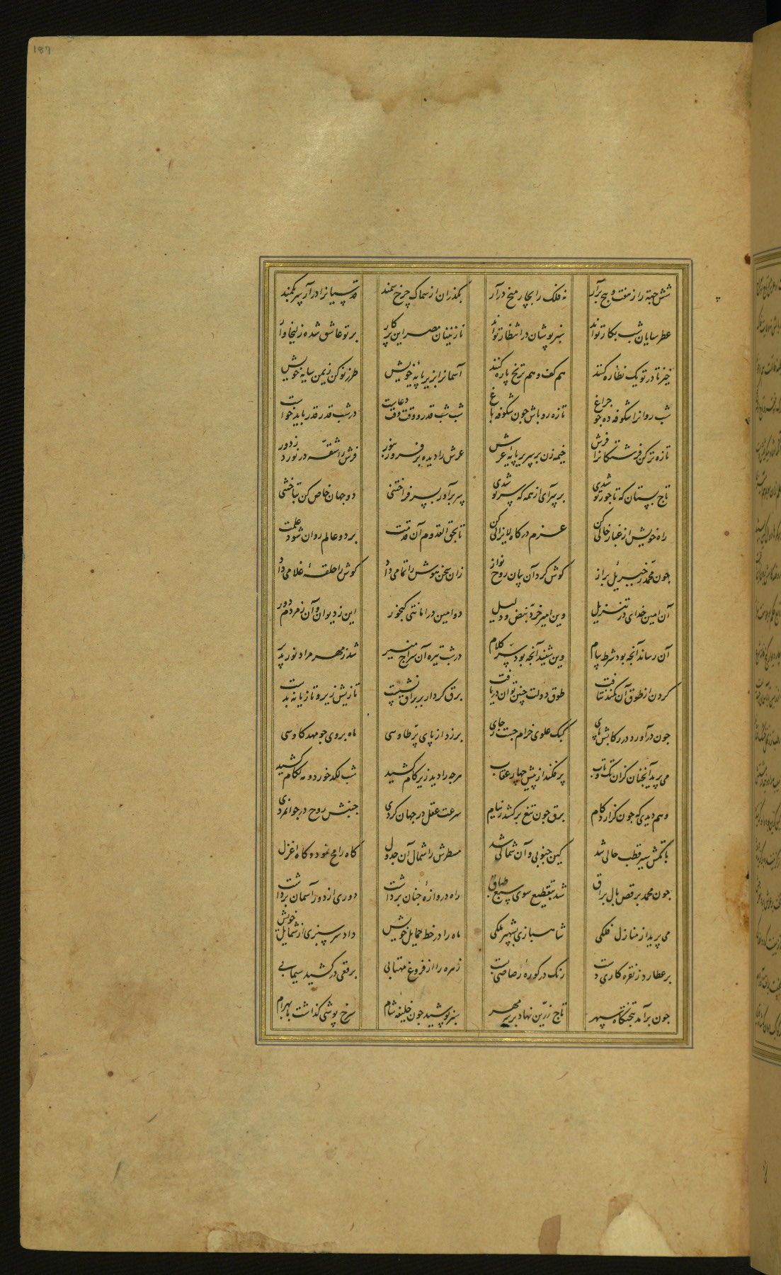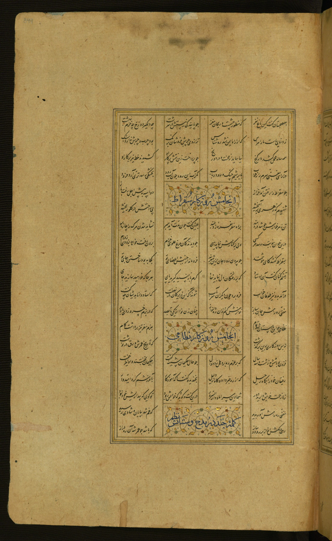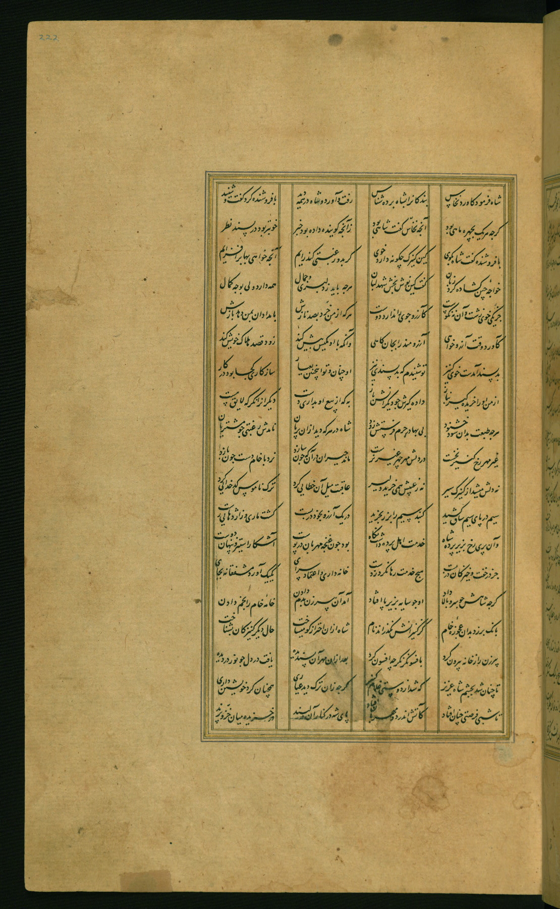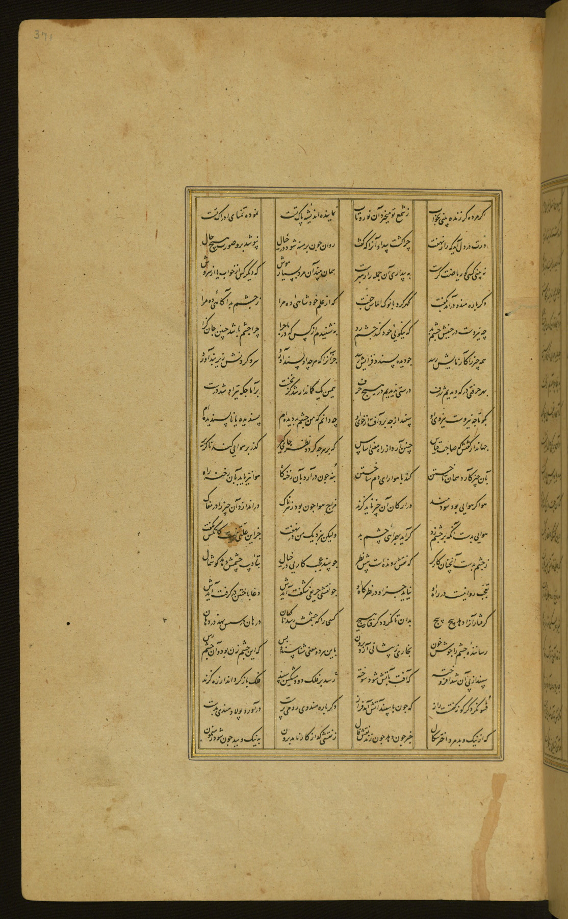 This illuminated and illustrated copy of the Khamsah (quintet) of Niẓāmī Ganjavī (d. 605 AH / 1209 CE) was written by Yār Muḥammad al-Haravī in 922 AH / 1516 CE. Written in four columns in black nastaʿlīq script, this manuscript opens with a double-page illuminated frontispiece signed by ʿAbd al-Wahhāb ibn ʿAbd al-Fattāḥ ibn ʿAlī. It contains thirty-five illustrations that were repainted in India during the twelfth century AH / eighteenth CE. The seal of Muḥammad Asharf ibn Muḥammad Khātam al-Ḥusaynī, dated 1173 AH / 1759-60 CE appears on fols. 1a and 401a. It is possible that the brown leather binding with center and side panels brushed with gold is original to the manuscript but was repaired at a later stage in the codex's history.
