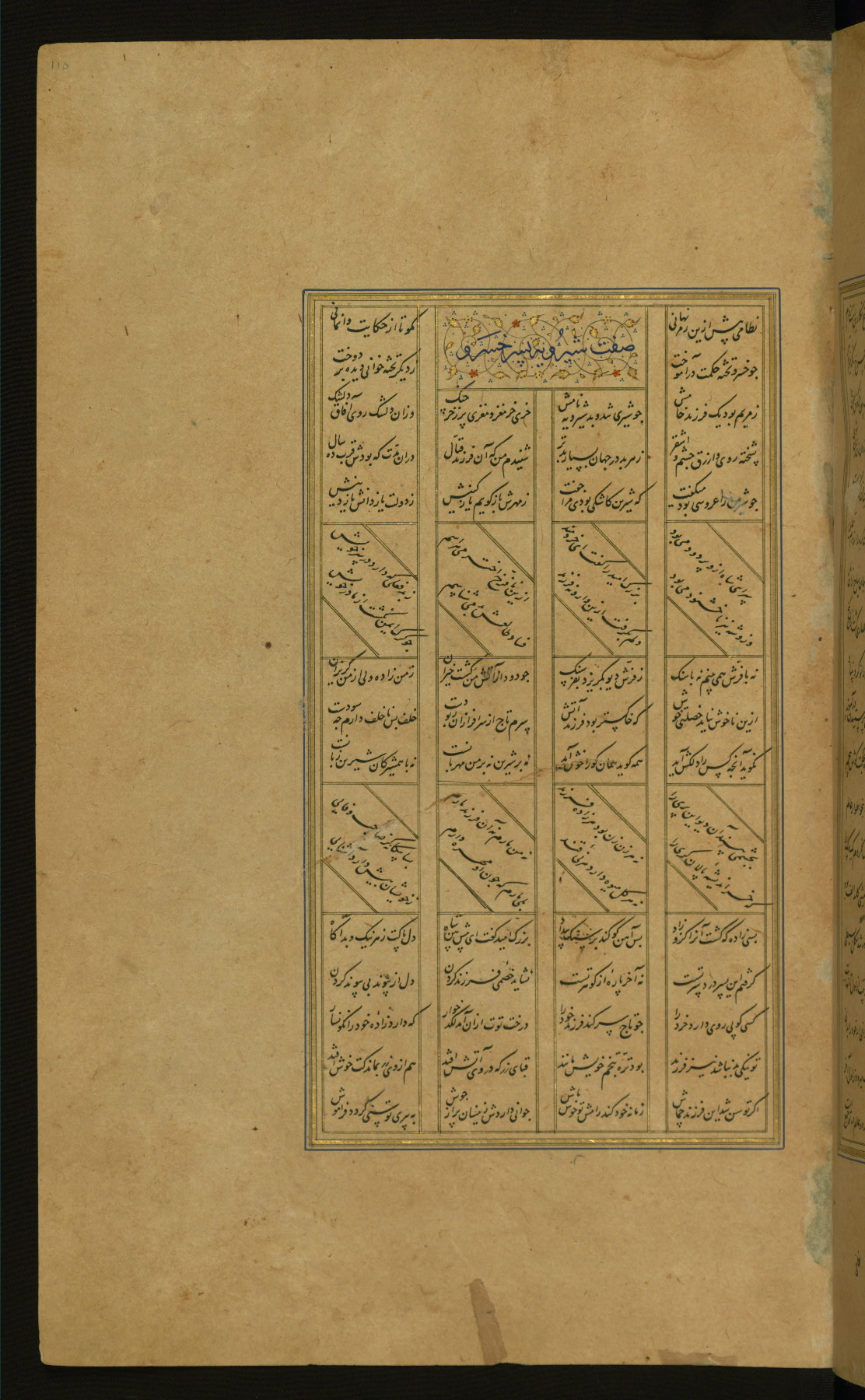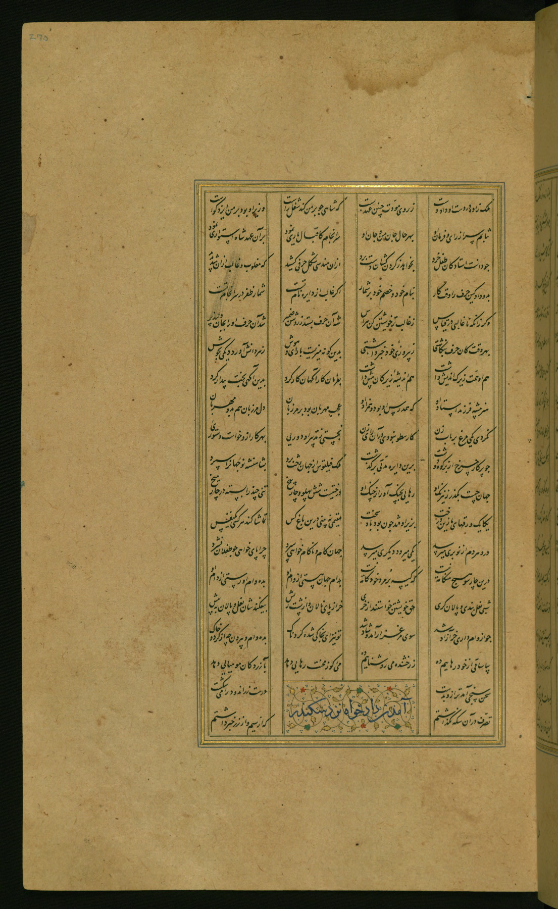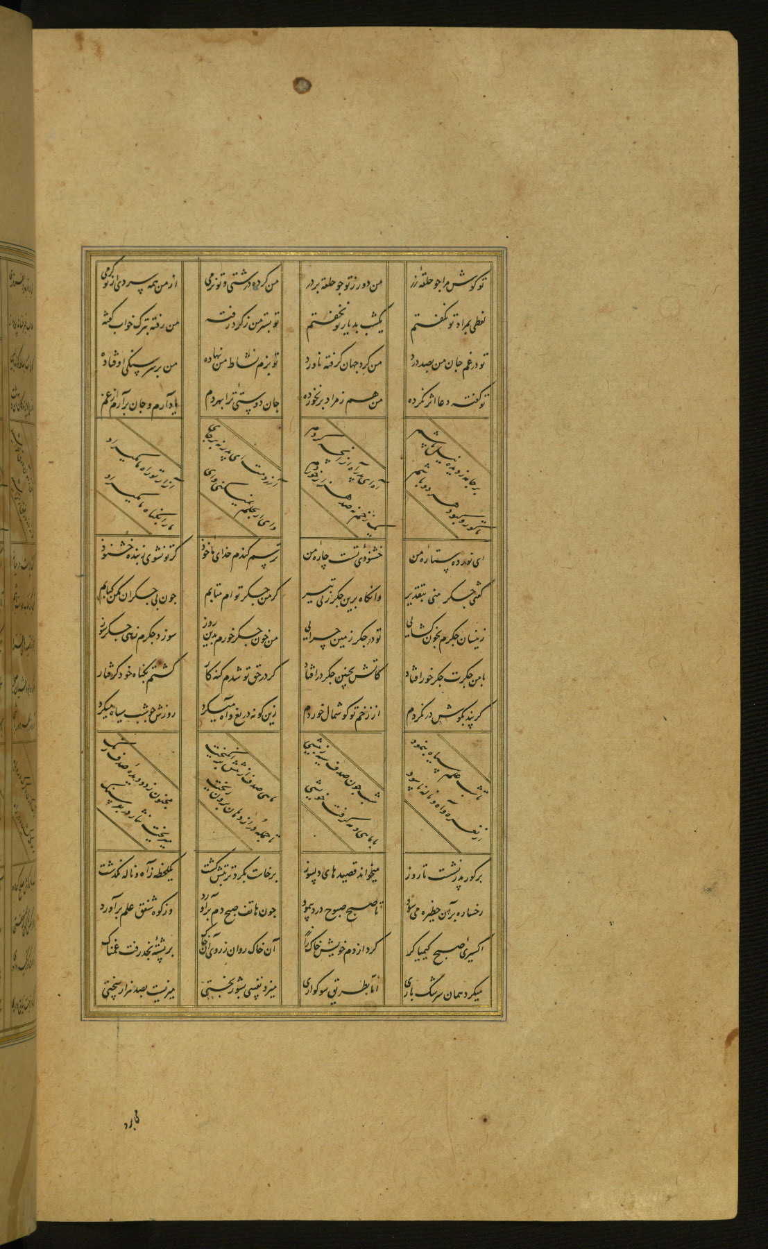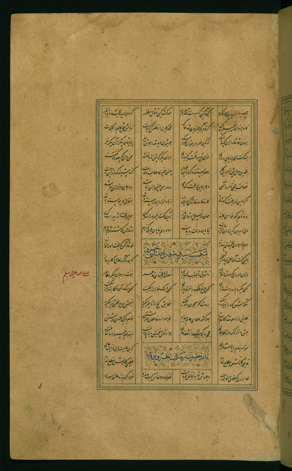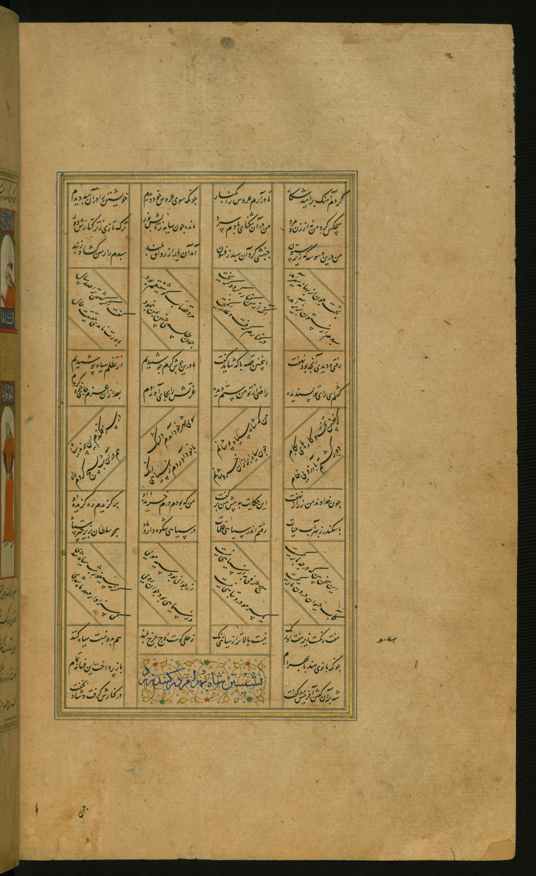 This illuminated and illustrated copy of the Khamsah (quintet) of Niẓāmī Ganjavī (d. 605 AH / 1209 CE) was written by Yār Muḥammad al-Haravī in 922 AH / 1516 CE. Written in four columns in black nastaʿlīq script, this manuscript opens with a double-page illuminated frontispiece signed by ʿAbd al-Wahhāb ibn ʿAbd al-Fattāḥ ibn ʿAlī. It contains thirty-five illustrations that were repainted in India during the twelfth century AH / eighteenth CE. The seal of Muḥammad Asharf ibn Muḥammad Khātam al-Ḥusaynī, dated 1173 AH / 1759-60 CE appears on fols. 1a and 401a. It is possible that the brown leather binding with center and side panels brushed with gold is original to the manuscript but was repaired at a later stage in the codex's history.