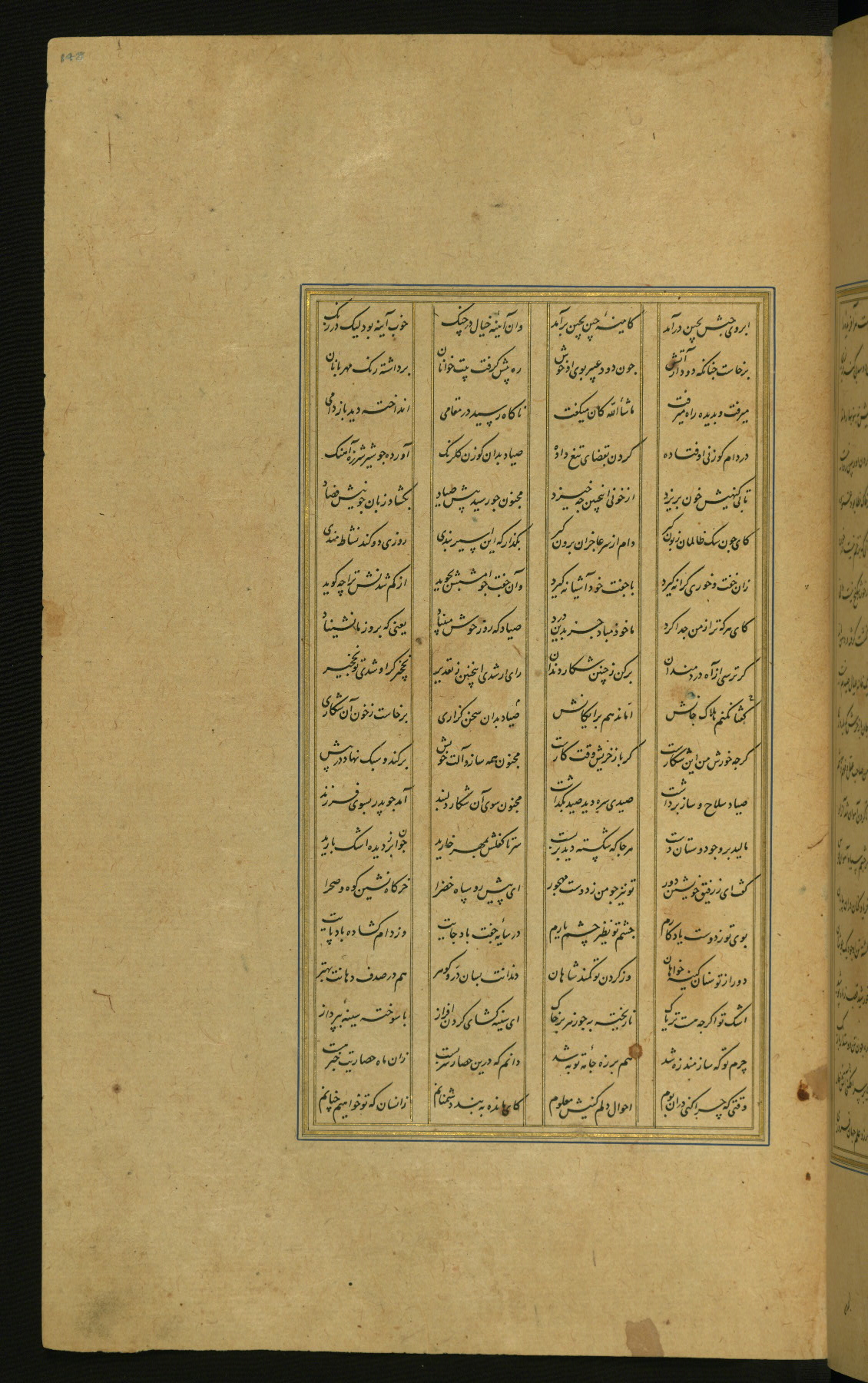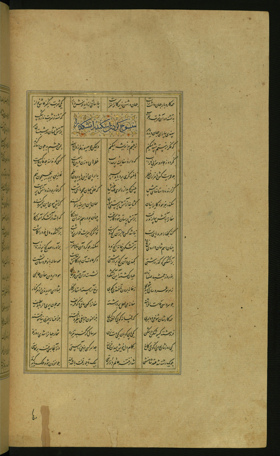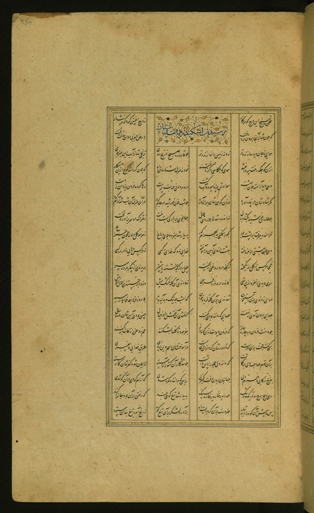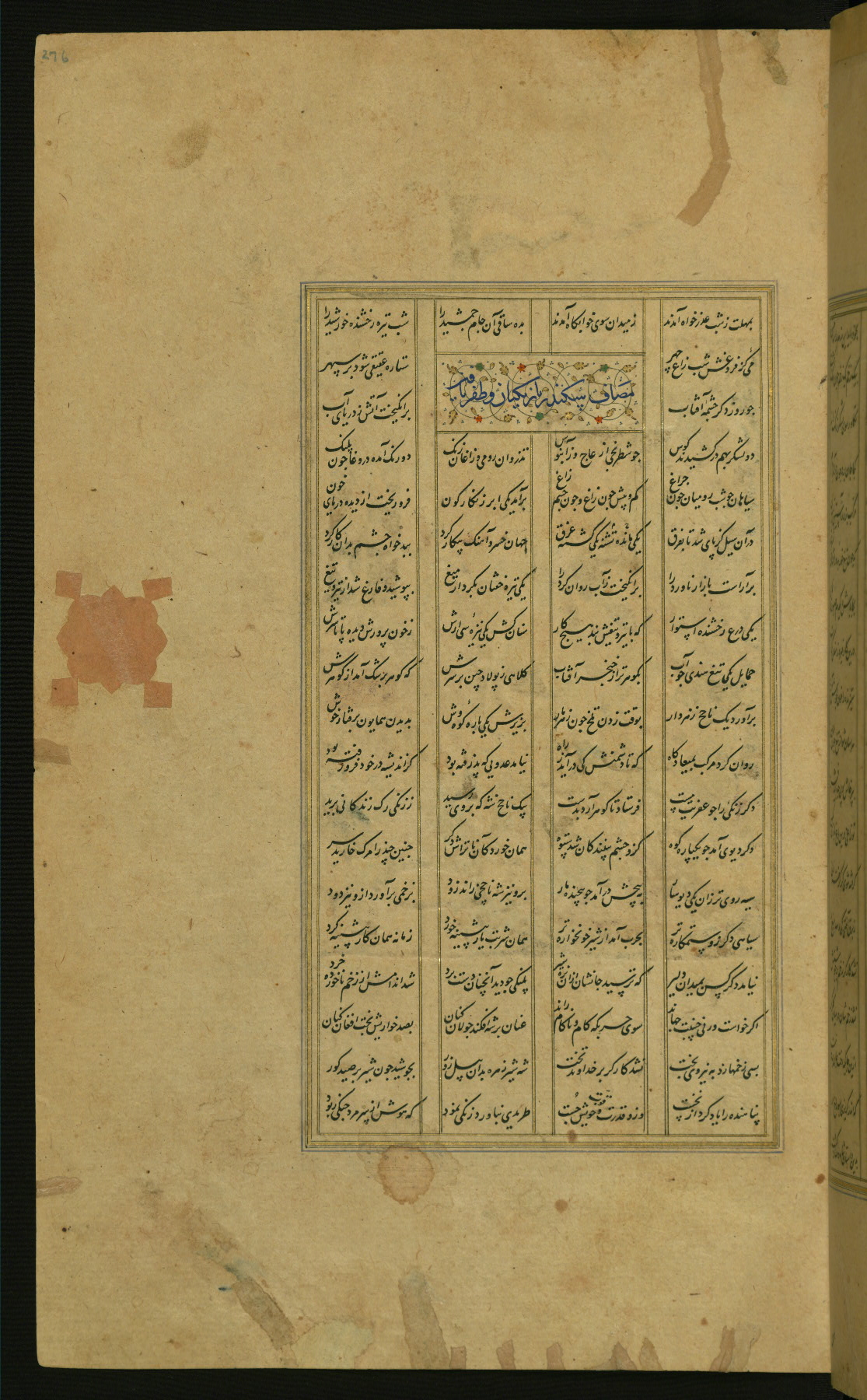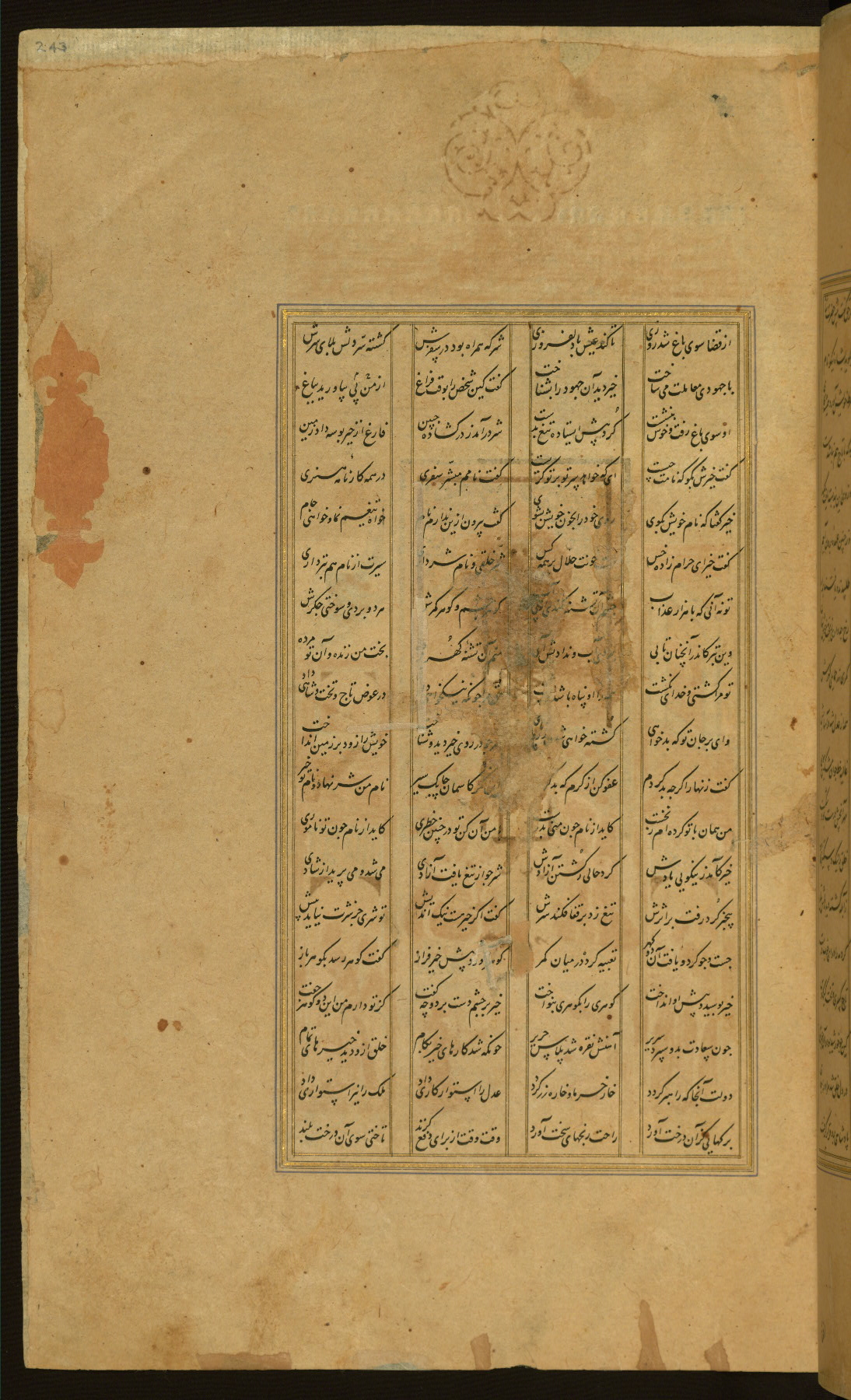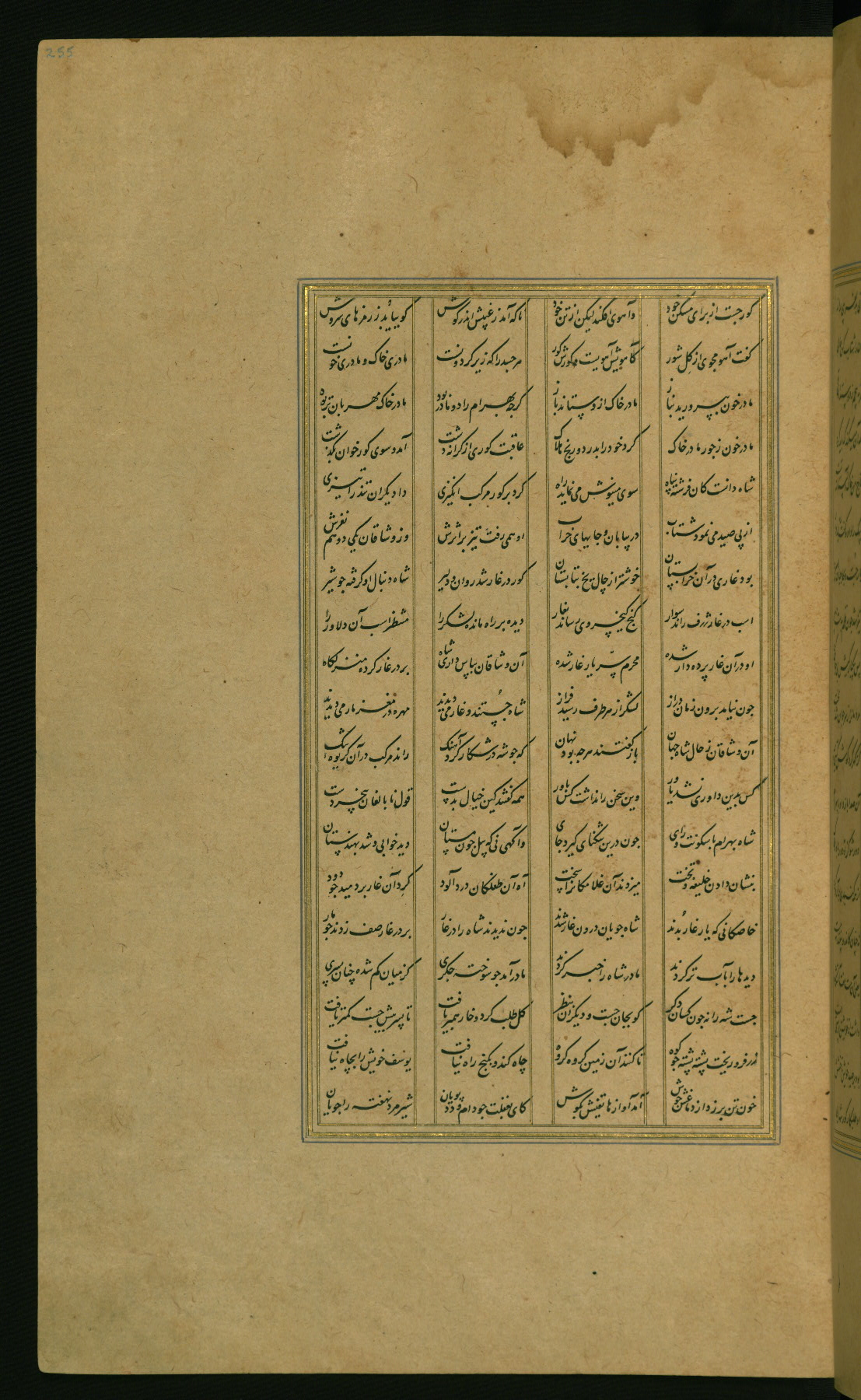 This illuminated and illustrated copy of the Khamsah (quintet) of Niẓāmī Ganjavī (d. 605 AH / 1209 CE) was written by Yār Muḥammad al-Haravī in 922 AH / 1516 CE. Written in four columns in black nastaʿlīq script, this manuscript opens with a double-page illuminated frontispiece signed by ʿAbd al-Wahhāb ibn ʿAbd al-Fattāḥ ibn ʿAlī. It contains thirty-five illustrations that were repainted in India during the twelfth century AH / eighteenth CE. The seal of Muḥammad Asharf ibn Muḥammad Khātam al-Ḥusaynī, dated 1173 AH / 1759-60 CE appears on fols. 1a and 401a. It is possible that the brown leather binding with center and side panels brushed with gold is original to the manuscript but was repaired at a later stage in the codex's history.