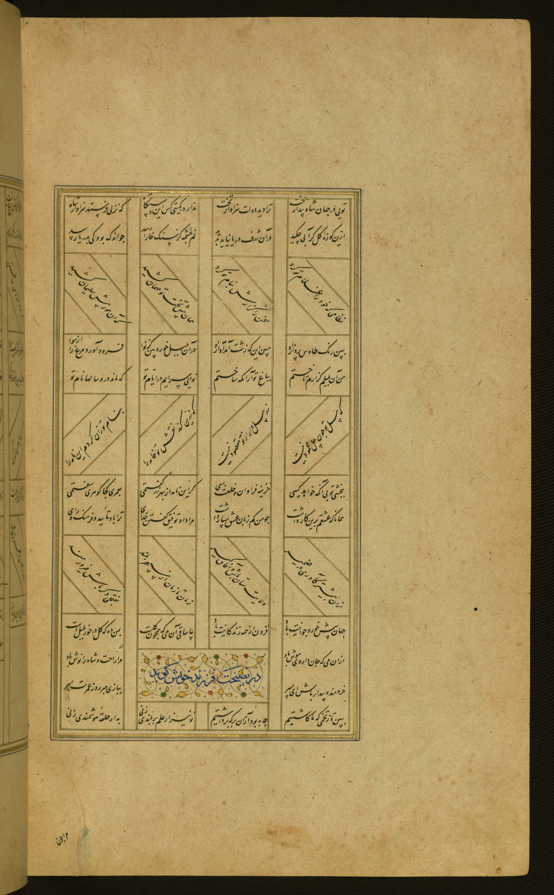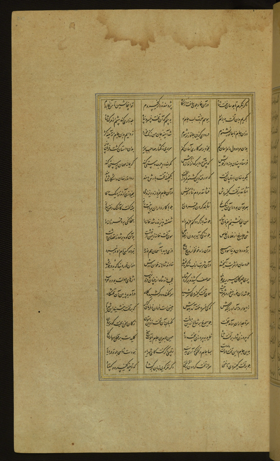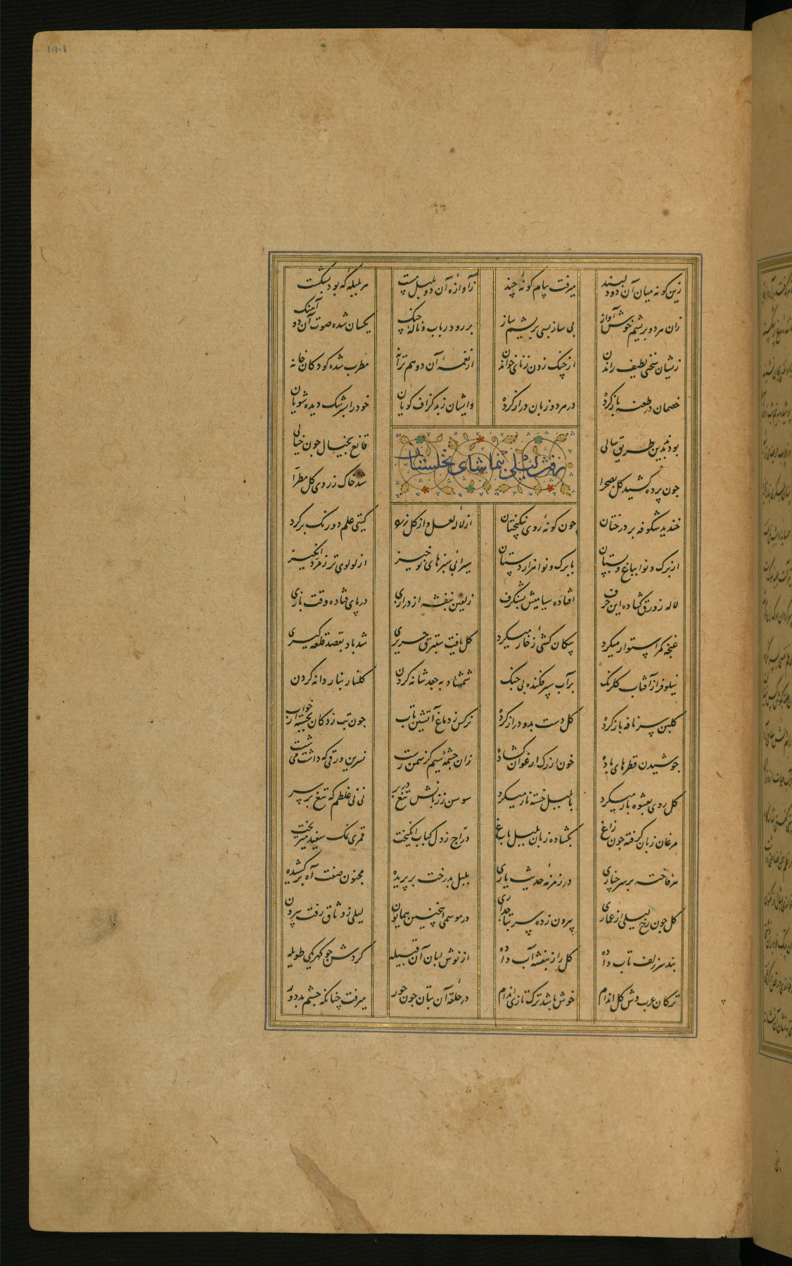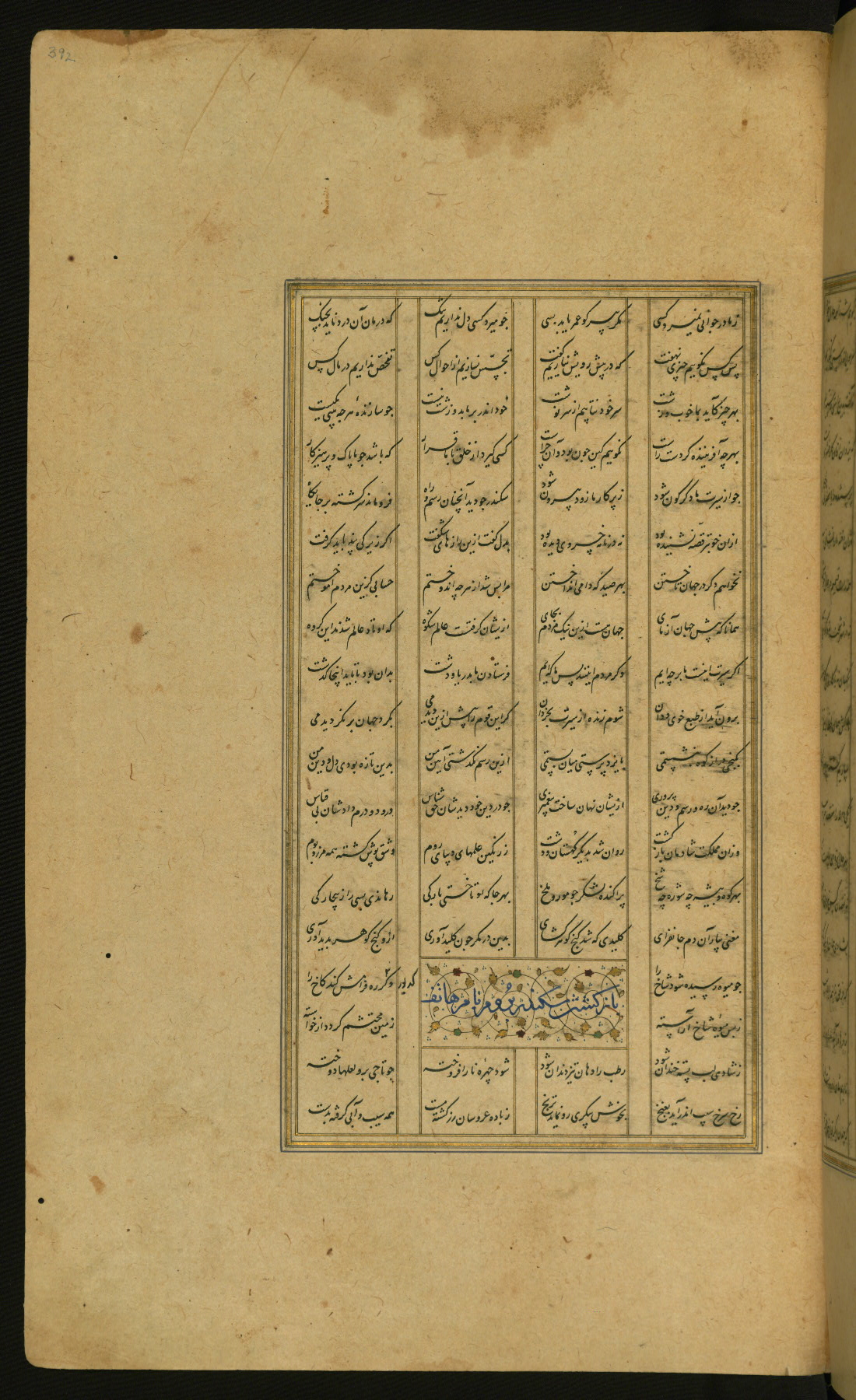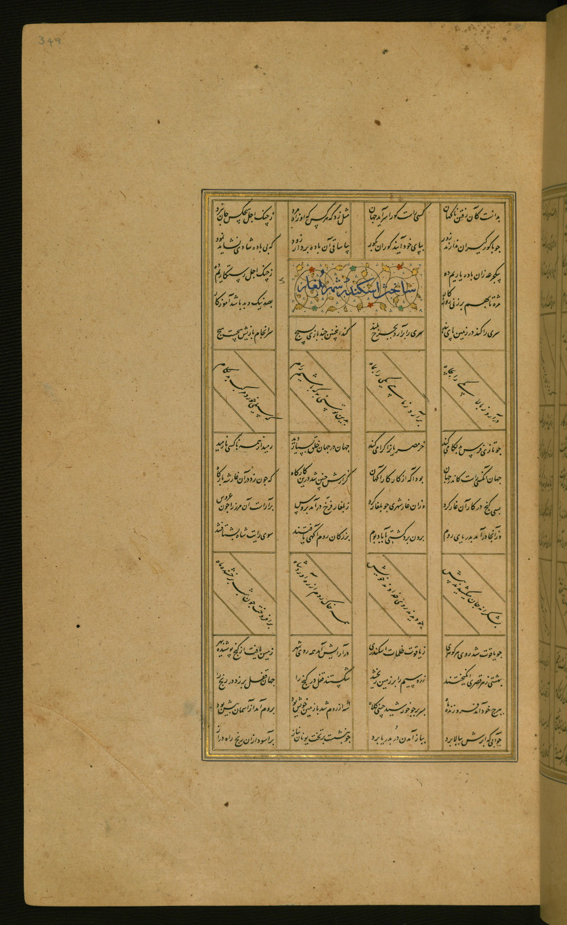 This illuminated and illustrated copy of the Khamsah (quintet) of Niẓāmī Ganjavī (d. 605 AH / 1209 CE) was written by Yār Muḥammad al-Haravī in 922 AH / 1516 CE. Written in four columns in black nastaʿlīq script, this manuscript opens with a double-page illuminated frontispiece signed by ʿAbd al-Wahhāb ibn ʿAbd al-Fattāḥ ibn ʿAlī. It contains thirty-five illustrations that were repainted in India during the twelfth century AH / eighteenth CE. The seal of Muḥammad Asharf ibn Muḥammad Khātam al-Ḥusaynī, dated 1173 AH / 1759-60 CE appears on fols. 1a and 401a. It is possible that the brown leather binding with center and side panels brushed with gold is original to the manuscript but was repaired at a later stage in the codex's history.