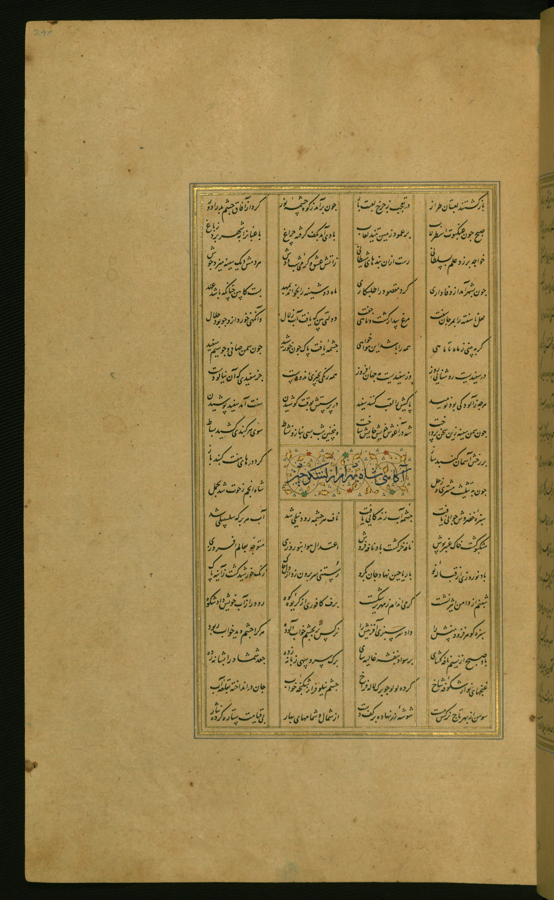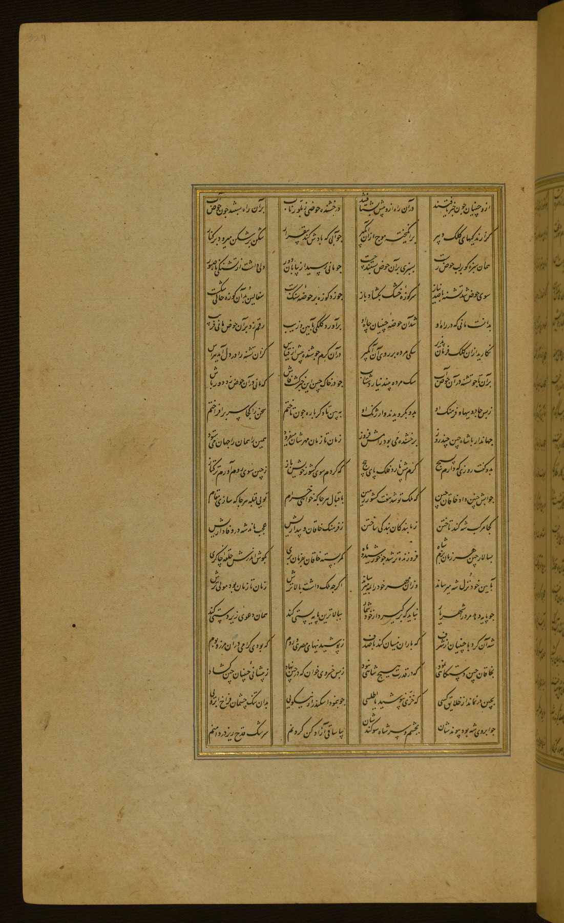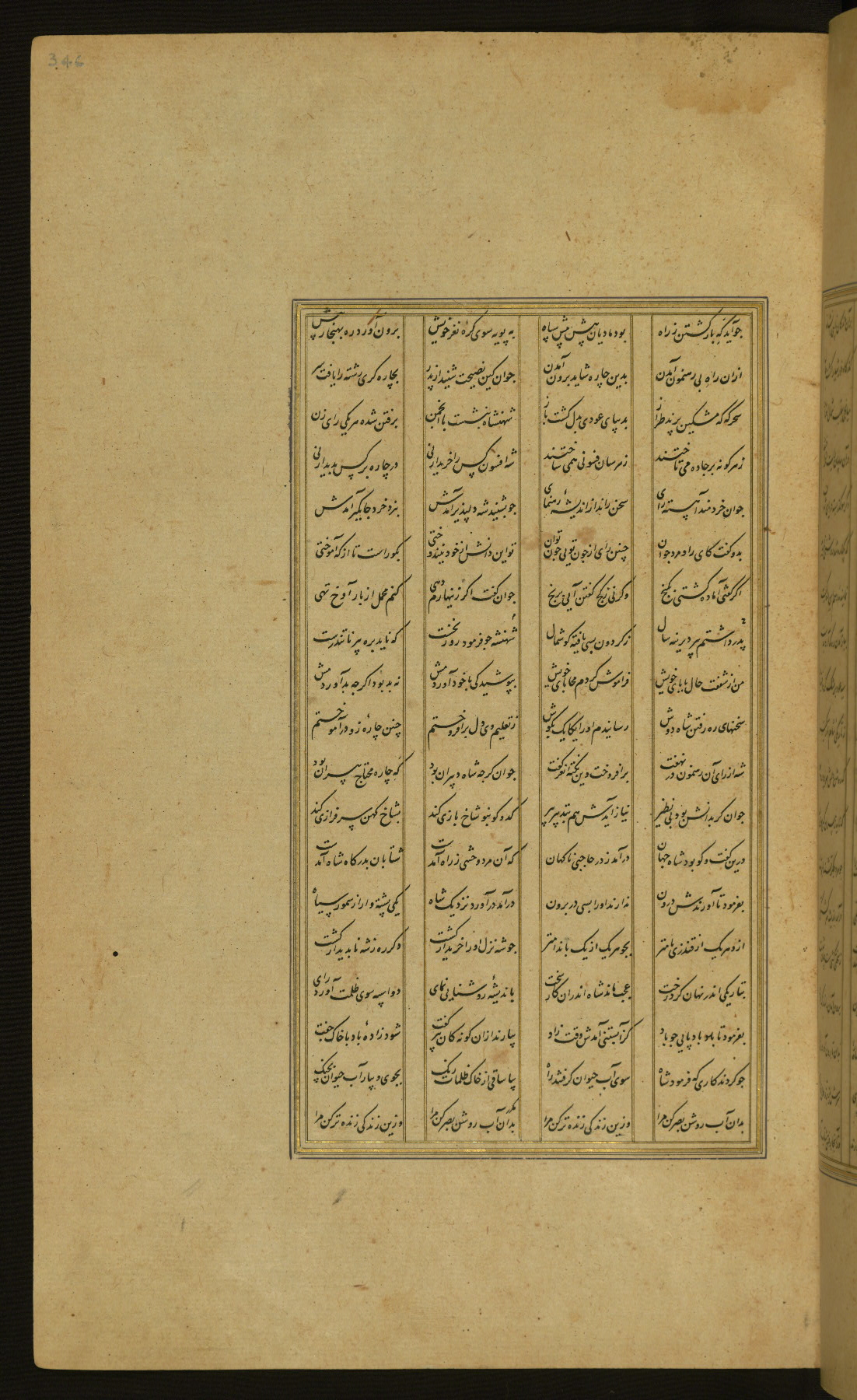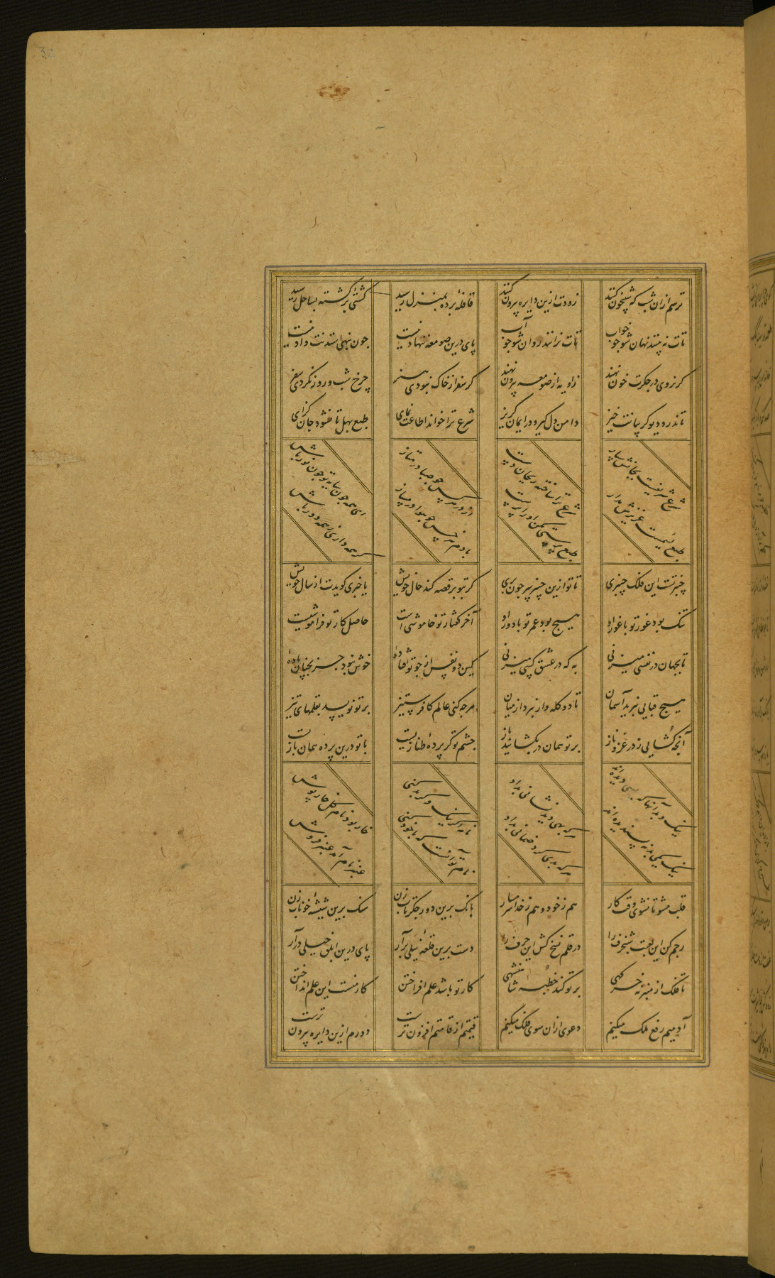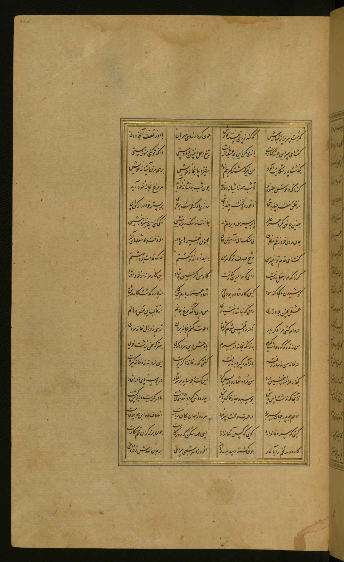This illuminated and illustrated copy of the Khamsah (quintet) of Niẓāmī Ganjavī (d. 605 AH / 1209 CE) was written by Yār Muḥammad al-Haravī in 922 AH / 1516 CE. Written in four columns in black nastaʿlīq script, this manuscript opens with a double-page illuminated frontispiece signed by ʿAbd al-Wahhāb ibn ʿAbd al-Fattāḥ ibn ʿAlī. It contains thirty-five illustrations that were repainted in India during the twelfth century AH / eighteenth CE. The seal of Muḥammad Asharf ibn Muḥammad Khātam al-Ḥusaynī, dated 1173 AH / 1759-60 CE appears on fols. 1a and 401a. It is possible that the brown leather binding with center and side panels brushed with gold is original to the manuscript but was repaired at a later stage in the codex's history.