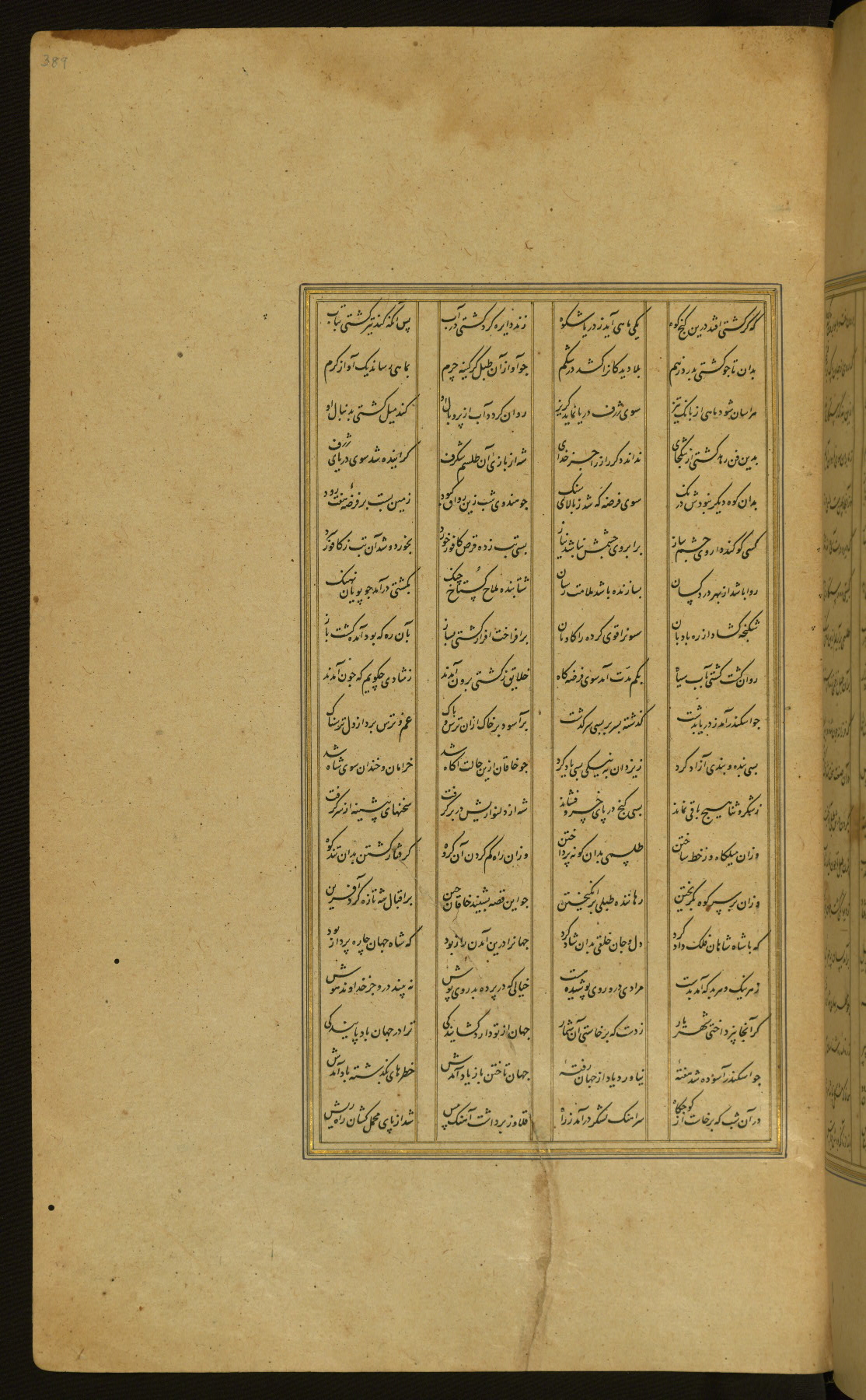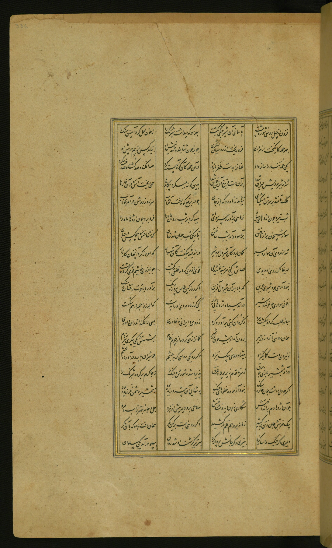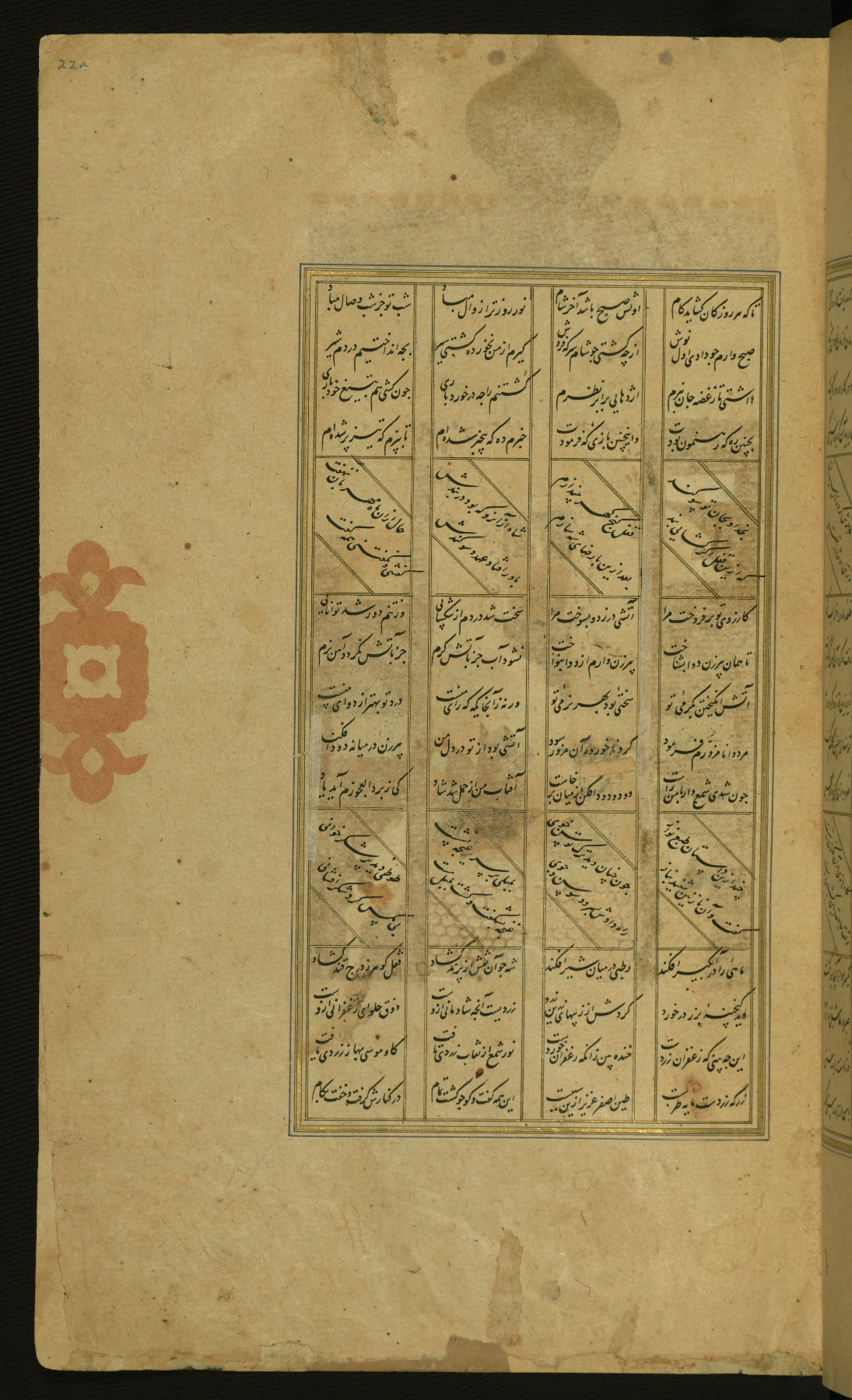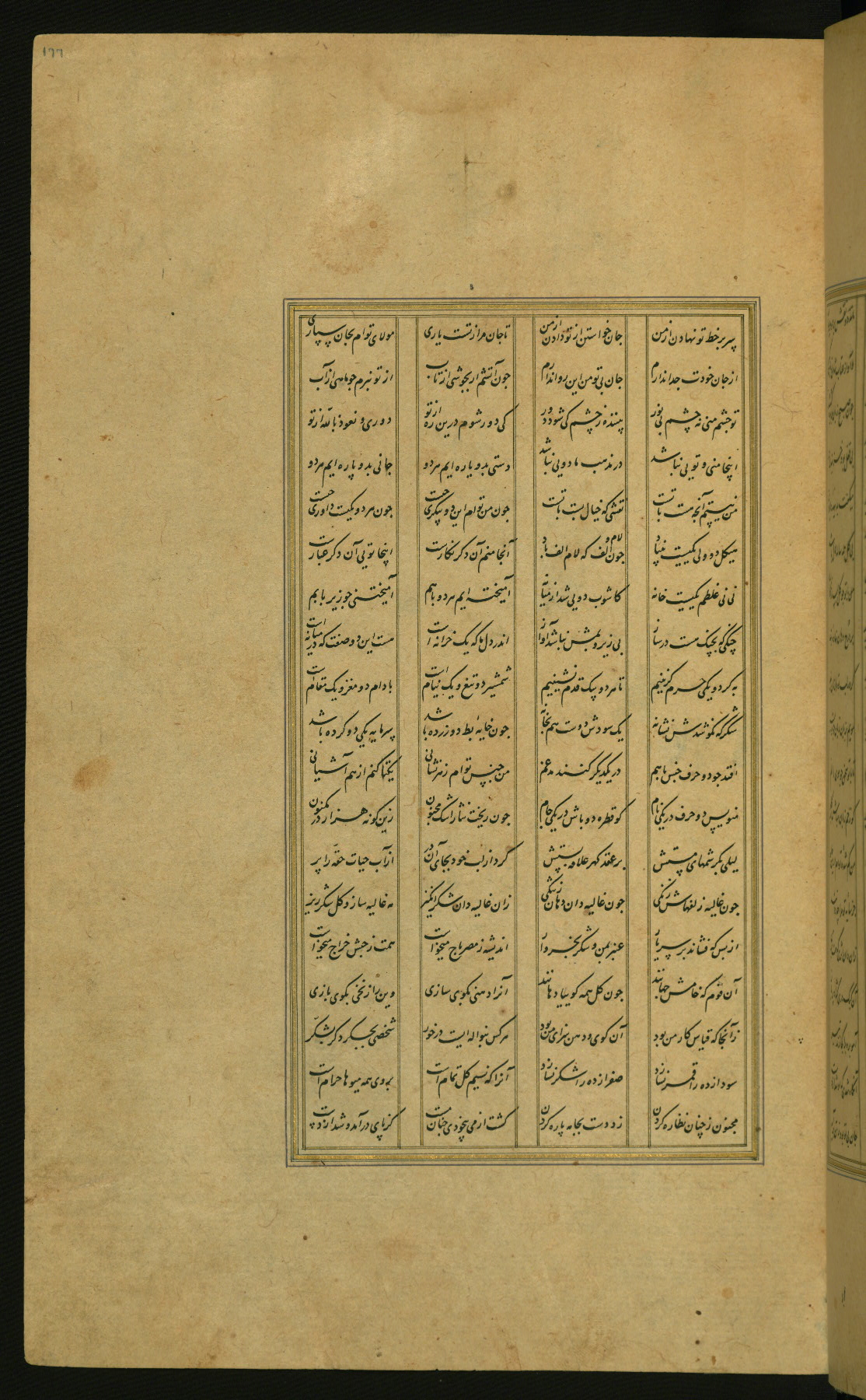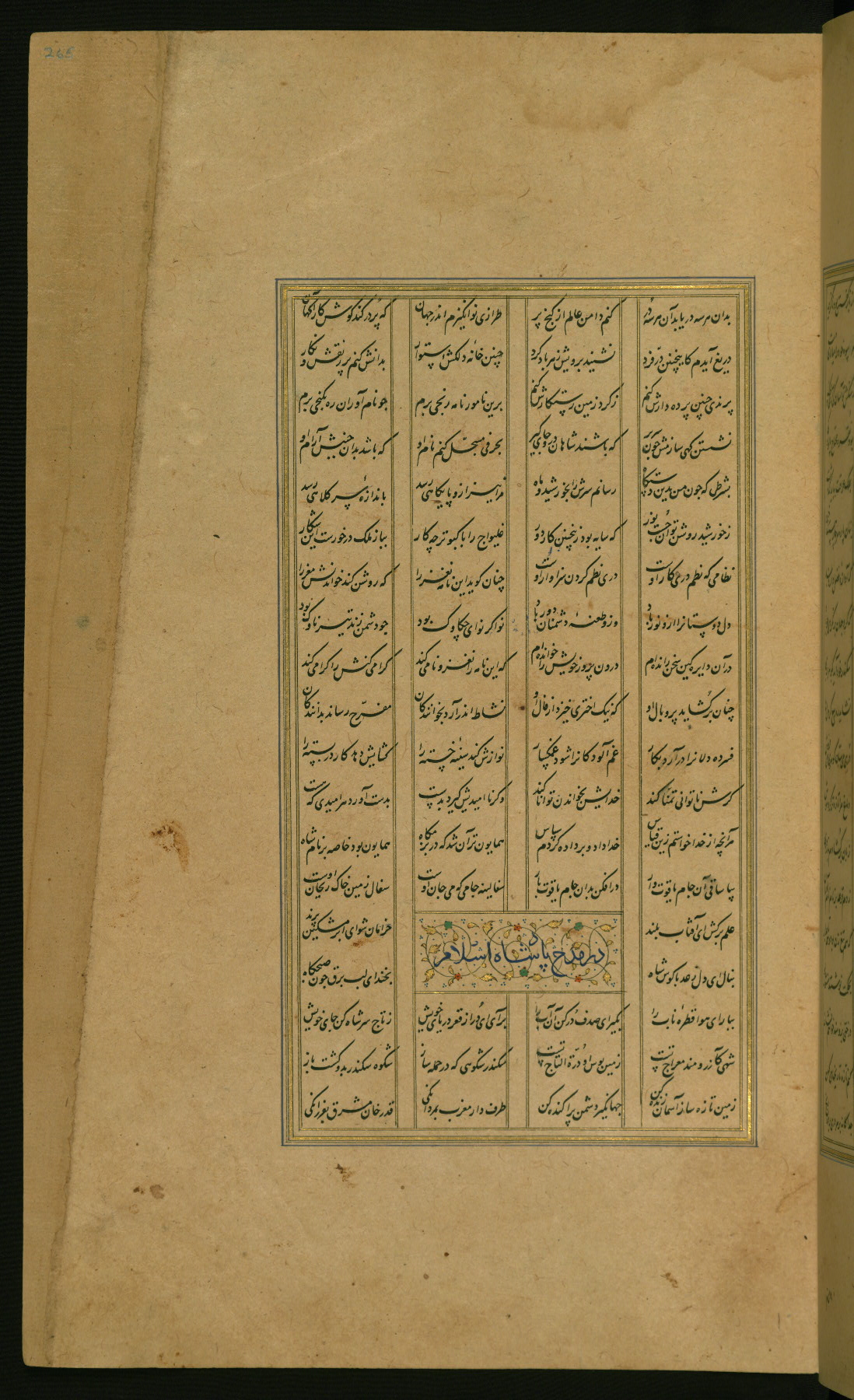 This illuminated and illustrated copy of the Khamsah (quintet) of Niẓāmī Ganjavī (d. 605 AH / 1209 CE) was written by Yār Muḥammad al-Haravī in 922 AH / 1516 CE. Written in four columns in black nastaʿlīq script, this manuscript opens with a double-page illuminated frontispiece signed by ʿAbd al-Wahhāb ibn ʿAbd al-Fattāḥ ibn ʿAlī. It contains thirty-five illustrations that were repainted in India during the twelfth century AH / eighteenth CE. The seal of Muḥammad Asharf ibn Muḥammad Khātam al-Ḥusaynī, dated 1173 AH / 1759-60 CE appears on fols. 1a and 401a. It is possible that the brown leather binding with center and side panels brushed with gold is original to the manuscript but was repaired at a later stage in the codex's history.