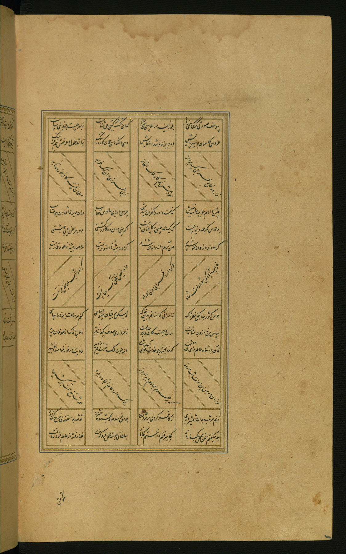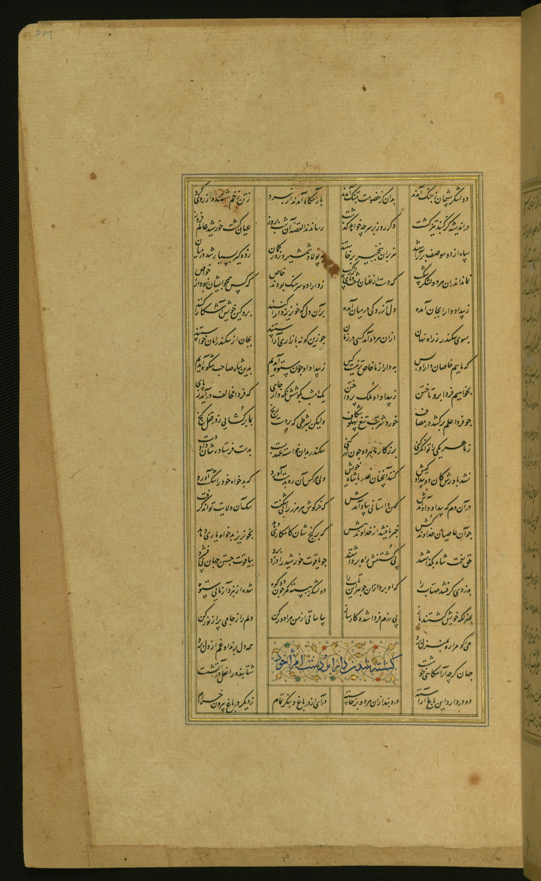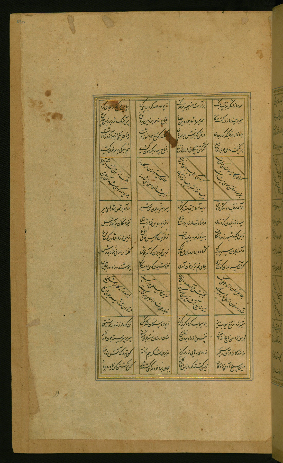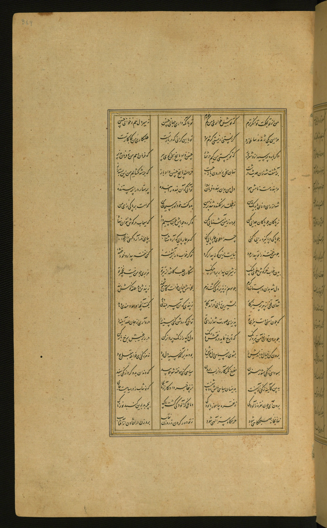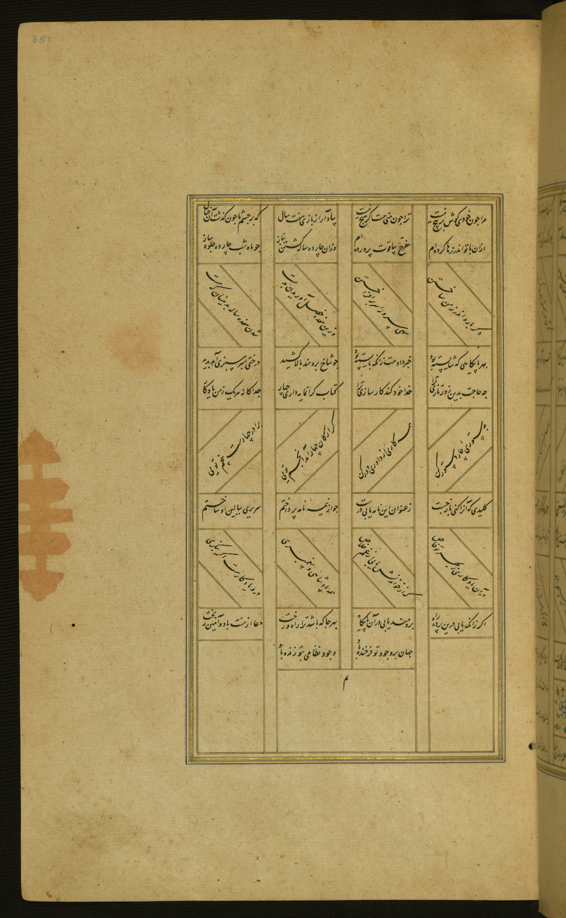 This illuminated and illustrated copy of the Khamsah (quintet) of Niẓāmī Ganjavī (d. 605 AH / 1209 CE) was written by Yār Muḥammad al-Haravī in 922 AH / 1516 CE. Written in four columns in black nastaʿlīq script, this manuscript opens with a double-page illuminated frontispiece signed by ʿAbd al-Wahhāb ibn ʿAbd al-Fattāḥ ibn ʿAlī. It contains thirty-five illustrations that were repainted in India during the twelfth century AH / eighteenth CE. The seal of Muḥammad Asharf ibn Muḥammad Khātam al-Ḥusaynī, dated 1173 AH / 1759-60 CE appears on fols. 1a and 401a. It is possible that the brown leather binding with center and side panels brushed with gold is original to the manuscript but was repaired at a later stage in the codex's history.