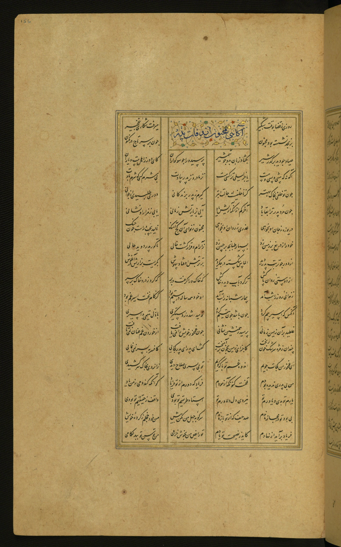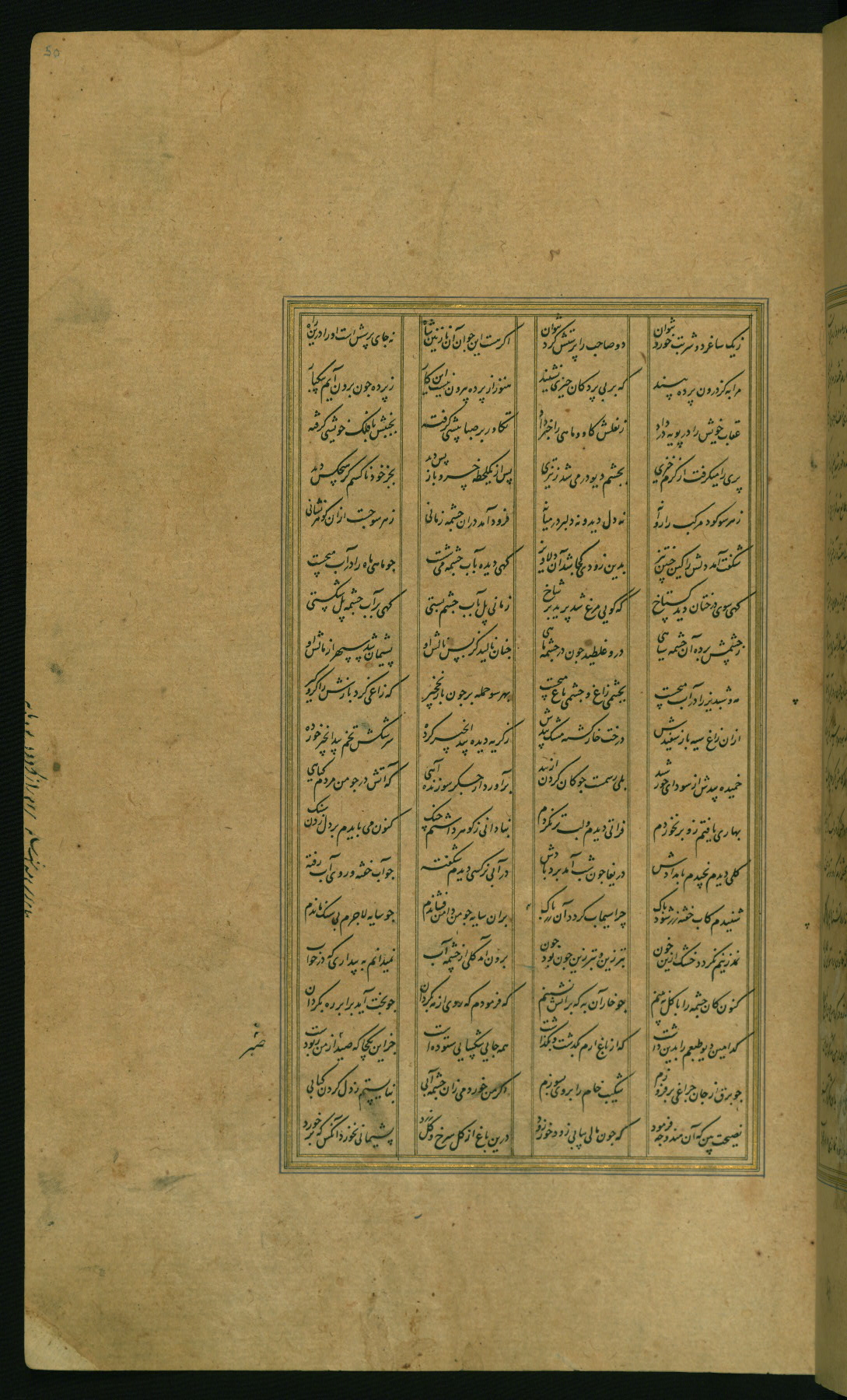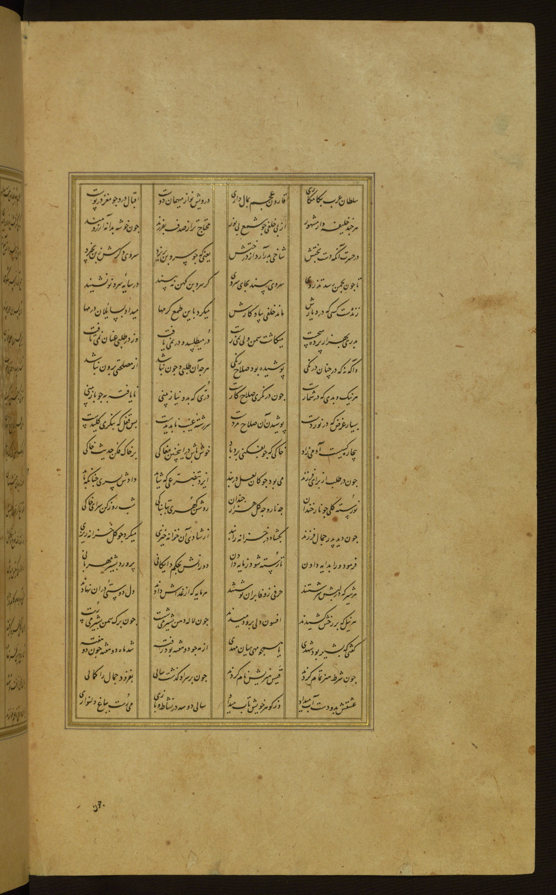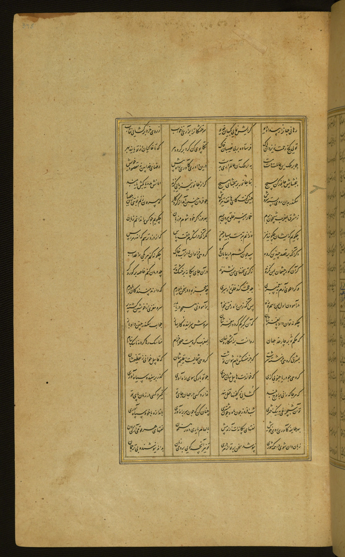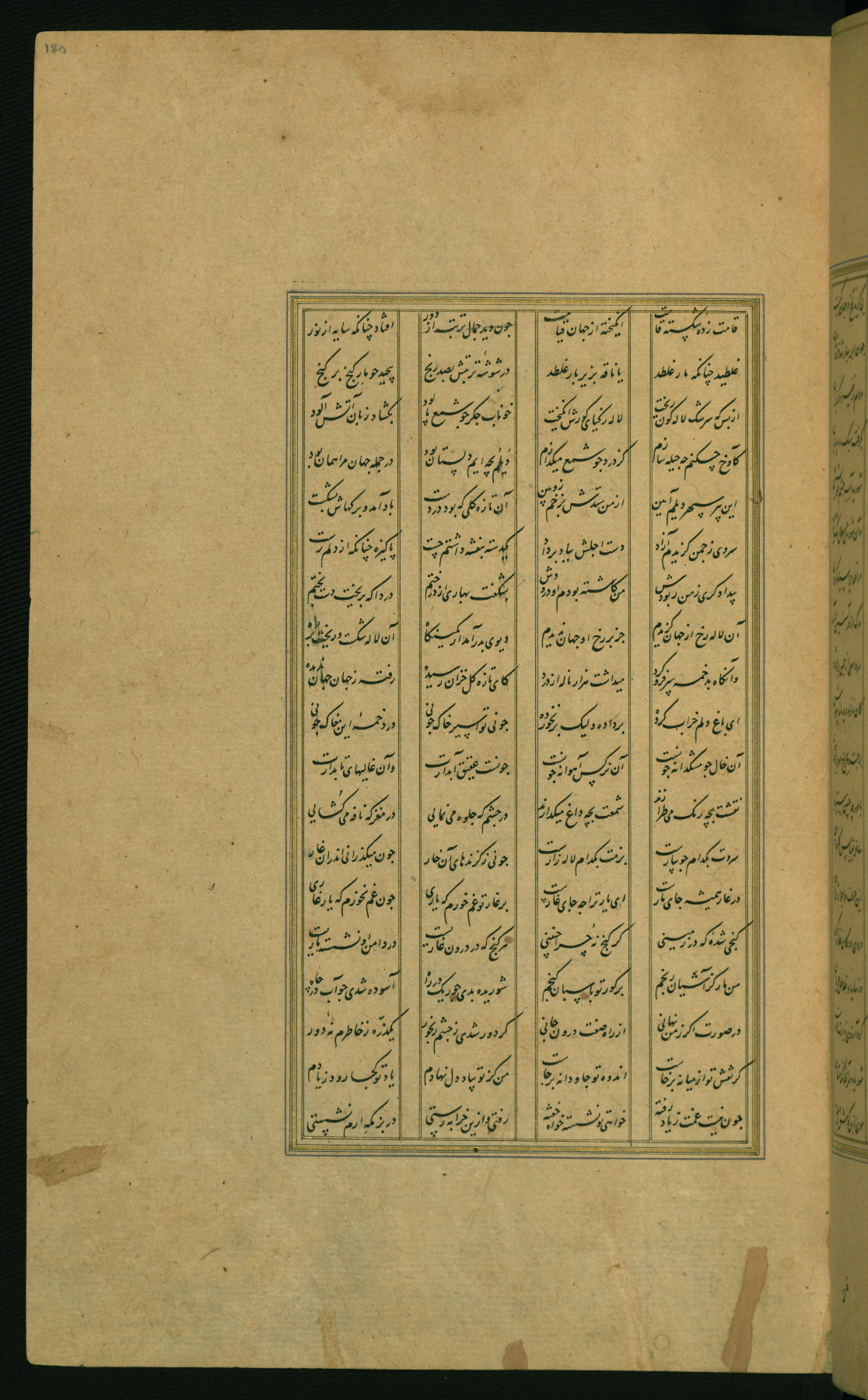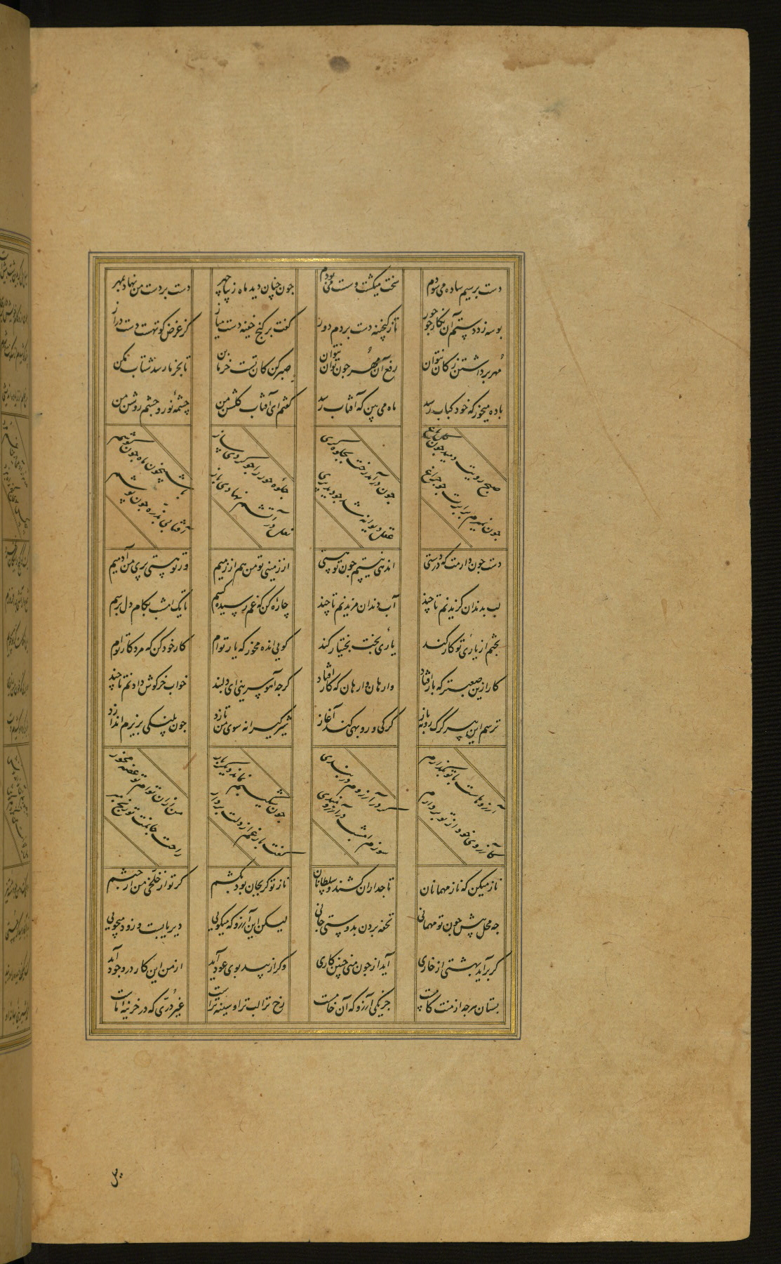 This illuminated and illustrated copy of the Khamsah (quintet) of Niẓāmī Ganjavī (d. 605 AH / 1209 CE) was written by Yār Muḥammad al-Haravī in 922 AH / 1516 CE. Written in four columns in black nastaʿlīq script, this manuscript opens with a double-page illuminated frontispiece signed by ʿAbd al-Wahhāb ibn ʿAbd al-Fattāḥ ibn ʿAlī. It contains thirty-five illustrations that were repainted in India during the twelfth century AH / eighteenth CE. The seal of Muḥammad Asharf ibn Muḥammad Khātam al-Ḥusaynī, dated 1173 AH / 1759-60 CE appears on fols. 1a and 401a. It is possible that the brown leather binding with center and side panels brushed with gold is original to the manuscript but was repaired at a later stage in the codex's history.