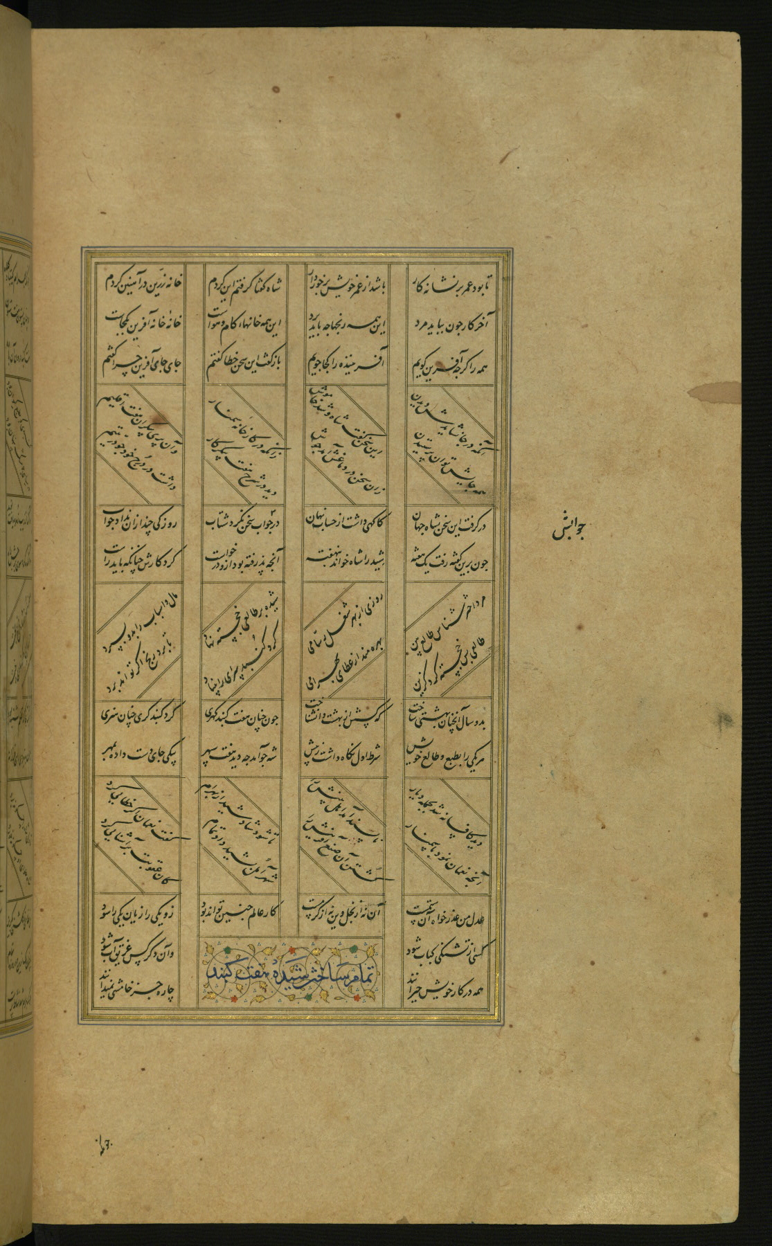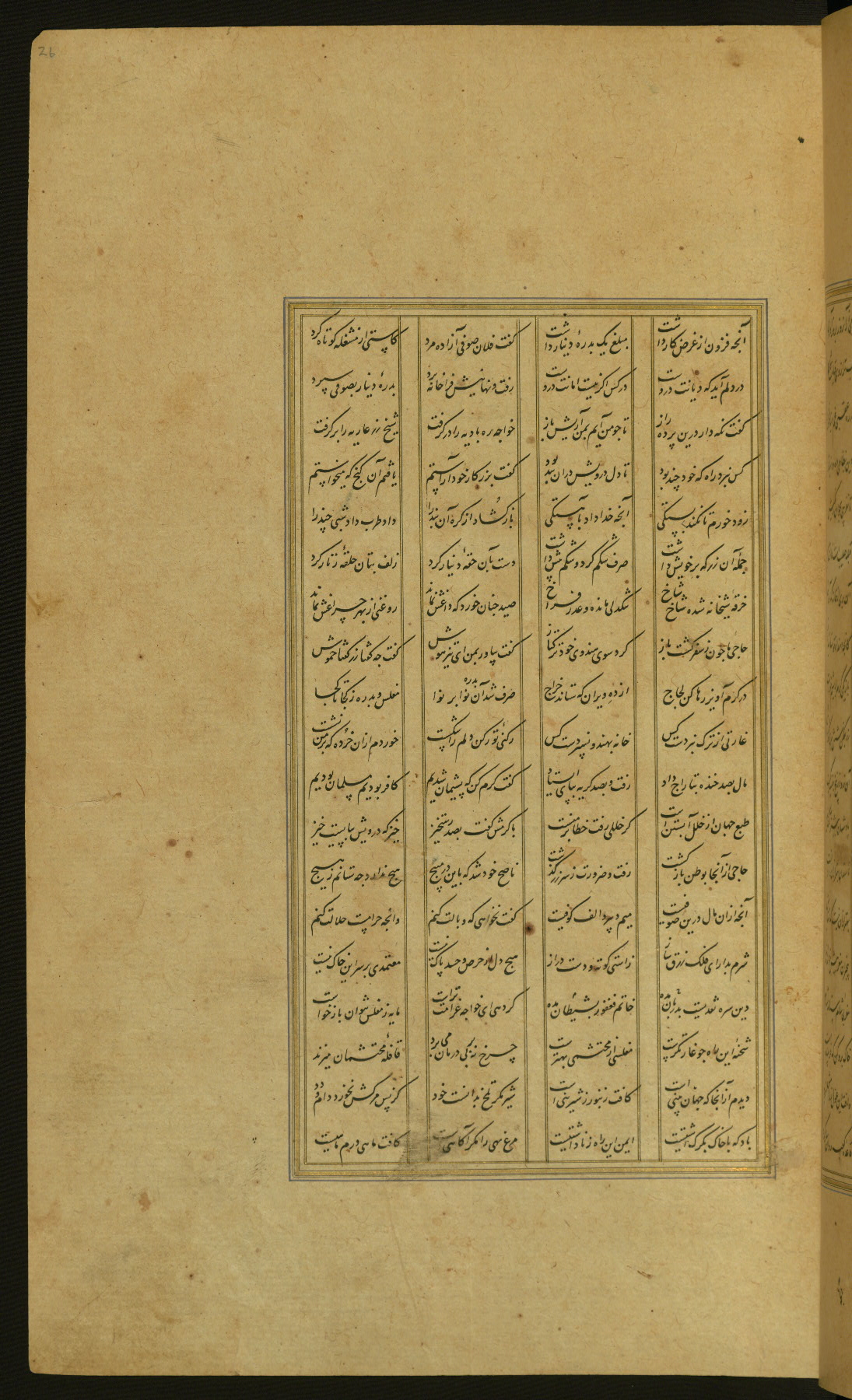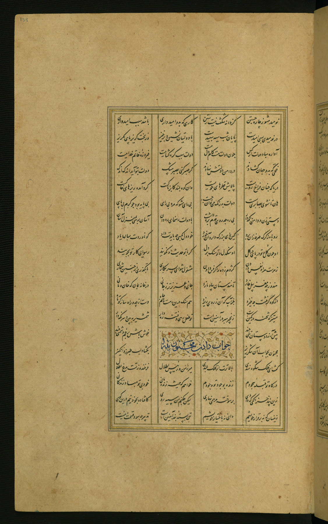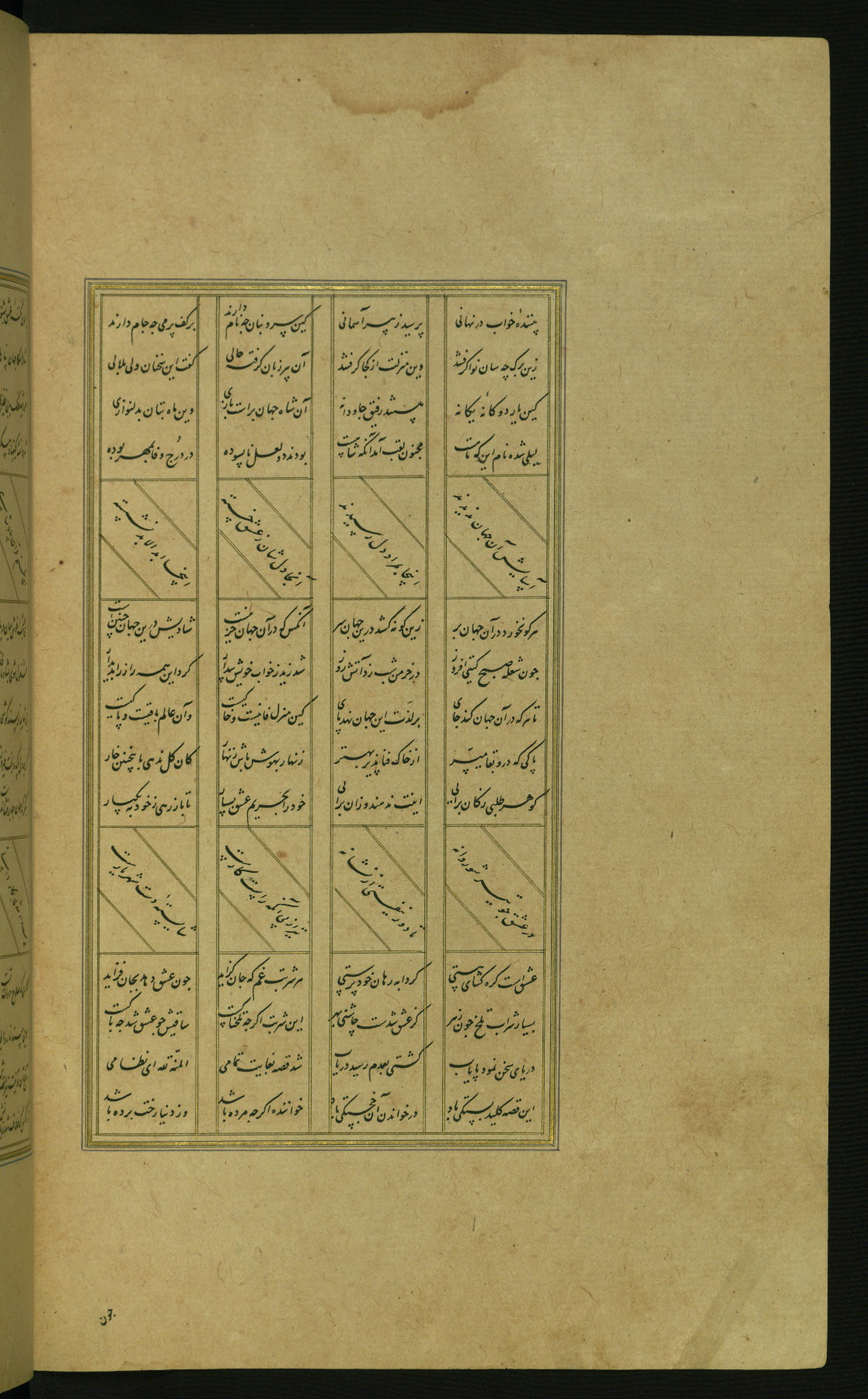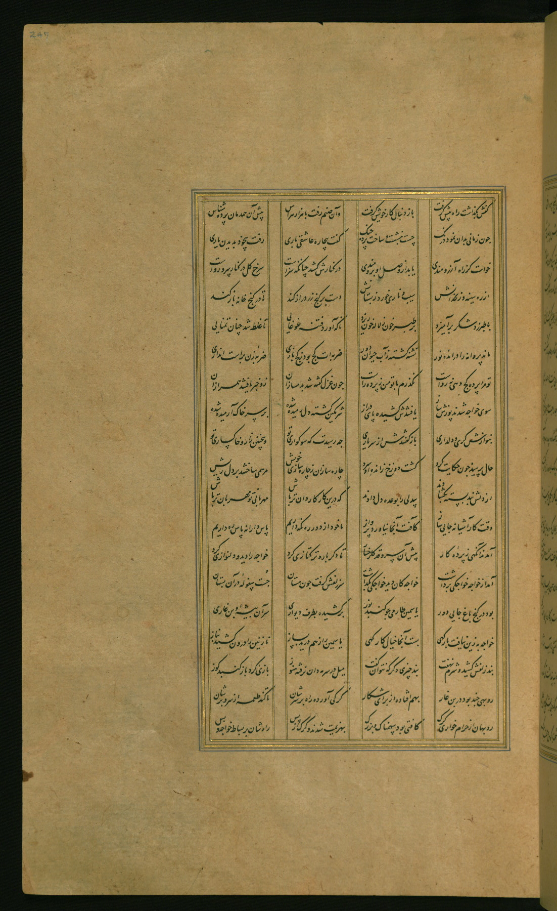 This illuminated and illustrated copy of the Khamsah (quintet) of Niẓāmī Ganjavī (d. 605 AH / 1209 CE) was written by Yār Muḥammad al-Haravī in 922 AH / 1516 CE. Written in four columns in black nastaʿlīq script, this manuscript opens with a double-page illuminated frontispiece signed by ʿAbd al-Wahhāb ibn ʿAbd al-Fattāḥ ibn ʿAlī. It contains thirty-five illustrations that were repainted in India during the twelfth century AH / eighteenth CE. The seal of Muḥammad Asharf ibn Muḥammad Khātam al-Ḥusaynī, dated 1173 AH / 1759-60 CE appears on fols. 1a and 401a. It is possible that the brown leather binding with center and side panels brushed with gold is original to the manuscript but was repaired at a later stage in the codex's history.
