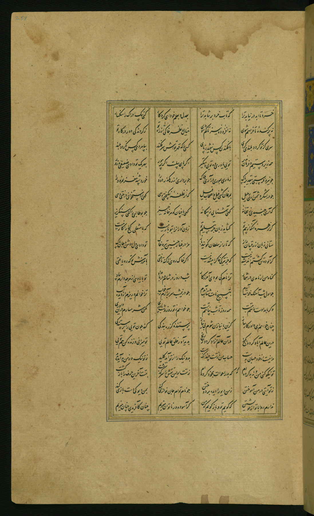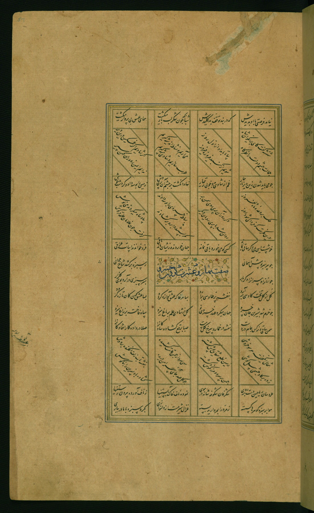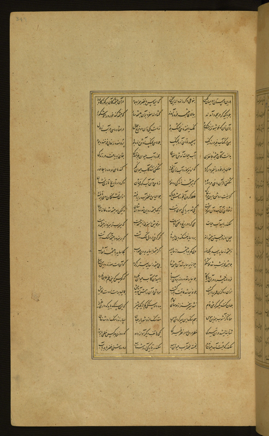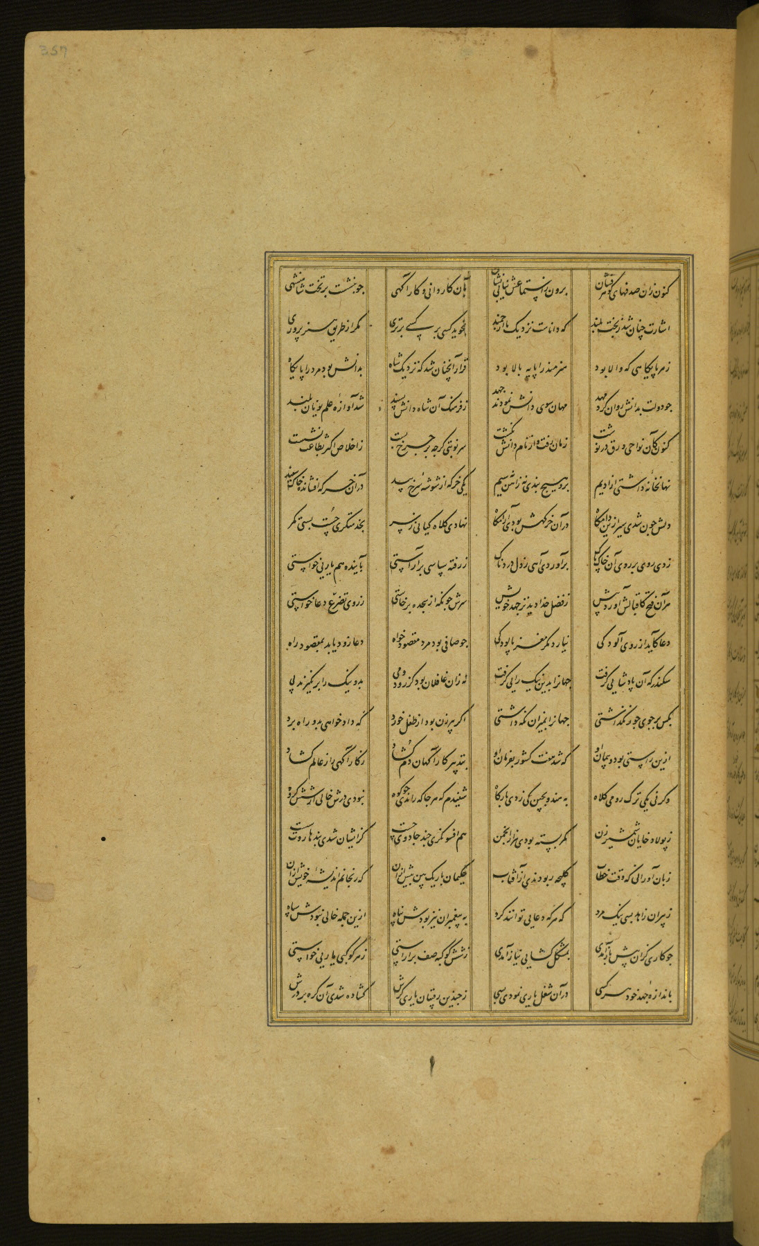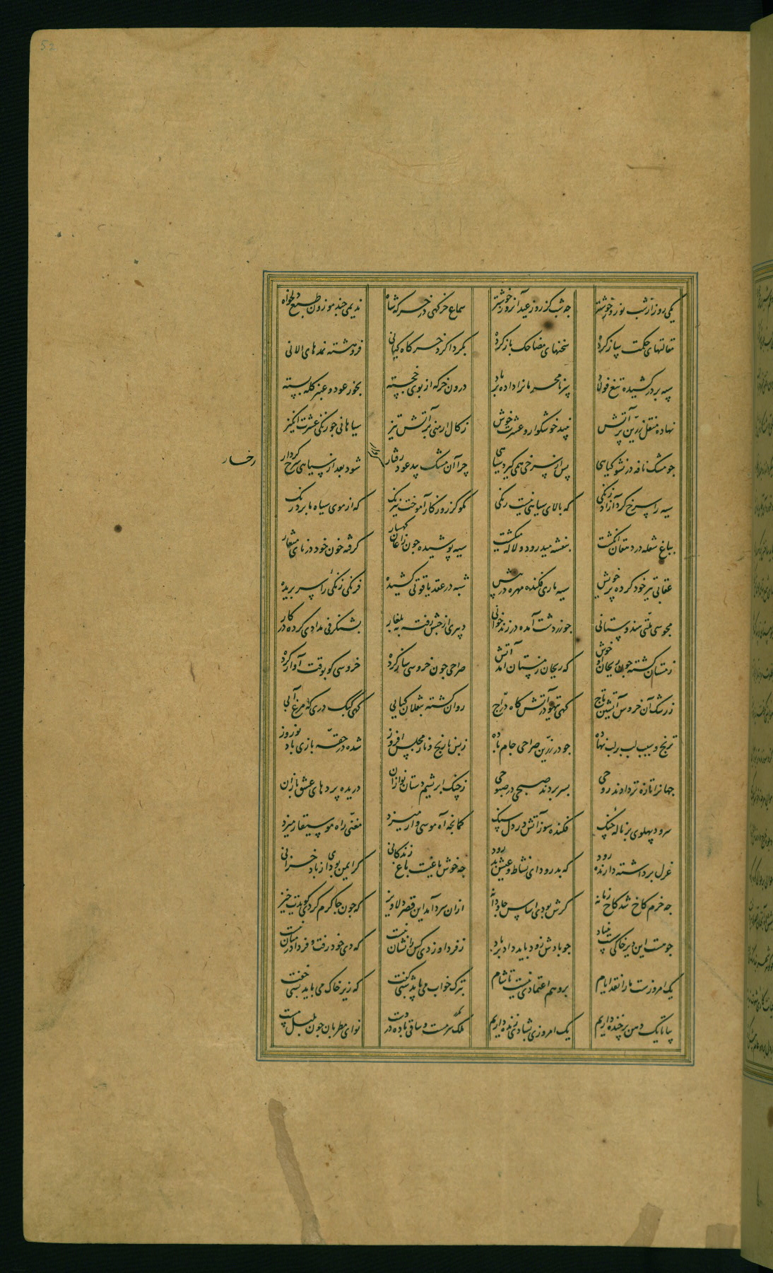 This illuminated and illustrated copy of the Khamsah (quintet) of Niẓāmī Ganjavī (d. 605 AH / 1209 CE) was written by Yār Muḥammad al-Haravī in 922 AH / 1516 CE. Written in four columns in black nastaʿlīq script, this manuscript opens with a double-page illuminated frontispiece signed by ʿAbd al-Wahhāb ibn ʿAbd al-Fattāḥ ibn ʿAlī. It contains thirty-five illustrations that were repainted in India during the twelfth century AH / eighteenth CE. The seal of Muḥammad Asharf ibn Muḥammad Khātam al-Ḥusaynī, dated 1173 AH / 1759-60 CE appears on fols. 1a and 401a. It is possible that the brown leather binding with center and side panels brushed with gold is original to the manuscript but was repaired at a later stage in the codex's history.