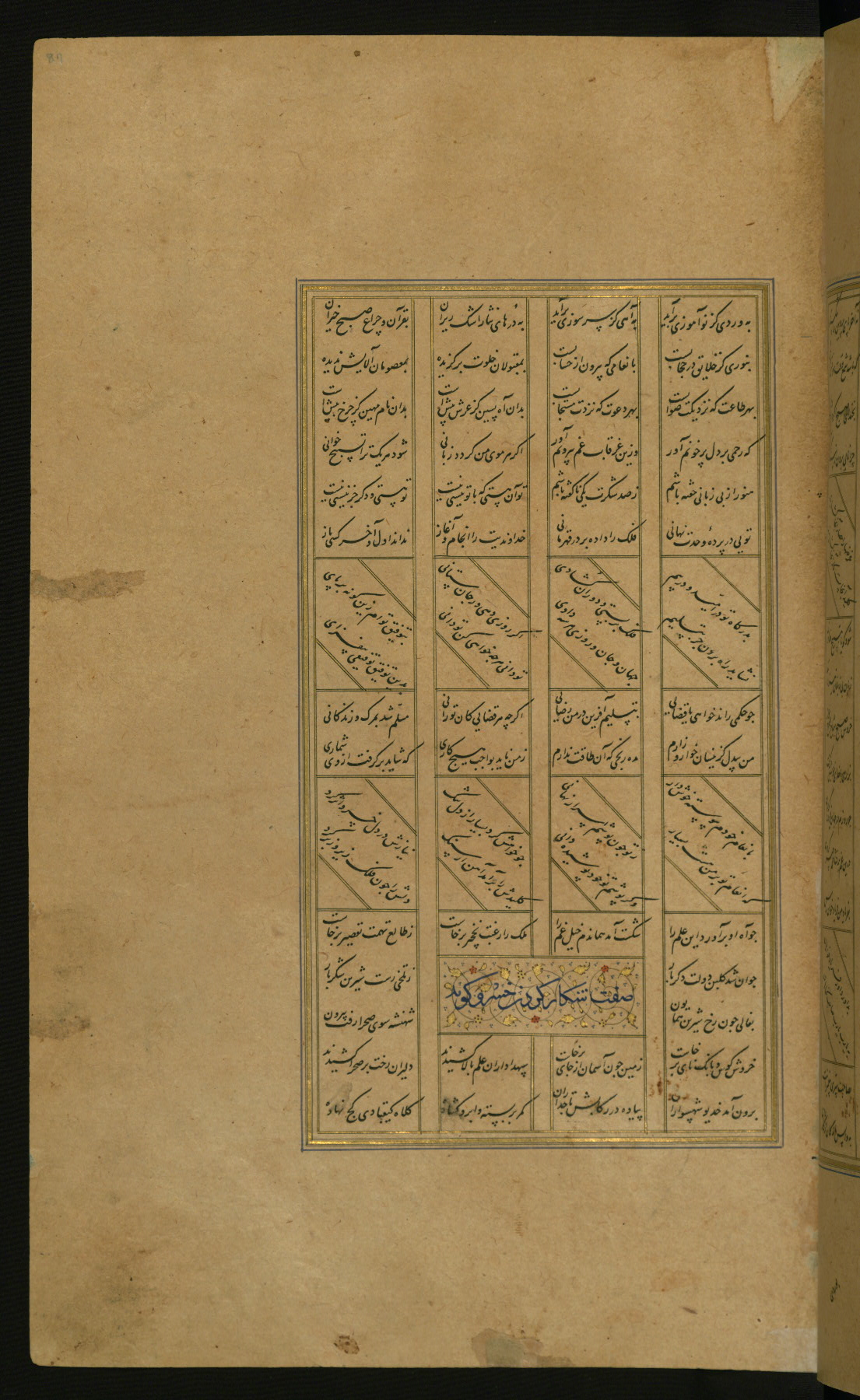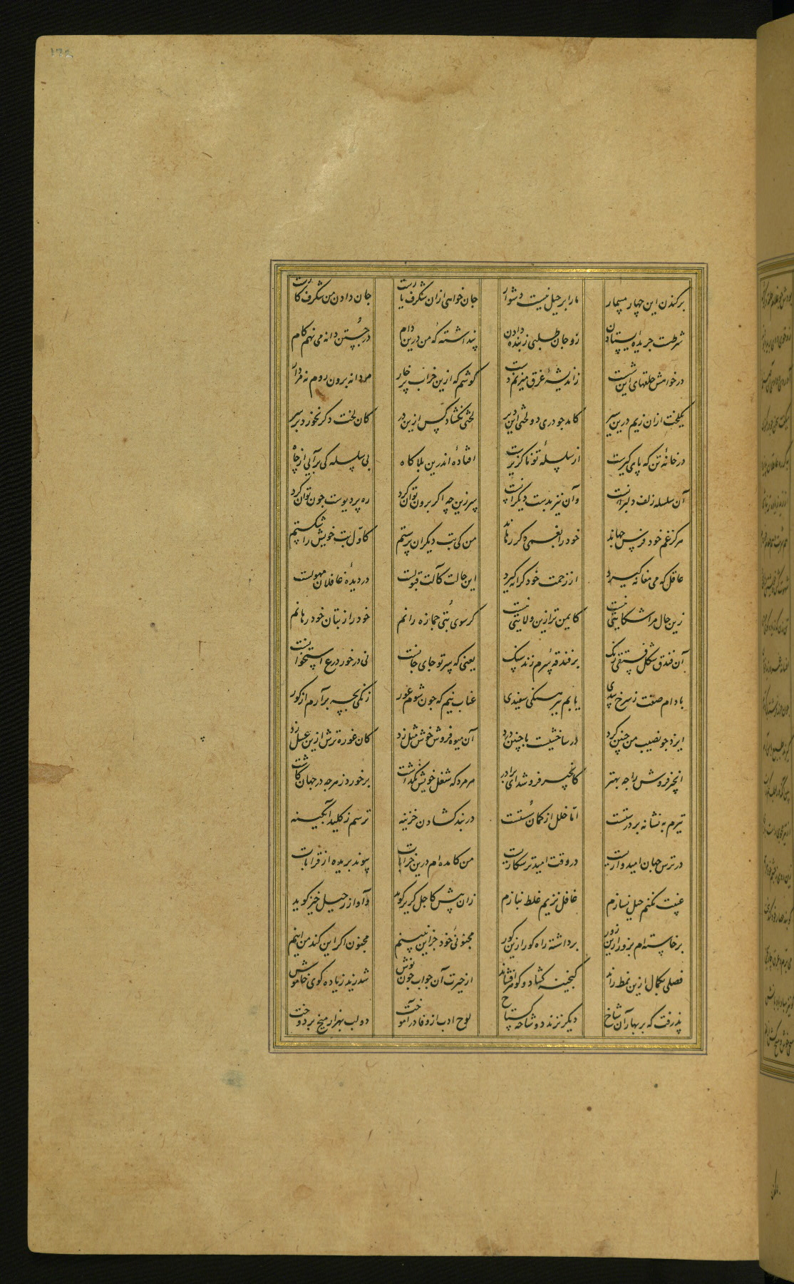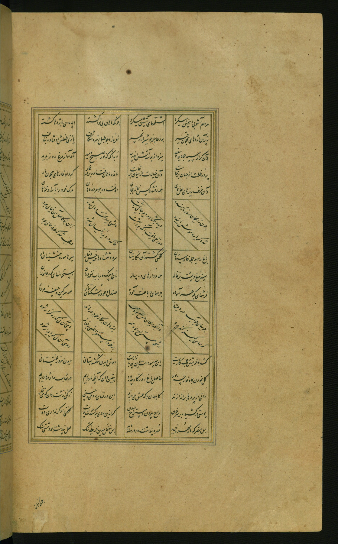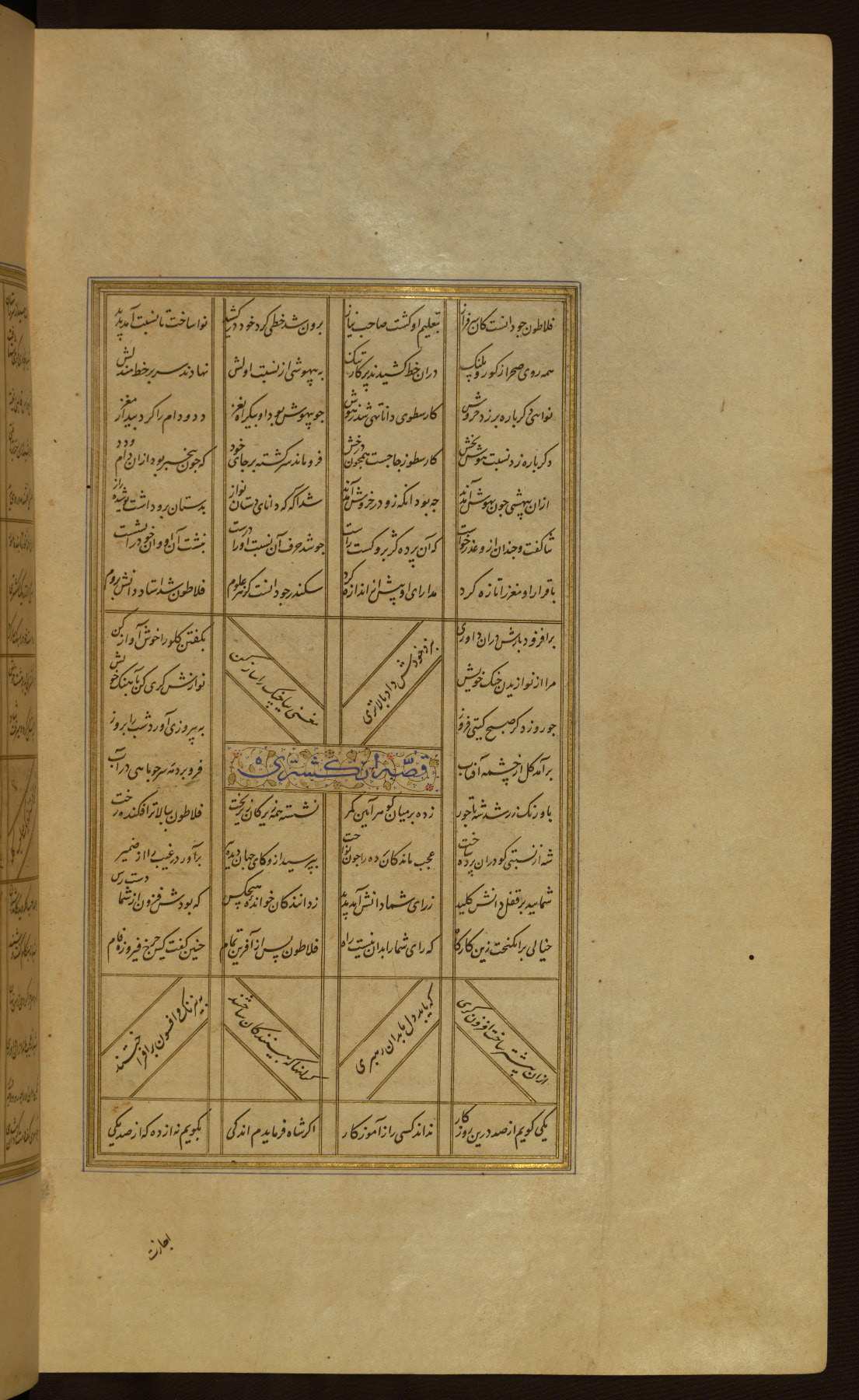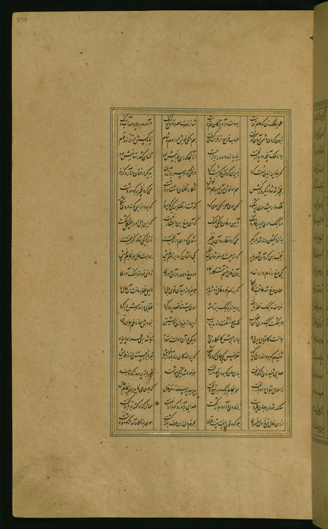This illuminated and illustrated copy of the Khamsah (quintet) of Niẓāmī Ganjavī (d. 605 AH / 1209 CE) was written by Yār Muḥammad al-Haravī in 922 AH / 1516 CE. Written in four columns in black nastaʿlīq script, this manuscript opens with a double-page illuminated frontispiece signed by ʿAbd al-Wahhāb ibn ʿAbd al-Fattāḥ ibn ʿAlī. It contains thirty-five illustrations that were repainted in India during the twelfth century AH / eighteenth CE. The seal of Muḥammad Asharf ibn Muḥammad Khātam al-Ḥusaynī, dated 1173 AH / 1759-60 CE appears on fols. 1a and 401a. It is possible that the brown leather binding with center and side panels brushed with gold is original to the manuscript but was repaired at a later stage in the codex's history.