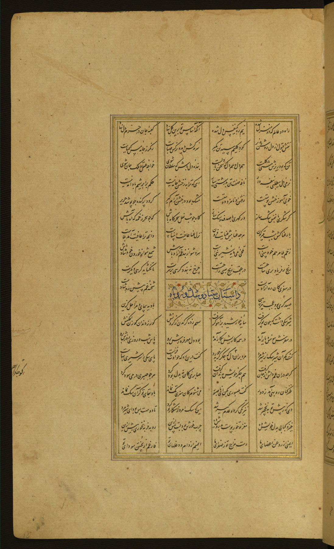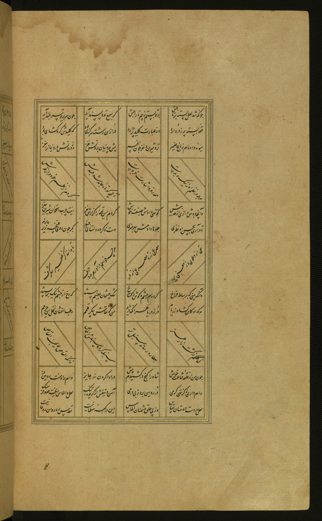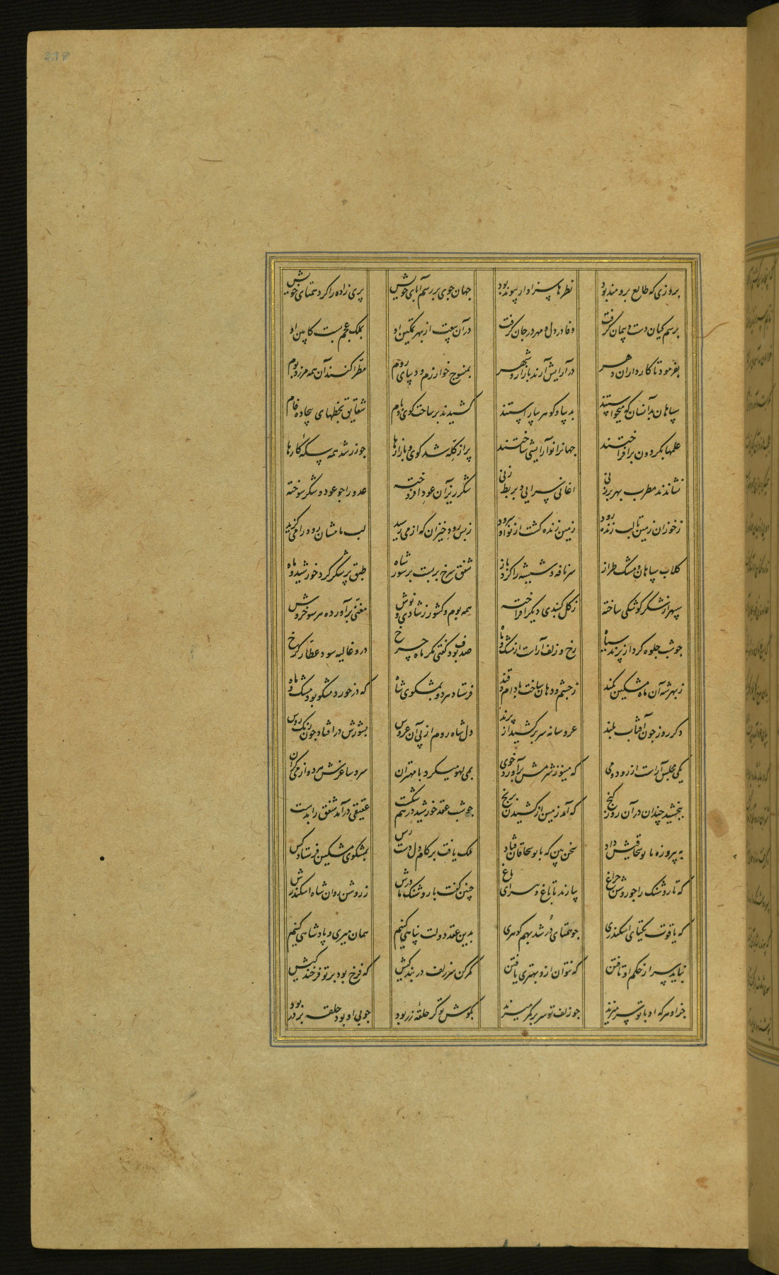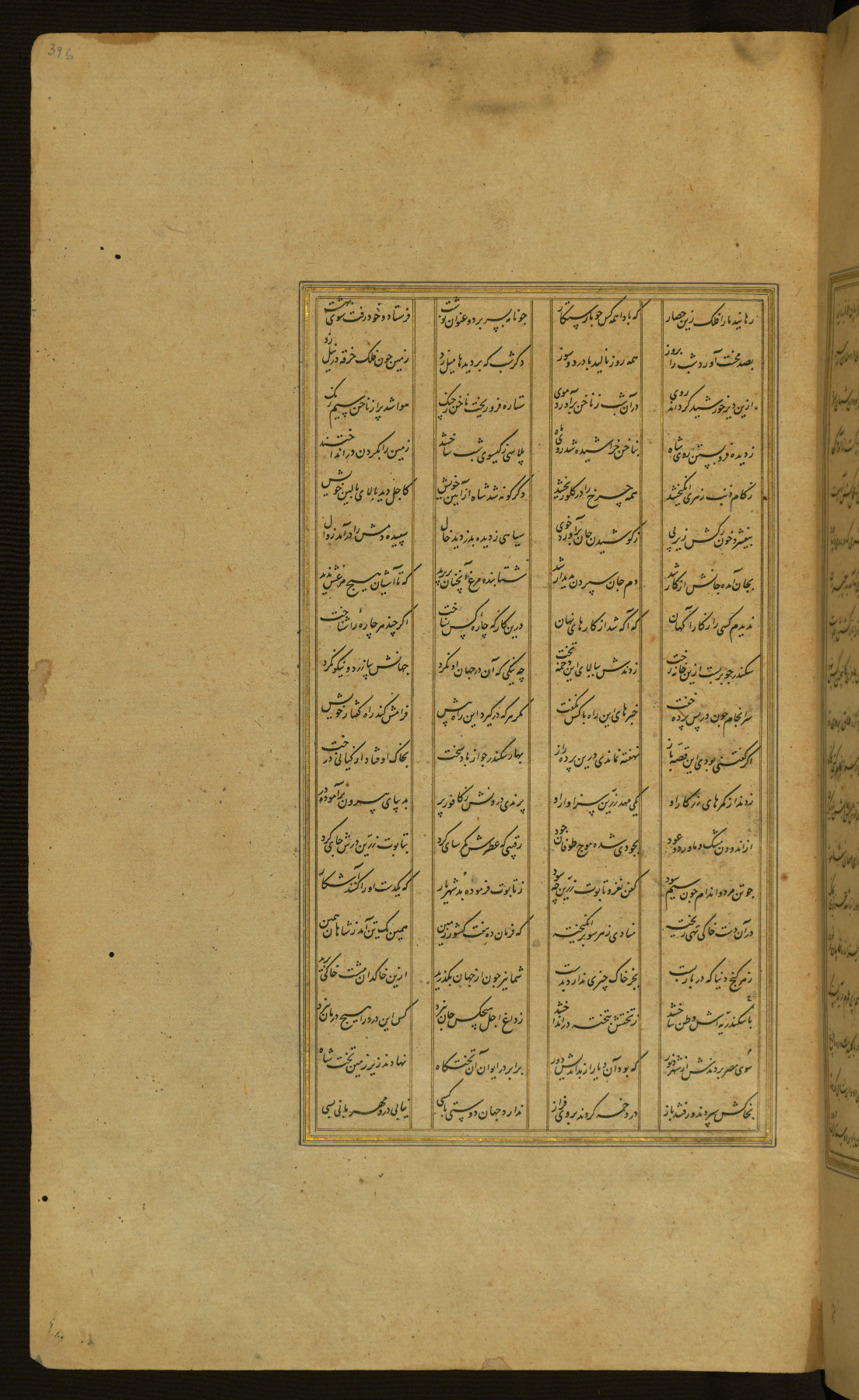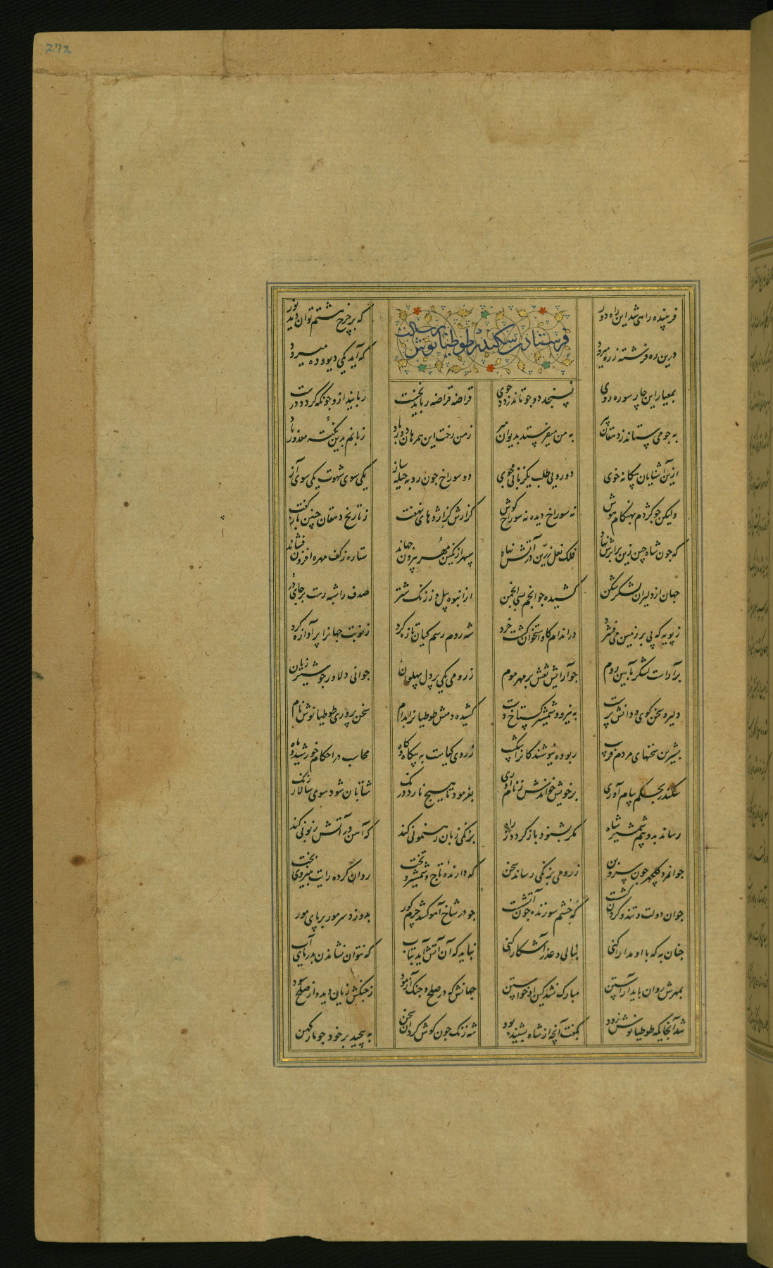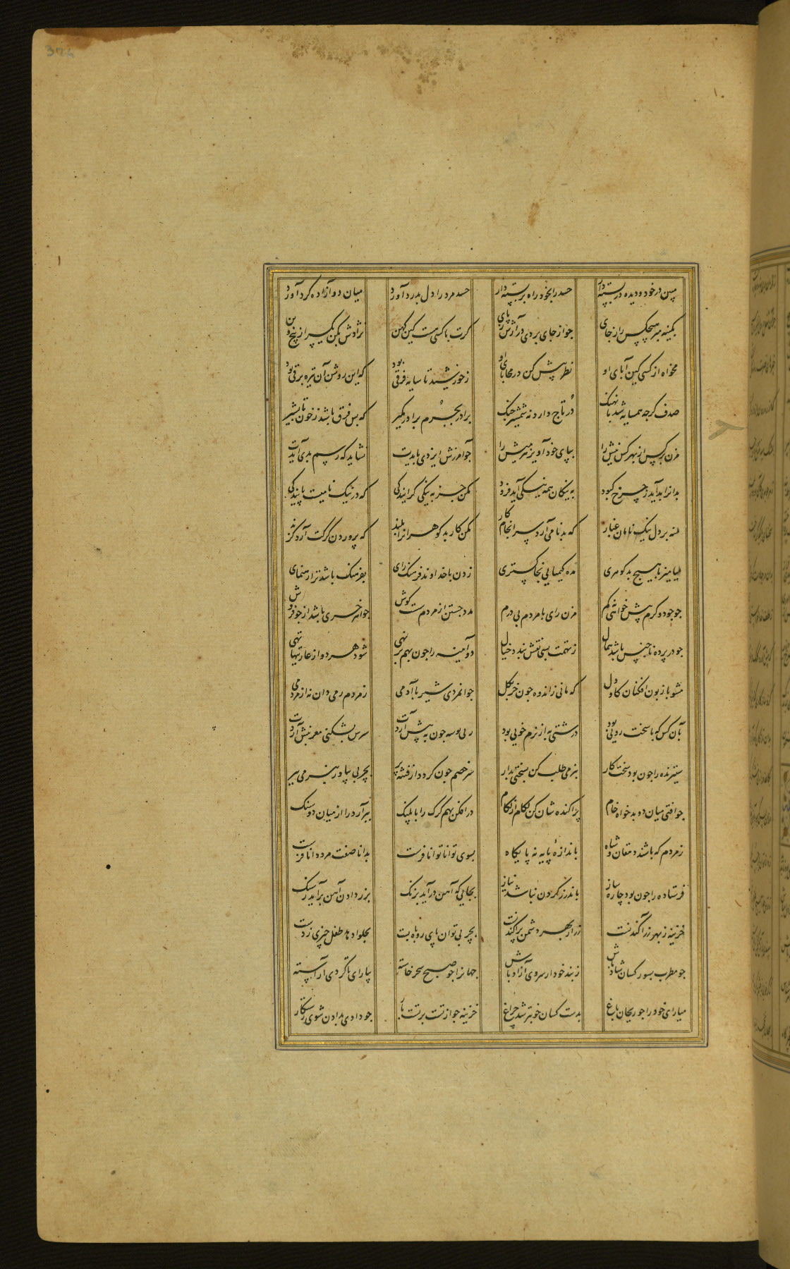 This illuminated and illustrated copy of the Khamsah (quintet) of Niẓāmī Ganjavī (d. 605 AH / 1209 CE) was written by Yār Muḥammad al-Haravī in 922 AH / 1516 CE. Written in four columns in black nastaʿlīq script, this manuscript opens with a double-page illuminated frontispiece signed by ʿAbd al-Wahhāb ibn ʿAbd al-Fattāḥ ibn ʿAlī. It contains thirty-five illustrations that were repainted in India during the twelfth century AH / eighteenth CE. The seal of Muḥammad Asharf ibn Muḥammad Khātam al-Ḥusaynī, dated 1173 AH / 1759-60 CE appears on fols. 1a and 401a. It is possible that the brown leather binding with center and side panels brushed with gold is original to the manuscript but was repaired at a later stage in the codex's history.