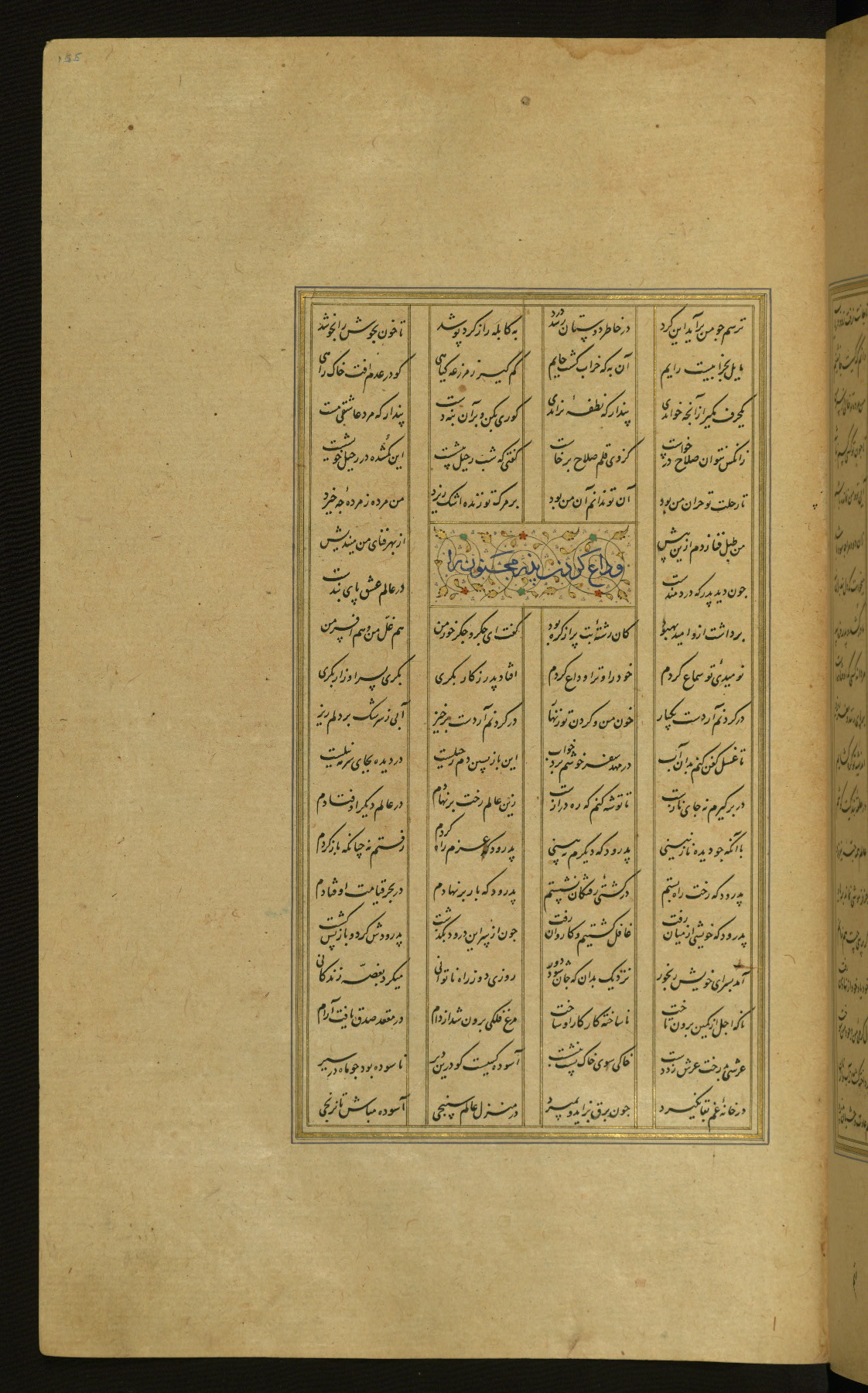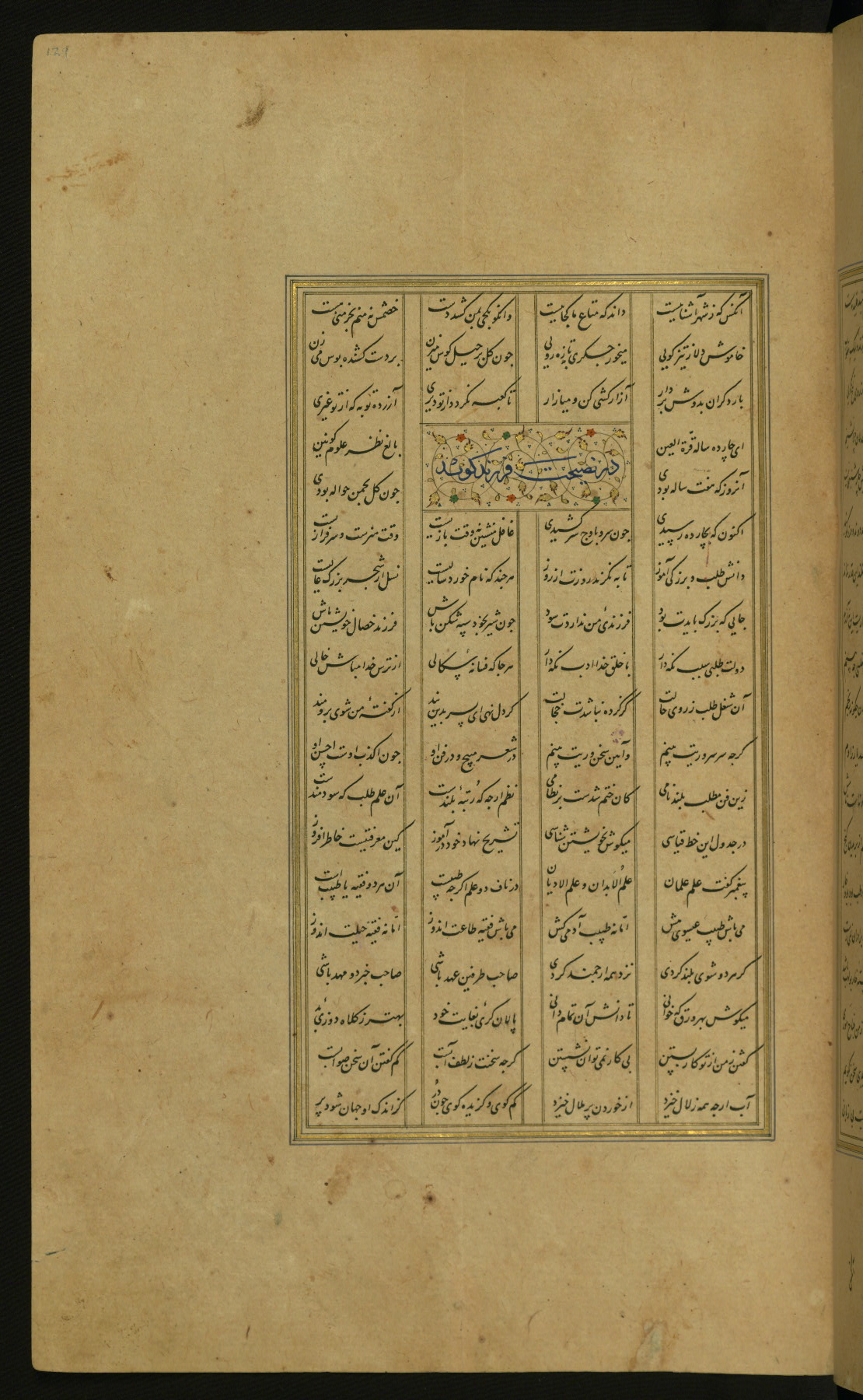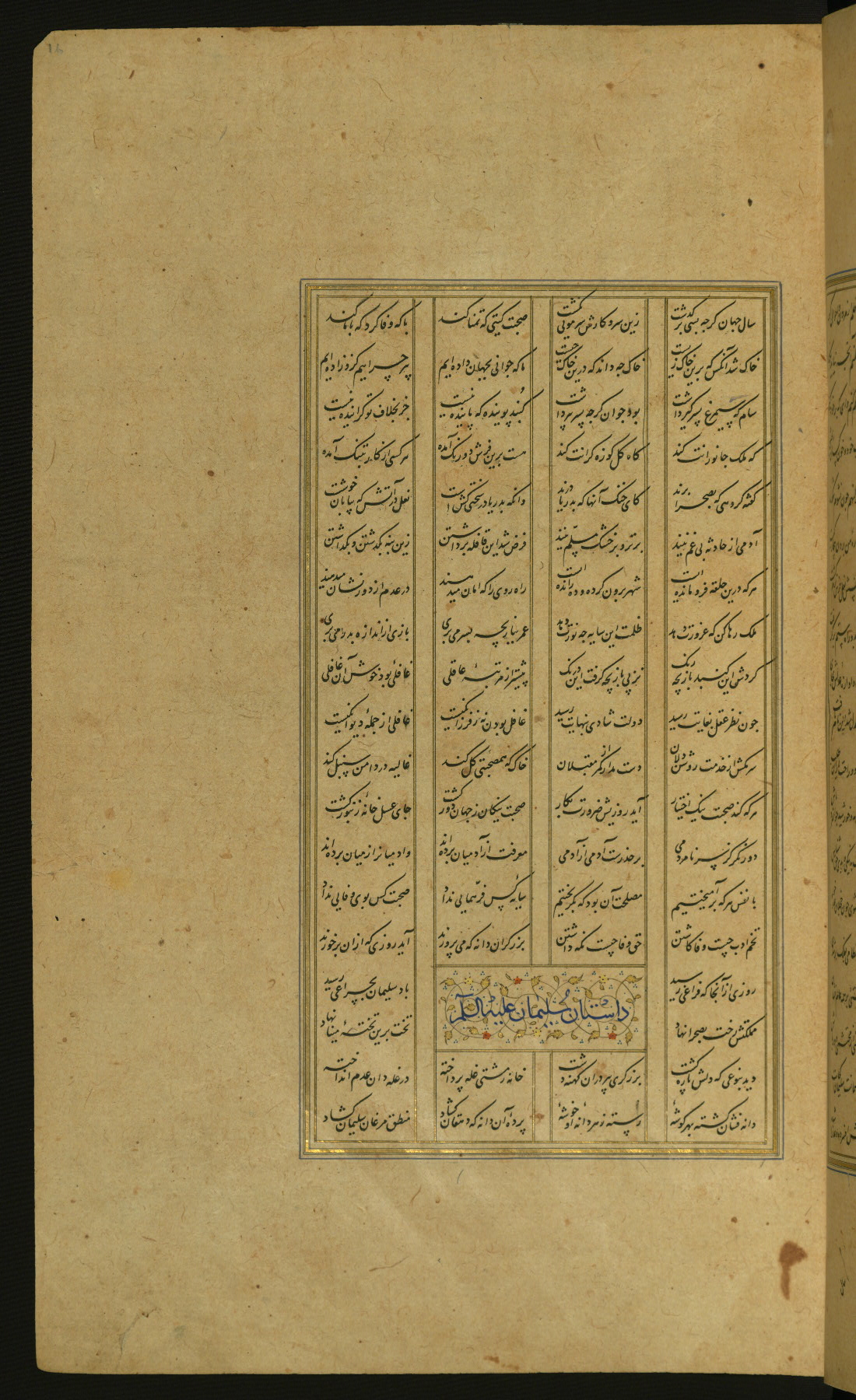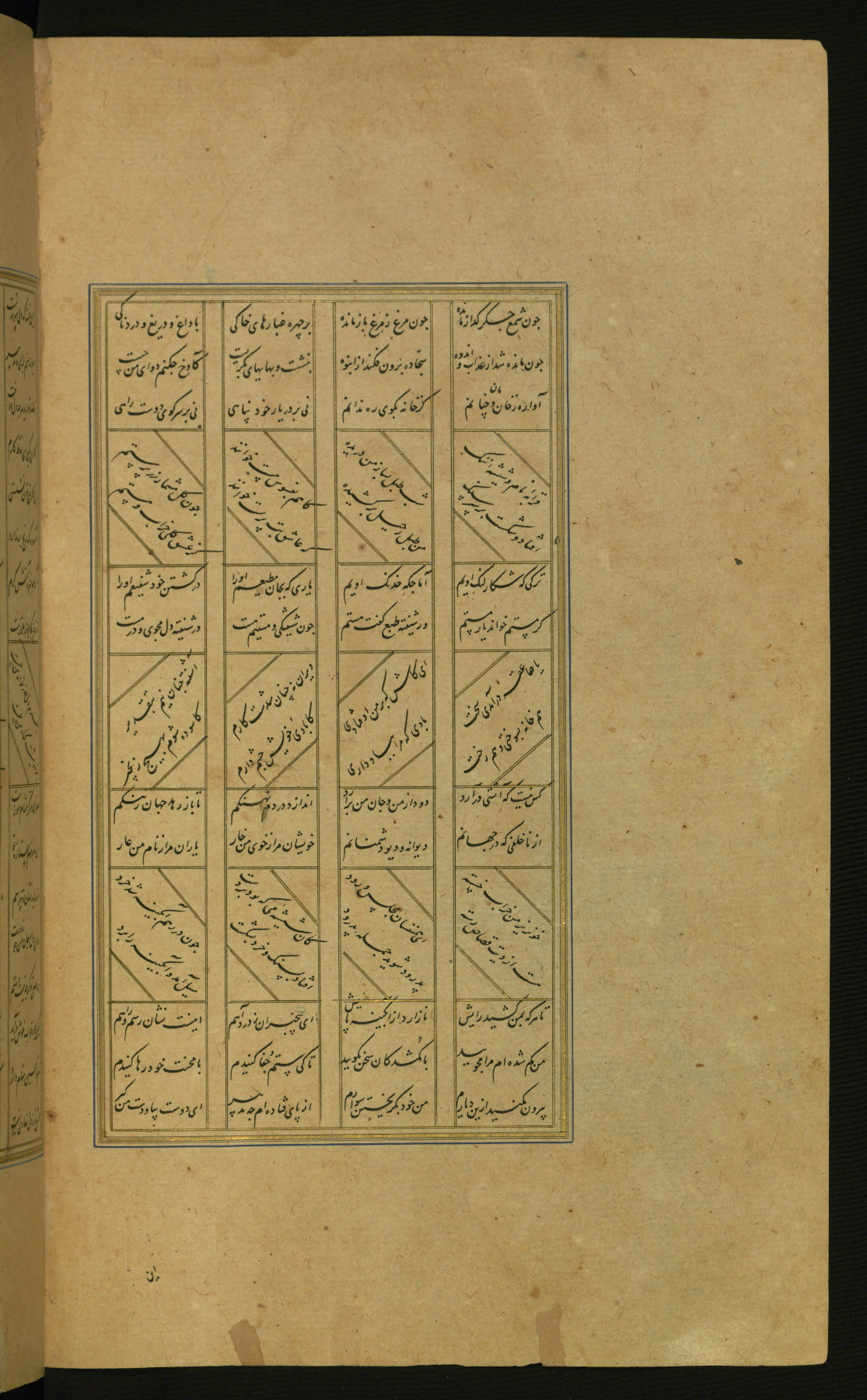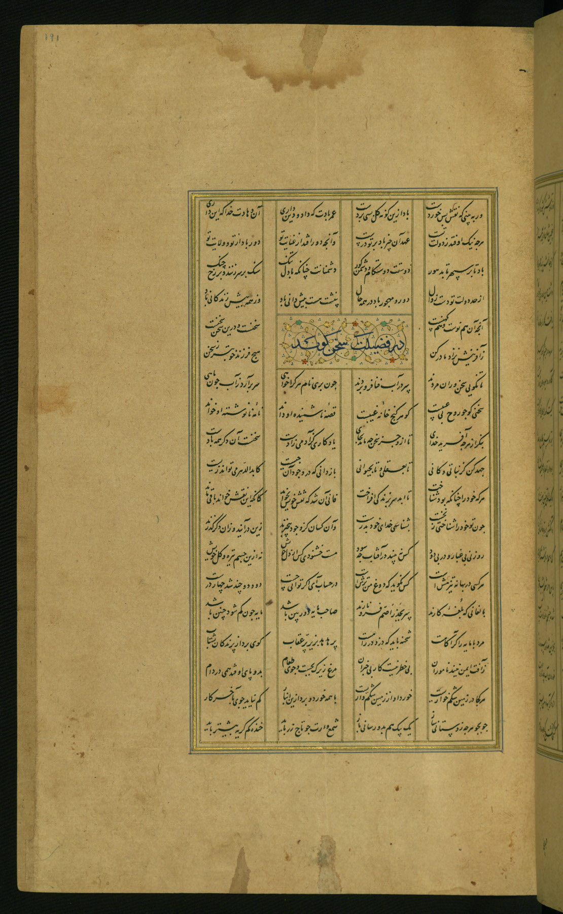 This illuminated and illustrated copy of the Khamsah (quintet) of Niẓāmī Ganjavī (d. 605 AH / 1209 CE) was written by Yār Muḥammad al-Haravī in 922 AH / 1516 CE. Written in four columns in black nastaʿlīq script, this manuscript opens with a double-page illuminated frontispiece signed by ʿAbd al-Wahhāb ibn ʿAbd al-Fattāḥ ibn ʿAlī. It contains thirty-five illustrations that were repainted in India during the twelfth century AH / eighteenth CE. The seal of Muḥammad Asharf ibn Muḥammad Khātam al-Ḥusaynī, dated 1173 AH / 1759-60 CE appears on fols. 1a and 401a. It is possible that the brown leather binding with center and side panels brushed with gold is original to the manuscript but was repaired at a later stage in the codex's history.