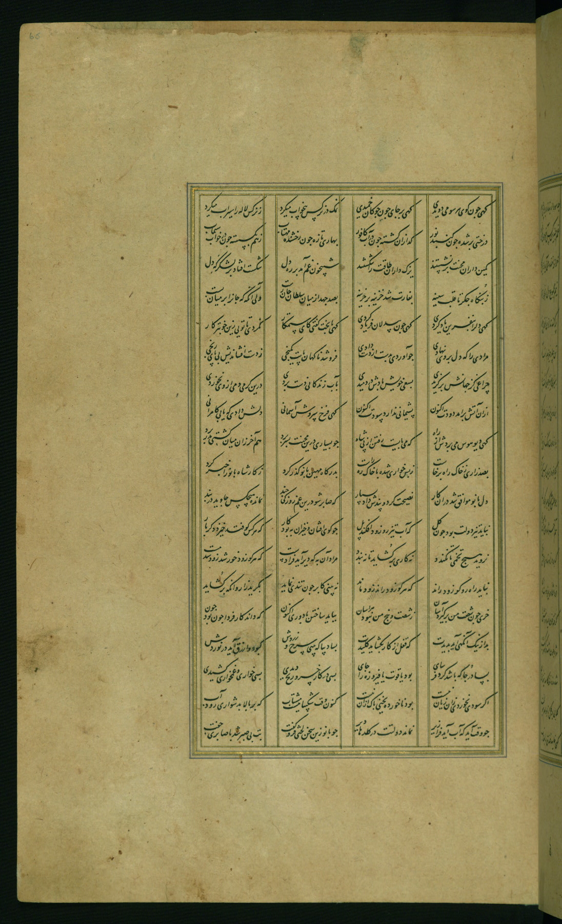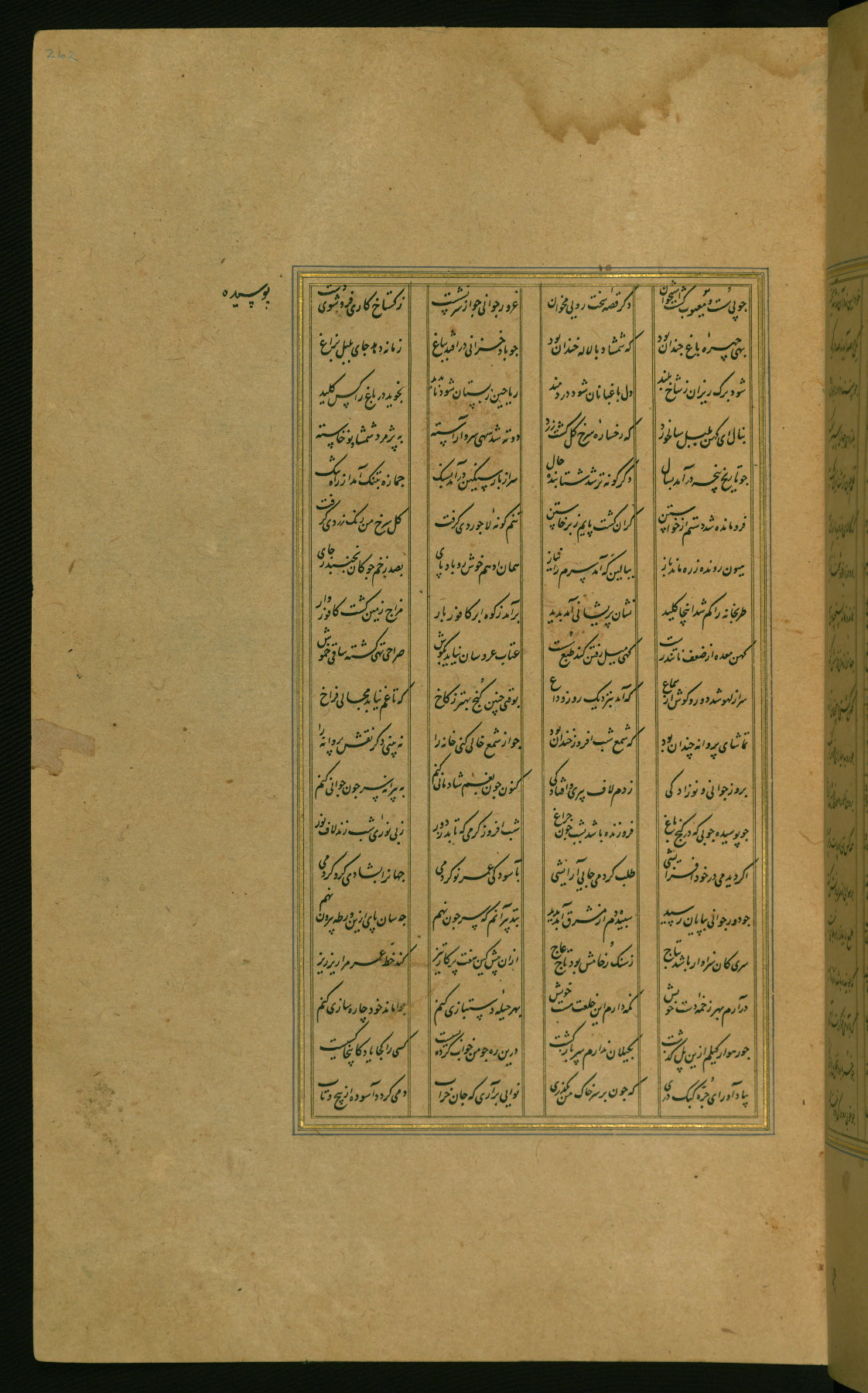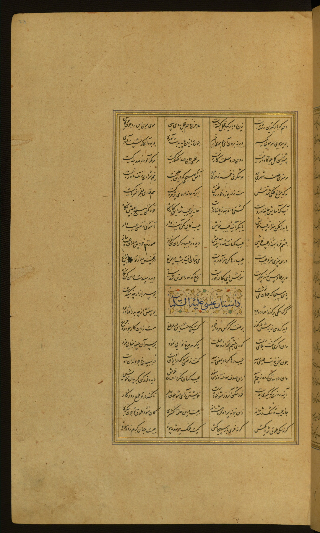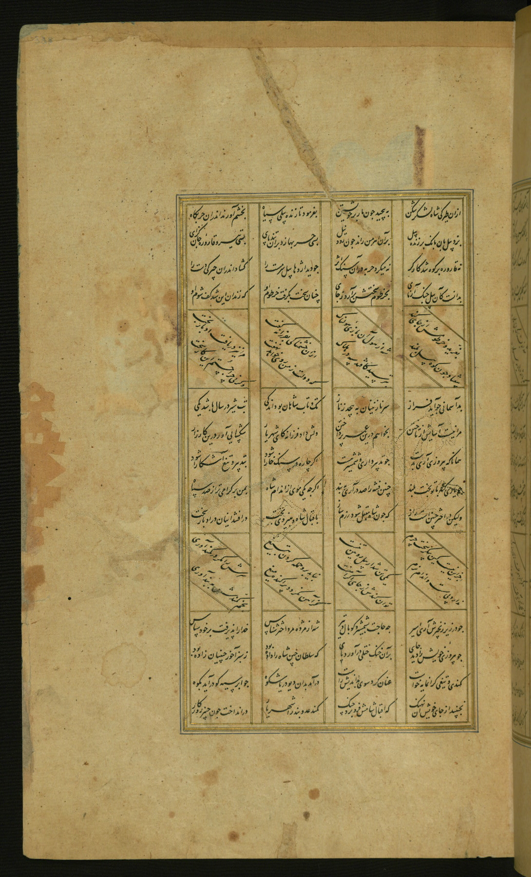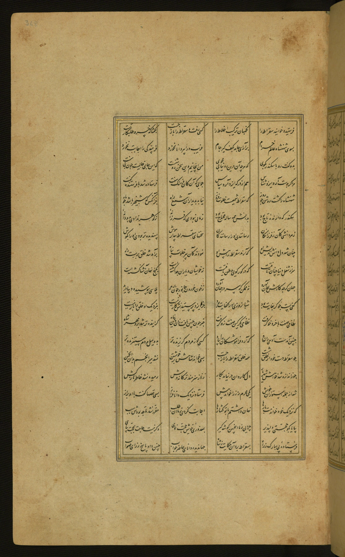 This illuminated and illustrated copy of the Khamsah (quintet) of Niẓāmī Ganjavī (d. 605 AH / 1209 CE) was written by Yār Muḥammad al-Haravī in 922 AH / 1516 CE. Written in four columns in black nastaʿlīq script, this manuscript opens with a double-page illuminated frontispiece signed by ʿAbd al-Wahhāb ibn ʿAbd al-Fattāḥ ibn ʿAlī. It contains thirty-five illustrations that were repainted in India during the twelfth century AH / eighteenth CE. The seal of Muḥammad Asharf ibn Muḥammad Khātam al-Ḥusaynī, dated 1173 AH / 1759-60 CE appears on fols. 1a and 401a. It is possible that the brown leather binding with center and side panels brushed with gold is original to the manuscript but was repaired at a later stage in the codex's history.
