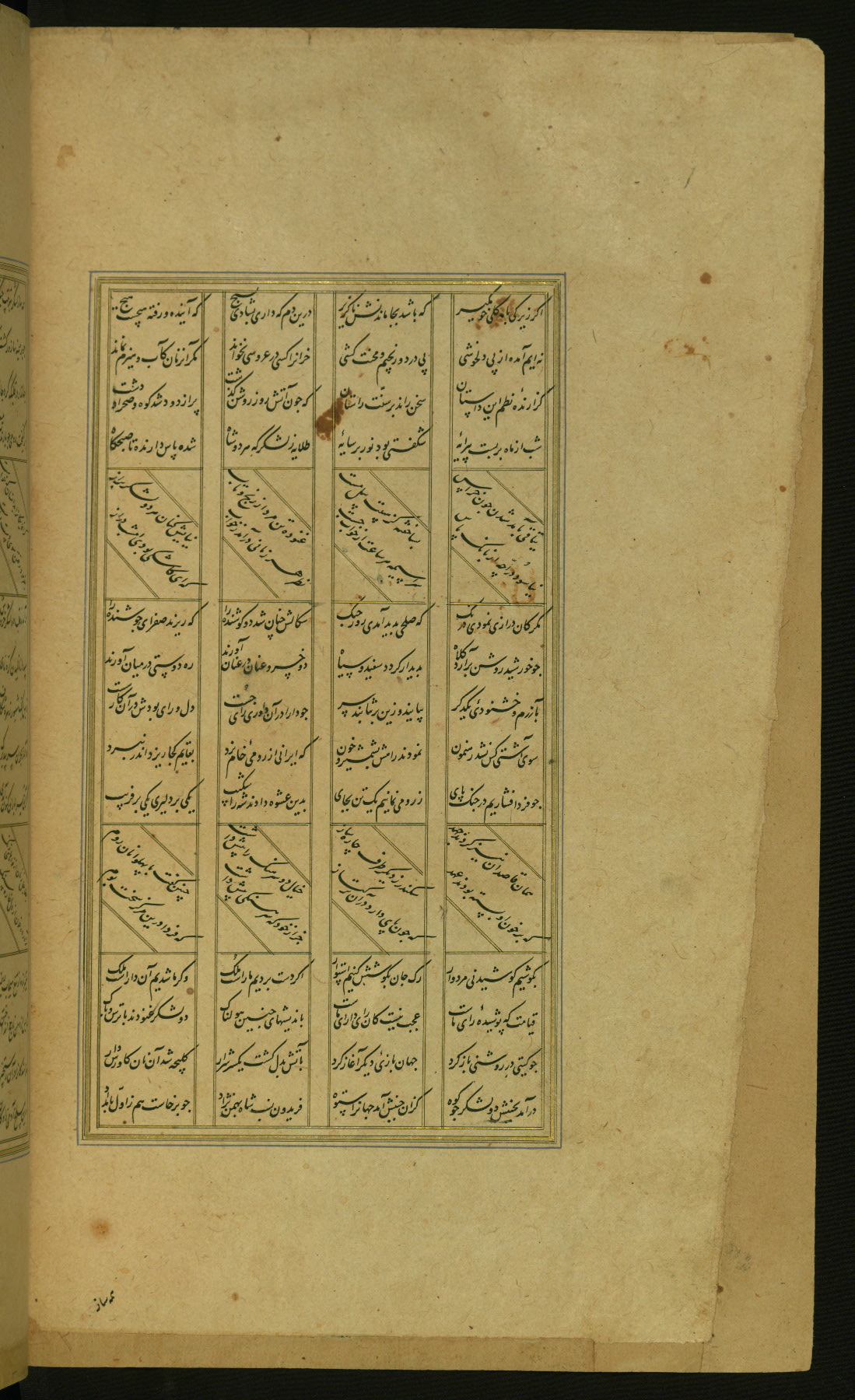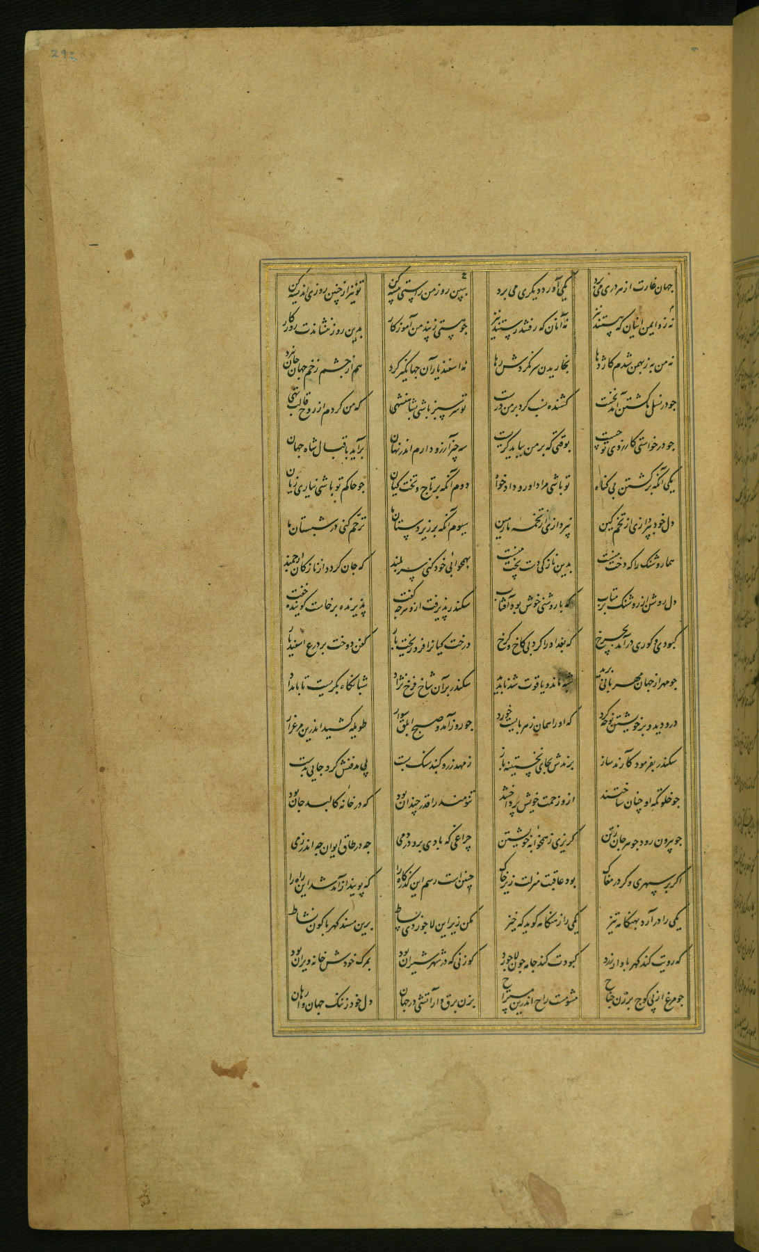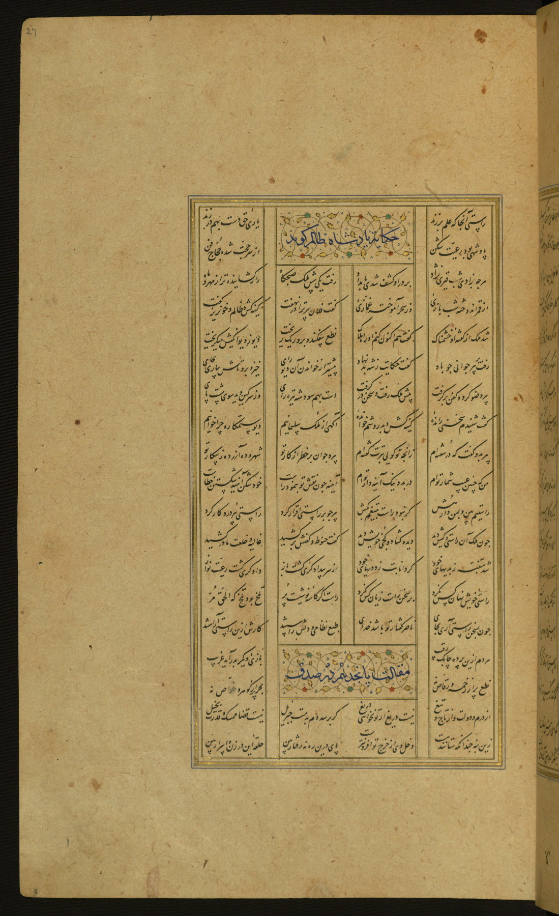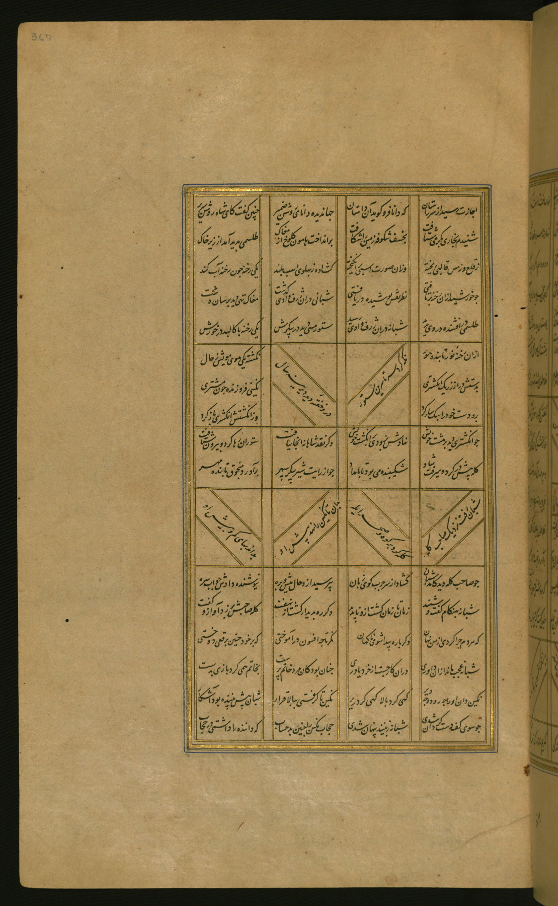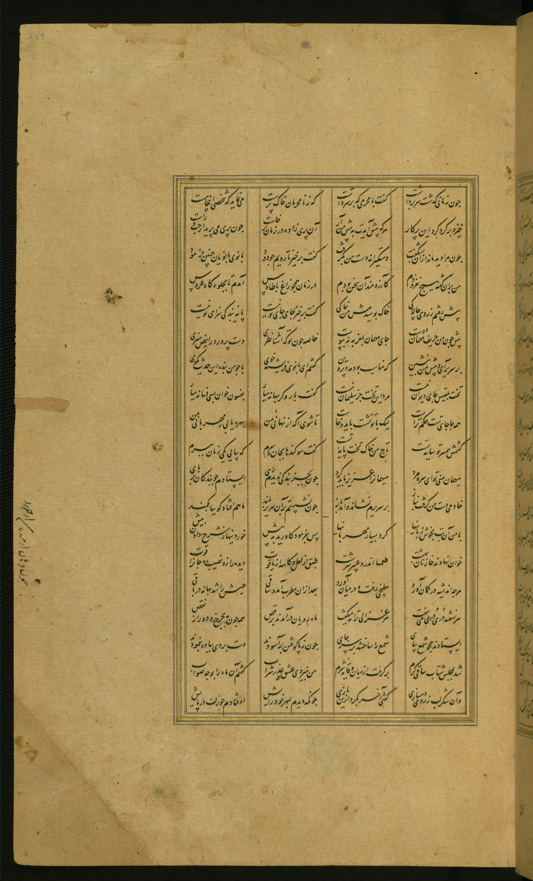 This illuminated and illustrated copy of the Khamsah (quintet) of Niẓāmī Ganjavī (d. 605 AH / 1209 CE) was written by Yār Muḥammad al-Haravī in 922 AH / 1516 CE. Written in four columns in black nastaʿlīq script, this manuscript opens with a double-page illuminated frontispiece signed by ʿAbd al-Wahhāb ibn ʿAbd al-Fattāḥ ibn ʿAlī. It contains thirty-five illustrations that were repainted in India during the twelfth century AH / eighteenth CE. The seal of Muḥammad Asharf ibn Muḥammad Khātam al-Ḥusaynī, dated 1173 AH / 1759-60 CE appears on fols. 1a and 401a. It is possible that the brown leather binding with center and side panels brushed with gold is original to the manuscript but was repaired at a later stage in the codex's history.