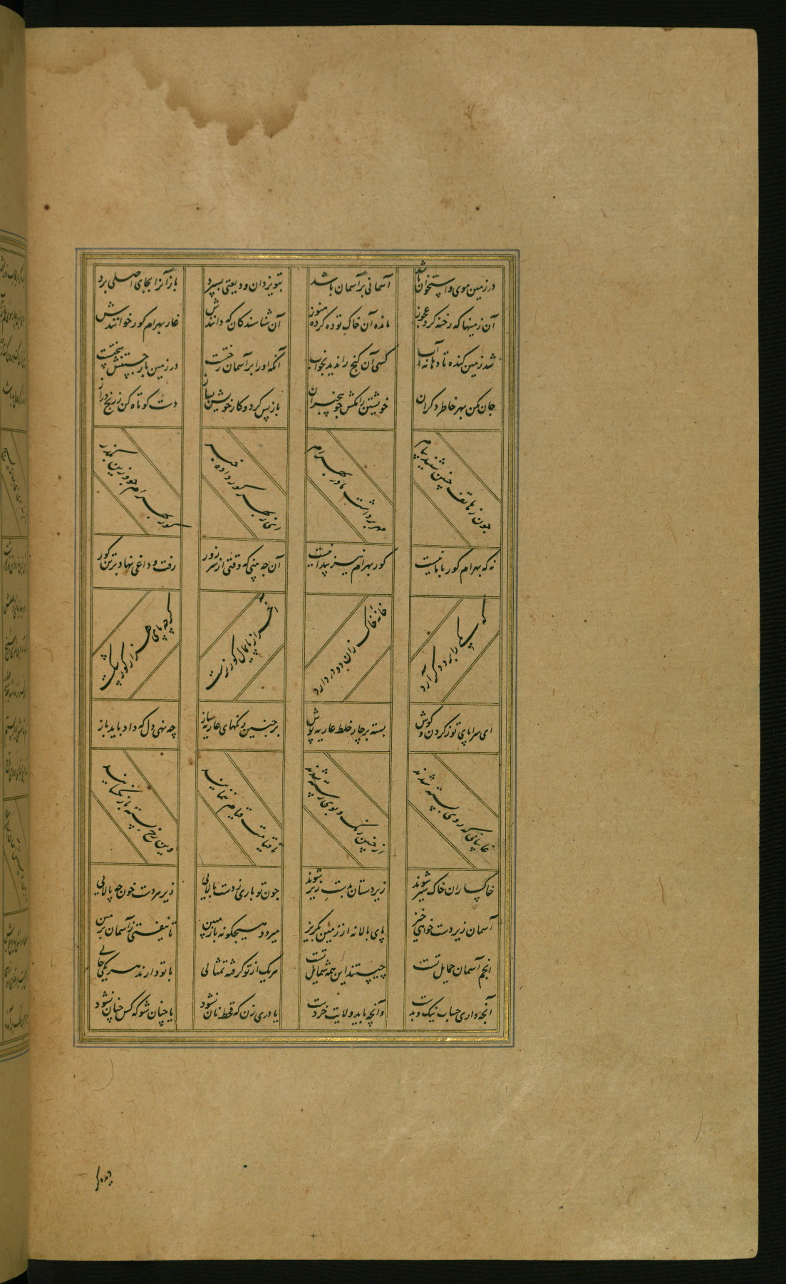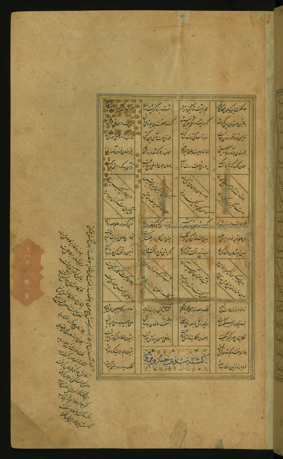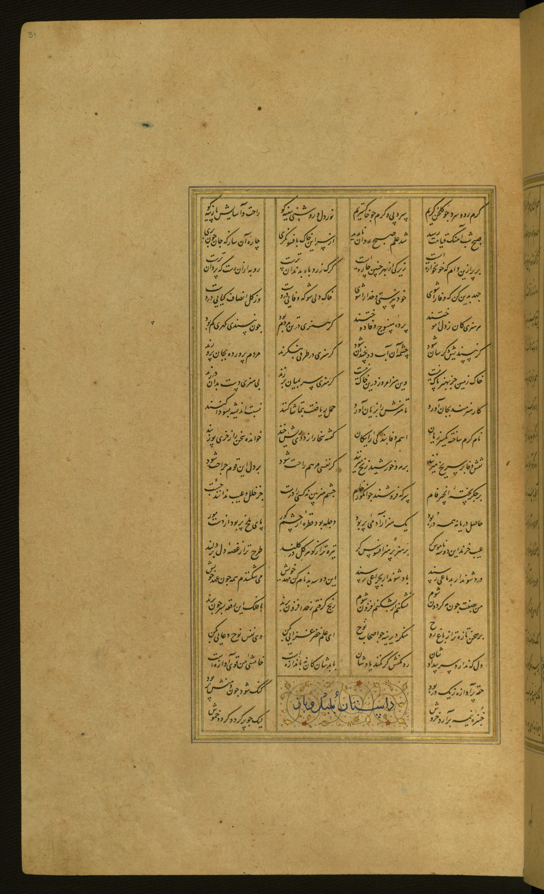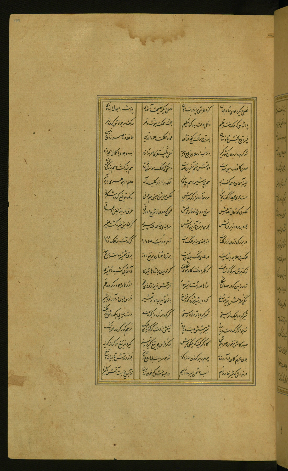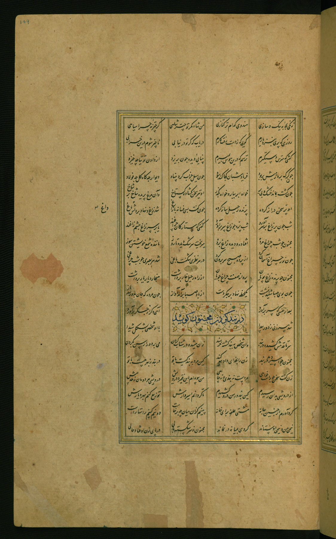 This illuminated and illustrated copy of the Khamsah (quintet) of Niẓāmī Ganjavī (d. 605 AH / 1209 CE) was written by Yār Muḥammad al-Haravī in 922 AH / 1516 CE. Written in four columns in black nastaʿlīq script, this manuscript opens with a double-page illuminated frontispiece signed by ʿAbd al-Wahhāb ibn ʿAbd al-Fattāḥ ibn ʿAlī. It contains thirty-five illustrations that were repainted in India during the twelfth century AH / eighteenth CE. The seal of Muḥammad Asharf ibn Muḥammad Khātam al-Ḥusaynī, dated 1173 AH / 1759-60 CE appears on fols. 1a and 401a. It is possible that the brown leather binding with center and side panels brushed with gold is original to the manuscript but was repaired at a later stage in the codex's history.