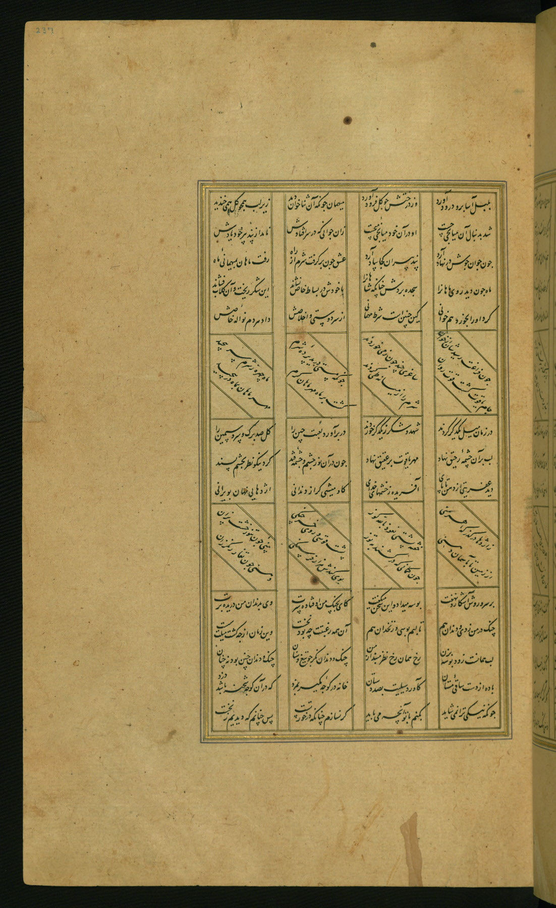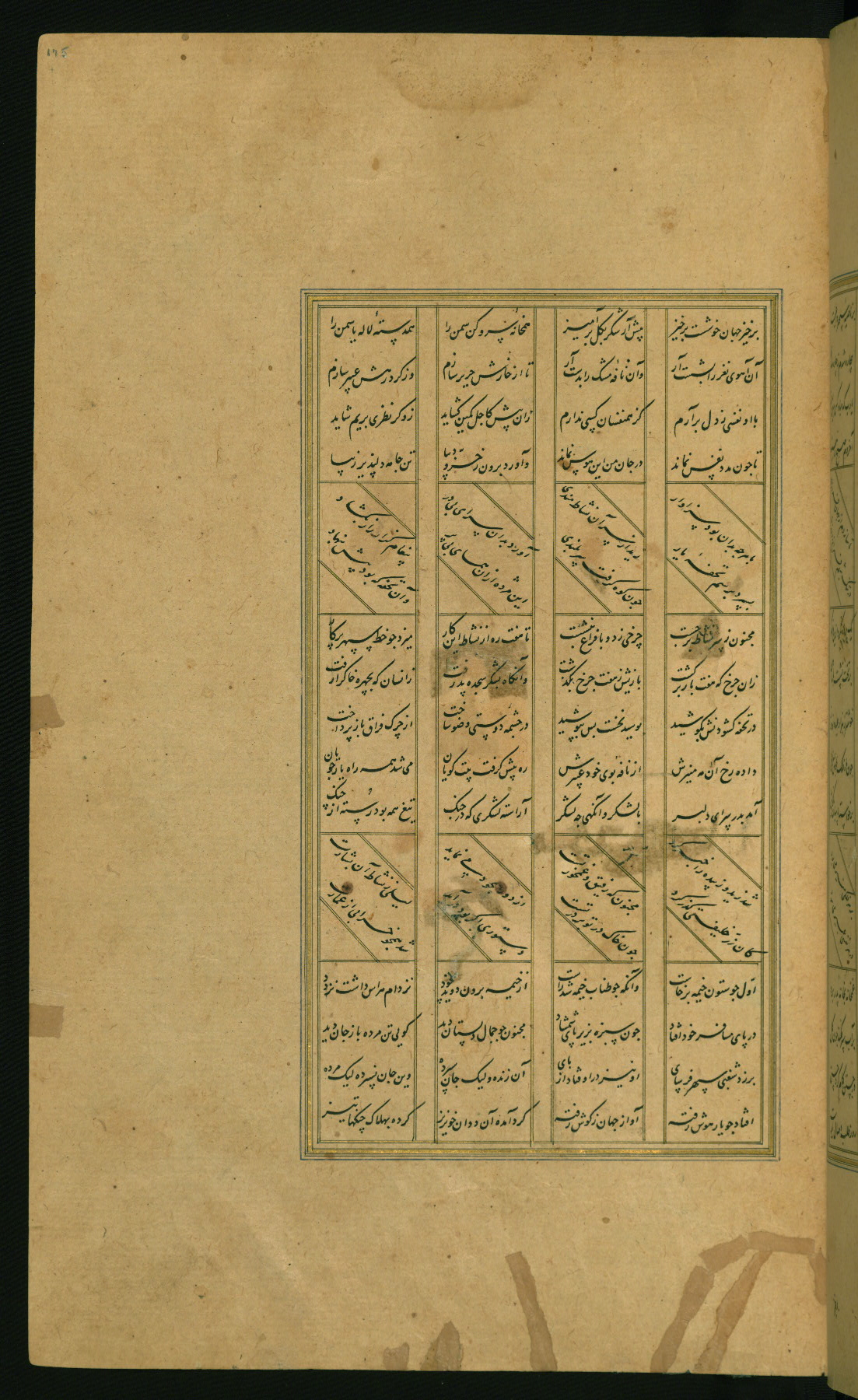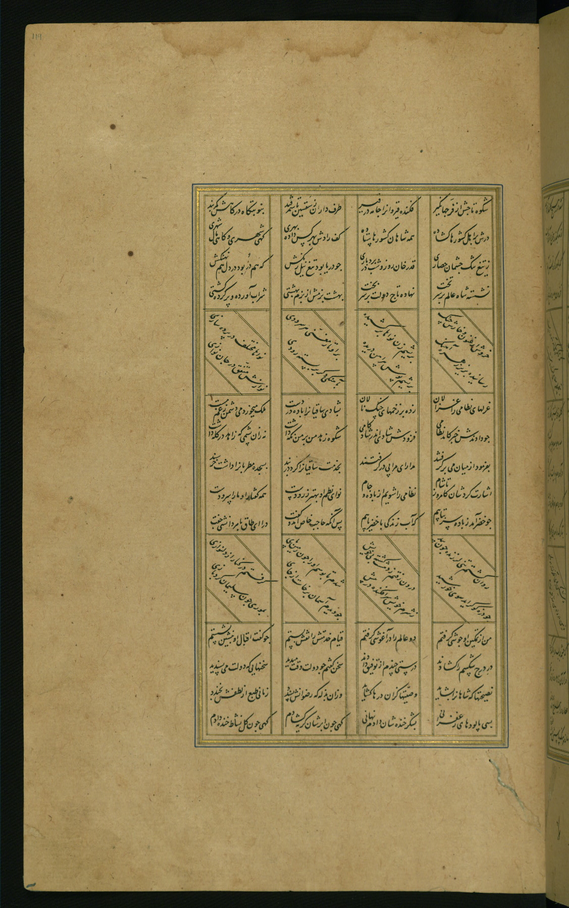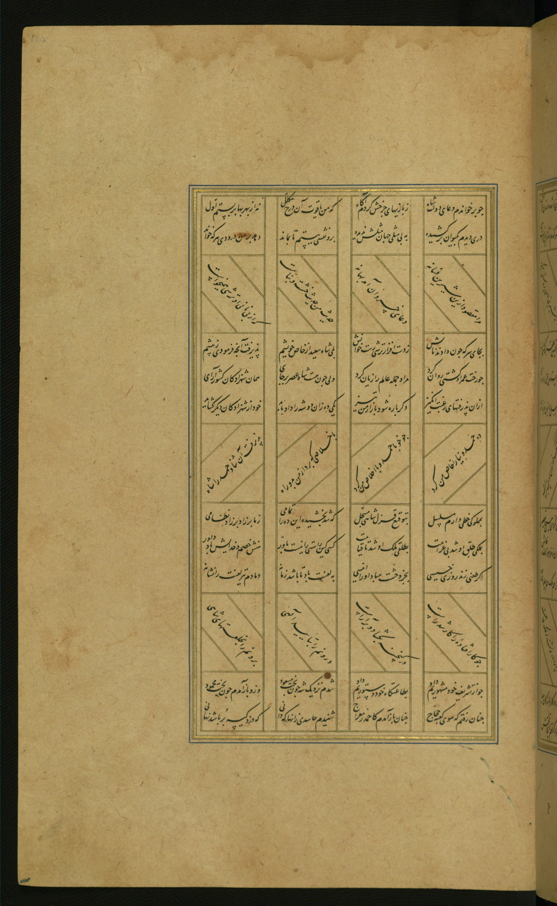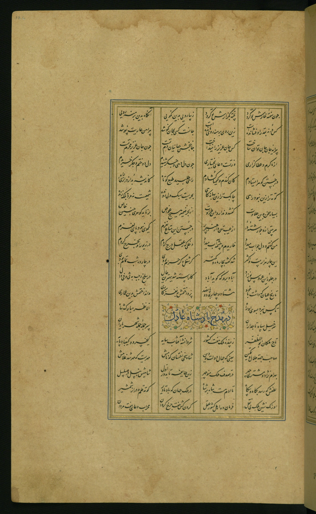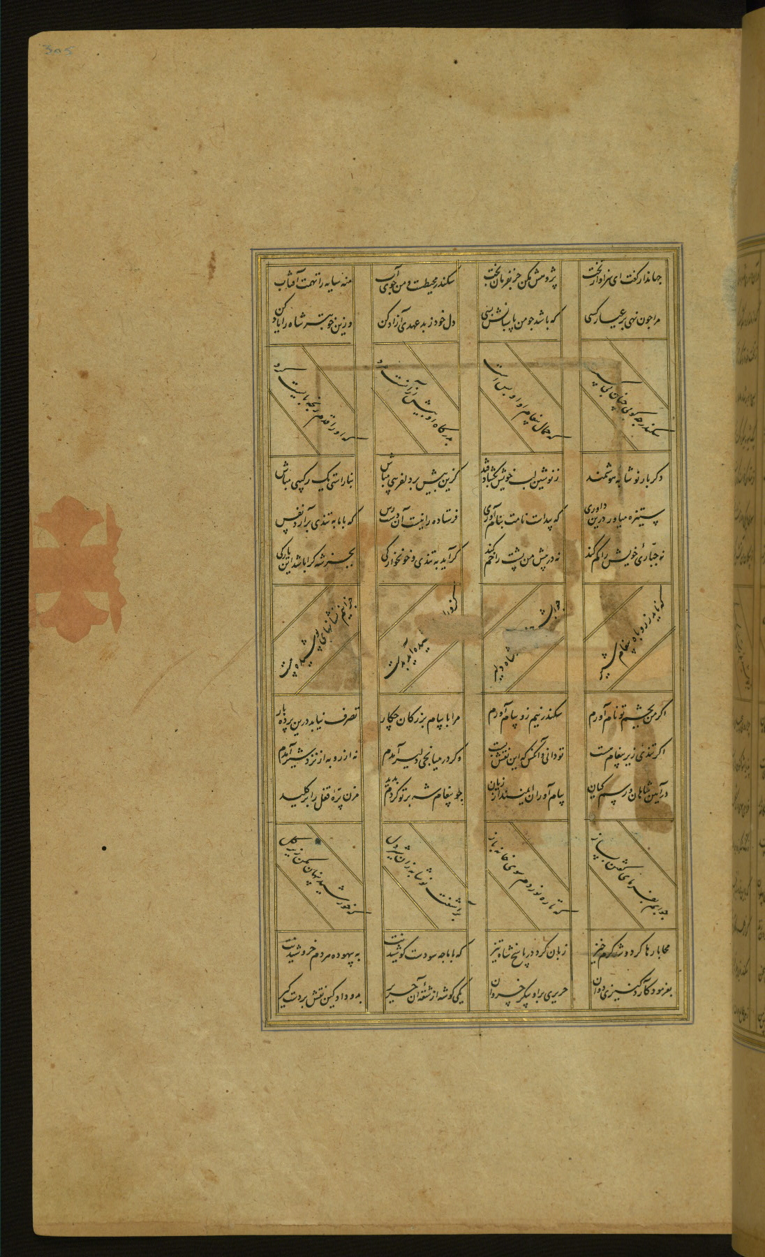 This illuminated and illustrated copy of the Khamsah (quintet) of Niẓāmī Ganjavī (d. 605 AH / 1209 CE) was written by Yār Muḥammad al-Haravī in 922 AH / 1516 CE. Written in four columns in black nastaʿlīq script, this manuscript opens with a double-page illuminated frontispiece signed by ʿAbd al-Wahhāb ibn ʿAbd al-Fattāḥ ibn ʿAlī. It contains thirty-five illustrations that were repainted in India during the twelfth century AH / eighteenth CE. The seal of Muḥammad Asharf ibn Muḥammad Khātam al-Ḥusaynī, dated 1173 AH / 1759-60 CE appears on fols. 1a and 401a. It is possible that the brown leather binding with center and side panels brushed with gold is original to the manuscript but was repaired at a later stage in the codex's history.