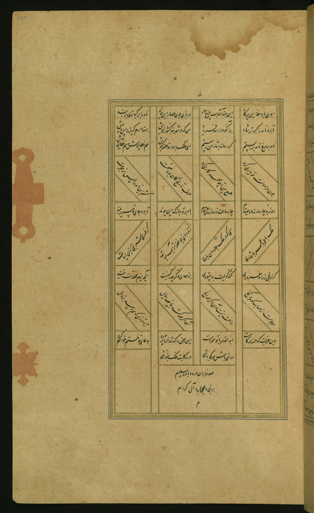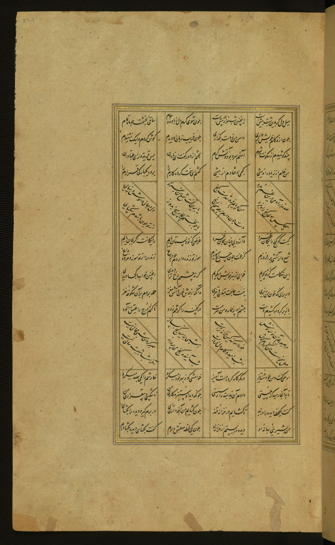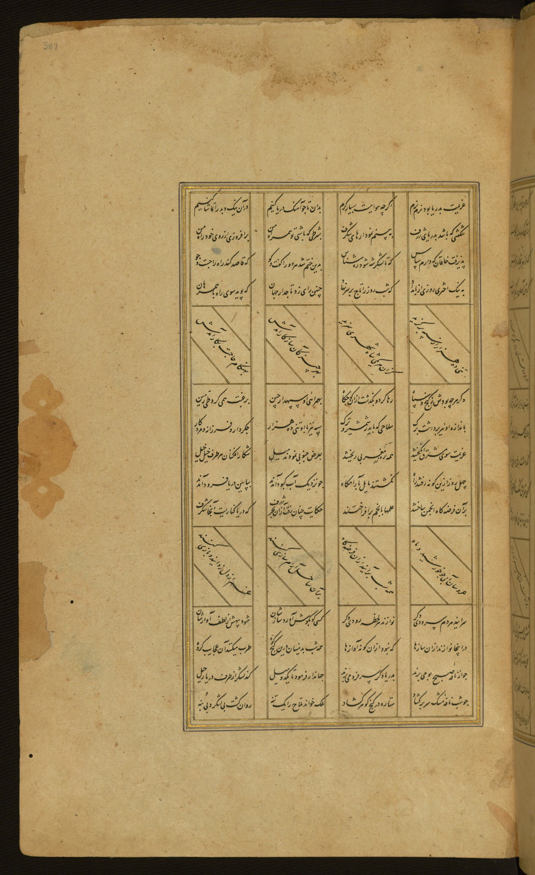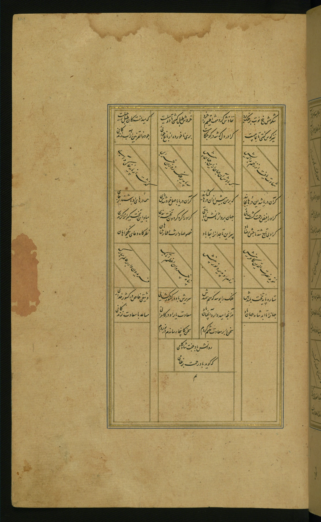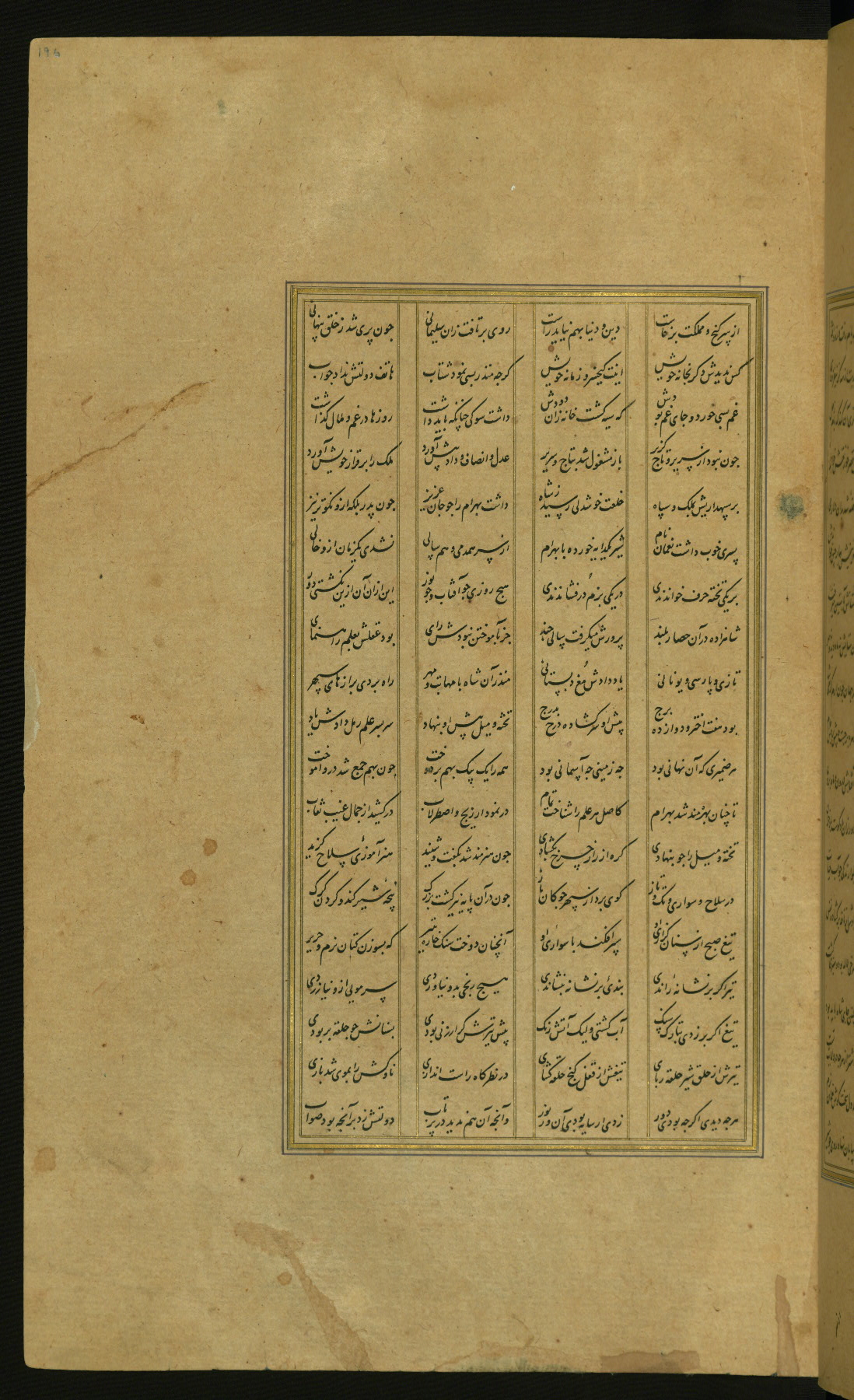 This illuminated and illustrated copy of the Khamsah (quintet) of Niẓāmī Ganjavī (d. 605 AH / 1209 CE) was written by Yār Muḥammad al-Haravī in 922 AH / 1516 CE. Written in four columns in black nastaʿlīq script, this manuscript opens with a double-page illuminated frontispiece signed by ʿAbd al-Wahhāb ibn ʿAbd al-Fattāḥ ibn ʿAlī. It contains thirty-five illustrations that were repainted in India during the twelfth century AH / eighteenth CE. The seal of Muḥammad Asharf ibn Muḥammad Khātam al-Ḥusaynī, dated 1173 AH / 1759-60 CE appears on fols. 1a and 401a. It is possible that the brown leather binding with center and side panels brushed with gold is original to the manuscript but was repaired at a later stage in the codex's history.