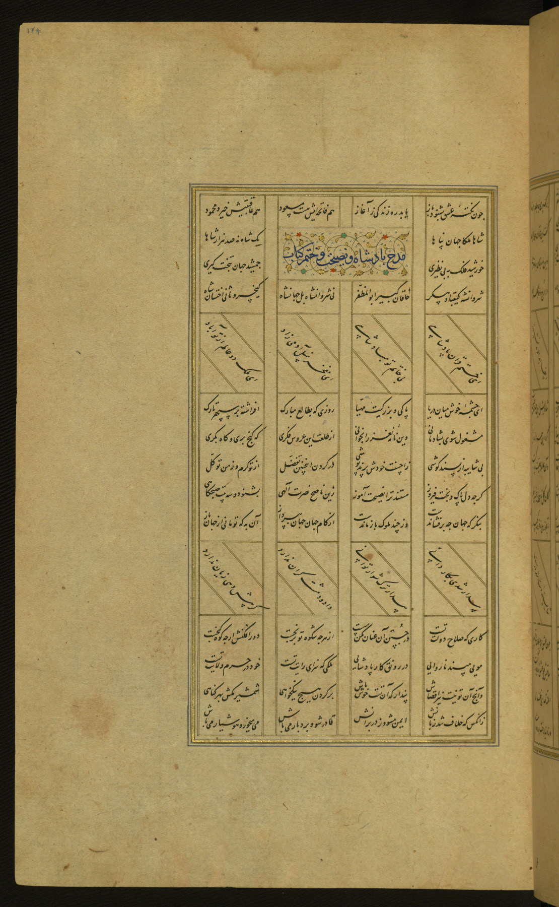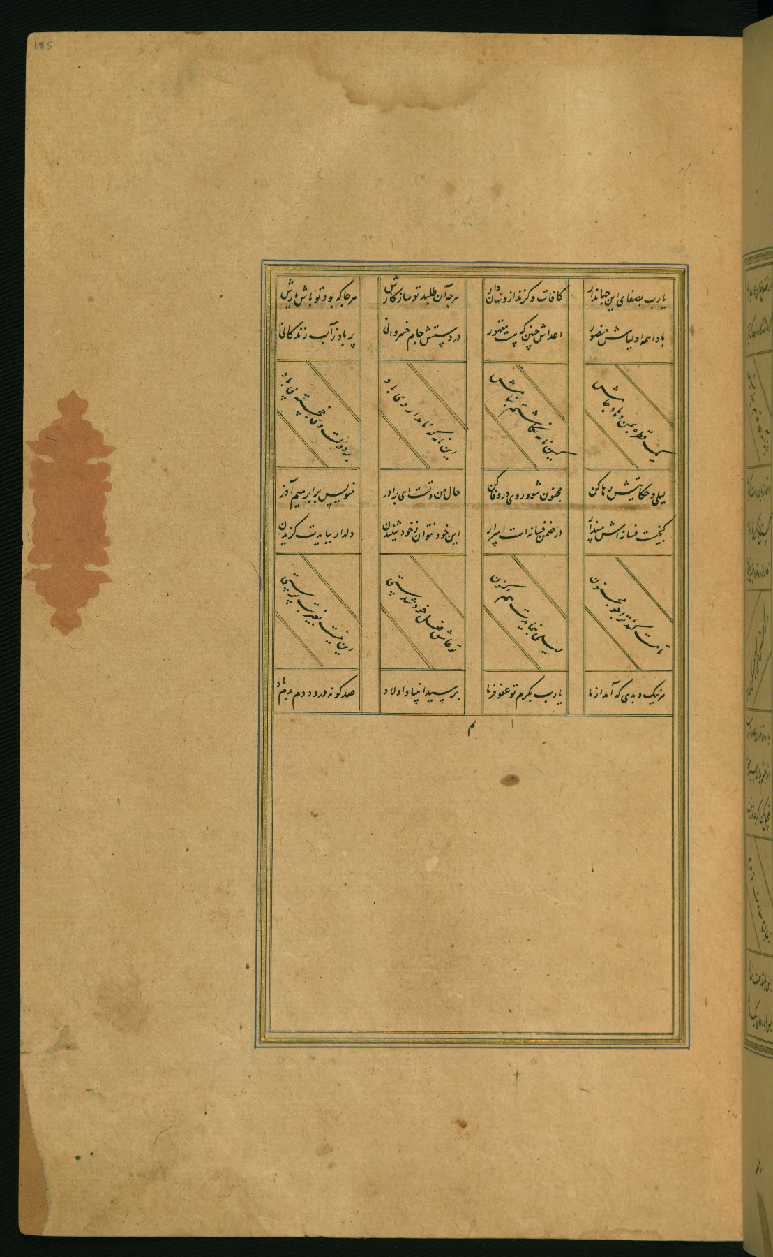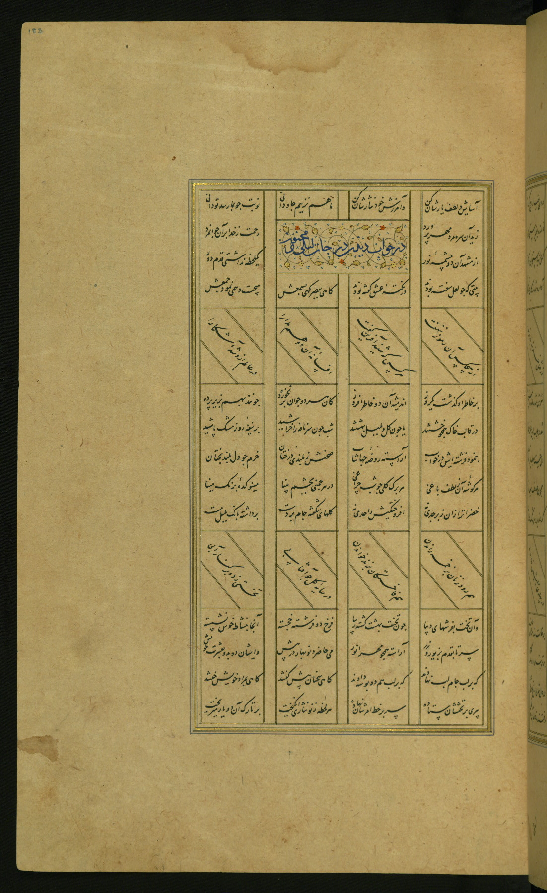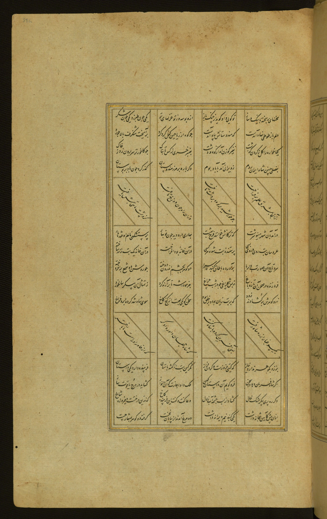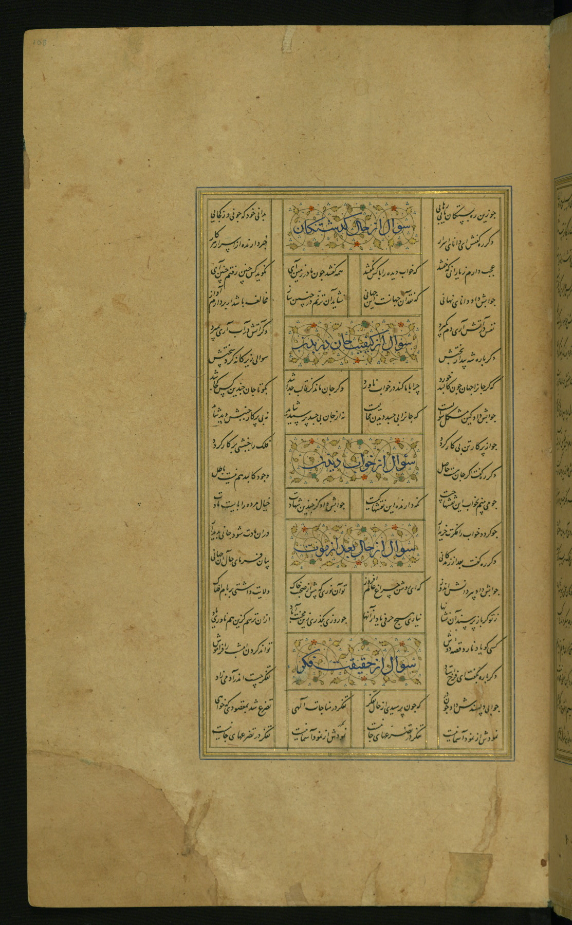 This illuminated and illustrated copy of the Khamsah (quintet) of Niẓāmī Ganjavī (d. 605 AH / 1209 CE) was written by Yār Muḥammad al-Haravī in 922 AH / 1516 CE. Written in four columns in black nastaʿlīq script, this manuscript opens with a double-page illuminated frontispiece signed by ʿAbd al-Wahhāb ibn ʿAbd al-Fattāḥ ibn ʿAlī. It contains thirty-five illustrations that were repainted in India during the twelfth century AH / eighteenth CE. The seal of Muḥammad Asharf ibn Muḥammad Khātam al-Ḥusaynī, dated 1173 AH / 1759-60 CE appears on fols. 1a and 401a. It is possible that the brown leather binding with center and side panels brushed with gold is original to the manuscript but was repaired at a later stage in the codex's history.