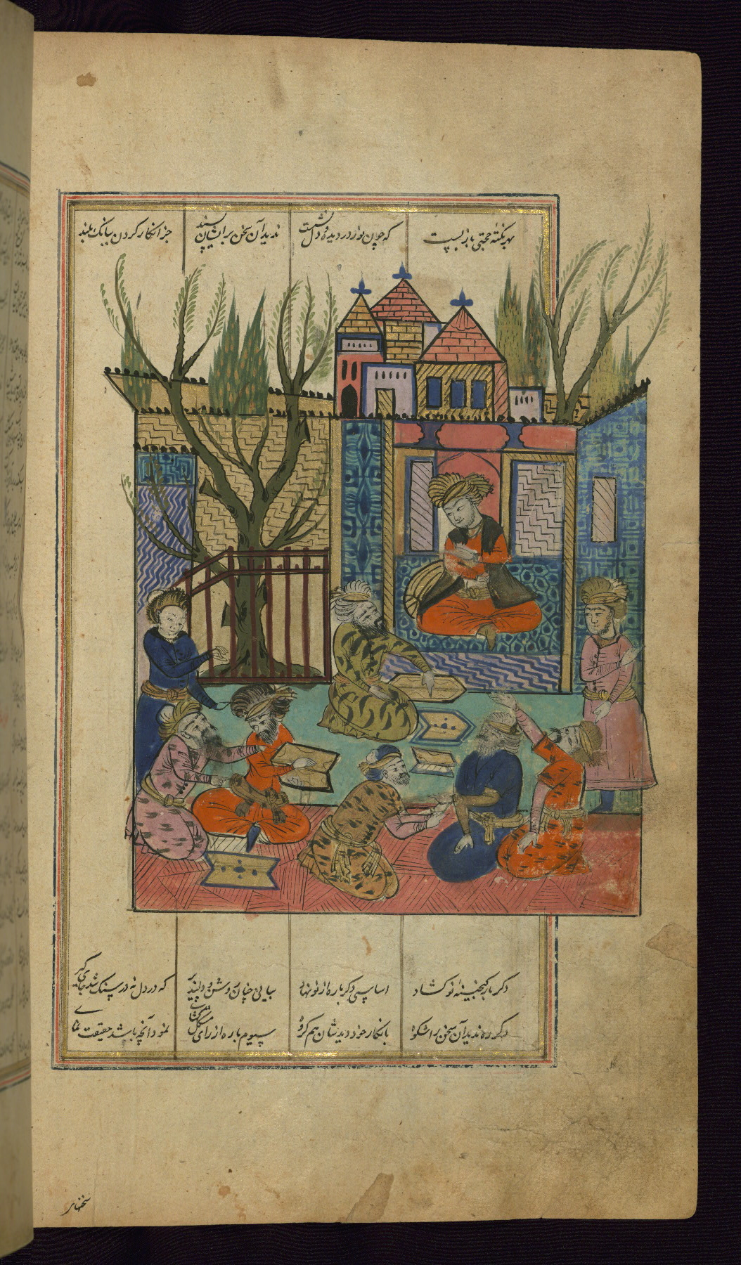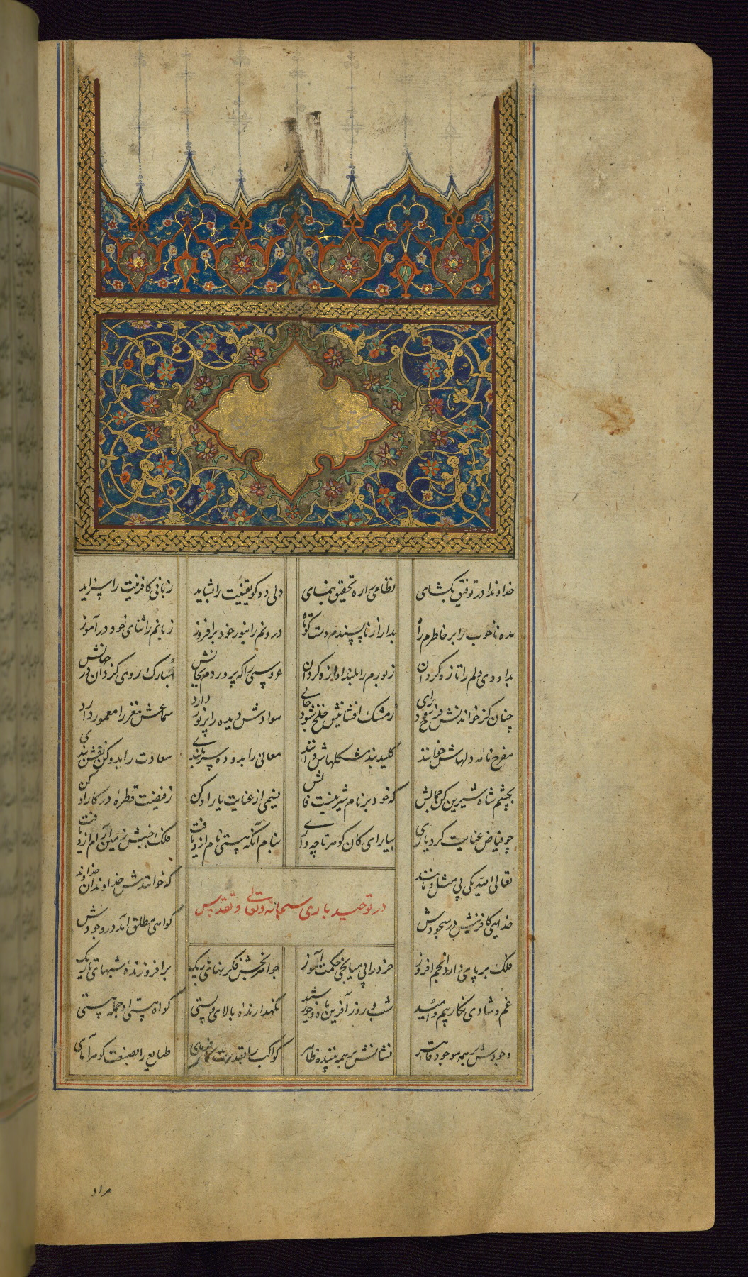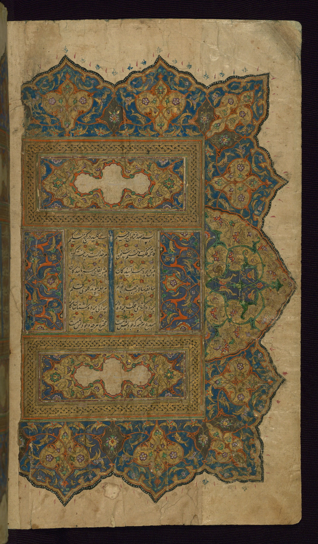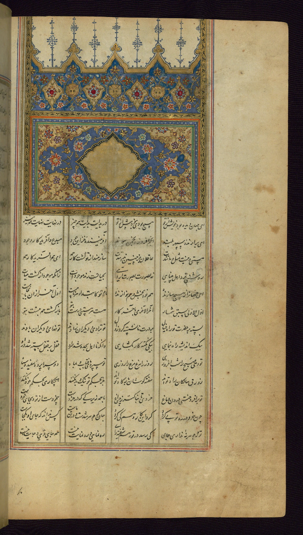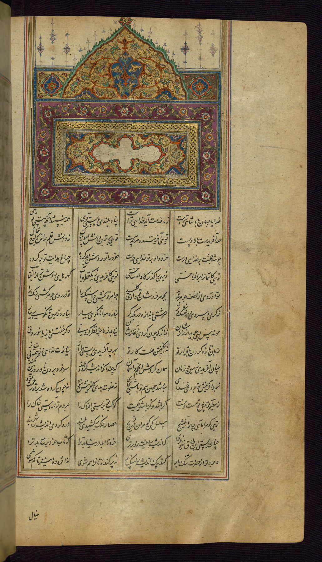 - Label: This is the right side of a double-page illuminated frontispiece that begins the first poem of the Khamsah, Makhzan al-asrār.