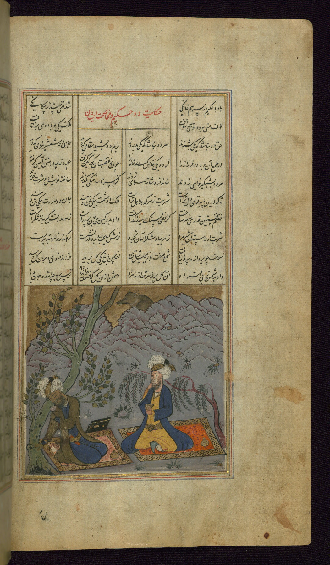 - Label: This incipit page has an illuminated headpiece beginning the third poem of the Khamsah: Laylá va Majnūn.