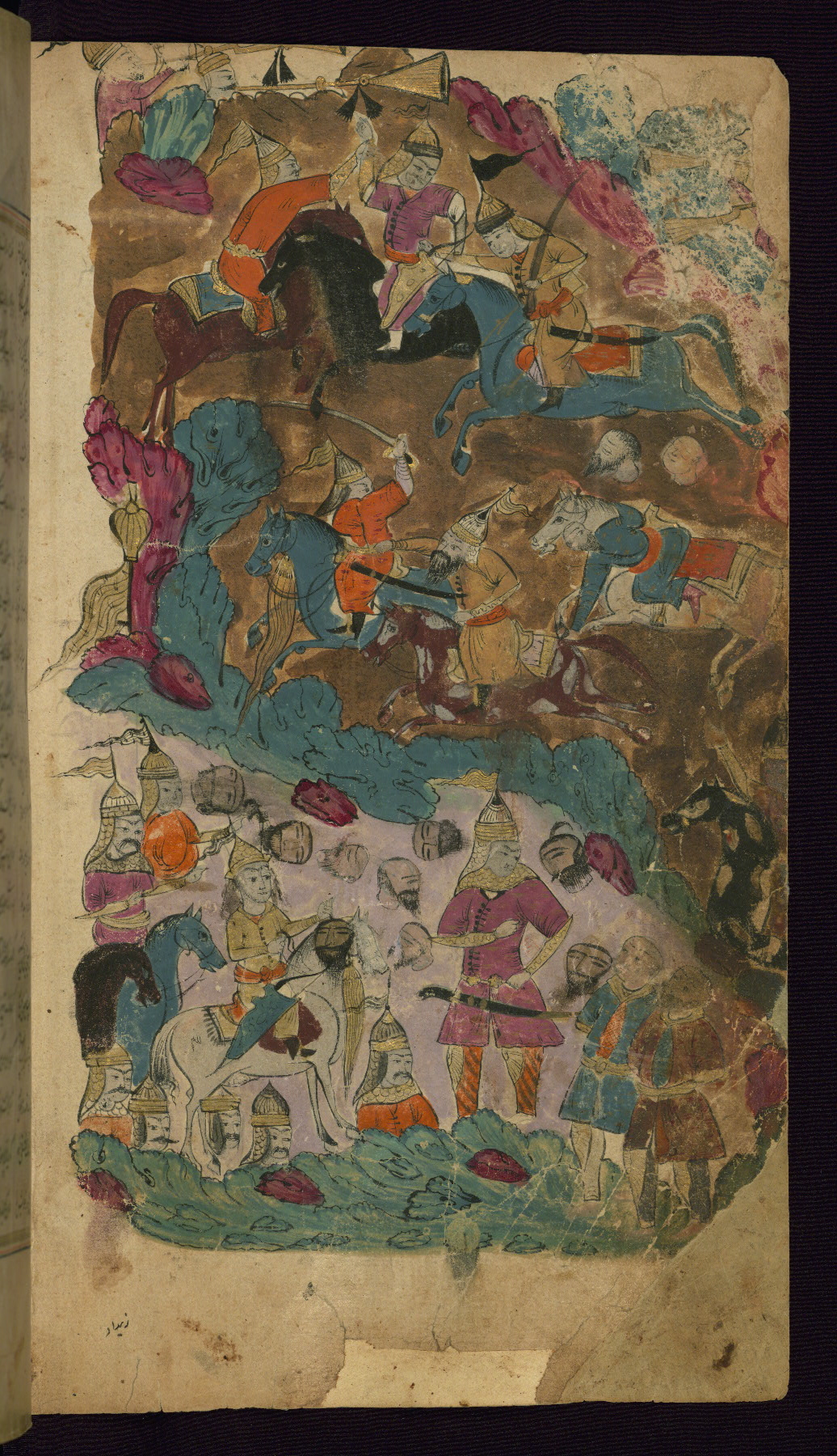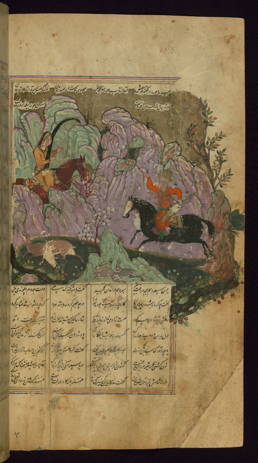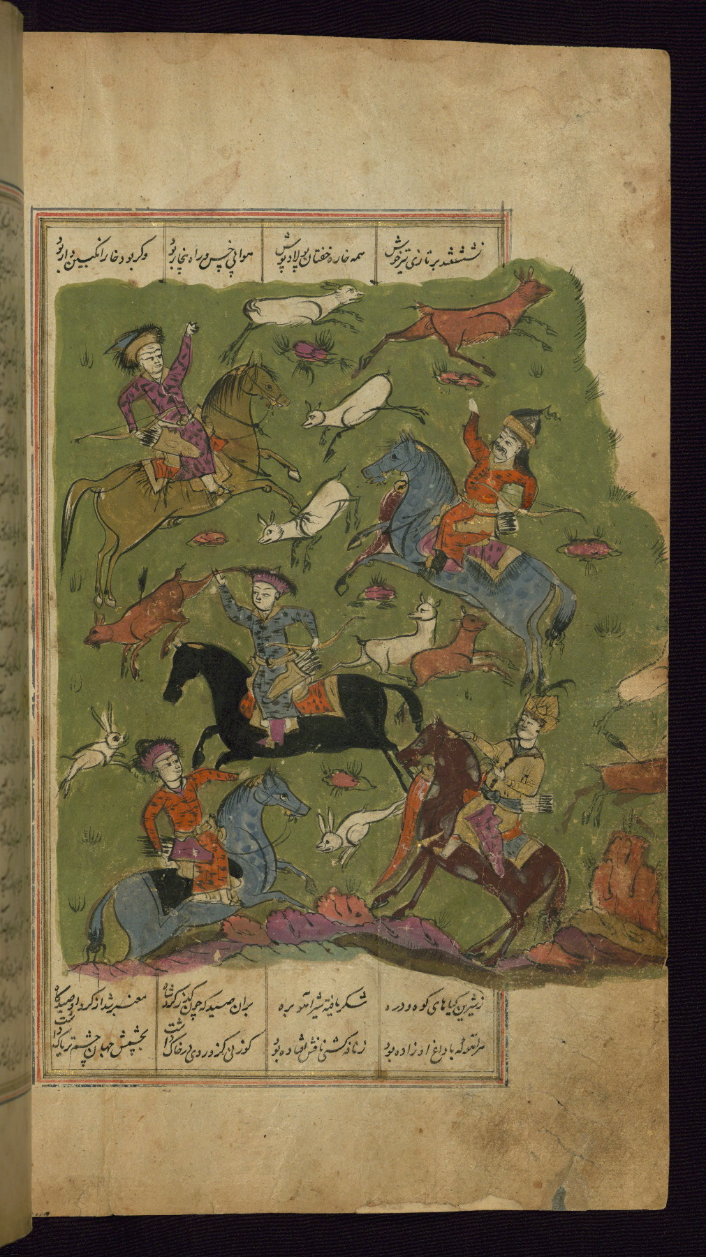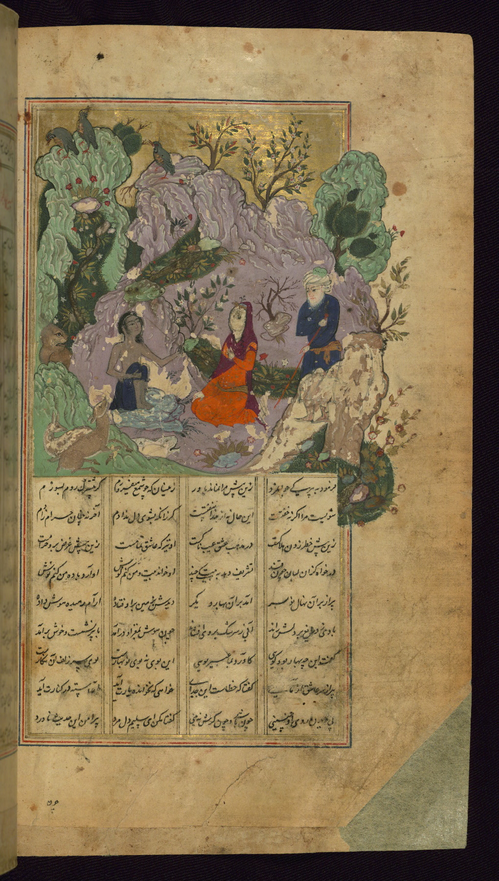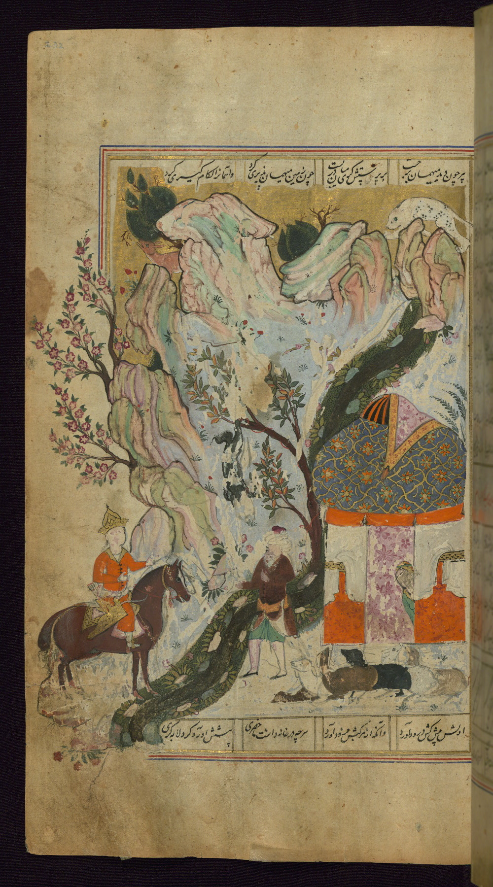 This illuminated and illustrated Safavid copy of the Khamsah (quintet) of Niẓāmī Ganjavī (d. 605 AH / 1209 CE) dates to the eleventh century AH / seventeenth CE. The codex opens with a double-page illuminated frontispiece (fols. 1b-2a). Each of the five poems begins with an illuminated headpiece (fols. 32b, 117b, 176b, 240b, 331b), and there are thirty-six illustrations. The lacquer binding is not original to the manuscript.